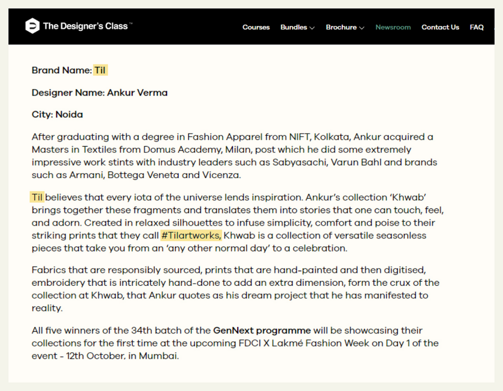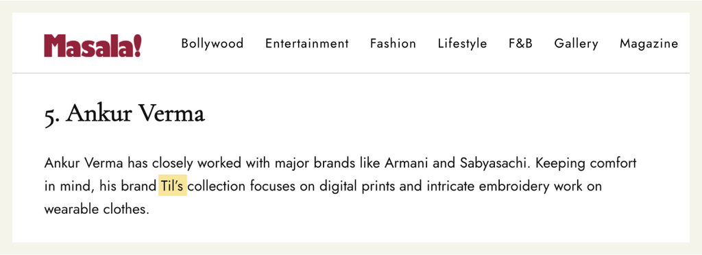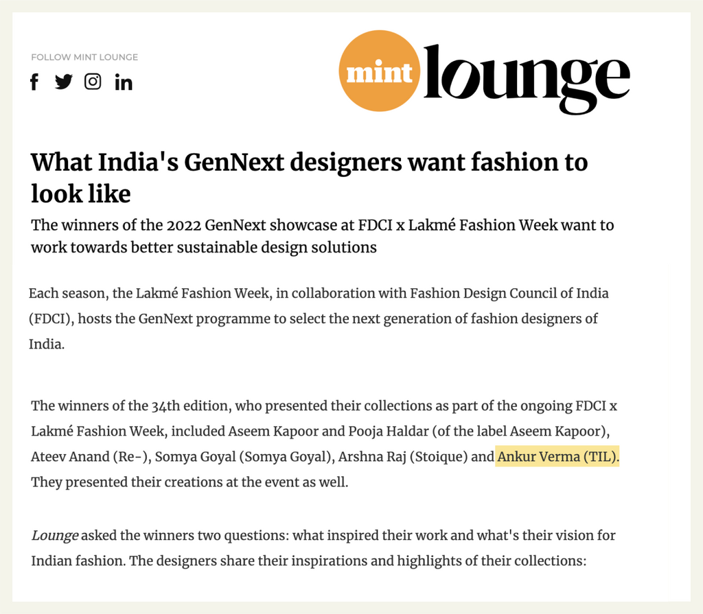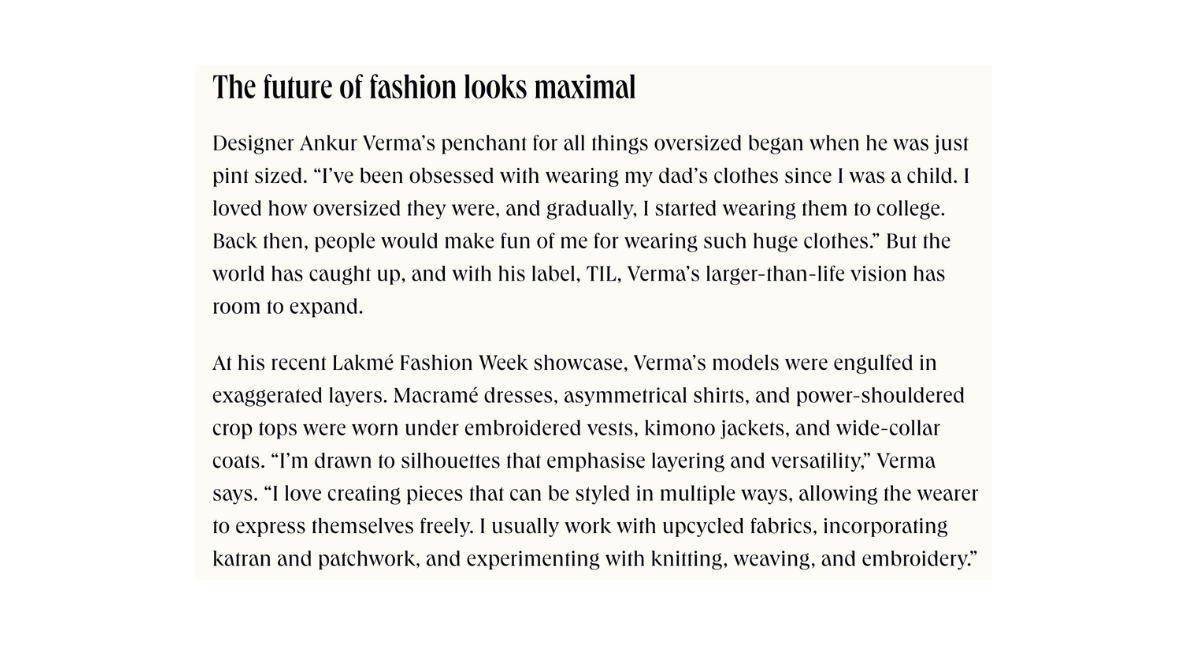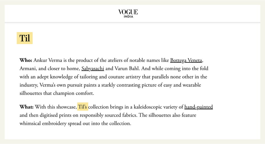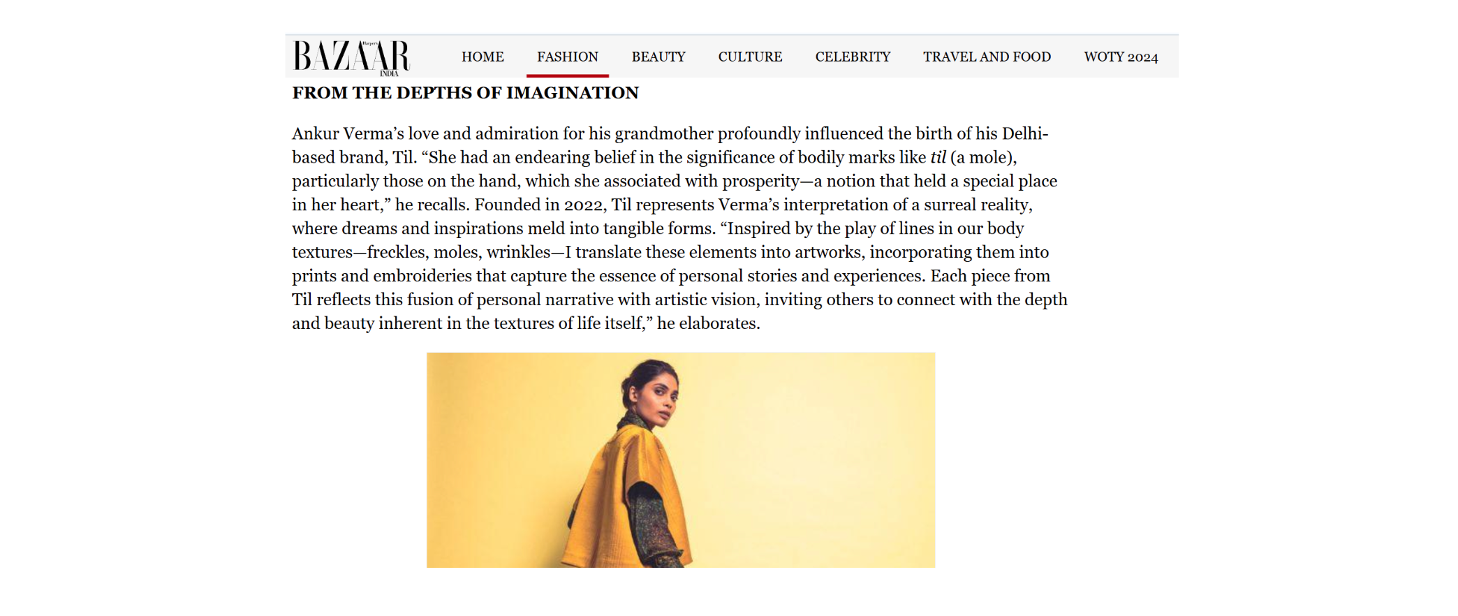 An exquisite tapestry of stories, passions, and traditions intertwines to form the very essence of our label. Established in 2022, Til is a proudly Indian-based clothing brand that transcends mere garments, aiming to establish meaningful and intimate connections with individuals from all walks of life.