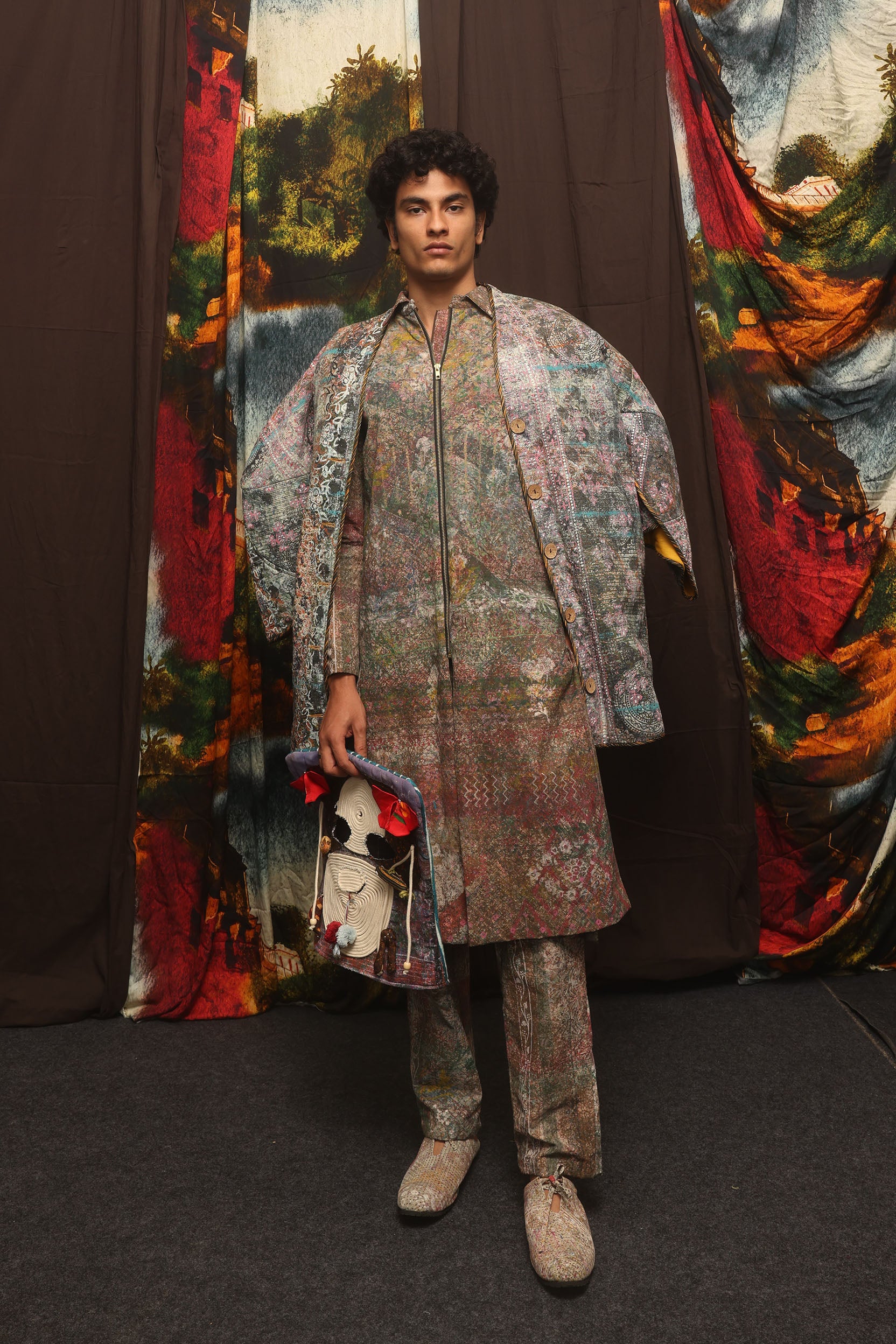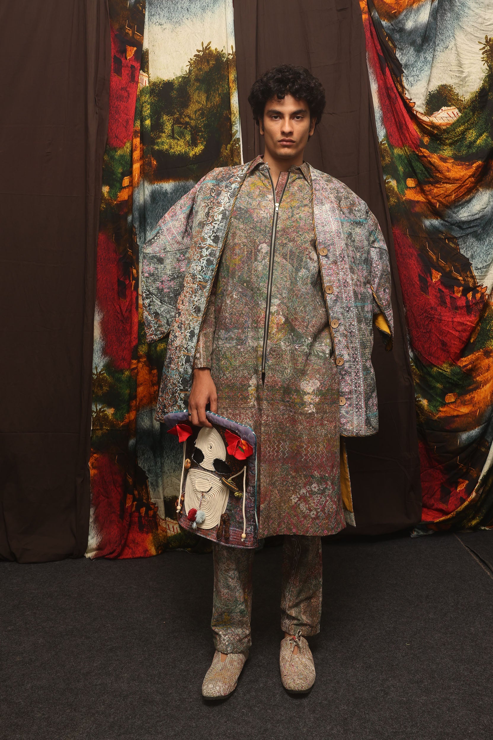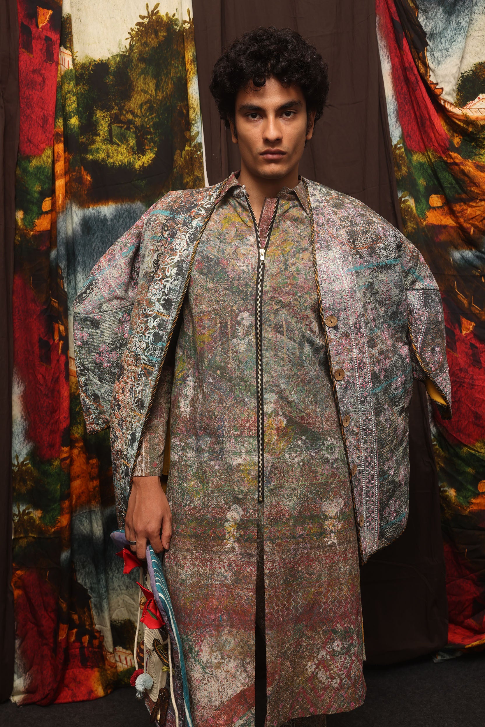 This Achadda long jacket set made in cotton features multi impression block printed textures finished with a front open zipper. It is paired with achaddarelaxed fit tailored trouser.