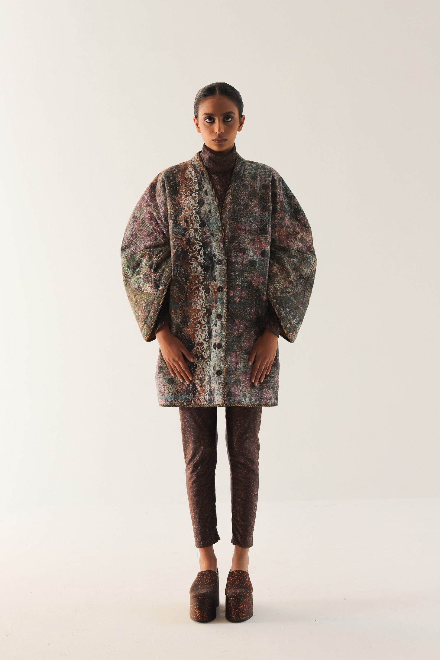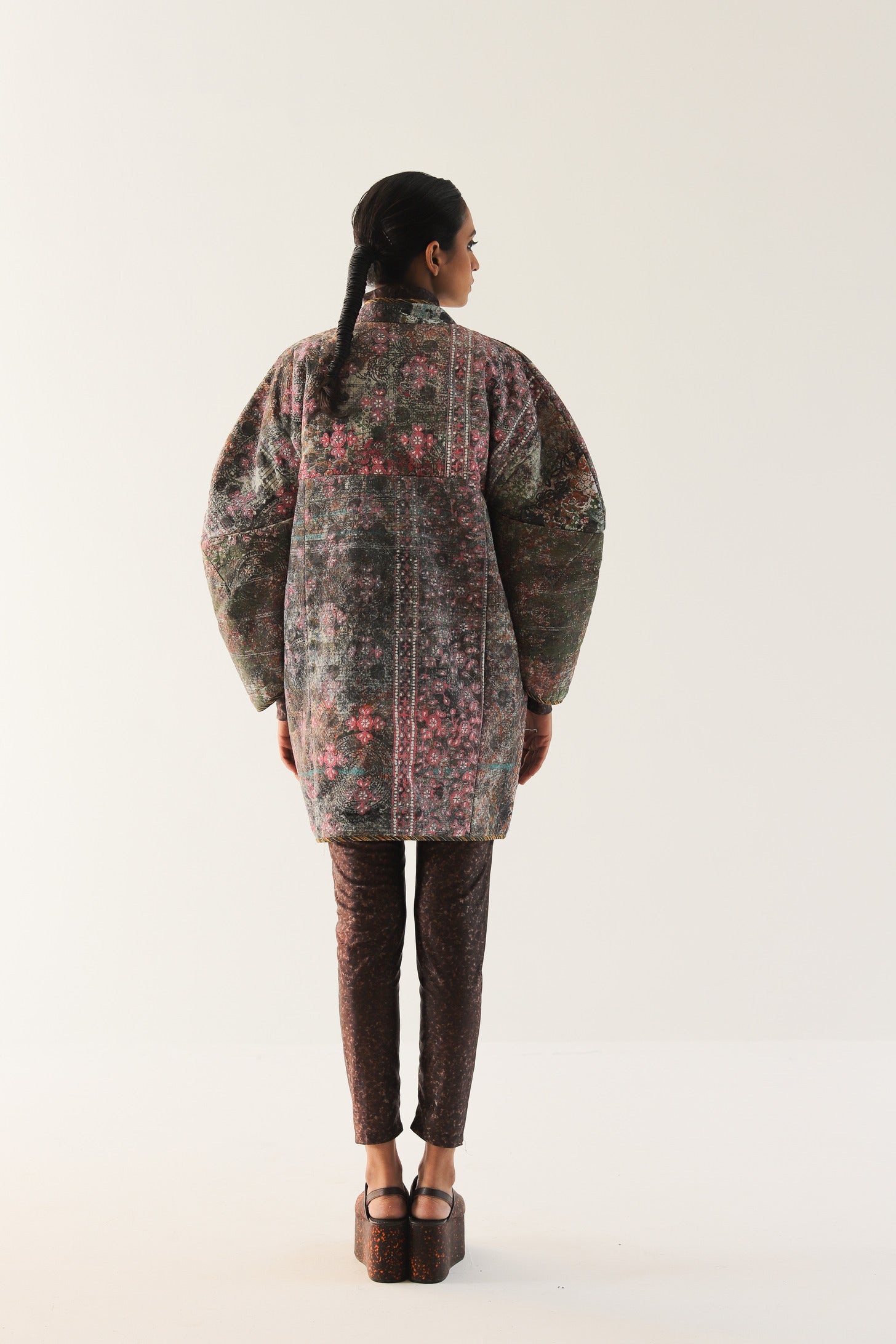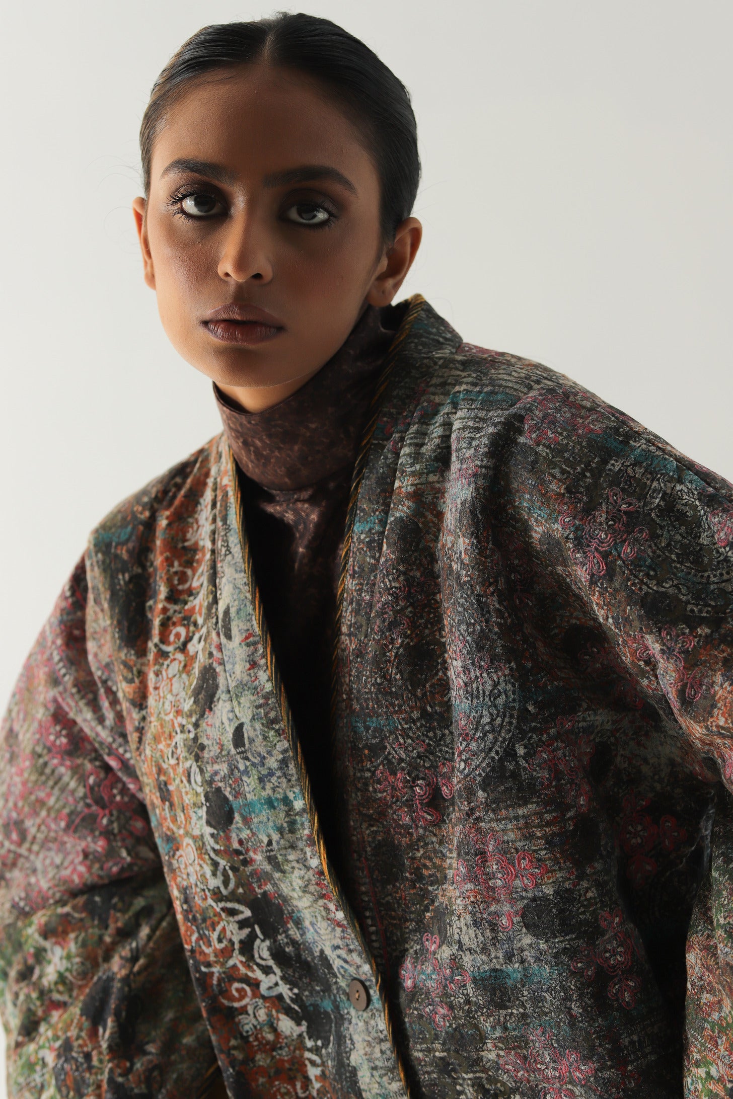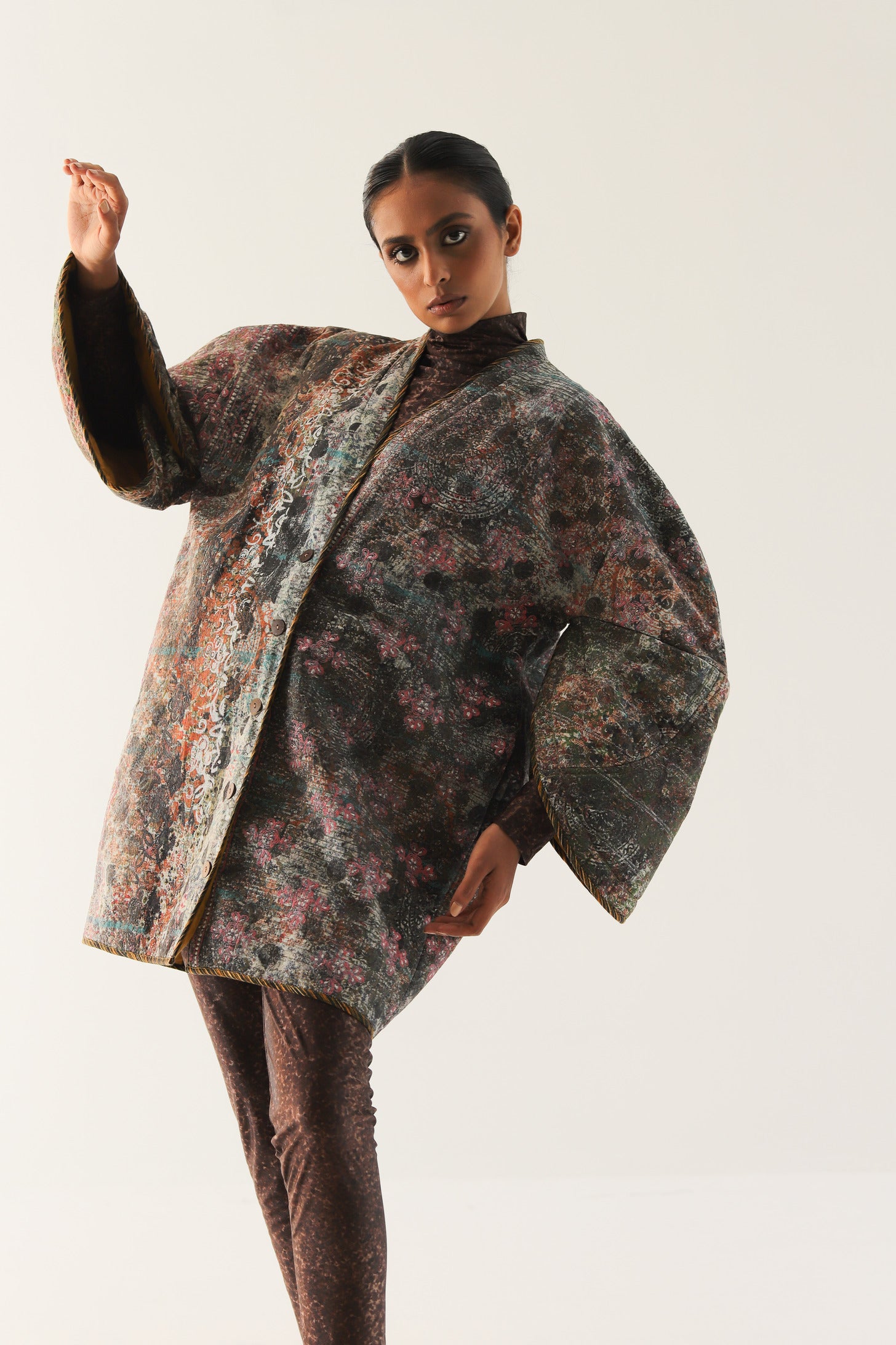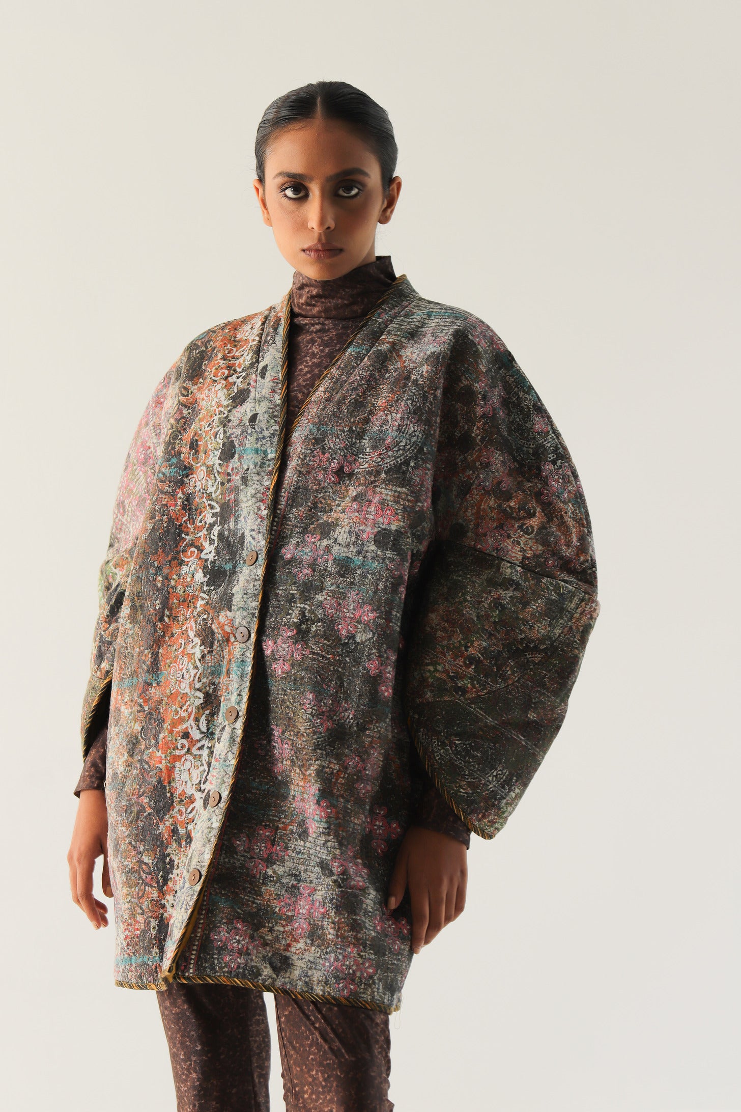 This oversized jacket dress is crafted in Achadda and features a multi-impression print. It comes with convenient pockets on both sides and showcases statement sleeves. The dress is elegantly finished with contrasting piping detail along the edges, adding a stylish touch to this unique garment.