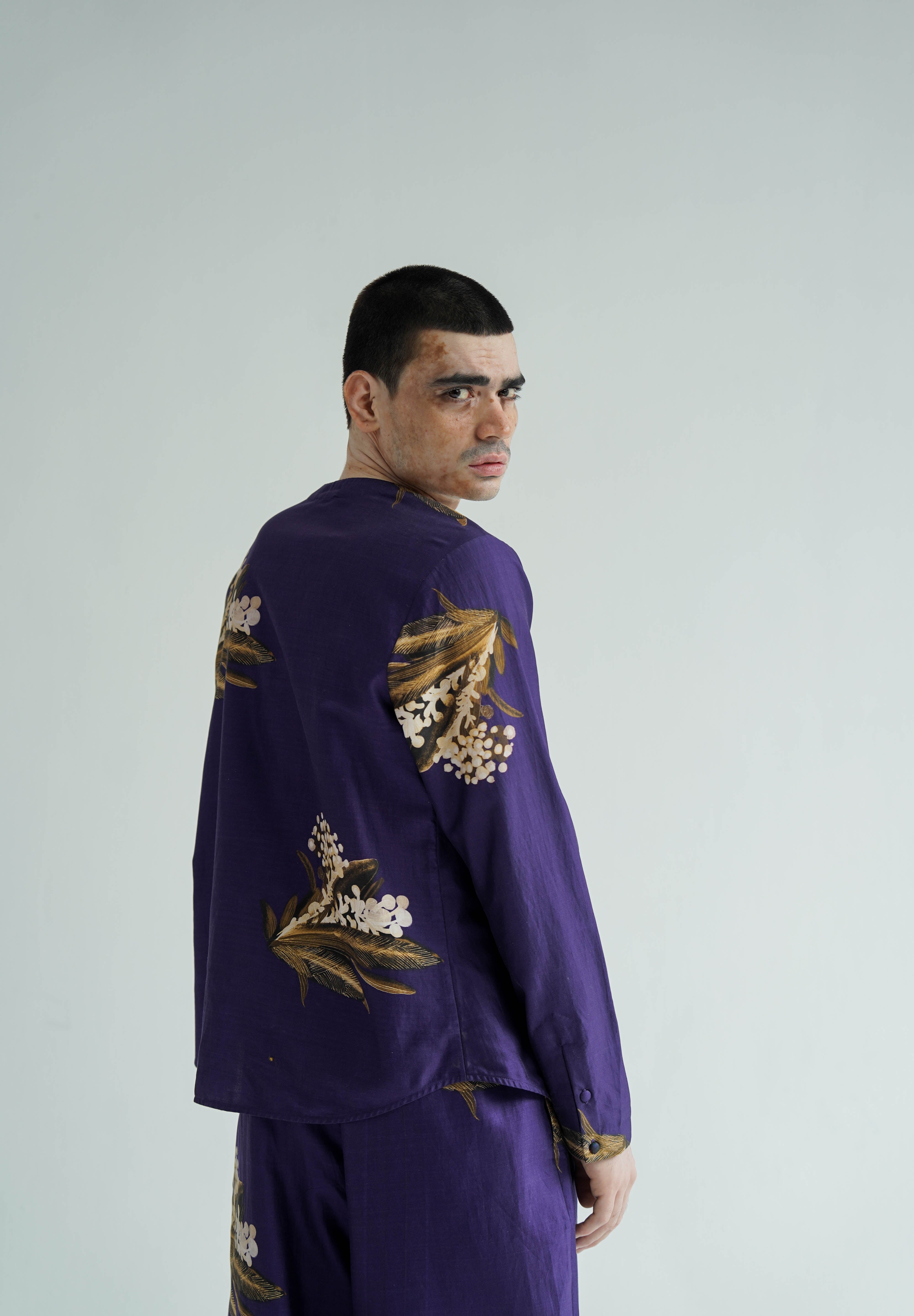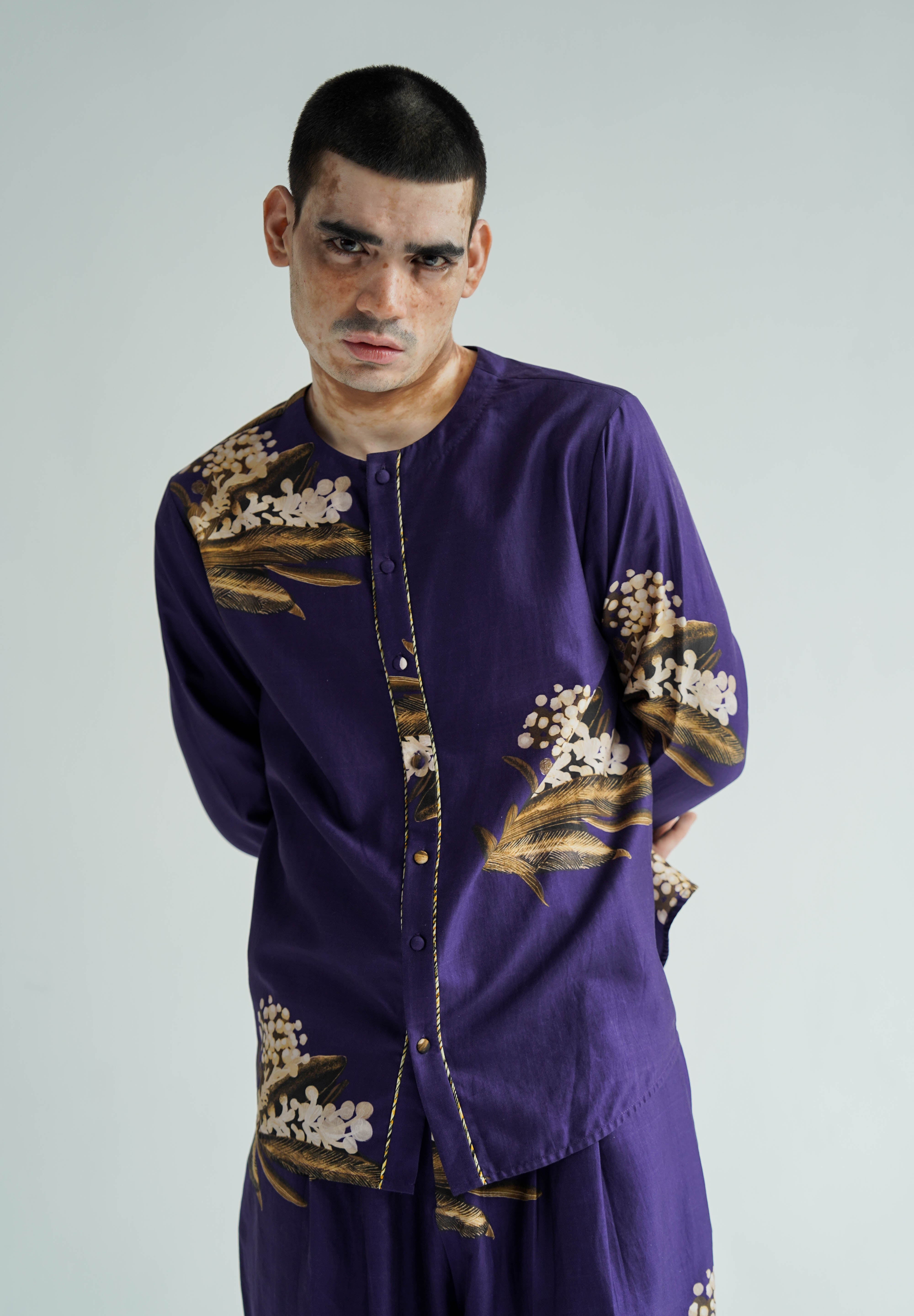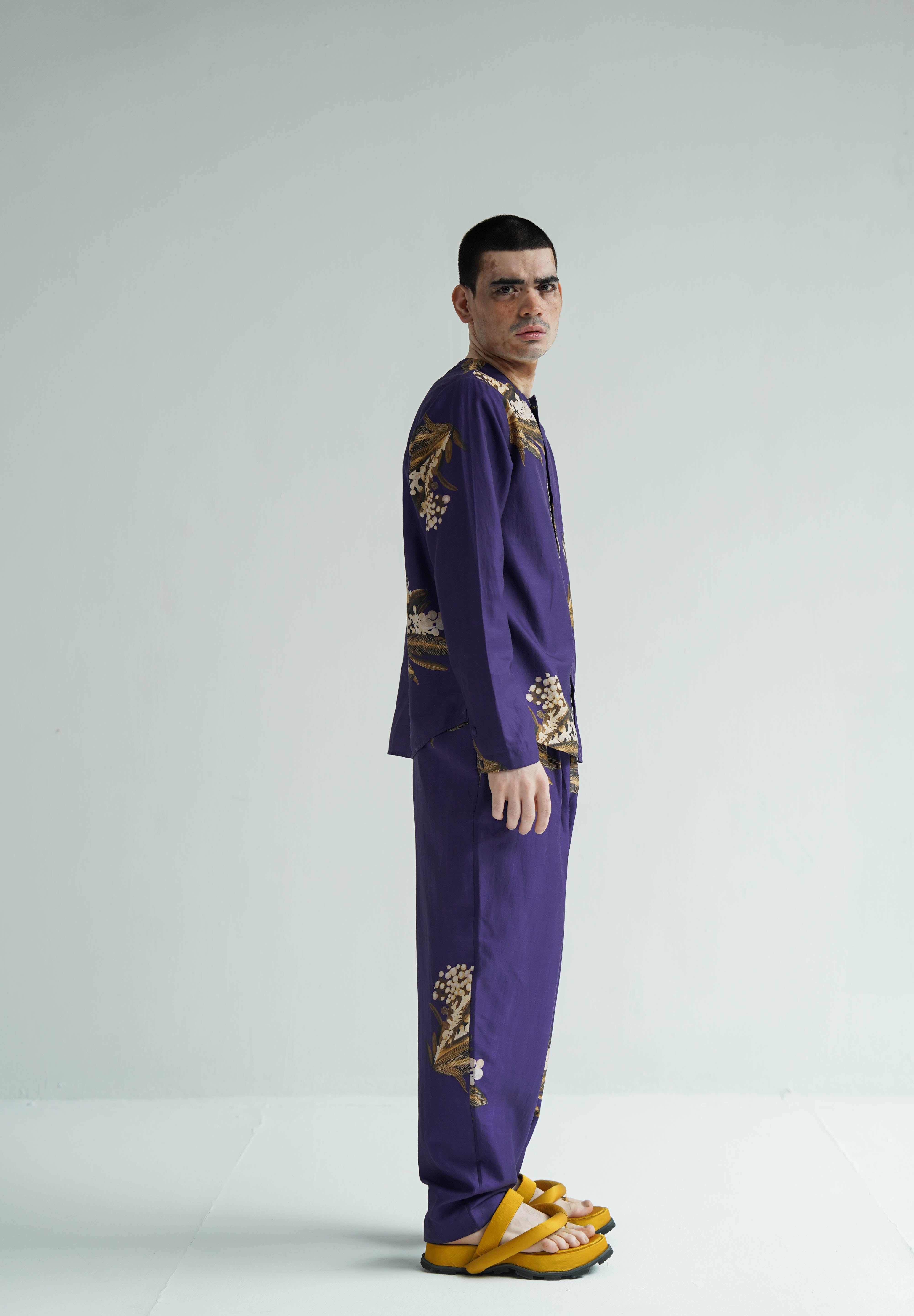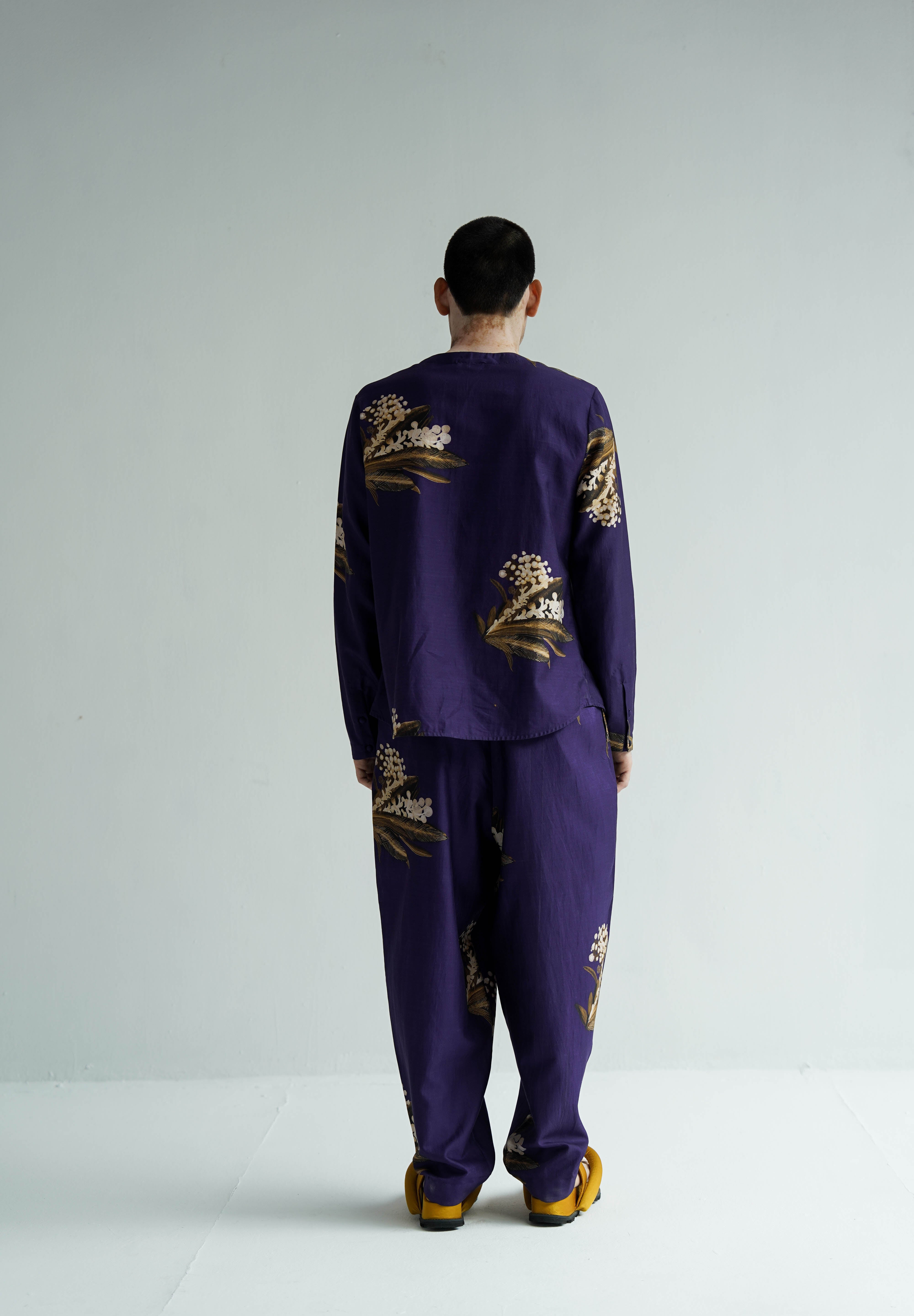 Immerse yourself in luxury and comfort with this meticulously crafted ensemble made from Chanderi fabric, adorned with a hand-painted, digitally printed purple firefly motif. Designed for a relaxed fit that radiates ease and comfort, it's paired with trousers featuring the same captivating print, defining effortless style and comfort.