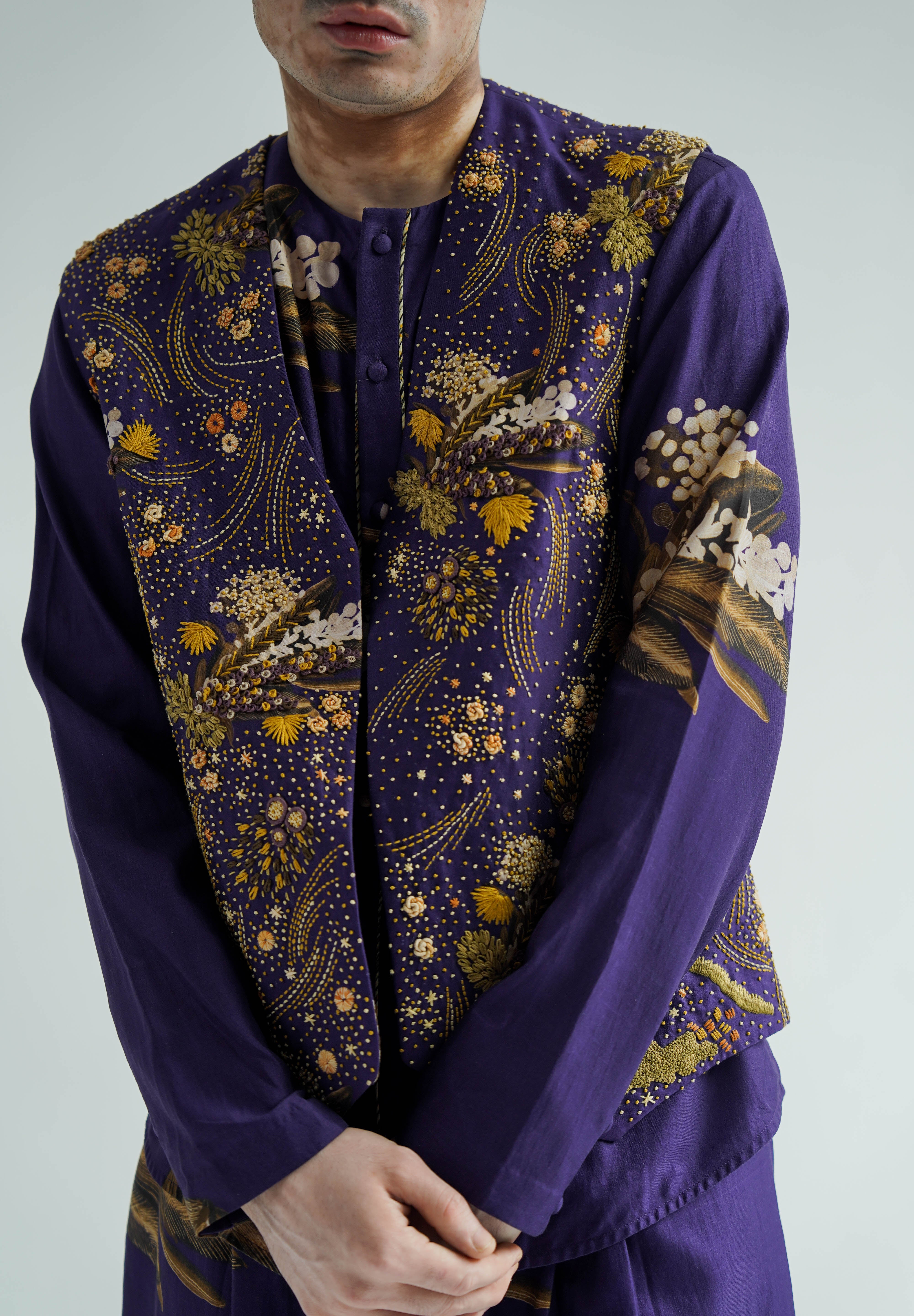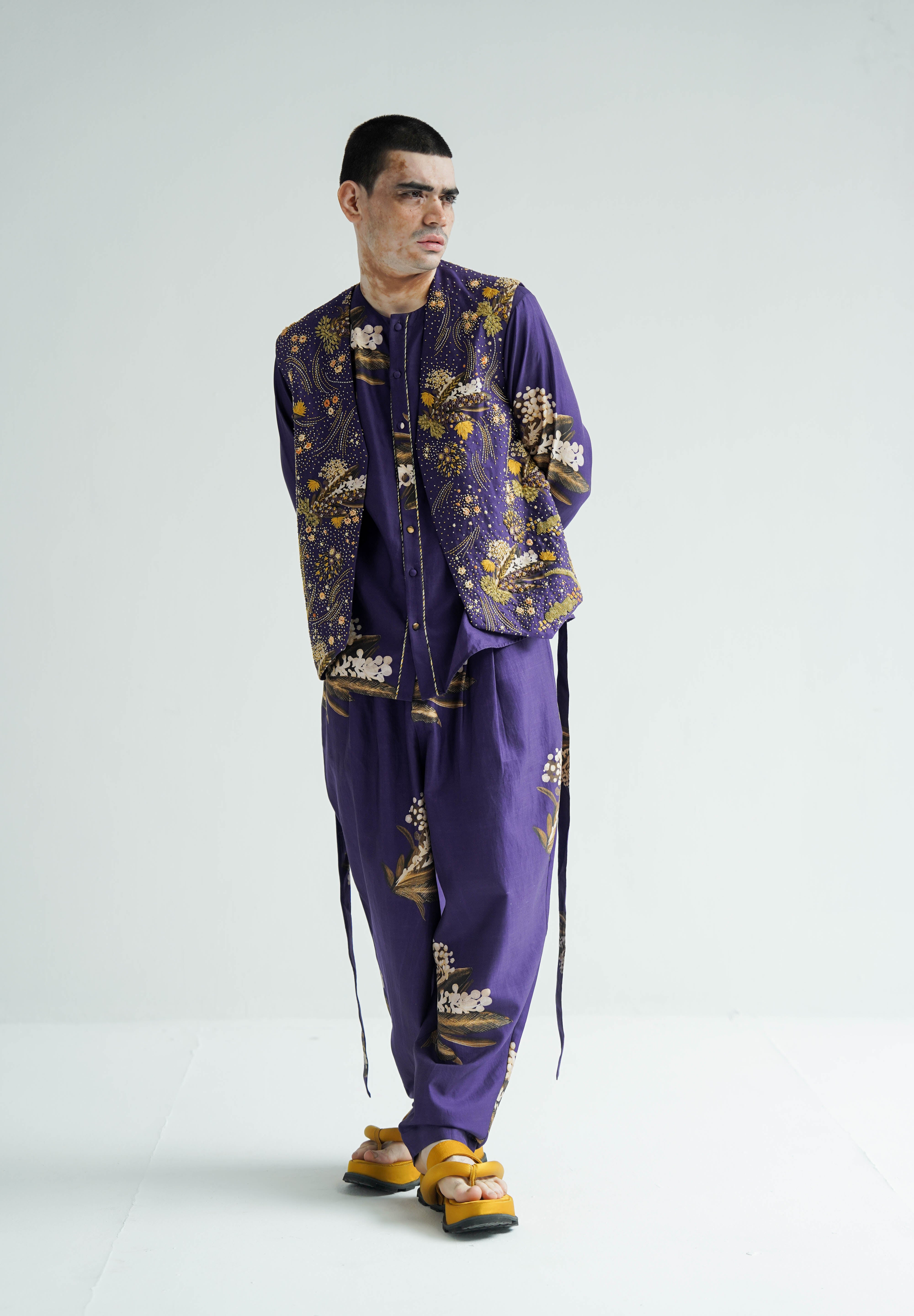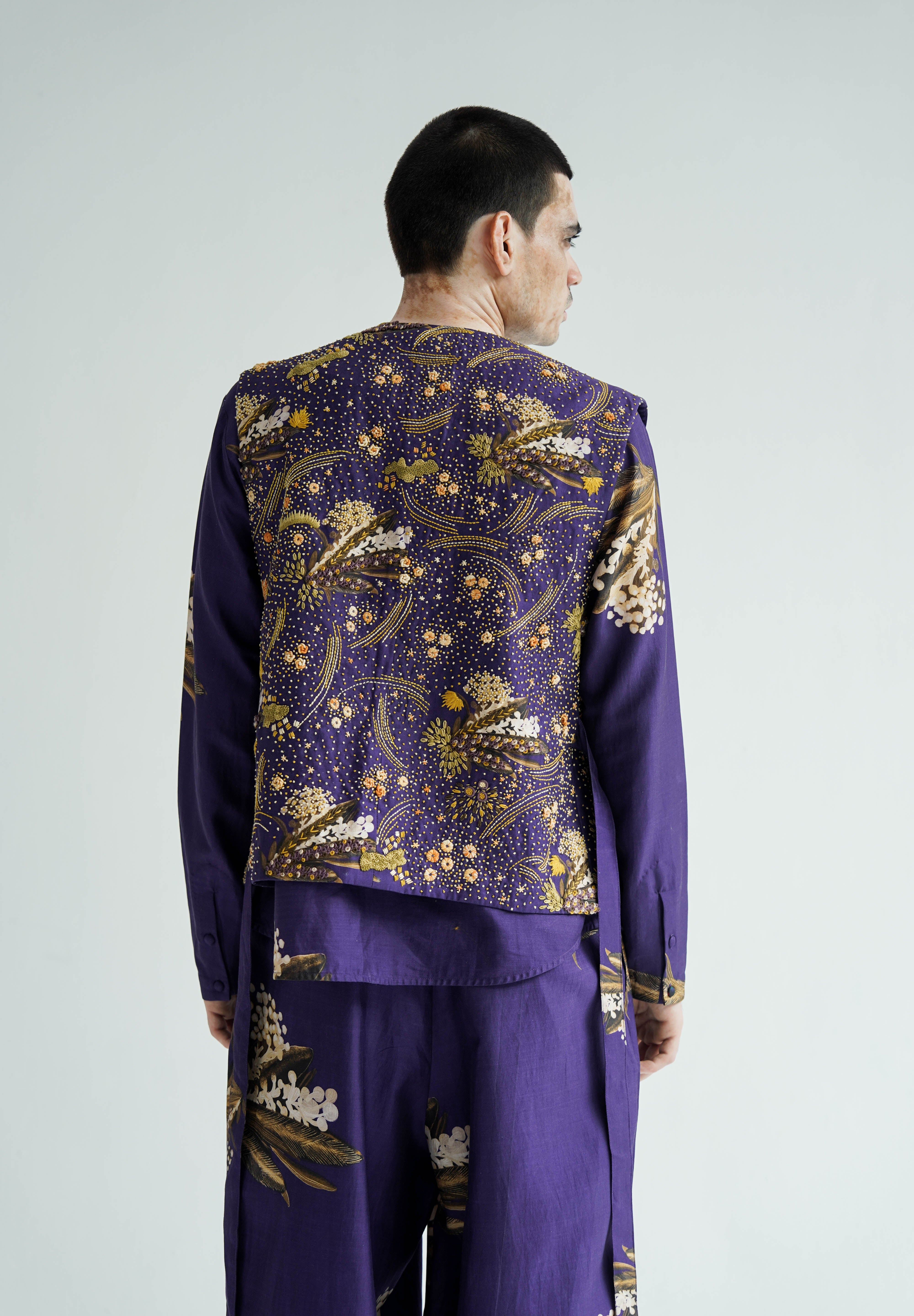 Indulge in luxury and comfort with our meticulously crafted vest, fashioned from Chanderi fabric adorned with a hand-painted, digitally printed purple firefly motif. Designed for a relaxed fit that radiates ease and comfort, this piece is elevated with full hand embroidery, adding a refined touch to its casual silhouette