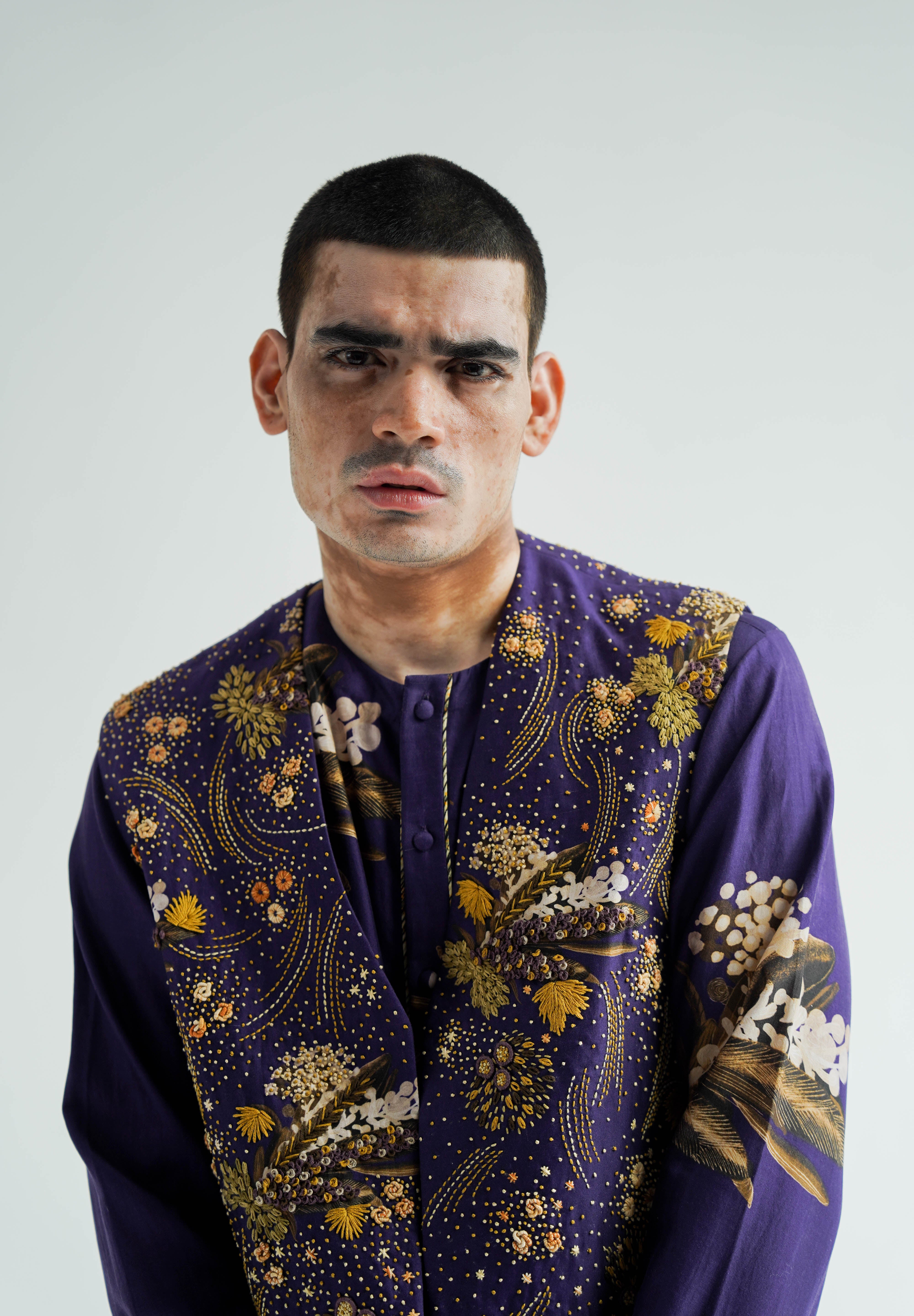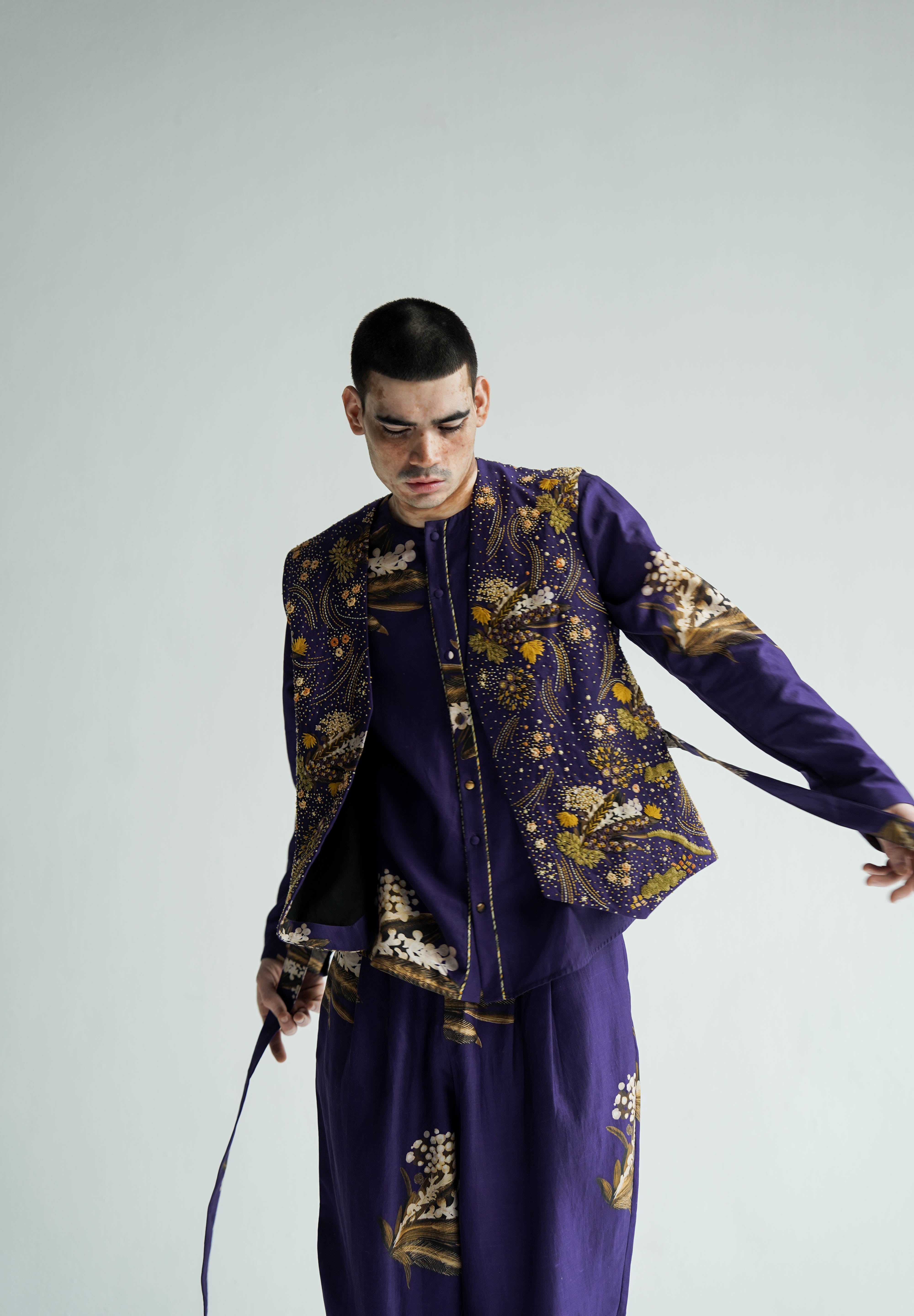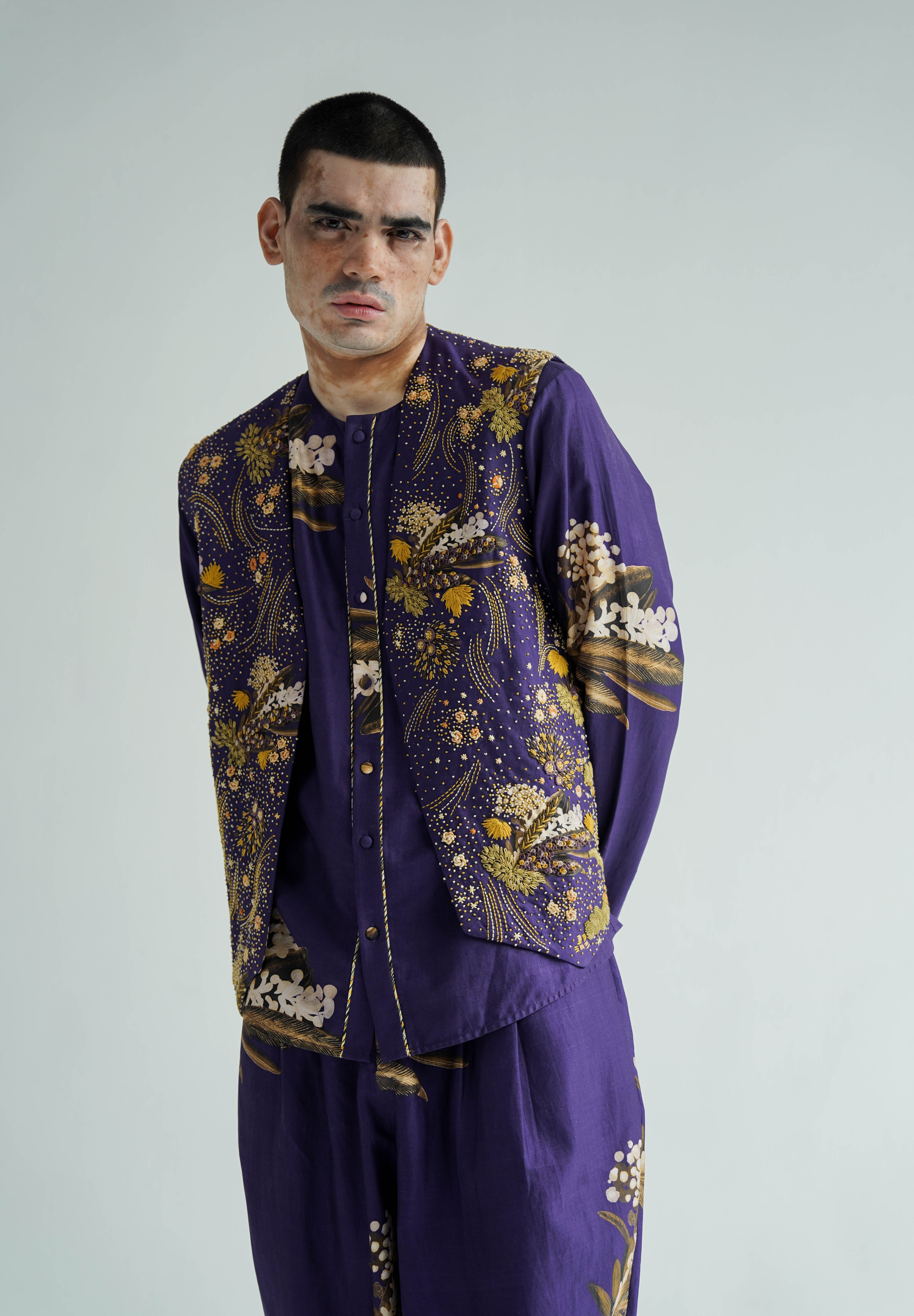 Indulge in luxury and comfort with our meticulously crafted vest, fashioned from Chanderi fabric adorned with a hand-painted, digitally printed purple firefly motif. Designed for a relaxed fit that radiates ease and comfort, this piece is elevated with full hand embroidery, adding a refined touch to its casual silhouette