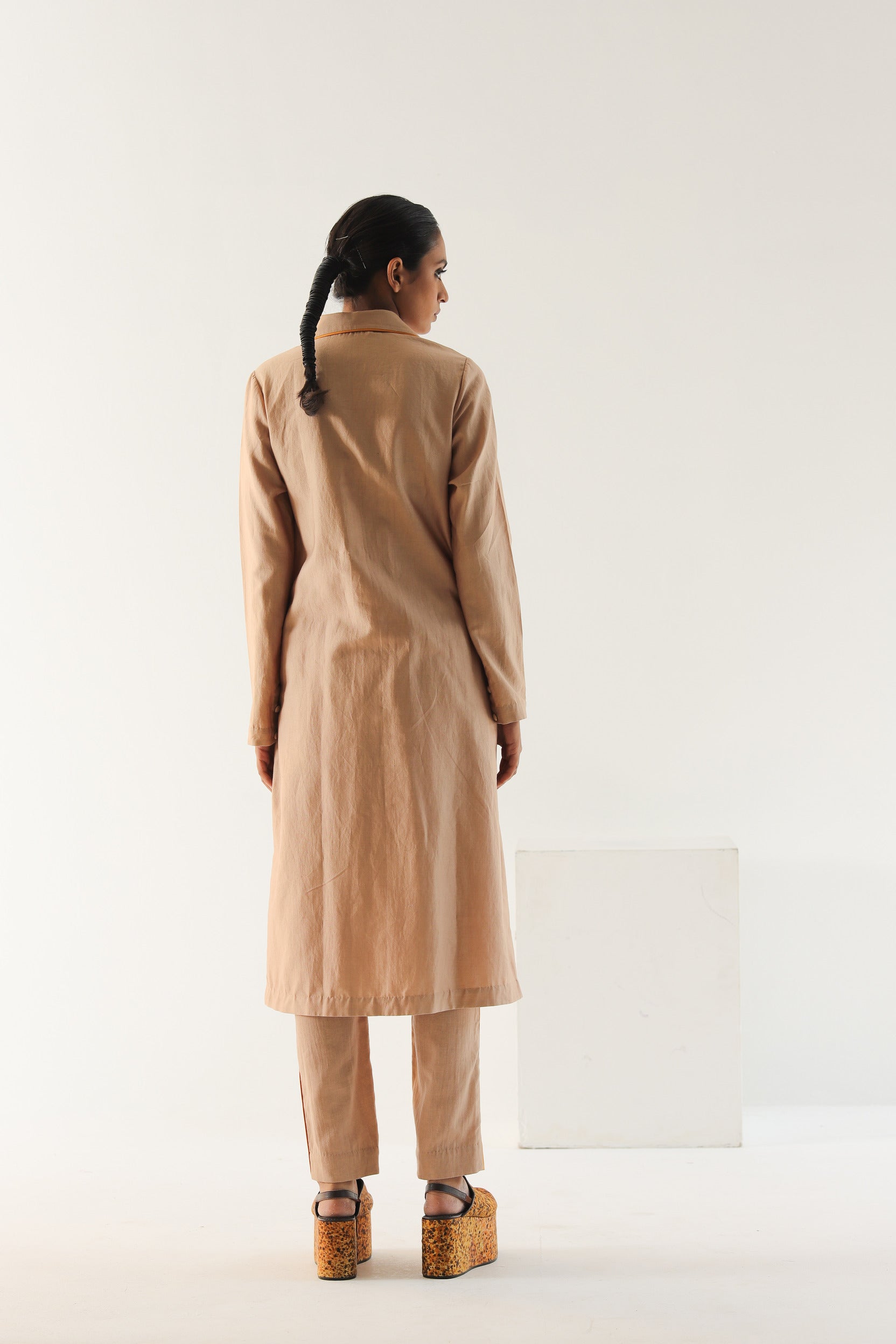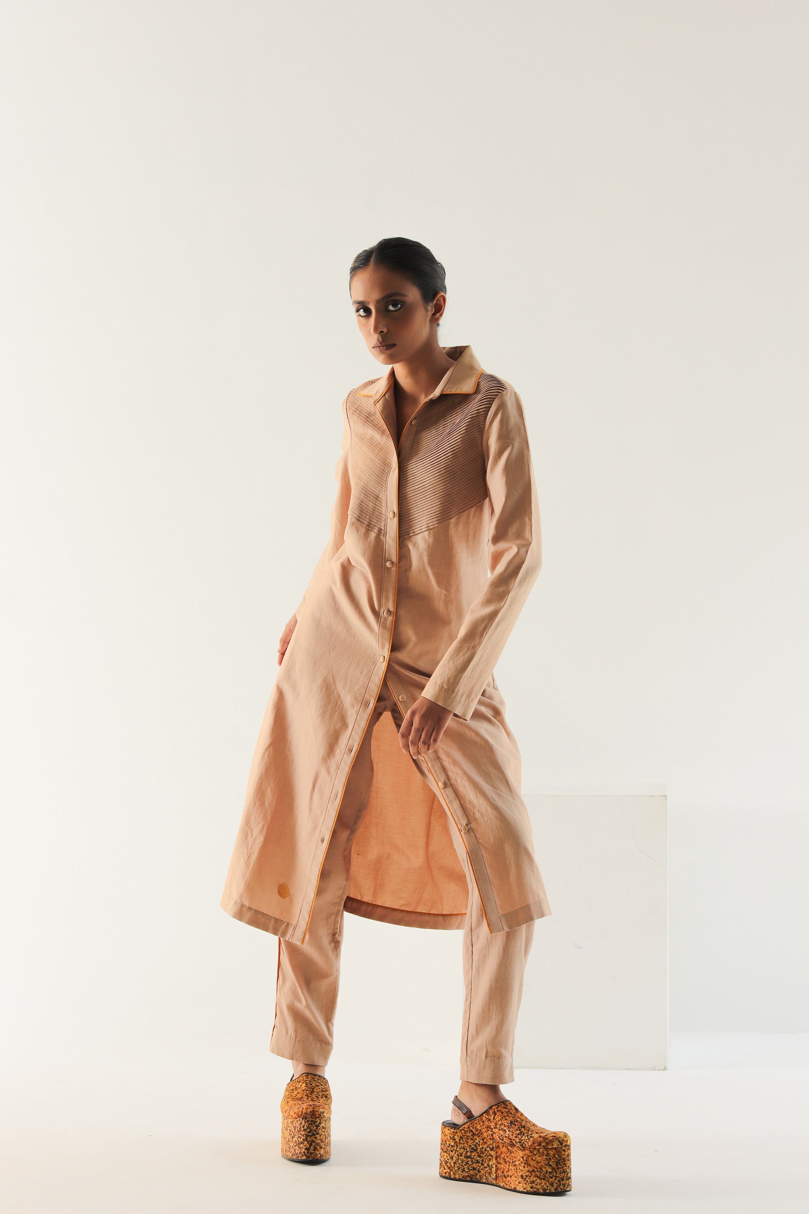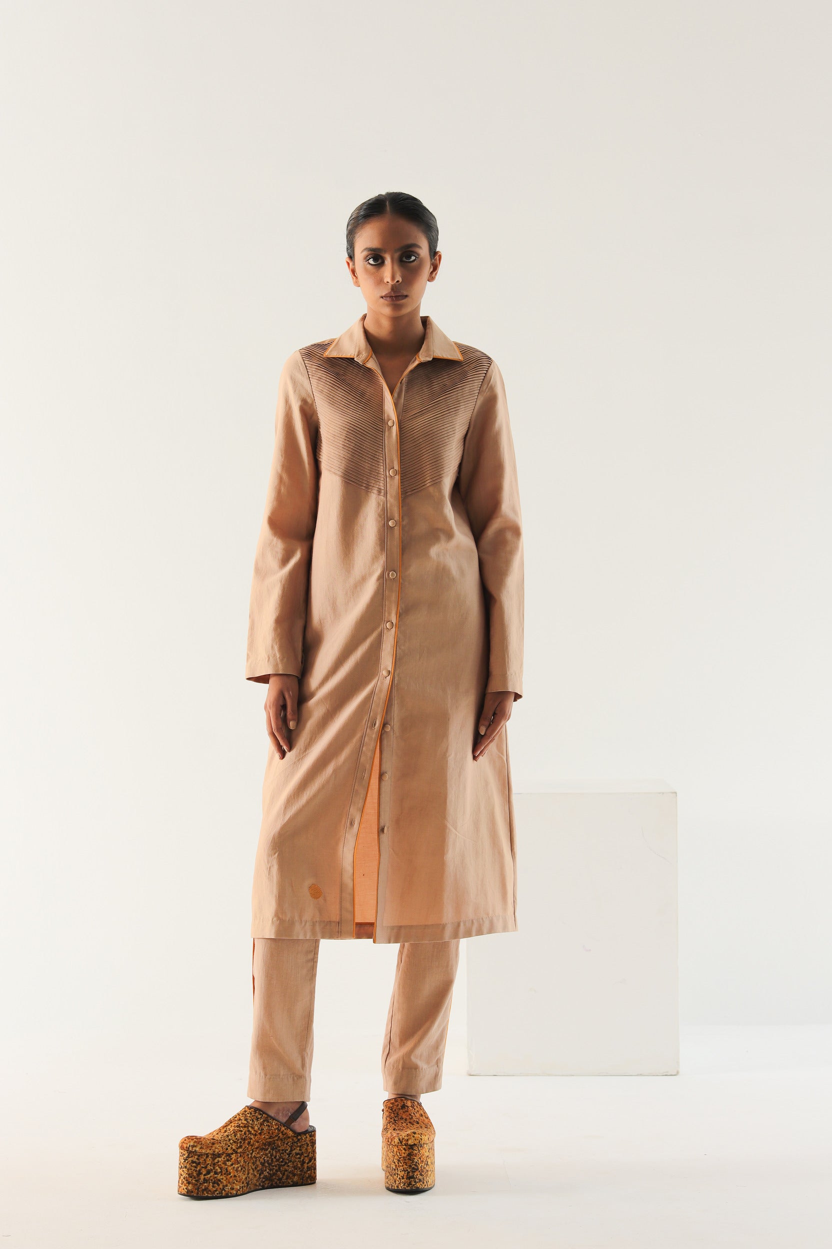 Made in satin chanderi, this set is a relaxed fit, comfortable wear. It has pintucks detailing on the front and finished with contrast piping detail. The trousers are made in cotton khadi, relaxed fit straight trousers with pockets.