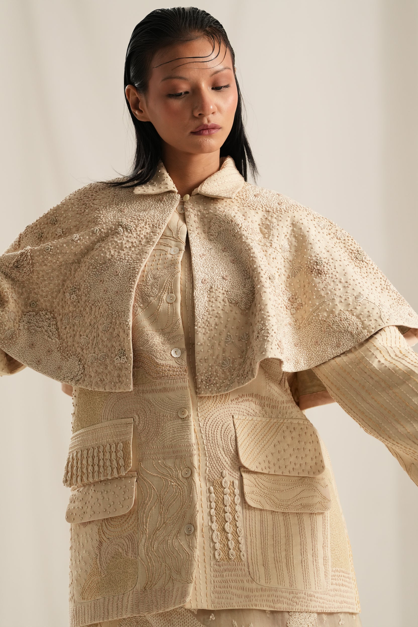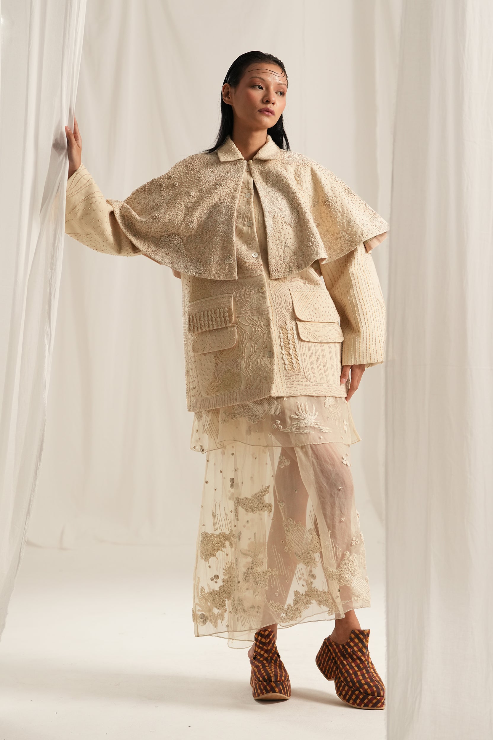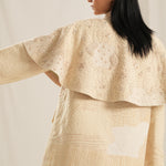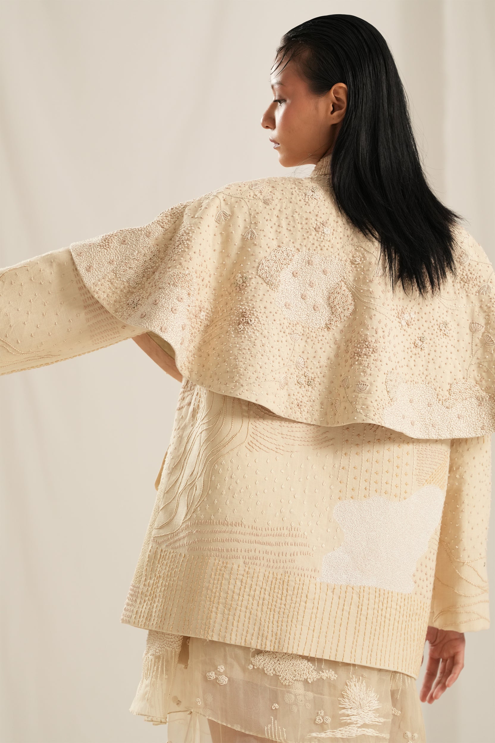 Beige Hand Embroidery Cape,Crafted in soft shades of ivory and white, this front-open cape features intricate hand embroidery that adds a unique texture and depth to the design.Whether layered over a simple dress or paired with your favorite jeans, this versatile piece is sure to become a cherished staple in your collection.