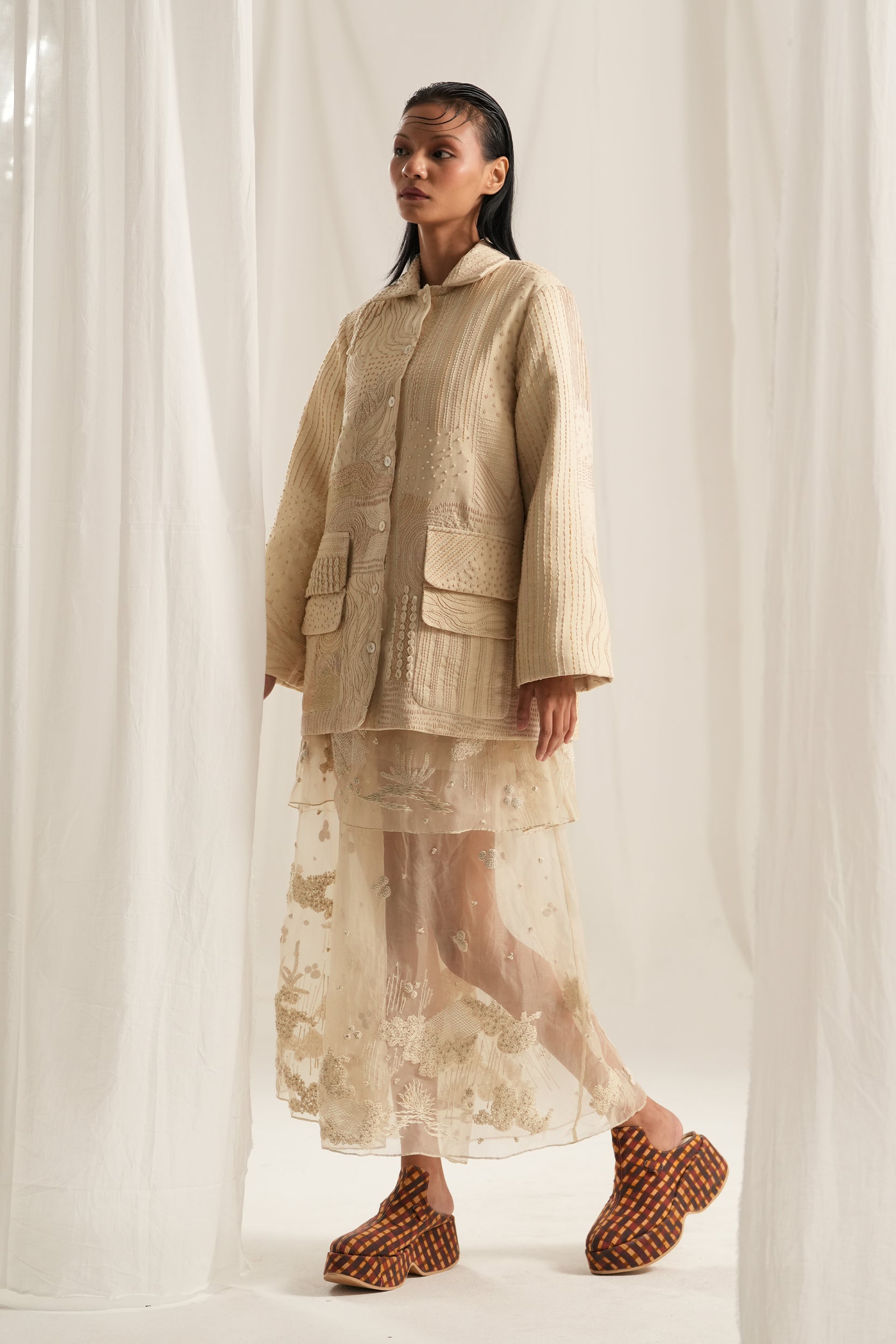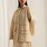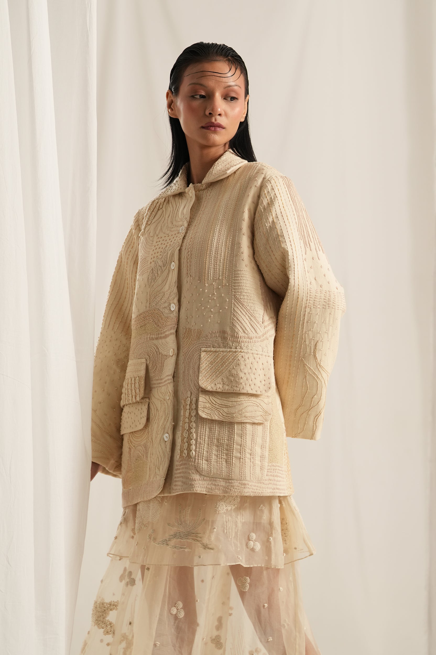 Crafted in soft shades of ivory and beige, this jacket features intricate Kantha work that creates a beautiful array of textures, making each piece unique. The finely constructed design includes convenient pockets on both front panels.With a front-open style, this jacket is versatile enough to layer over your favorite outfits.