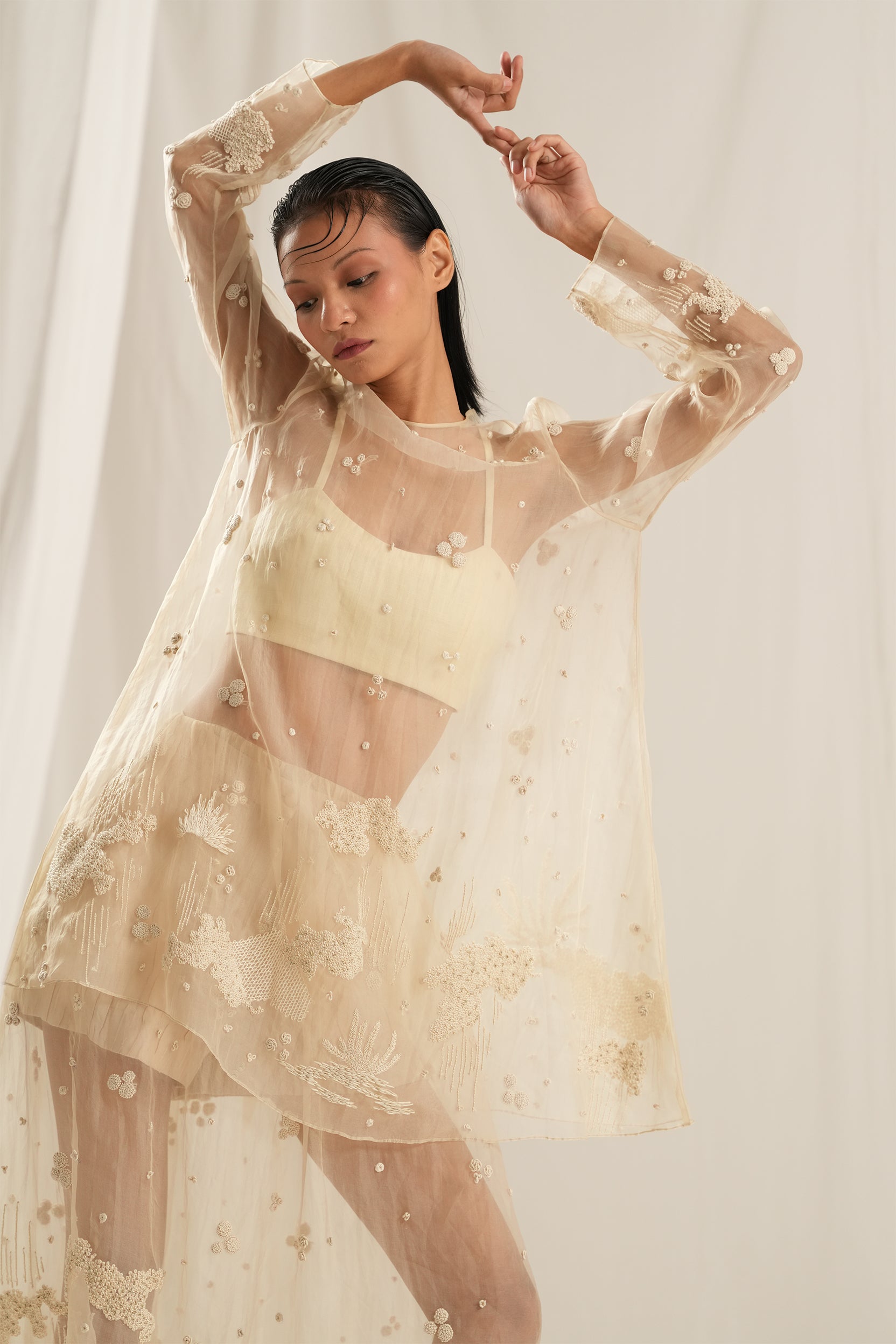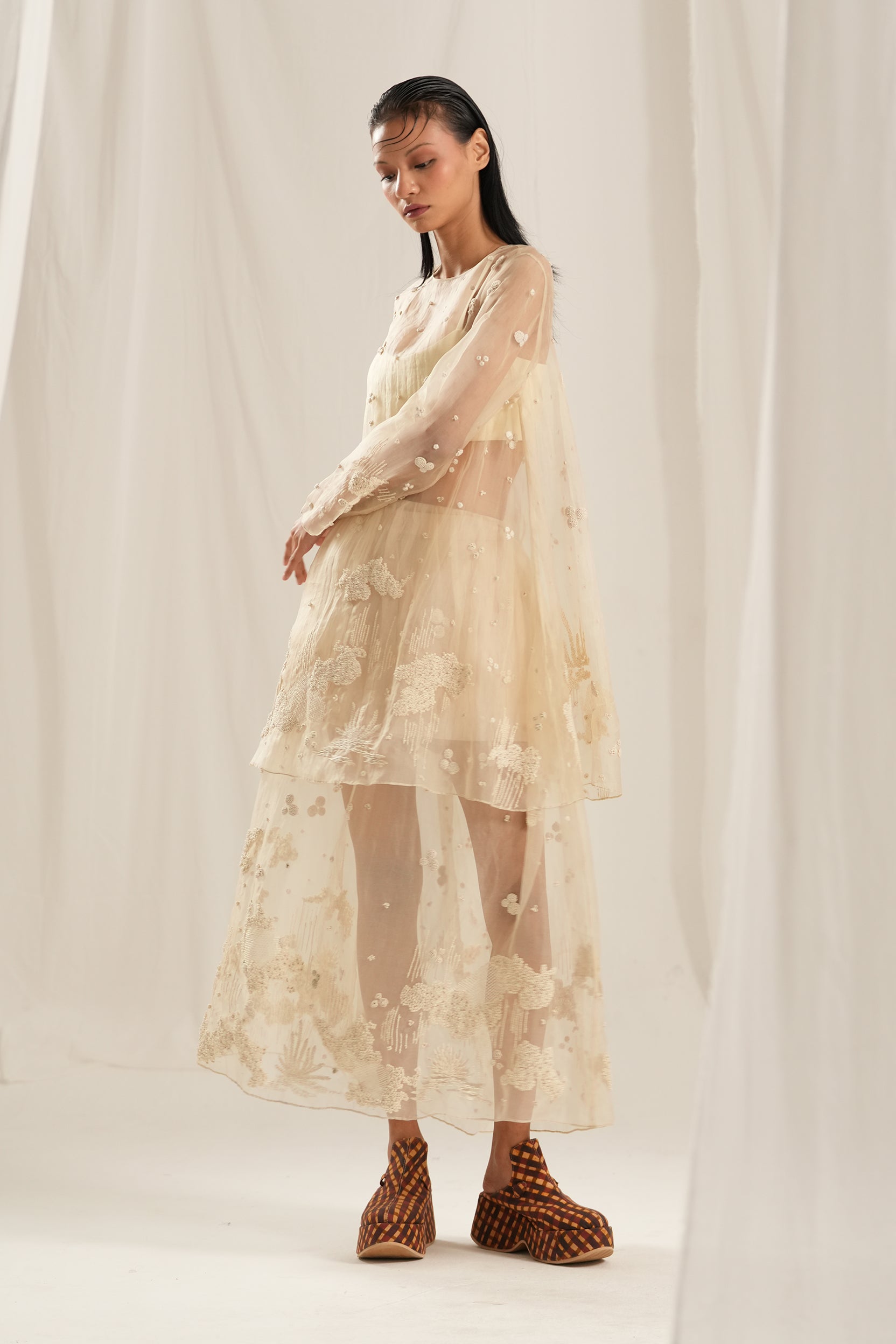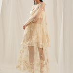 Crafted from luxurious beige silk organza, this dress features exquisite hand embroidery that adds a touch of artistry to your look. The gathered waist skirt creates a flattering silhouette, while the flare top offers a relaxed fit that moves beautifully with you