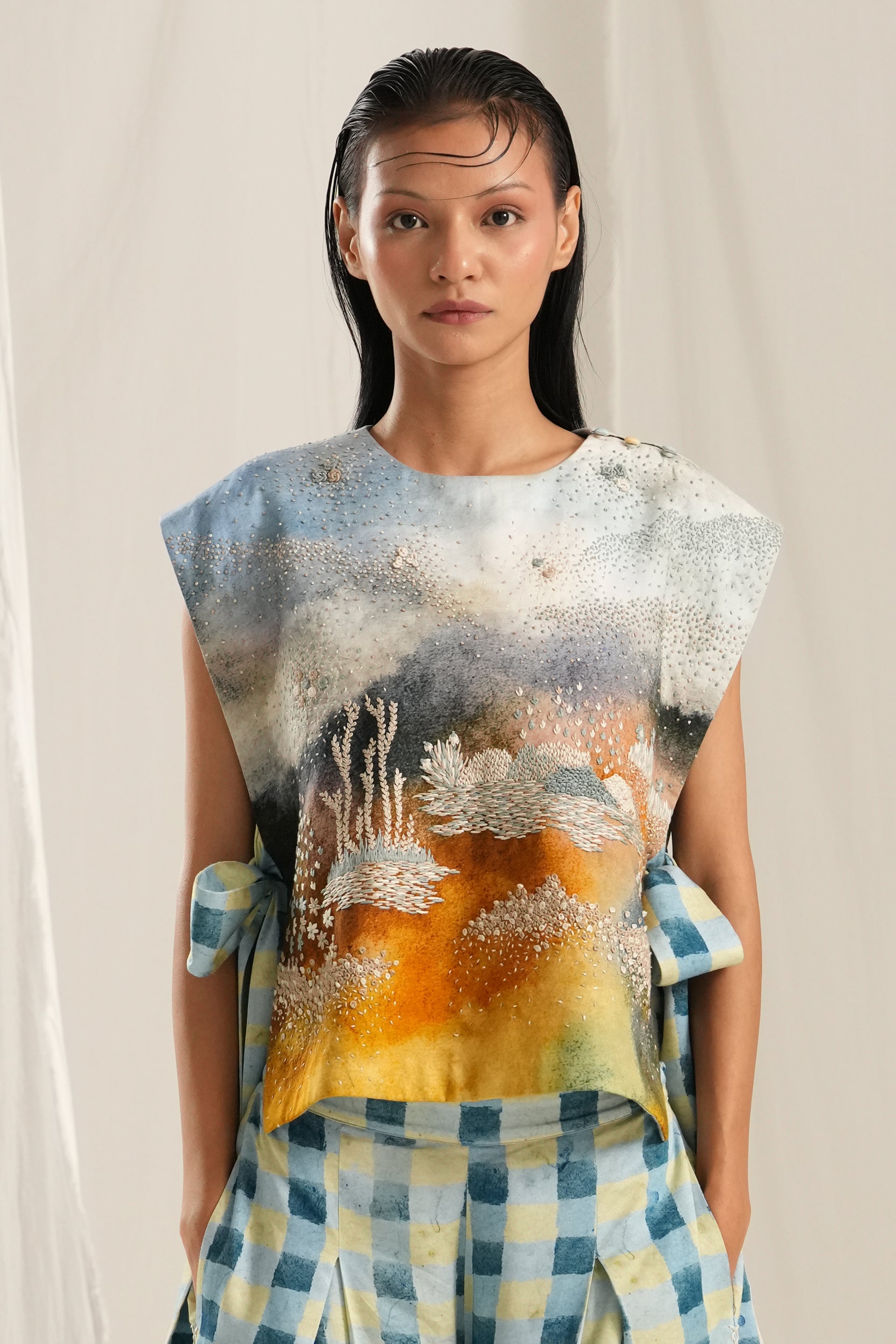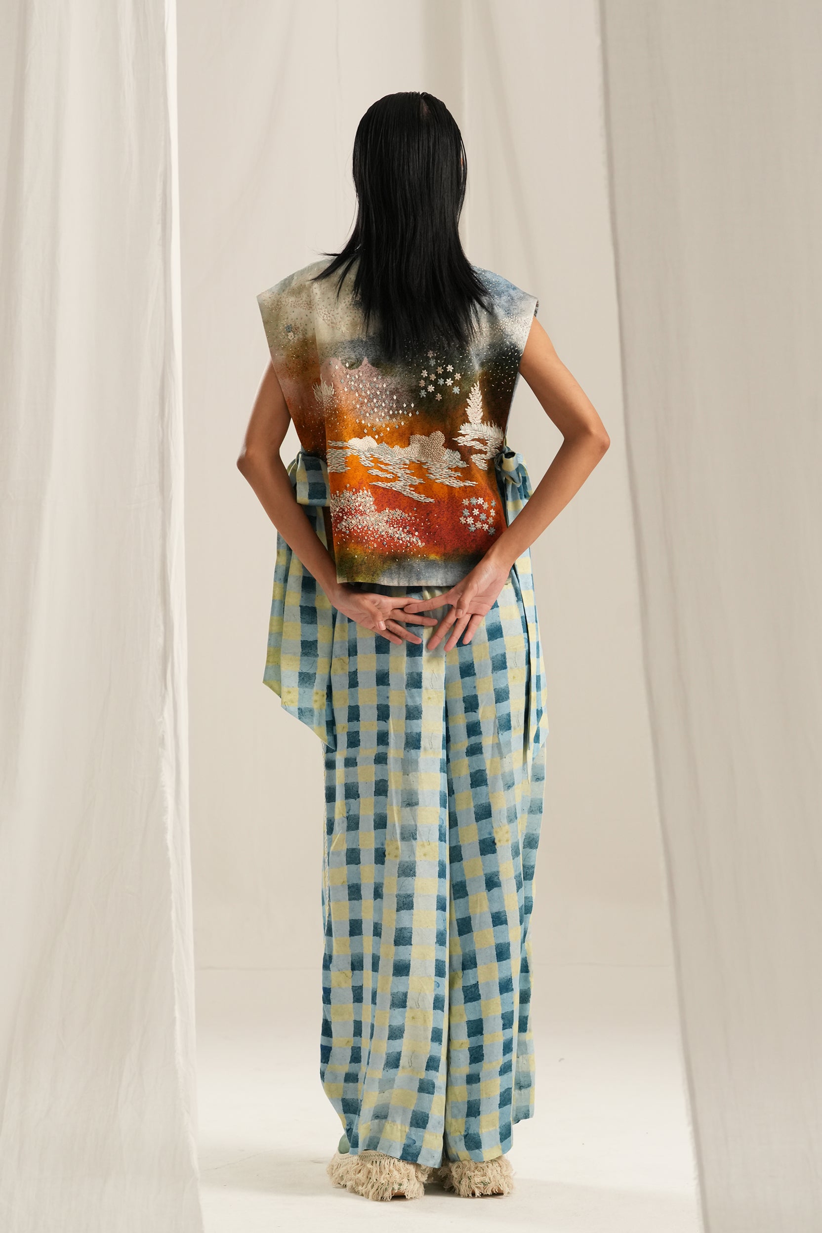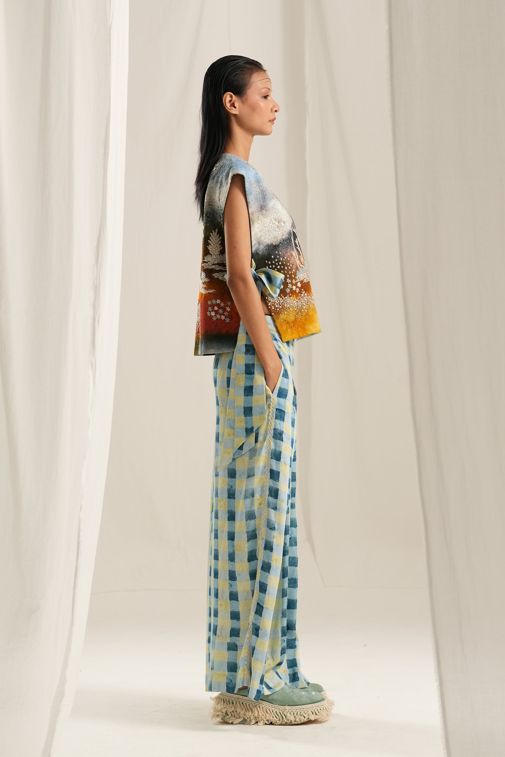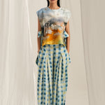 This blue check peat pants made in soft cotton fabric. It is handpainted and then digitally printed checks in shades of blue. it is relaxed fit and features elasticated half waistband. It also has pockets on both sides and has embroidery detail on the sides