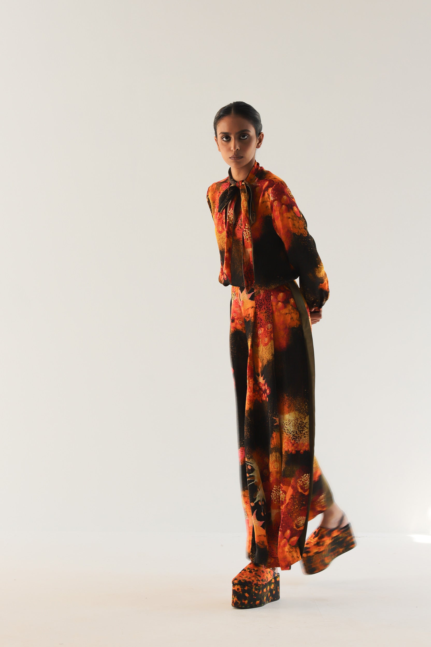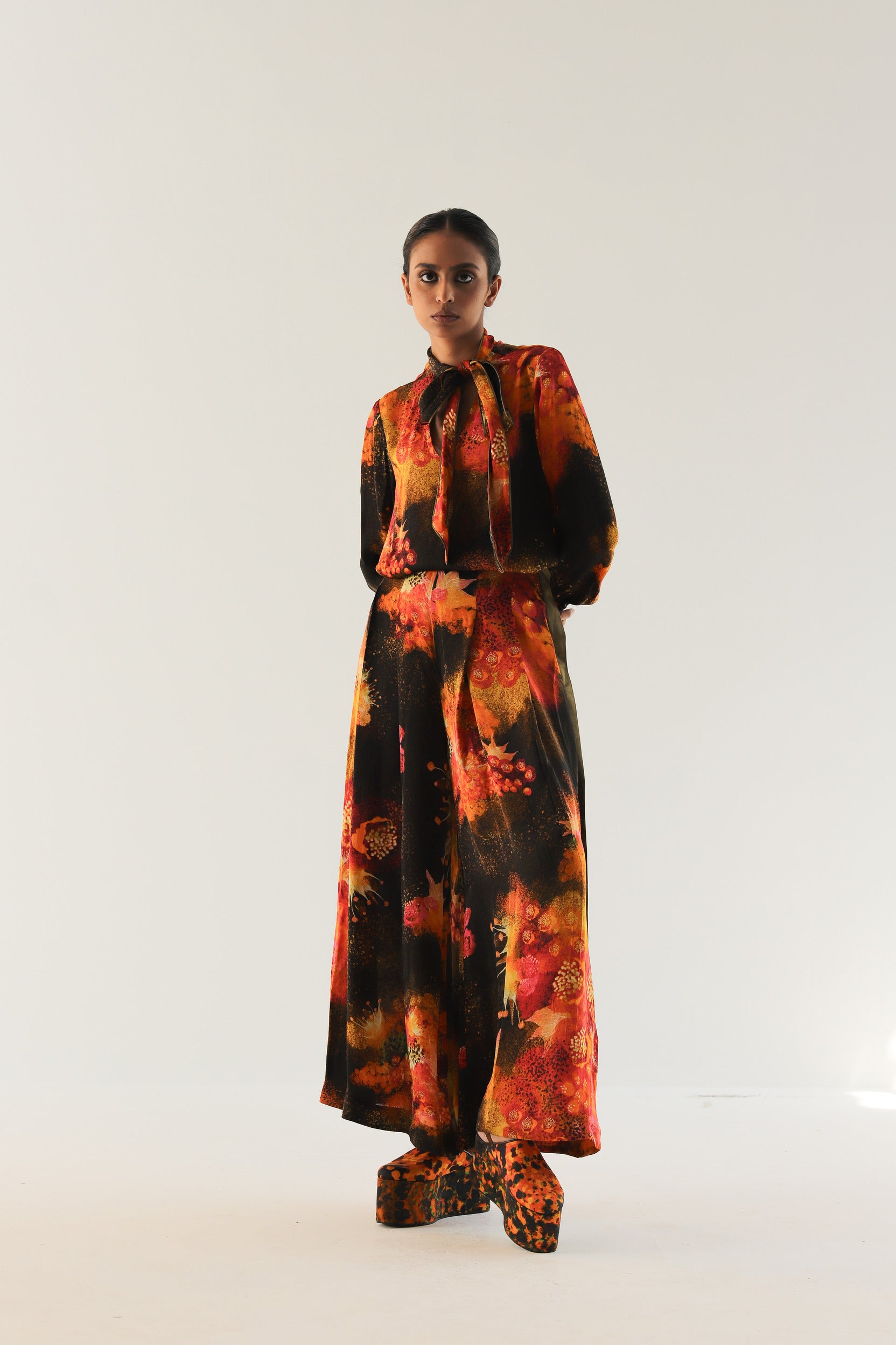 Brown Florid co-ord crafted in luxurious satin georgette offers a relaxed fit for easy comfort. It's charming bow tie detail at the neck complements fully flared trousers, adorned with contrast piping detail , making it effortlessly chic emsemble.