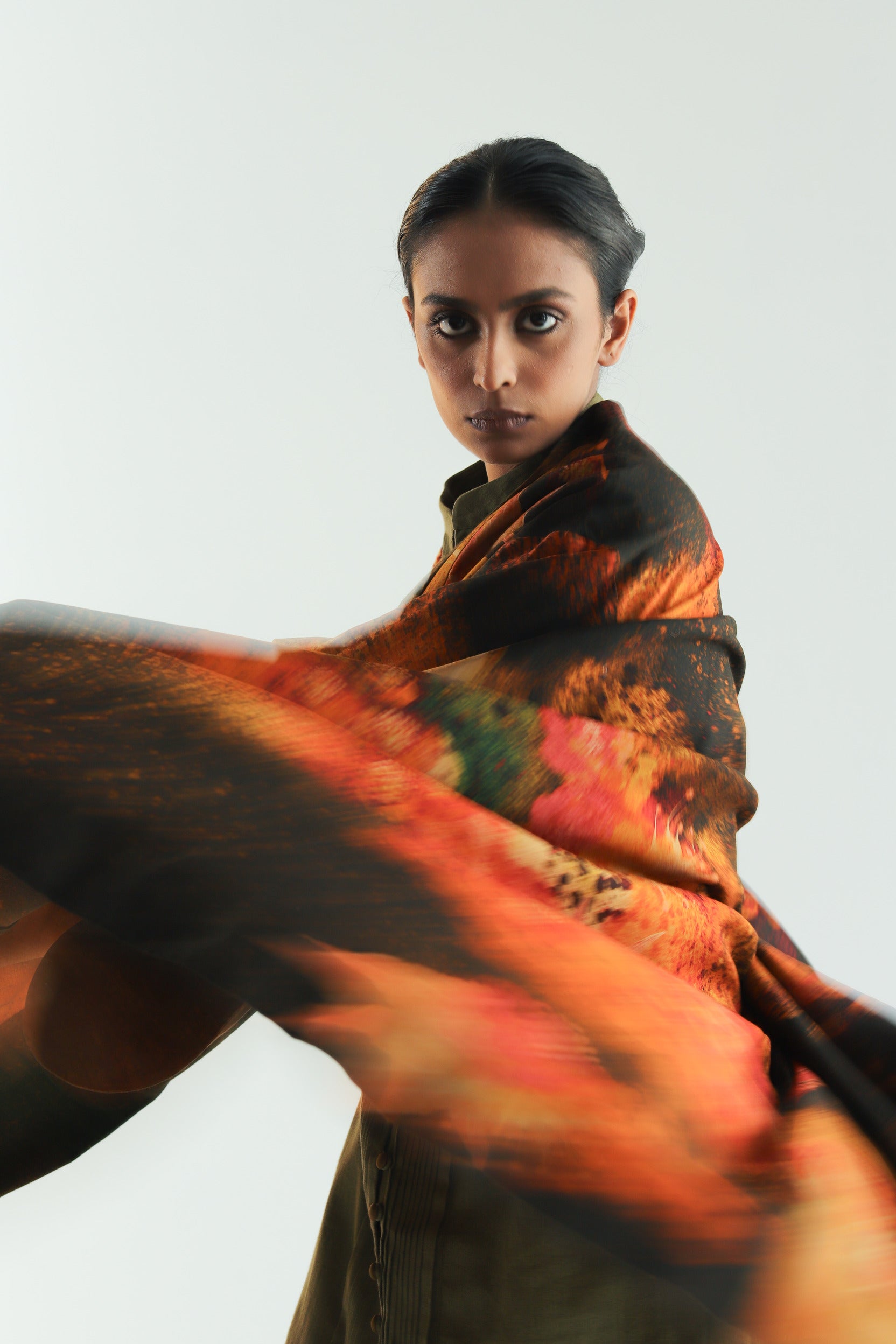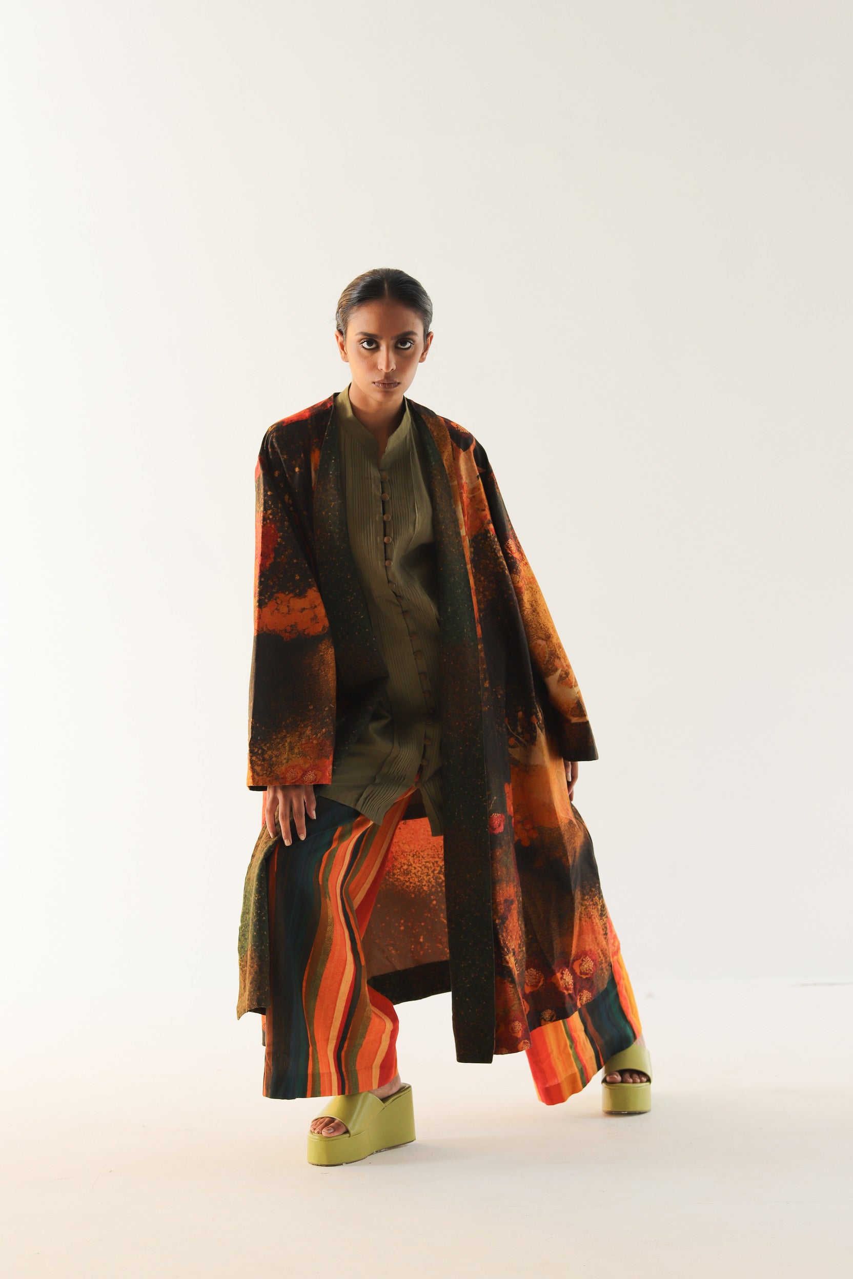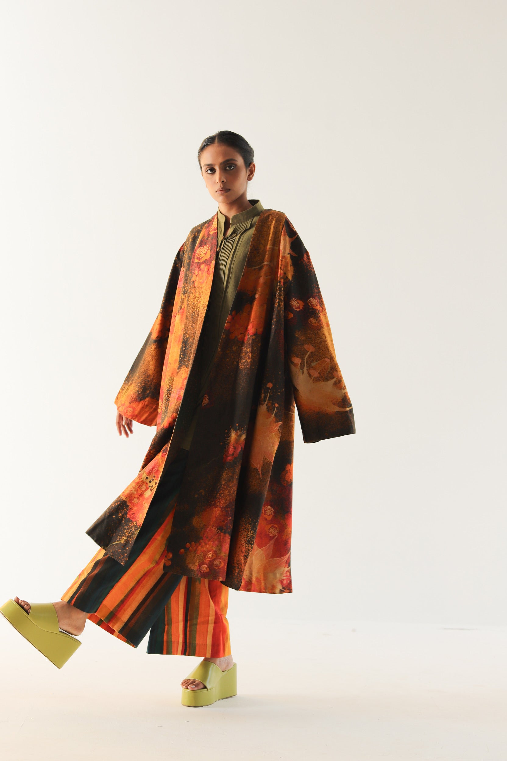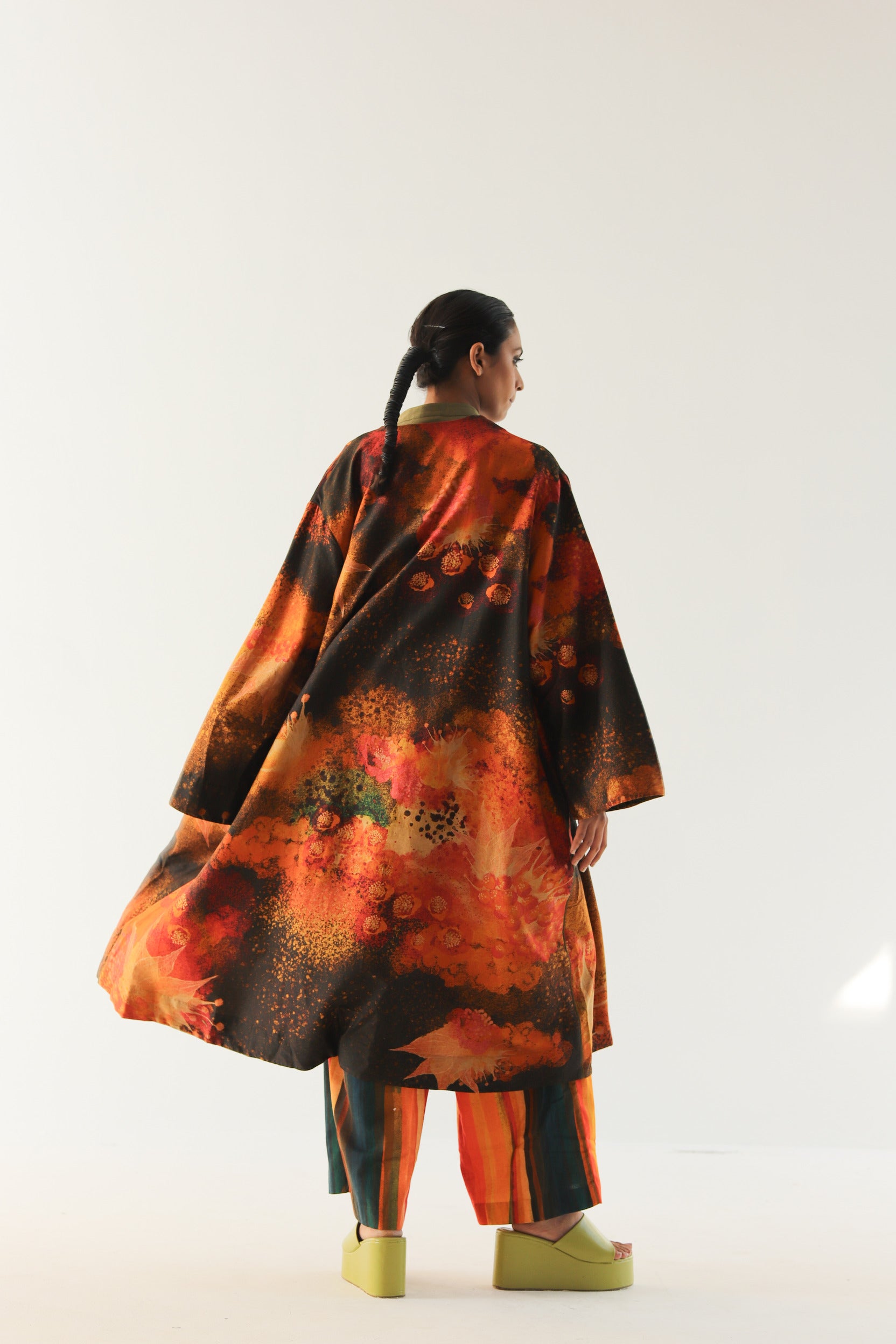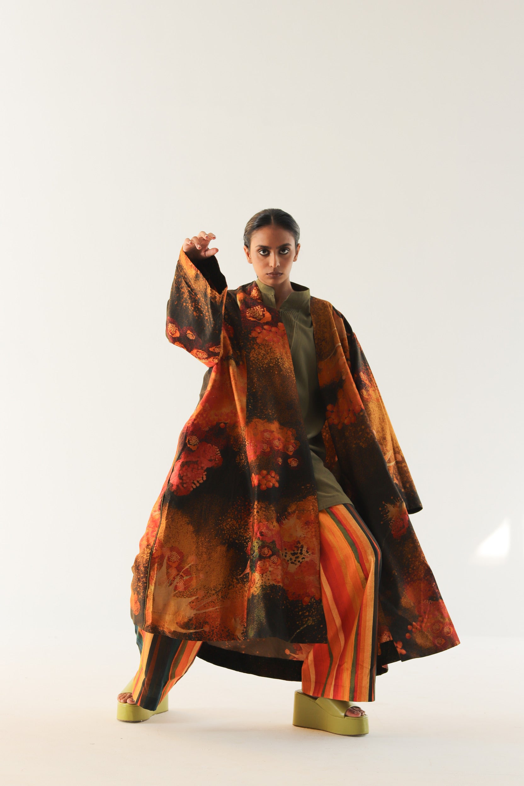Brown Florid overlay, made in pure Satin Chanderi. Its elegant A-line design features a front open style for a graceful look, complete with convienient pockets on both sides for added functionality. It is handpainted, digitally printed florals that enhance the beauty of the peice making it a statement.