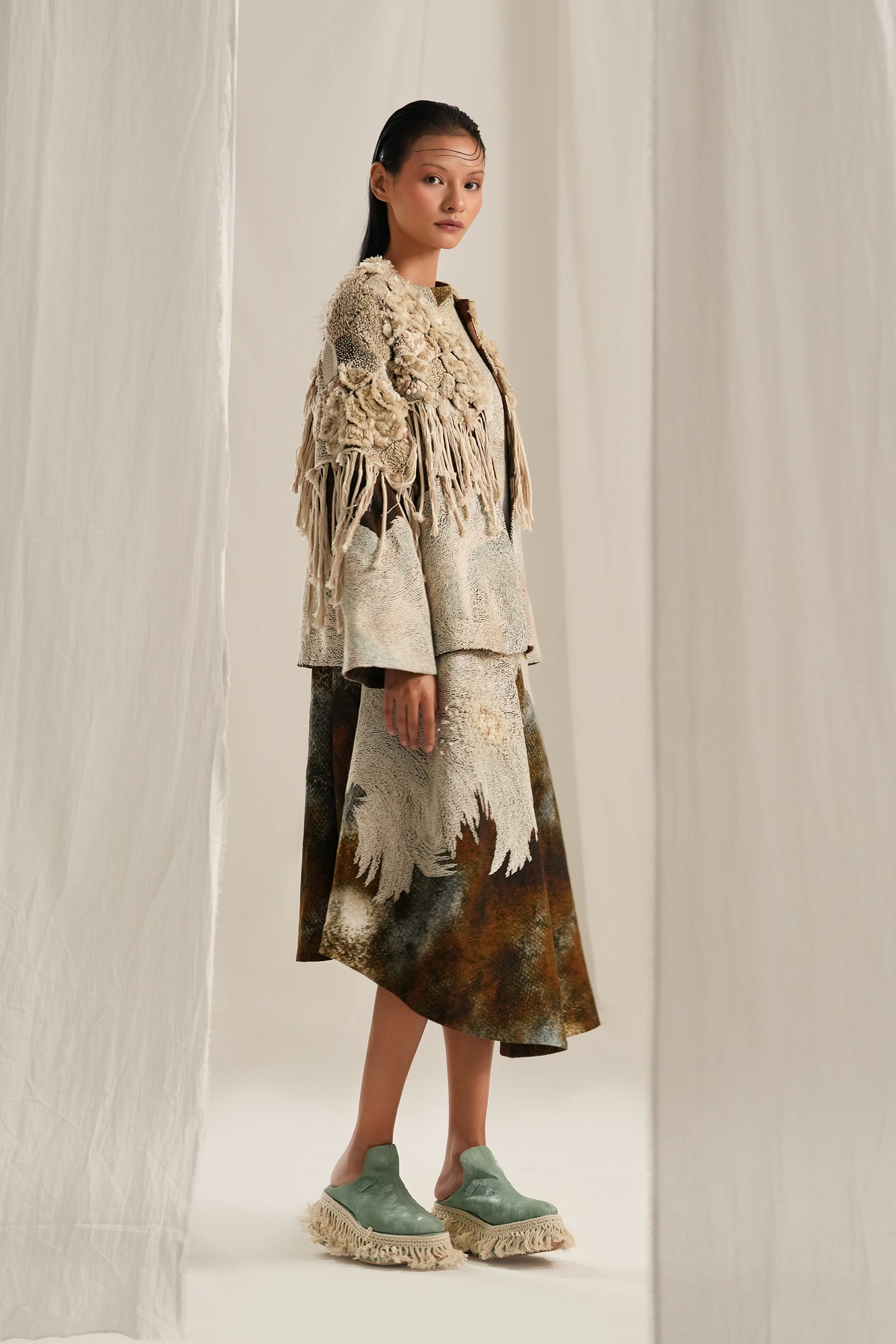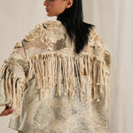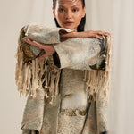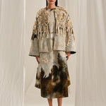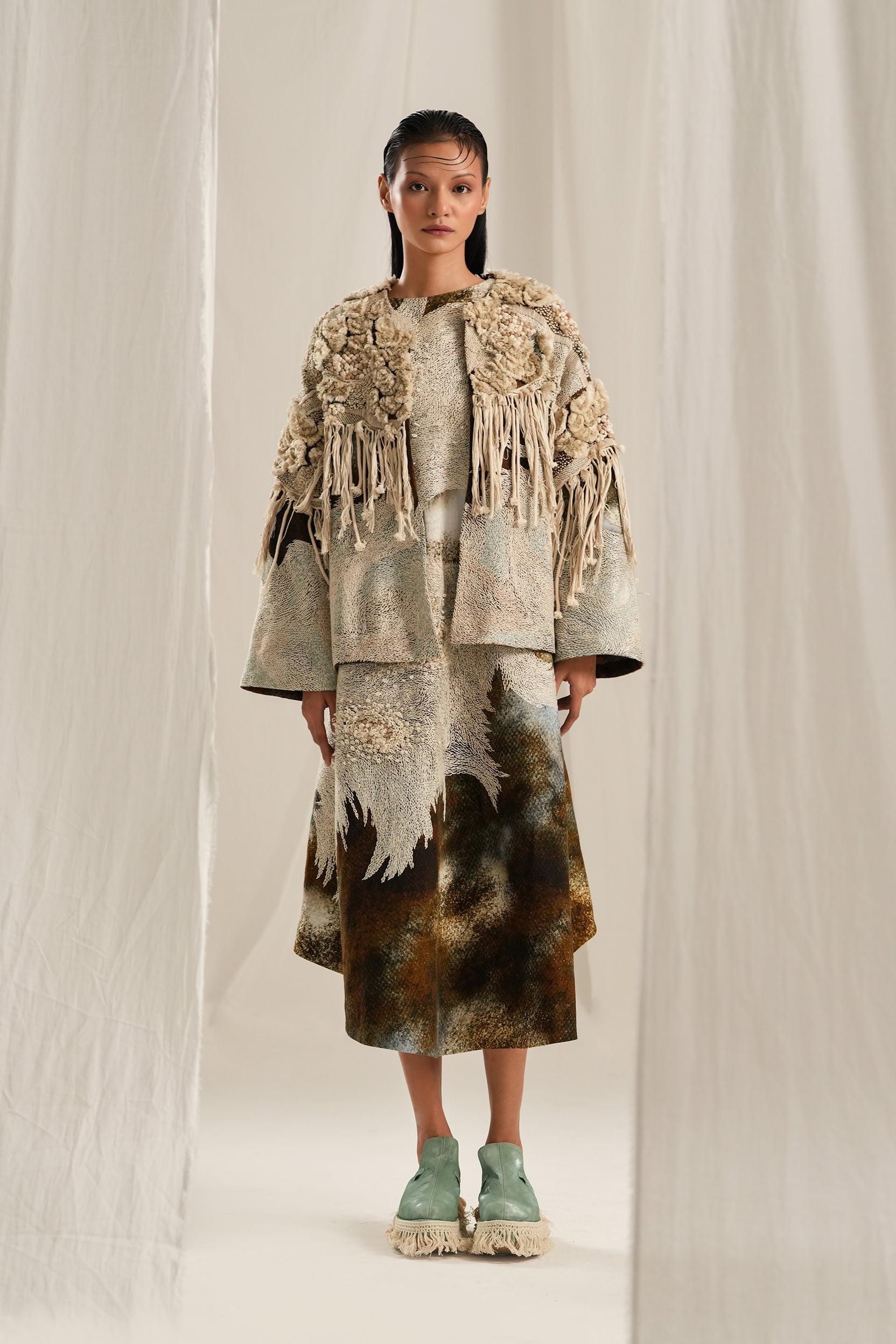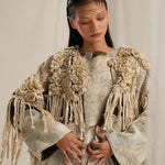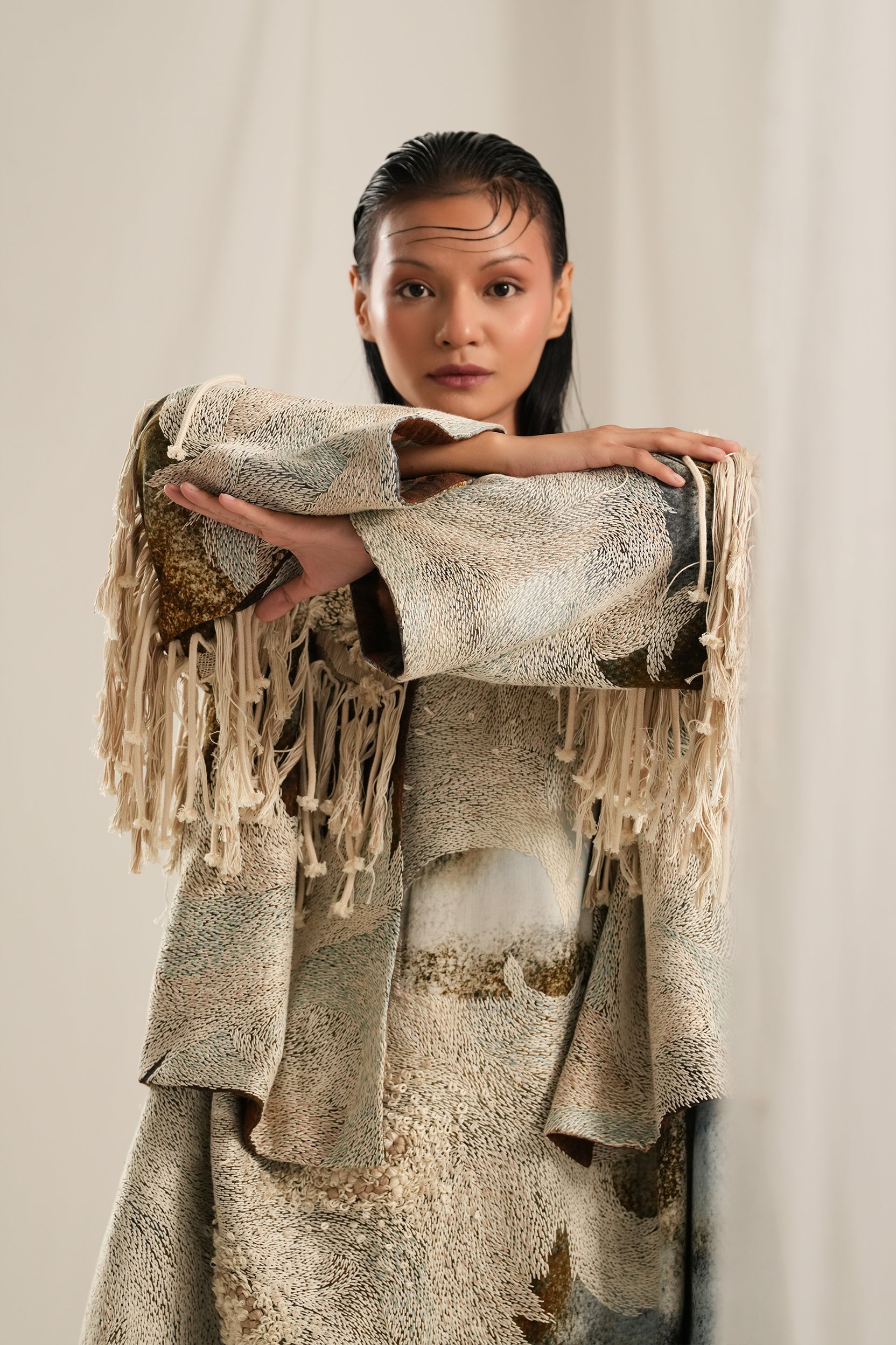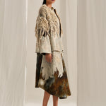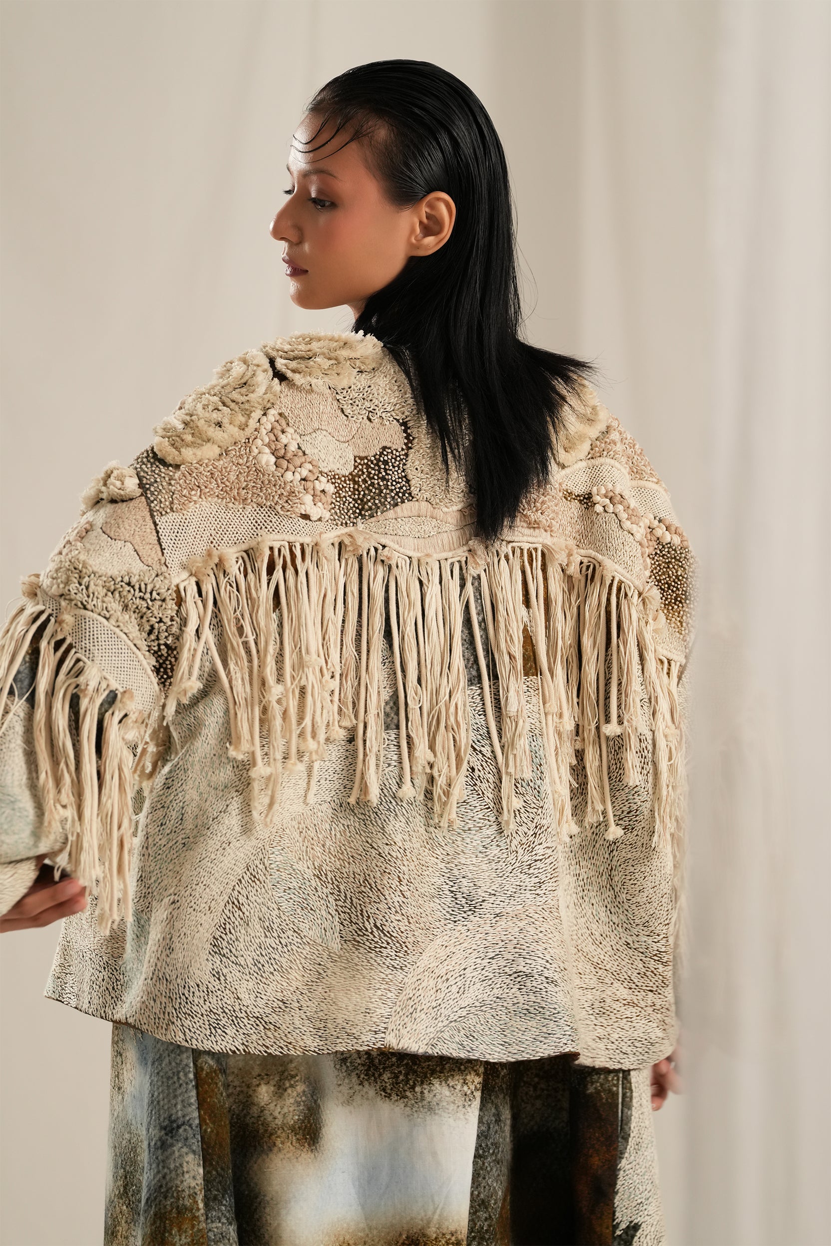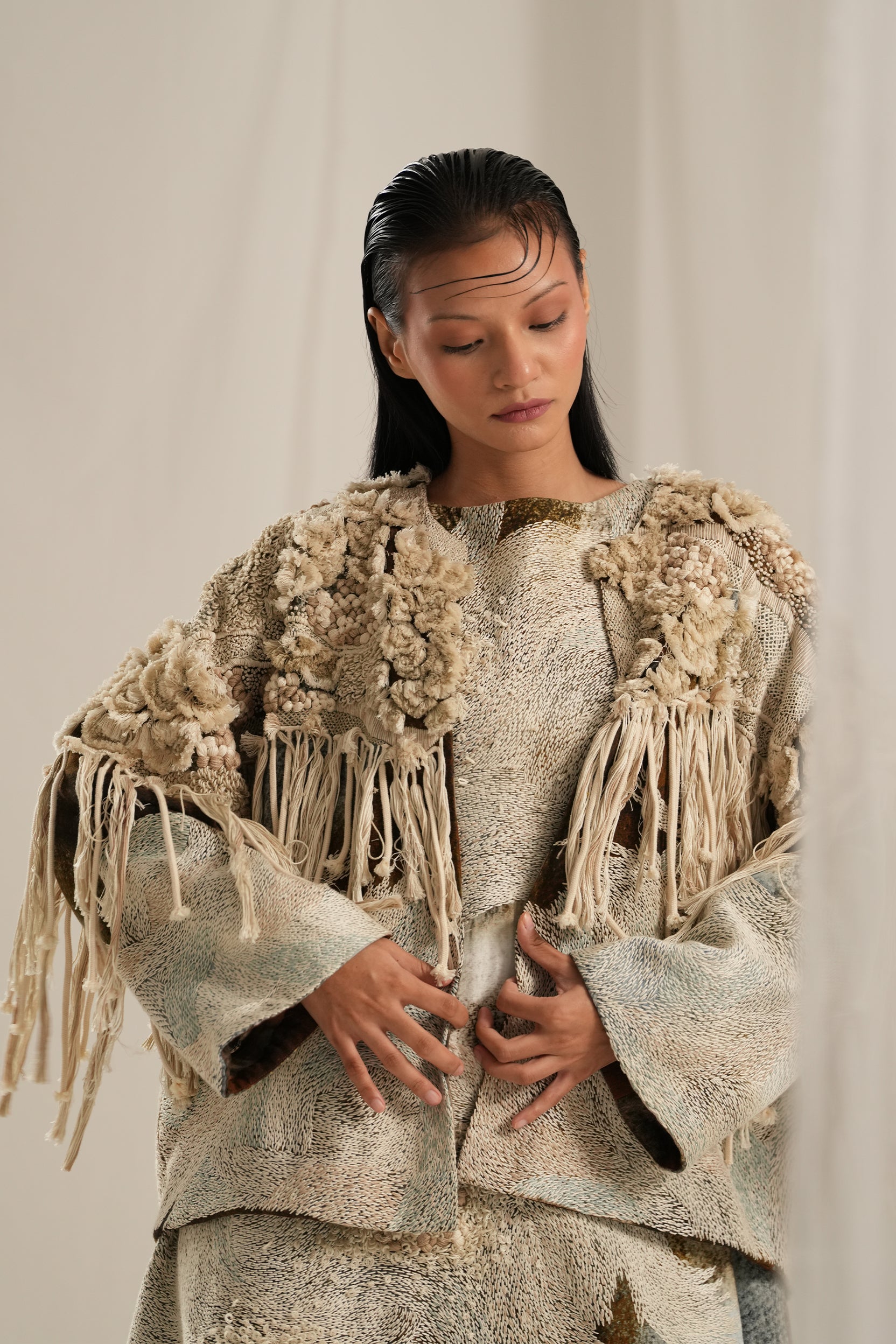 Hand embroidered relaxed fit kimono jacket made in cotton. Embroidery in shades of ivory and whites on hand painted digitally printed surface.