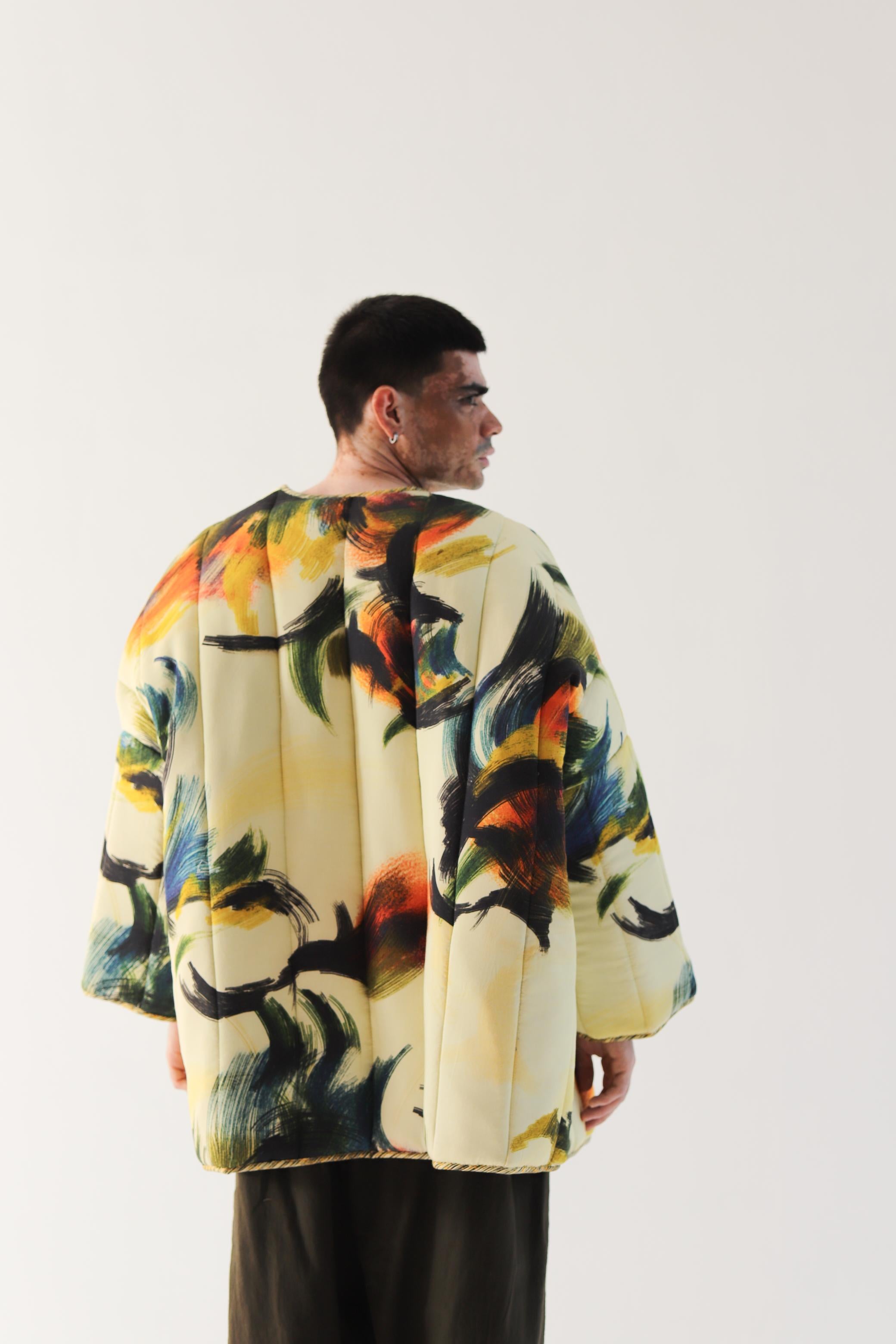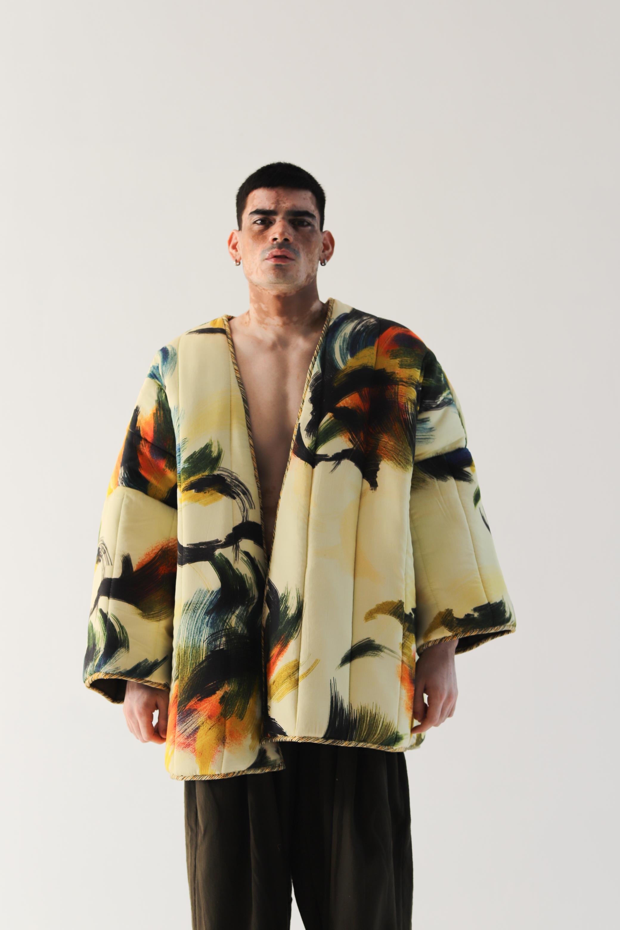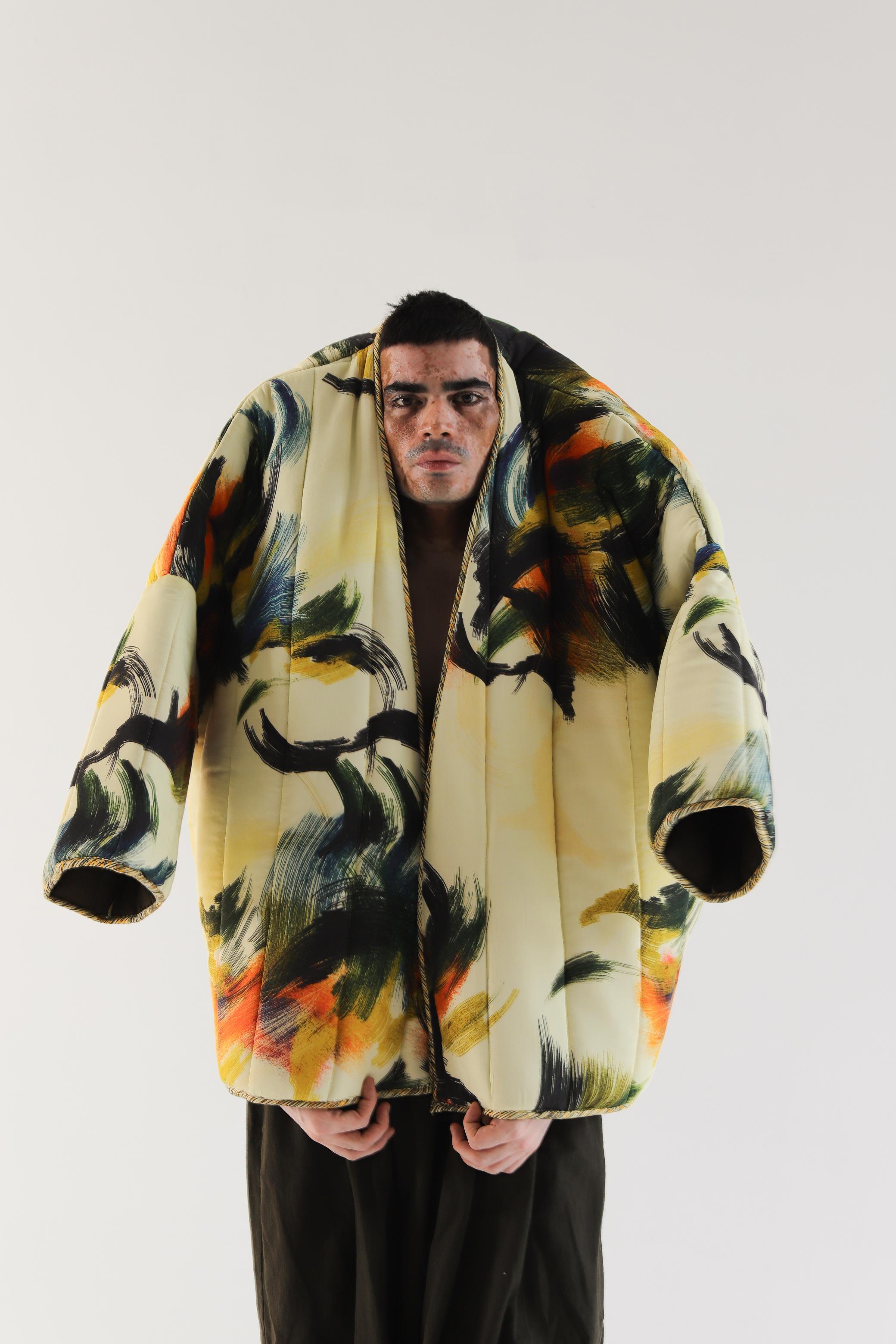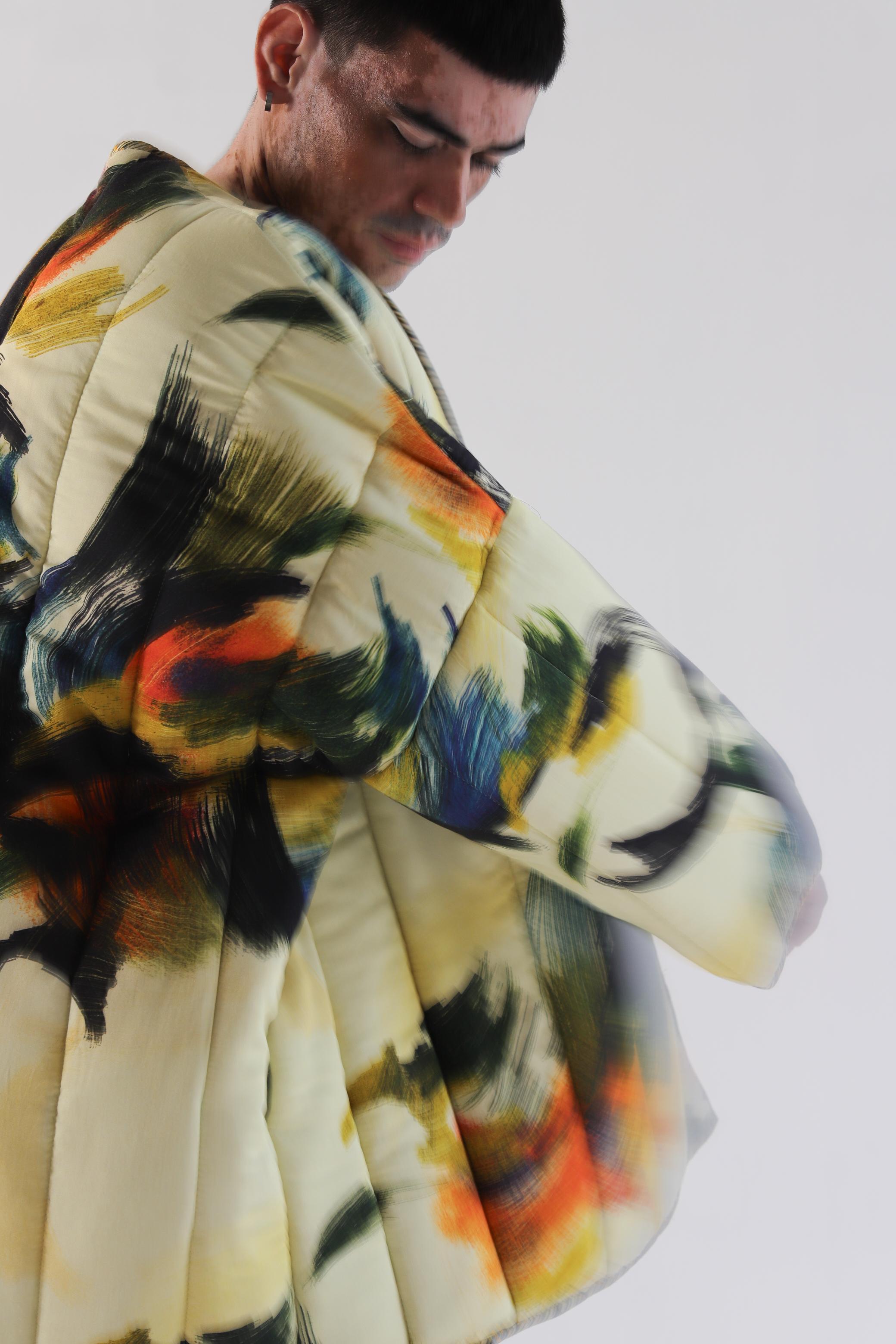 This brushstroke jacket is made from soft fabric modal satin ensuring comfort and style. This fully quilted puffer jacket provides exceptional warmth and coziness. It features meticulous stitching and convenient pockets for added functionality. It is fully handpainted, digitally printed brush strokes creating a dreamlike vibe.