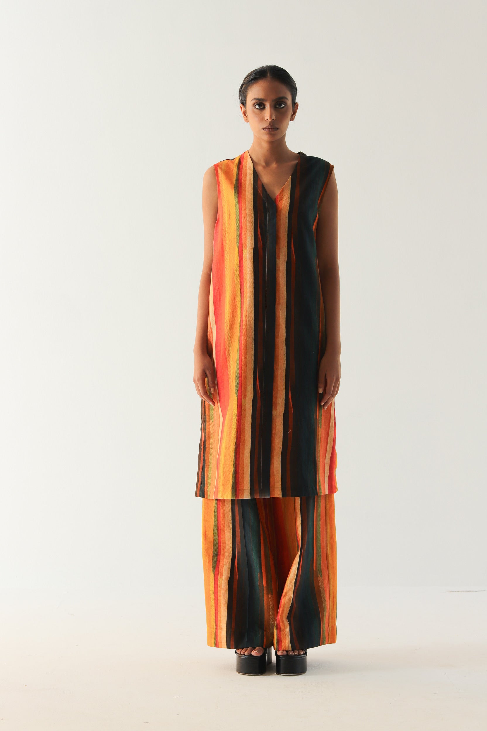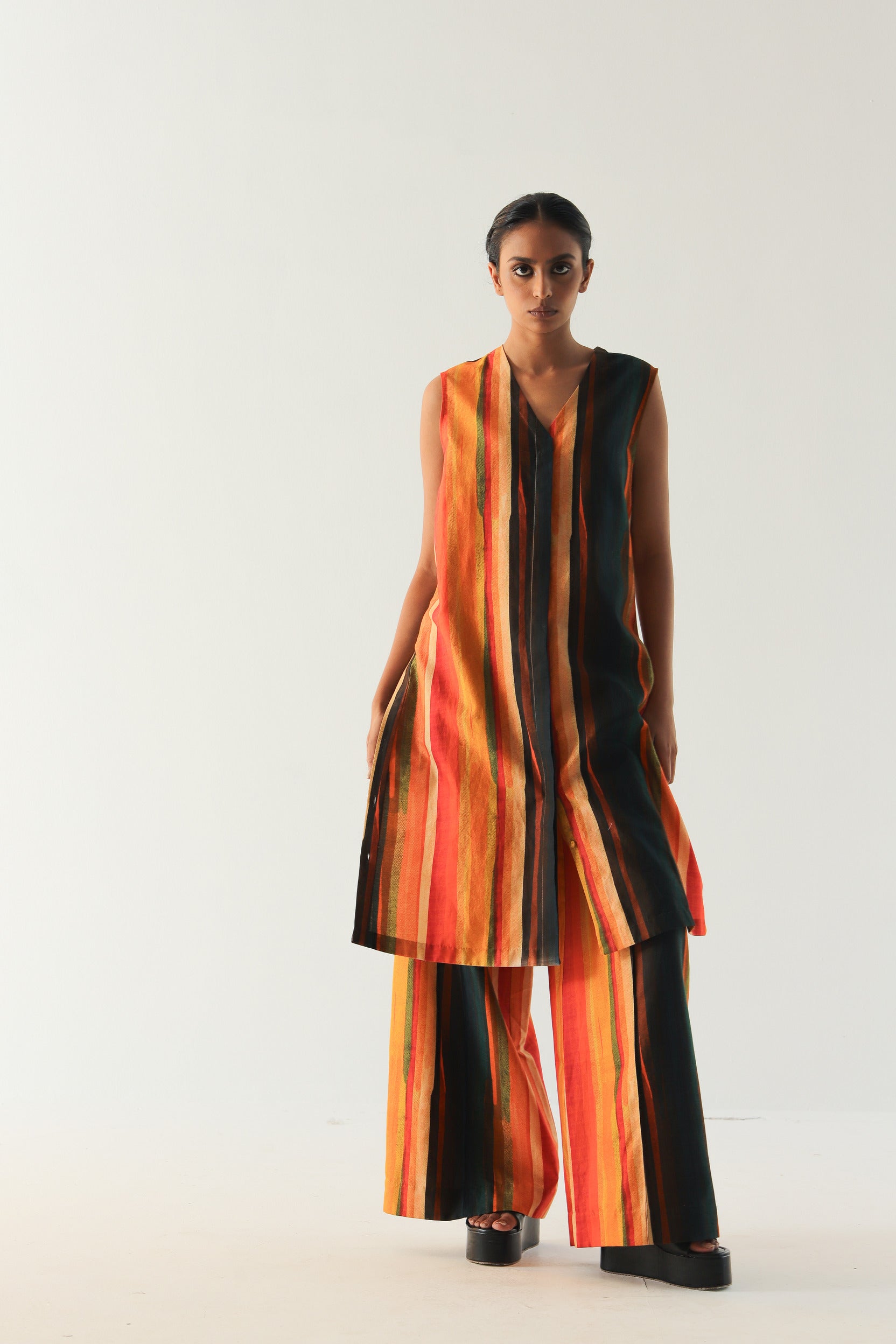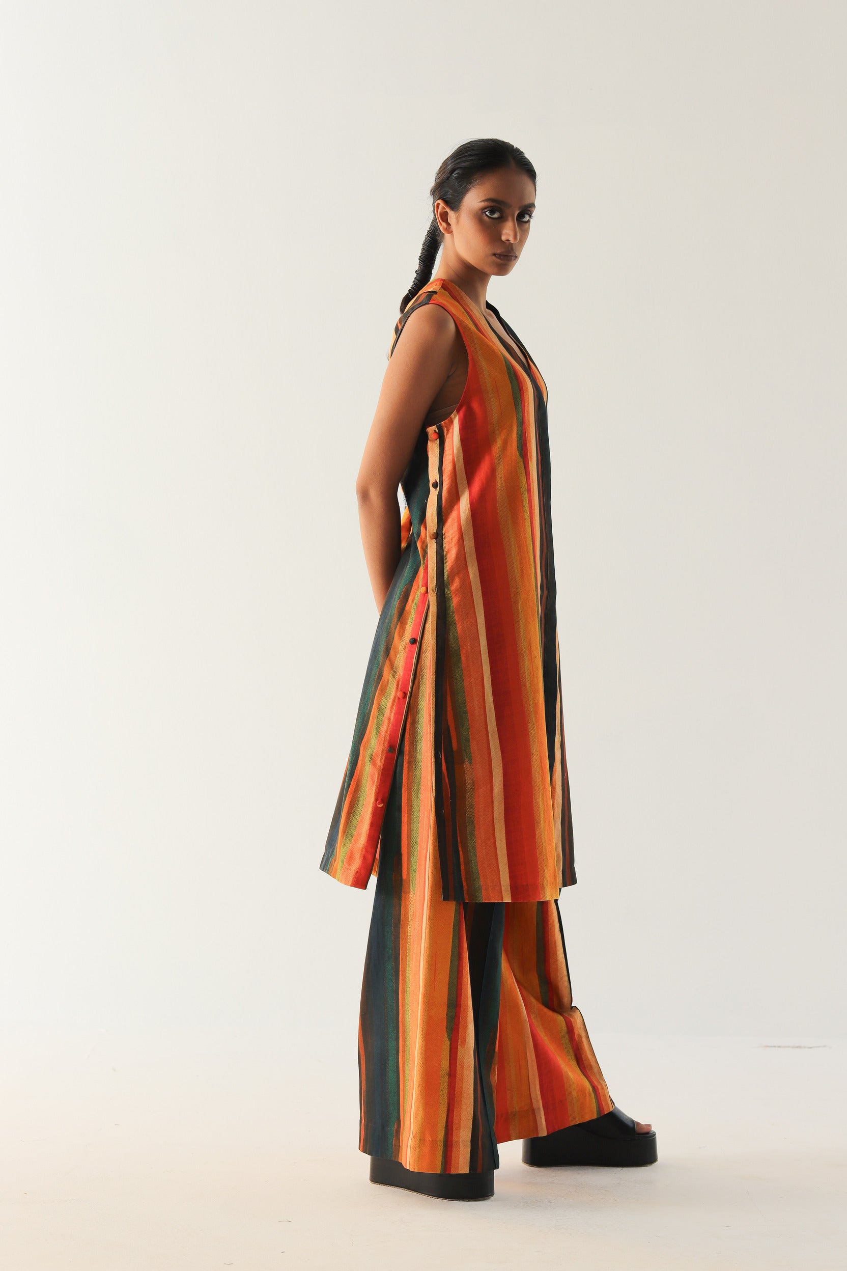 This calico stripe co-ord is crafted from pure satin chanderi ensuring both elegance and comfort.The sleeveless top features handpainted digitally printed colorful stripes that add a vibrant touch. Functional buttons on both sides and the front enhancing the functionality as well as style.Its elegantly paired with wide leg trouser, creating a trendy and sophisticated look