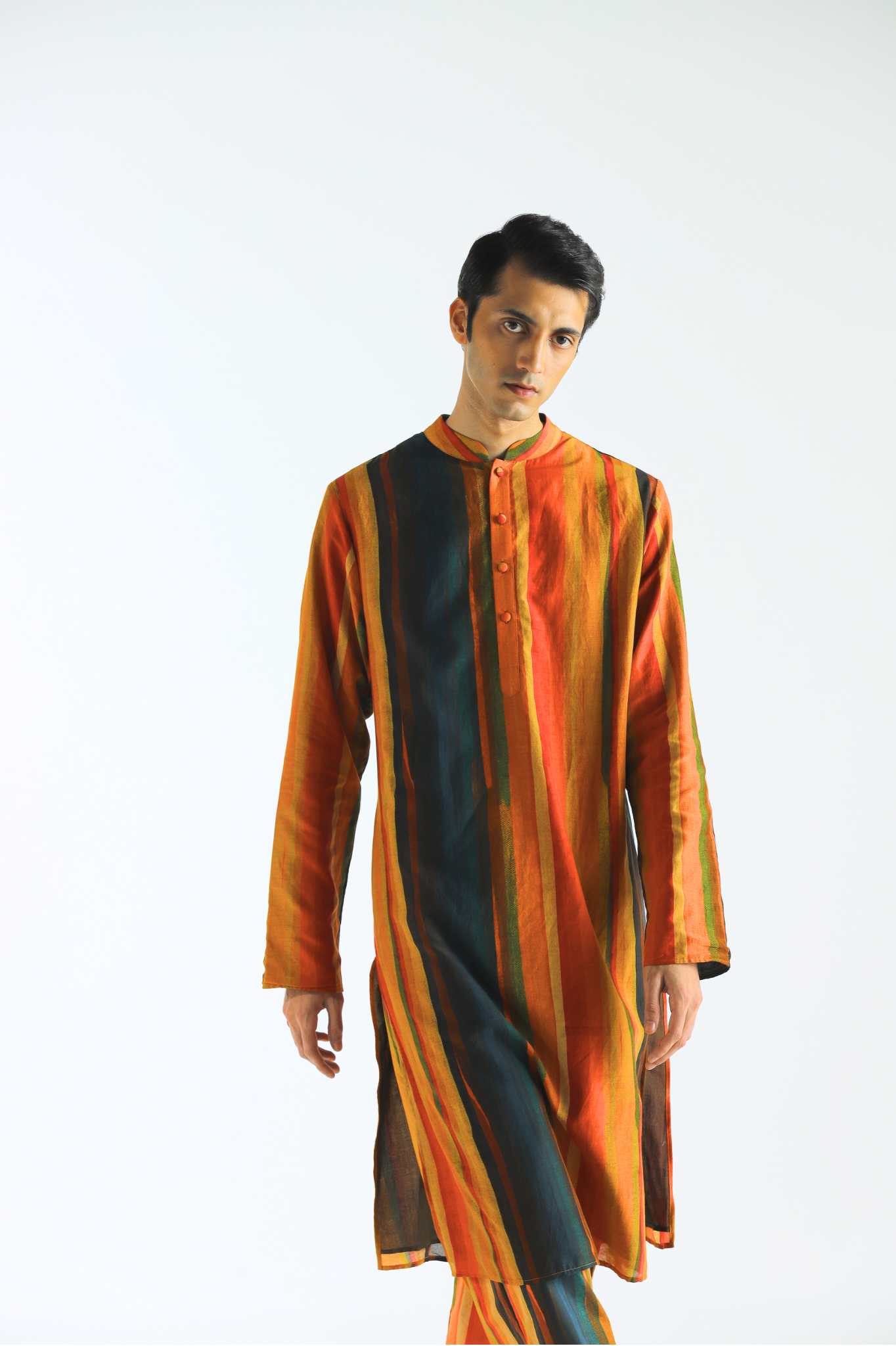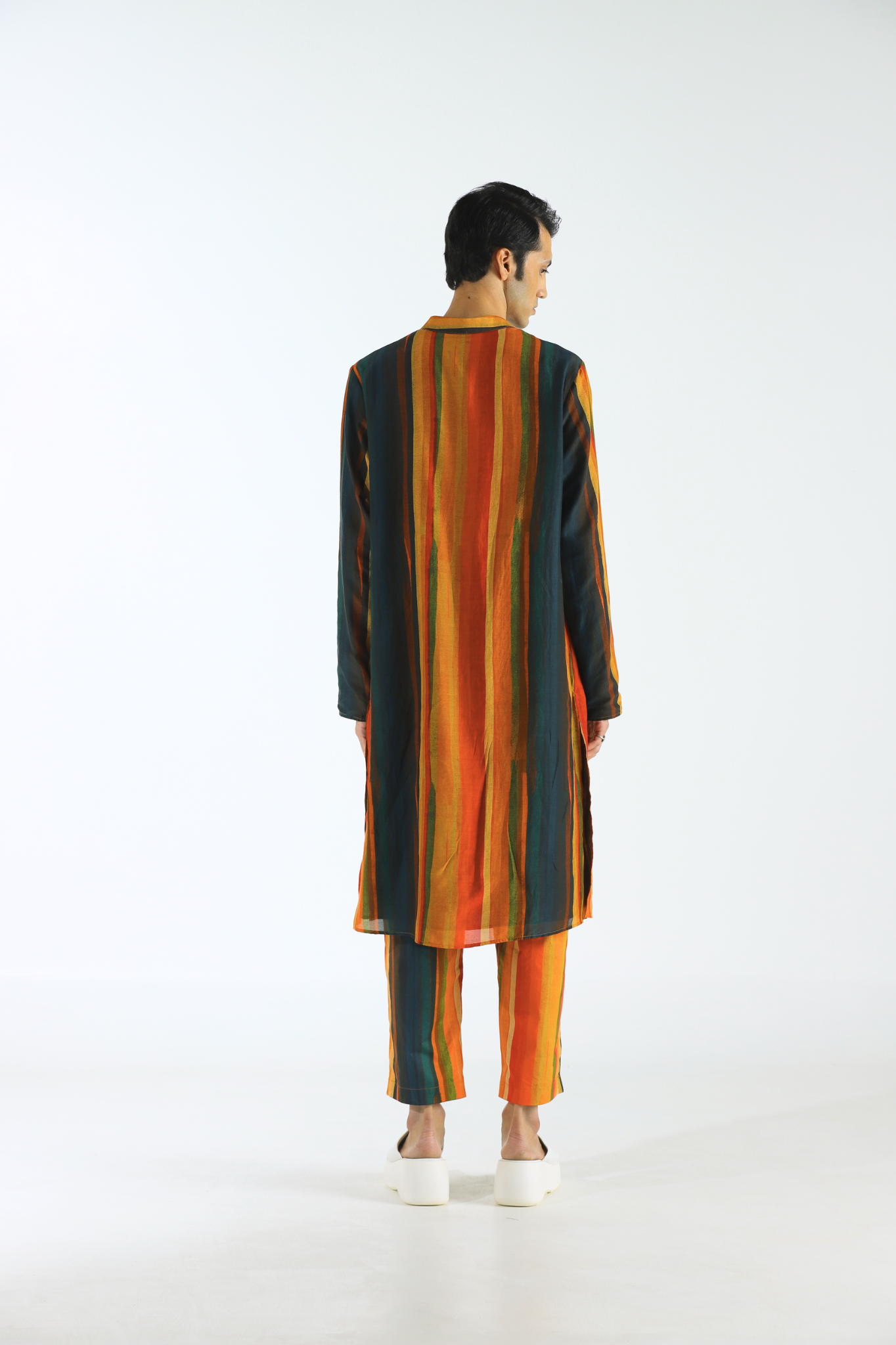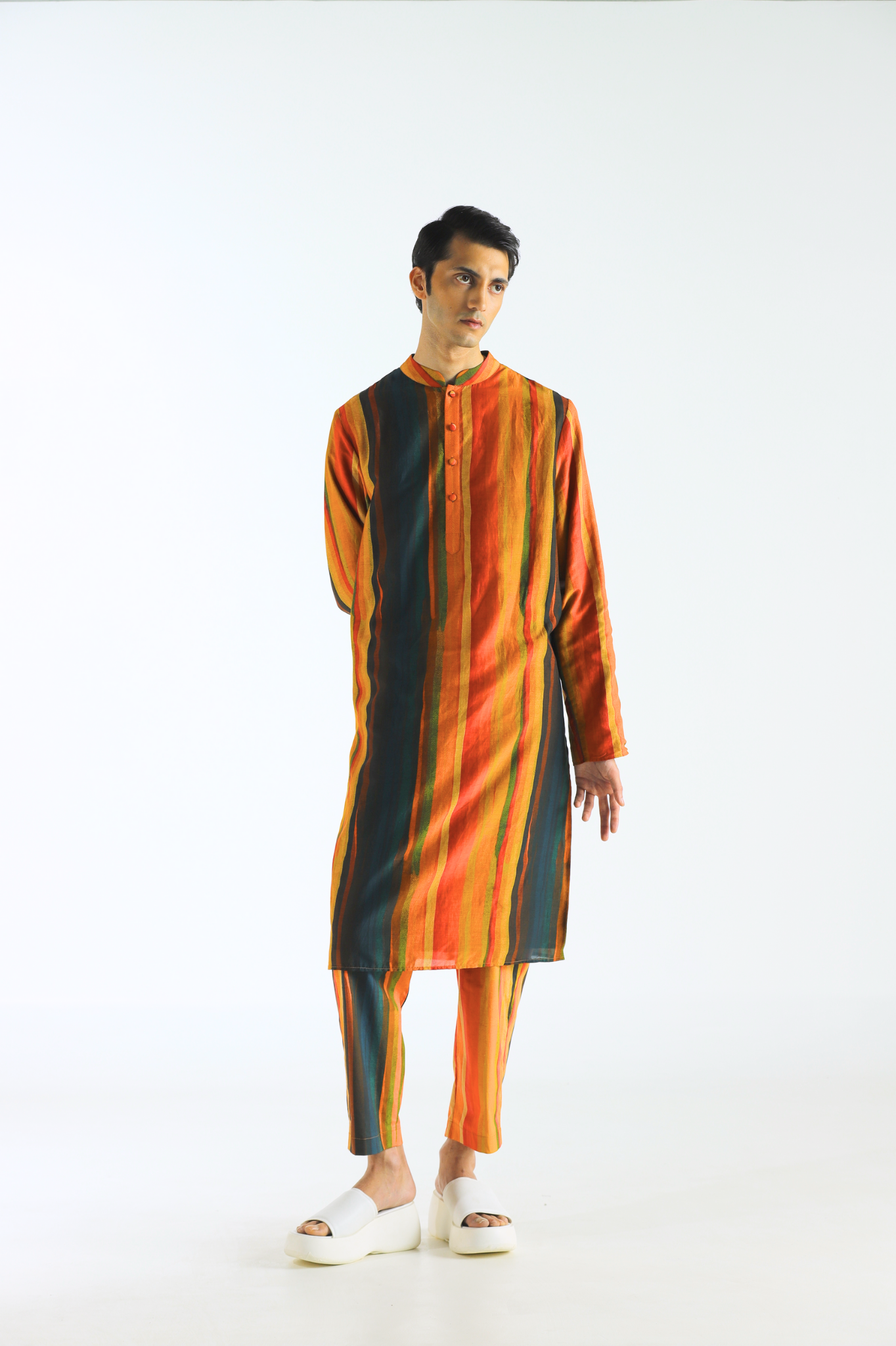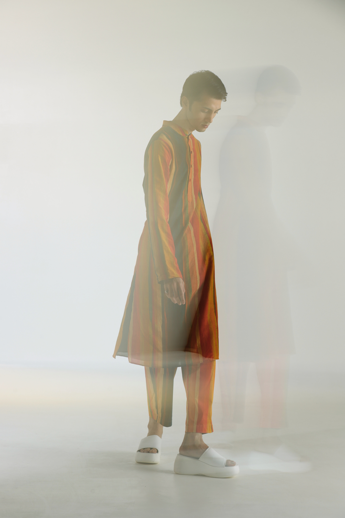 This ensemble is meticulously crafted in cotton silk, paired with digitally printed cotton lycra relaxed fit pants marrying luxury with comfort. Designed for a relaxed fit that exudes ease and comfort. This calico stripe kurta set is finely tailored and finished.