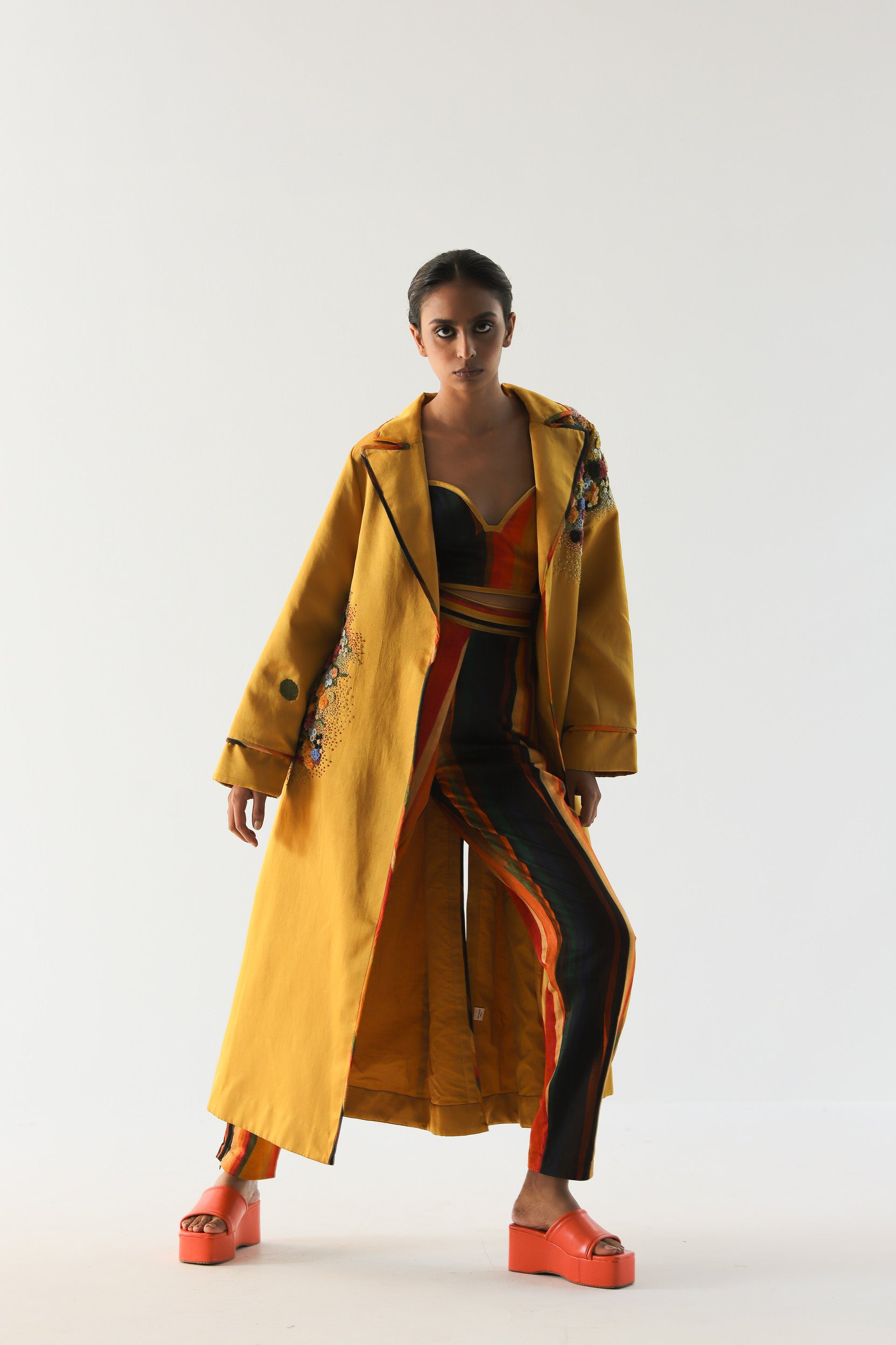 Calico stripe printed straight fit trousers are made in pure cotton silk satin. it is relaxed fit, tapered at the bottom finished with a zipper detail at the side seam.