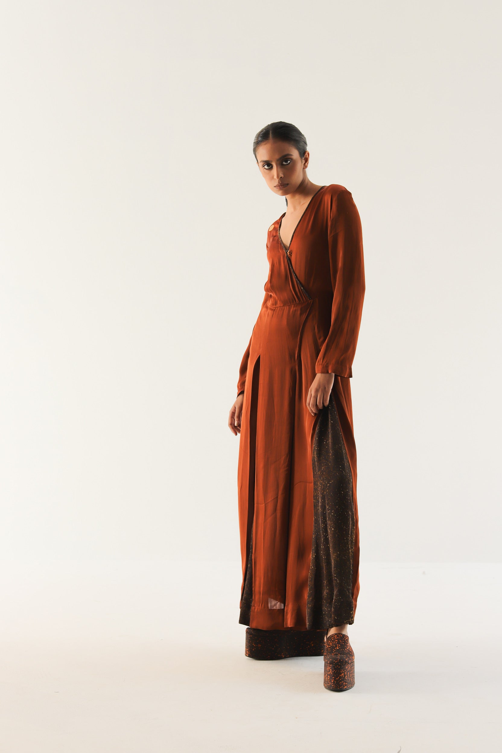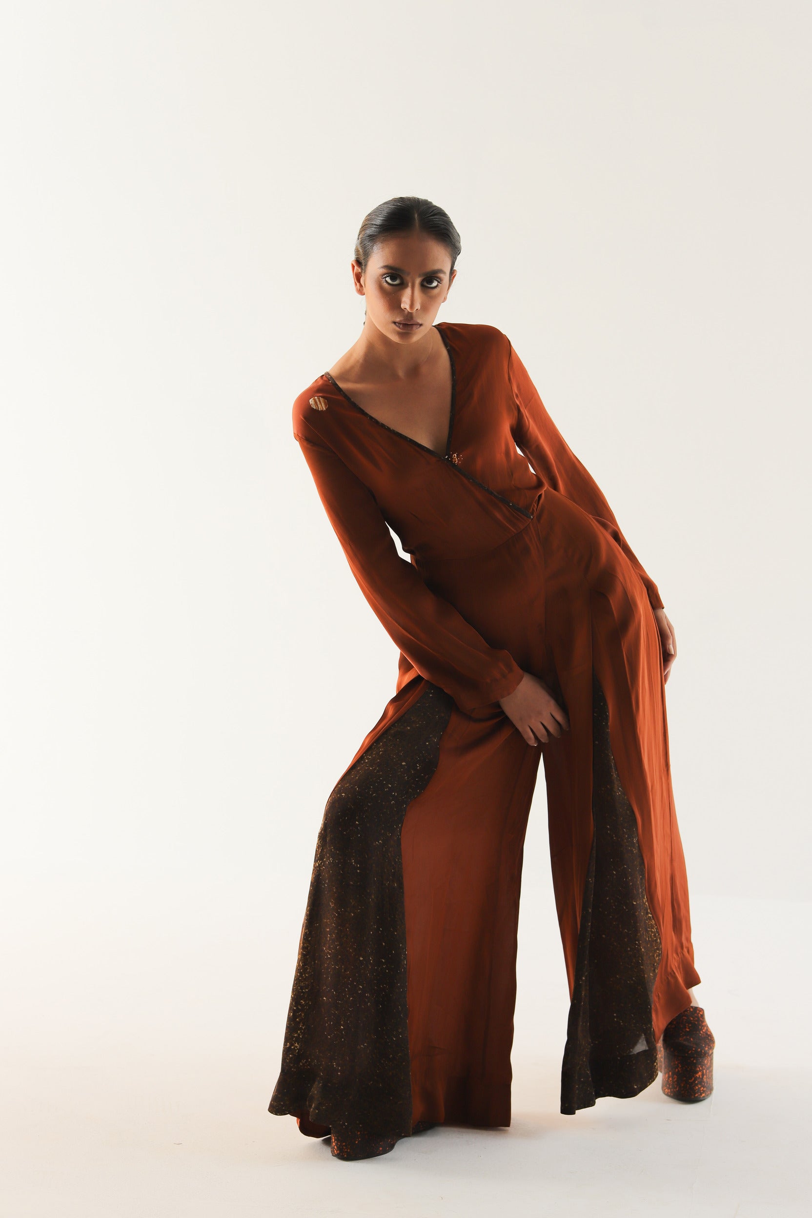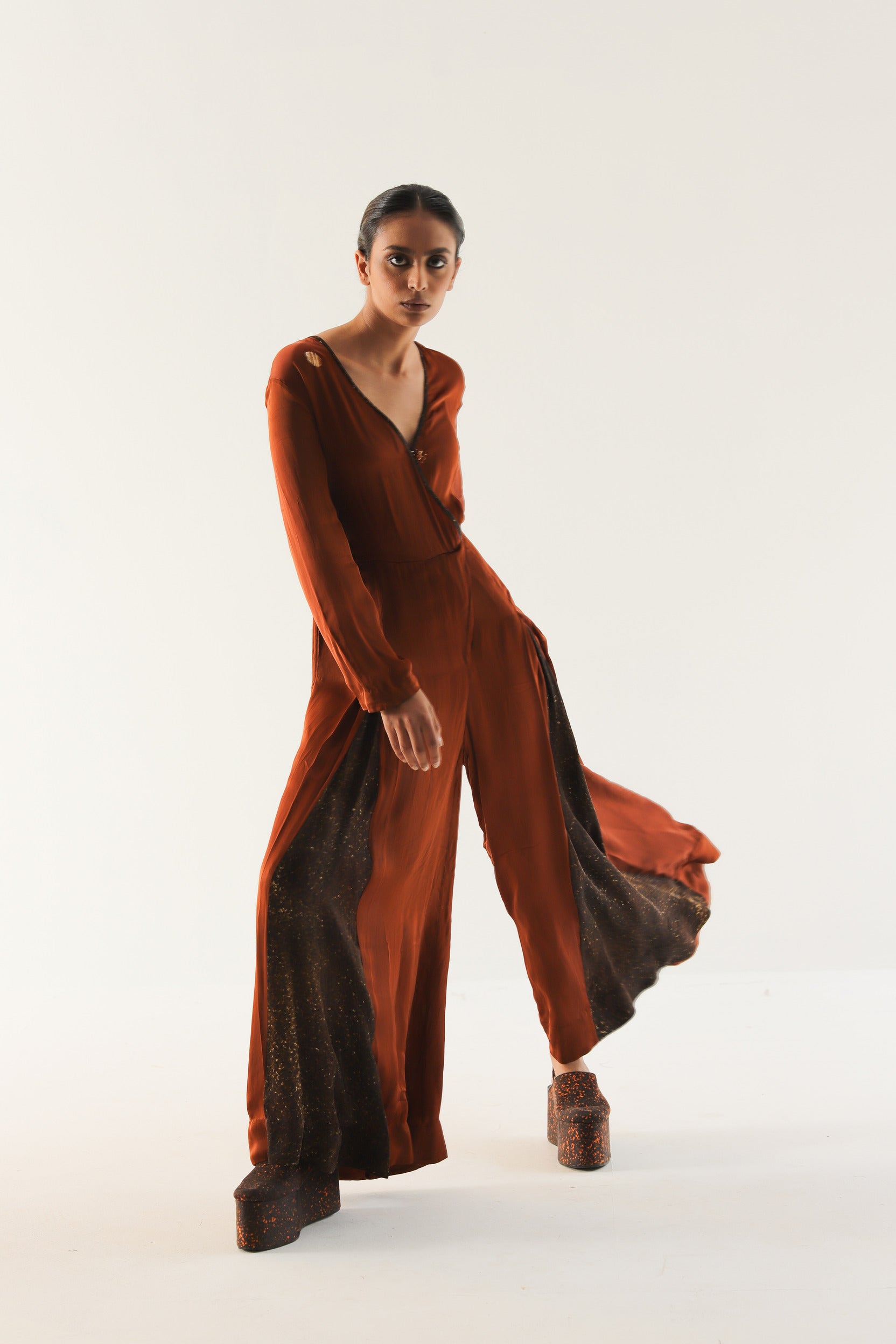 Elevate your wardrobe with this exquisite jumpsuit crafted from soft satin georgette. Its alluring V-neck design adds a touch of sophistication, while the wide-legged bottom ensures both comfort and a fashion-forward silhouette.Finshed with contrast binding.What truly sets this jumpsuit apart is the meticulously hand-painted digital printed brown freckle panel. This artistic detail adds a unique and captivating dimension to the ensemble, making it a standout piece in any setting. The rich caramel hue combined with the freckle panel creates a harmonious blend of modernity and classic charm.Our Caramel Jumpsuit is more than just clothing; it's a statement of individuality and style.