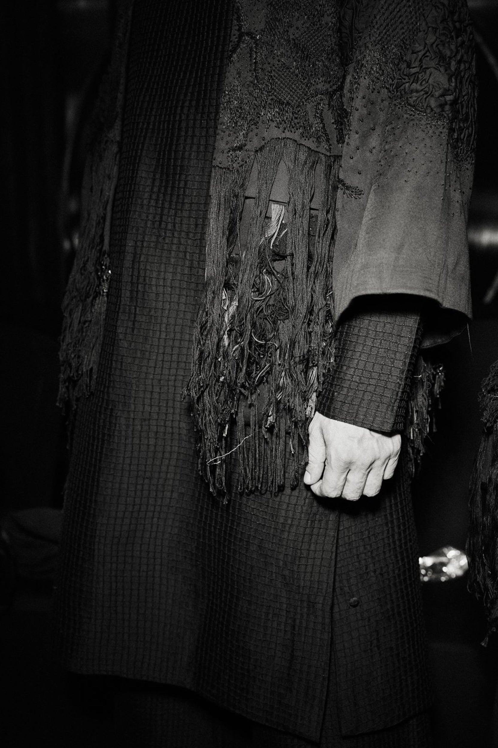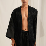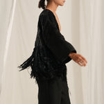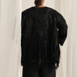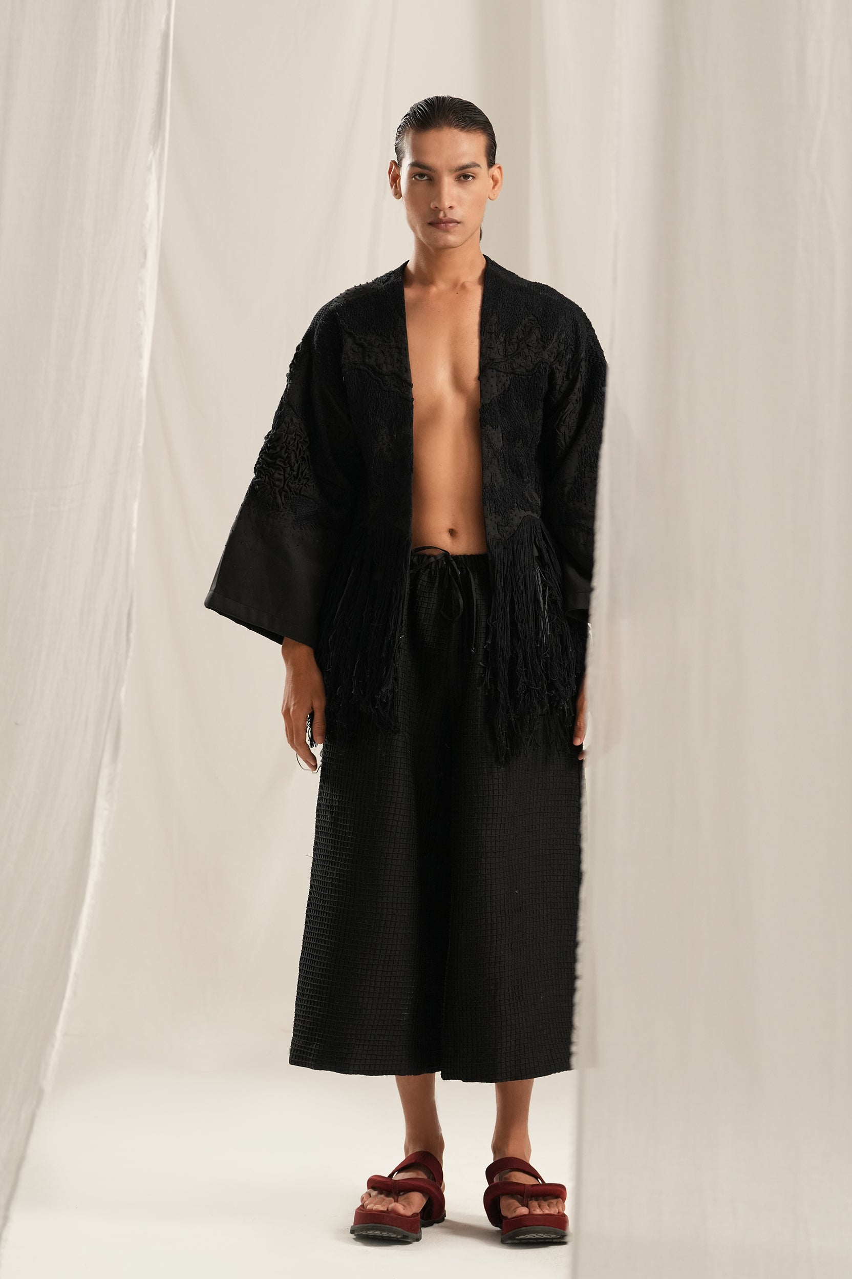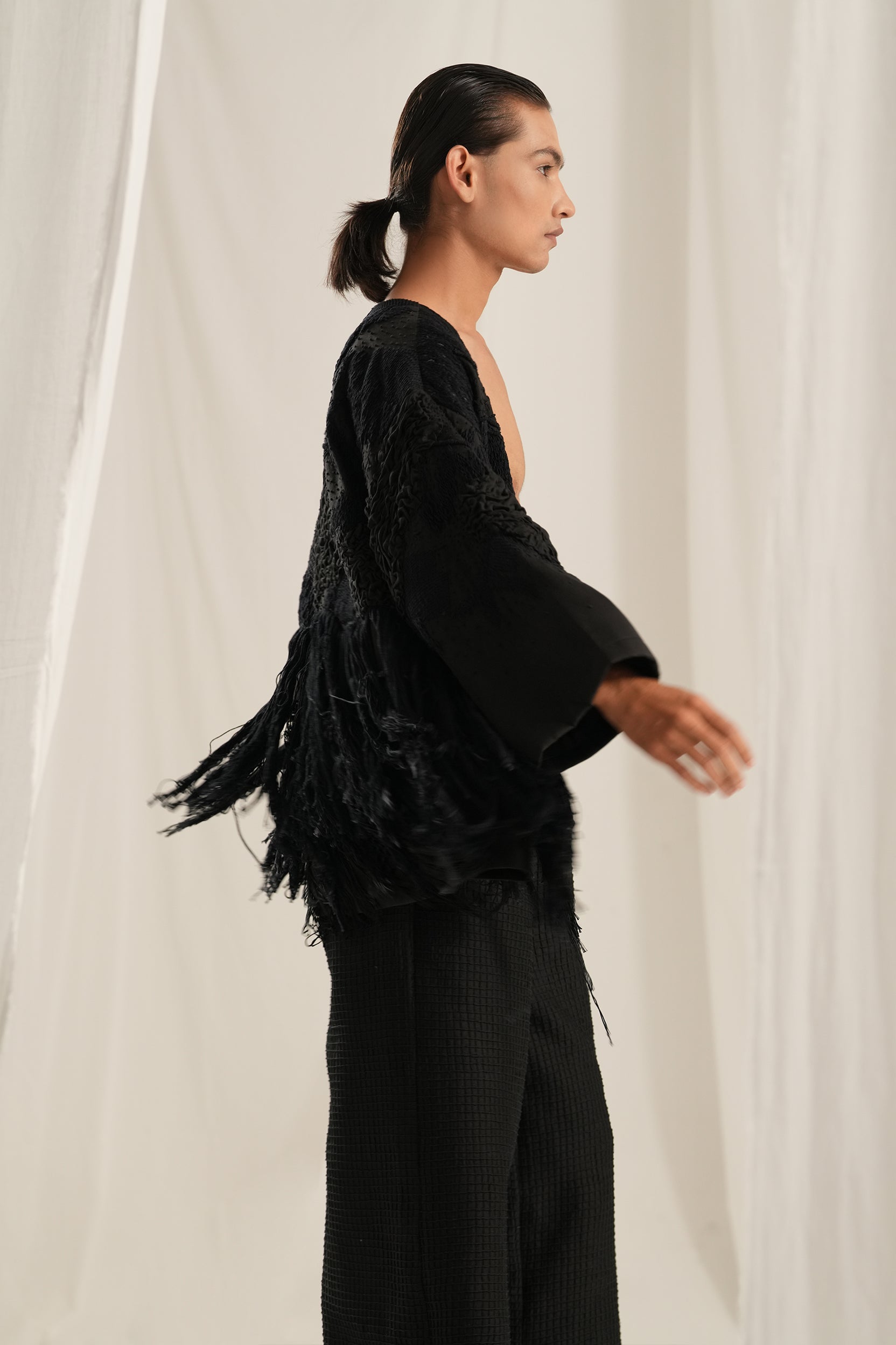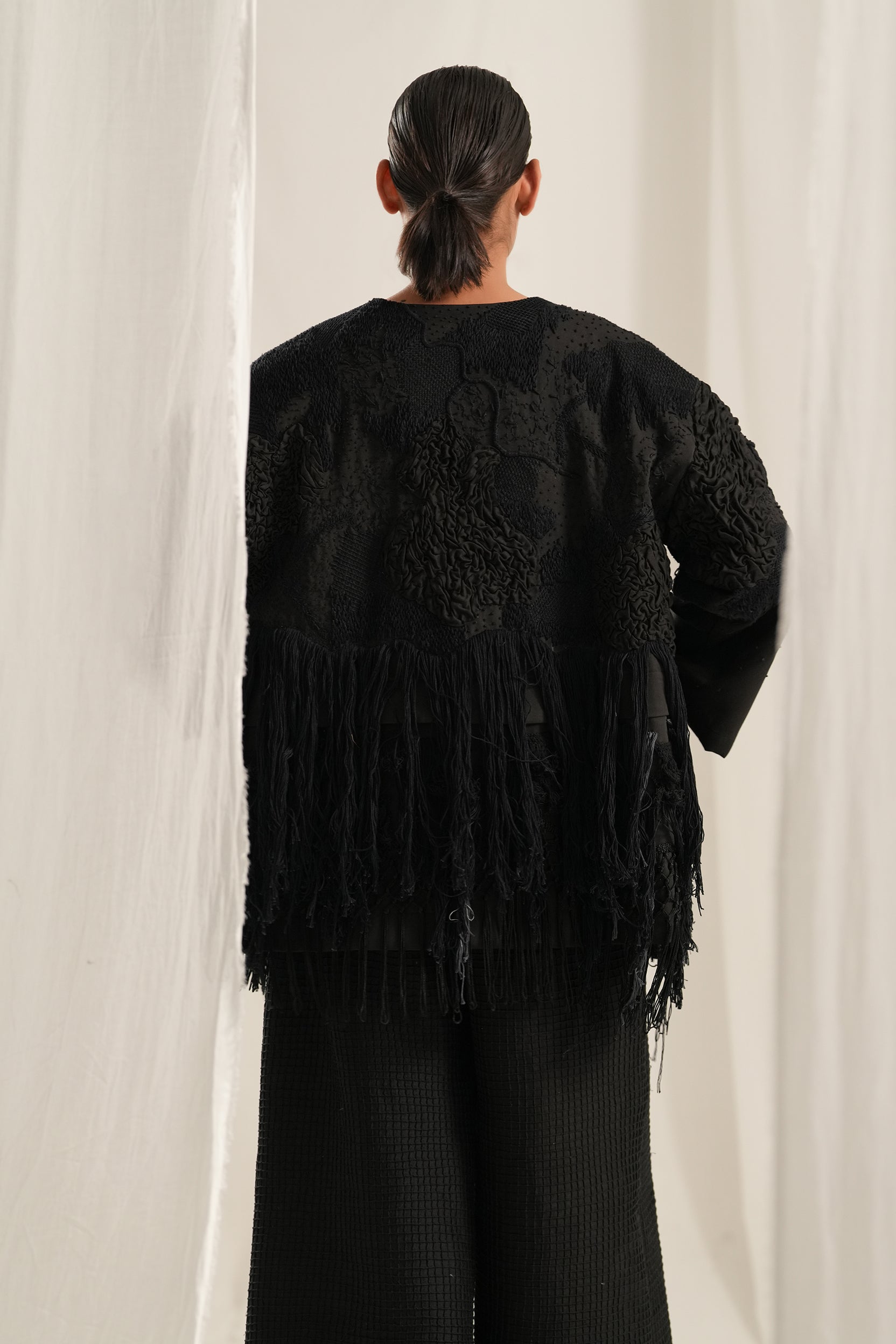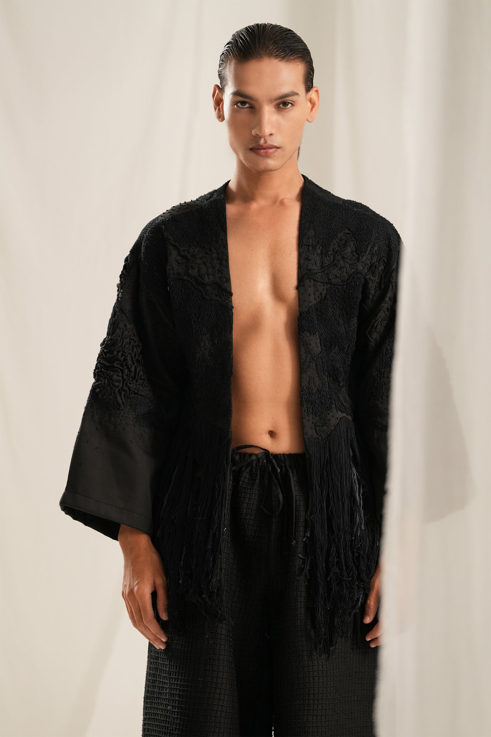 Hand embroidered and textured relaxed fit kimono jacket with fabric hangings at the edge.