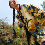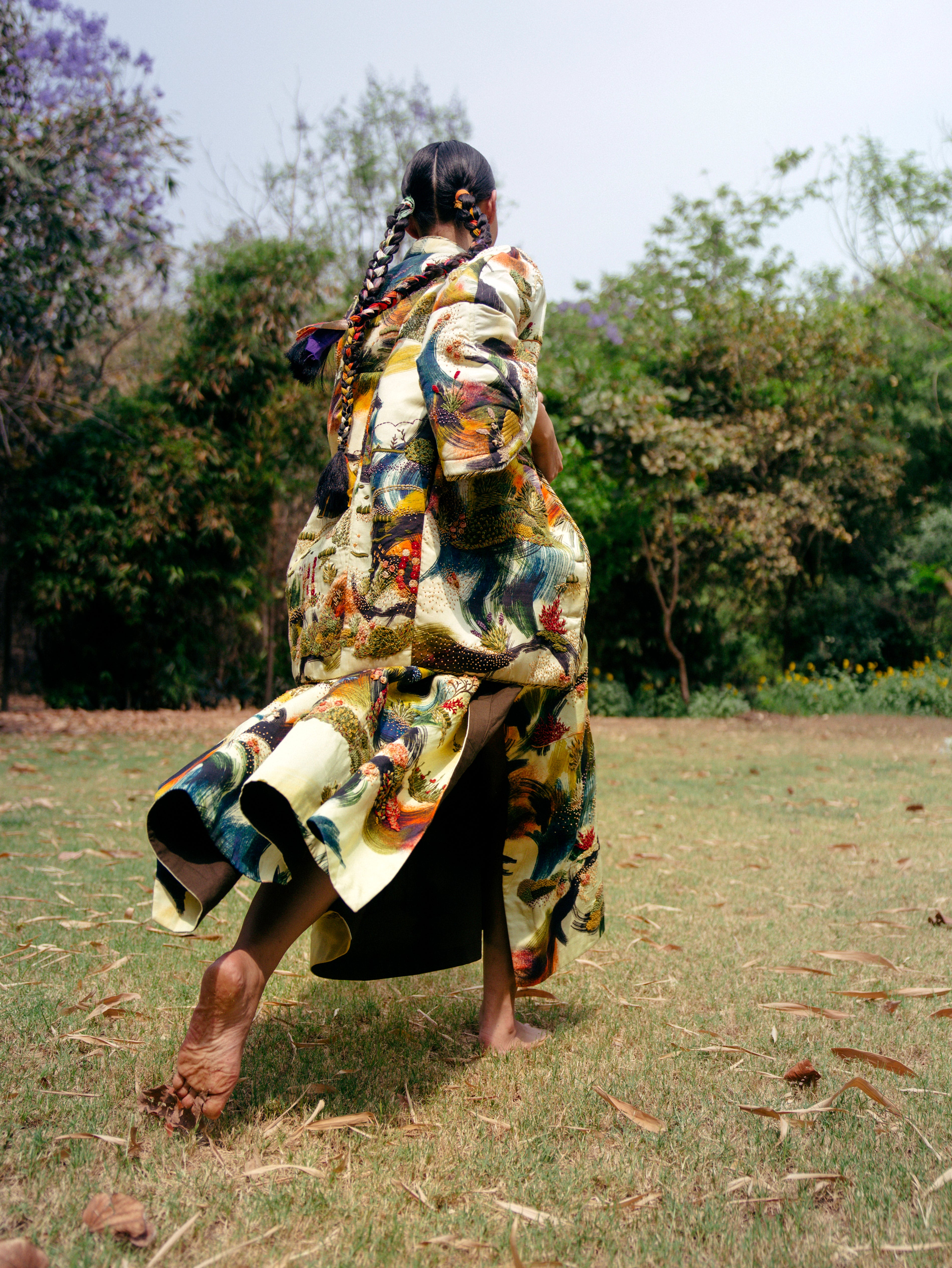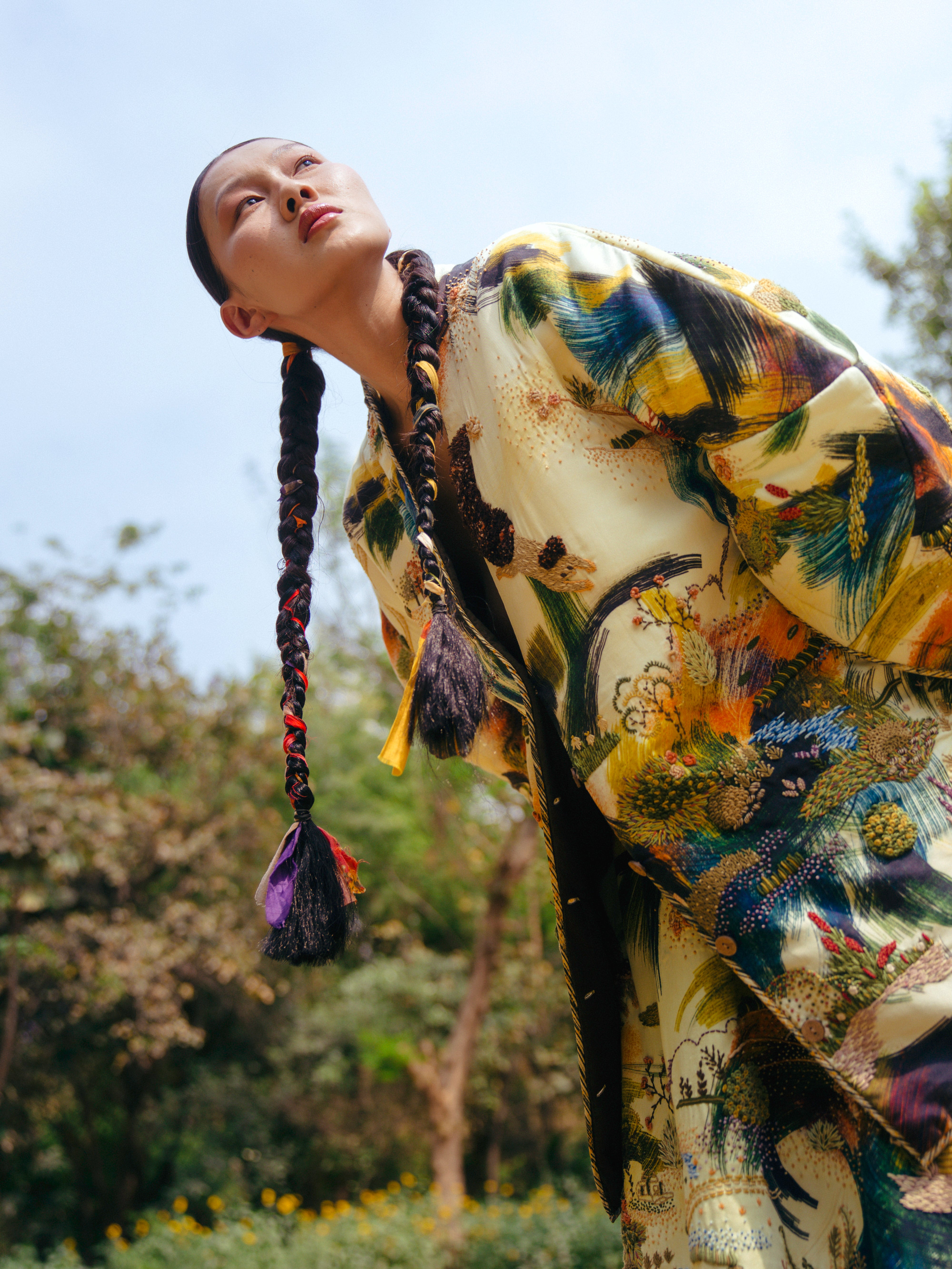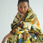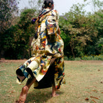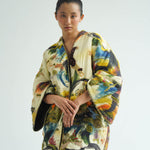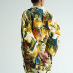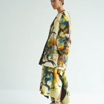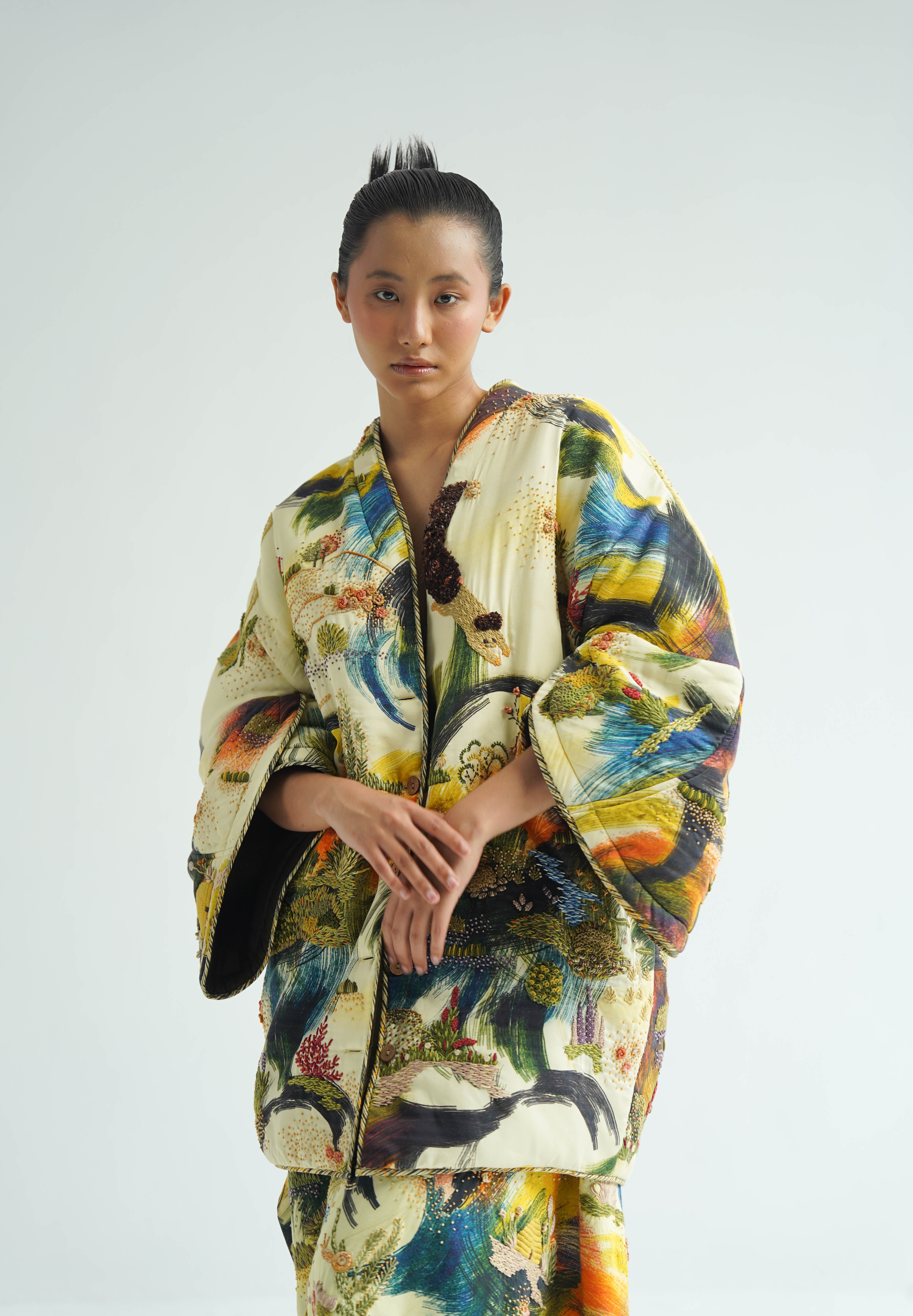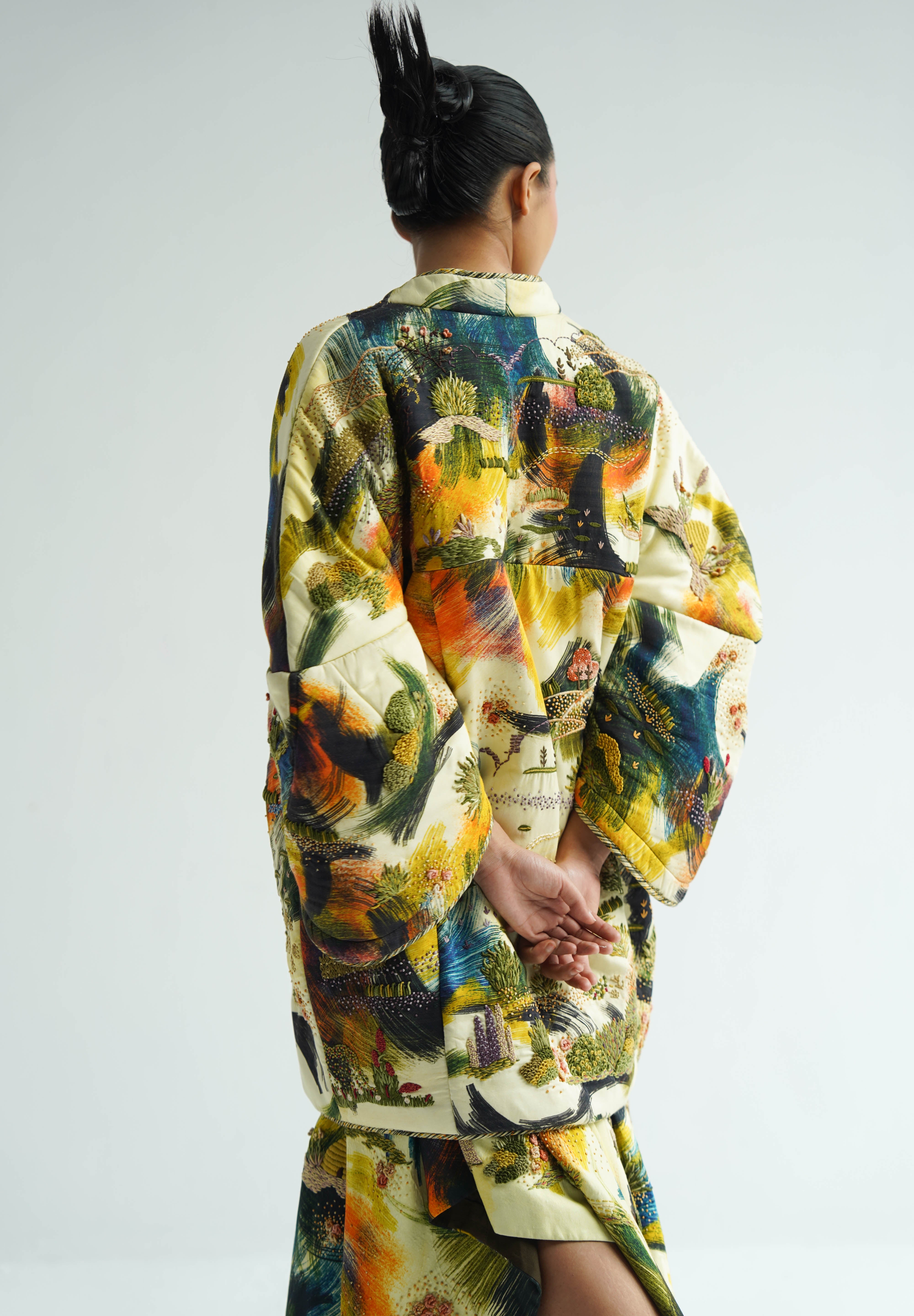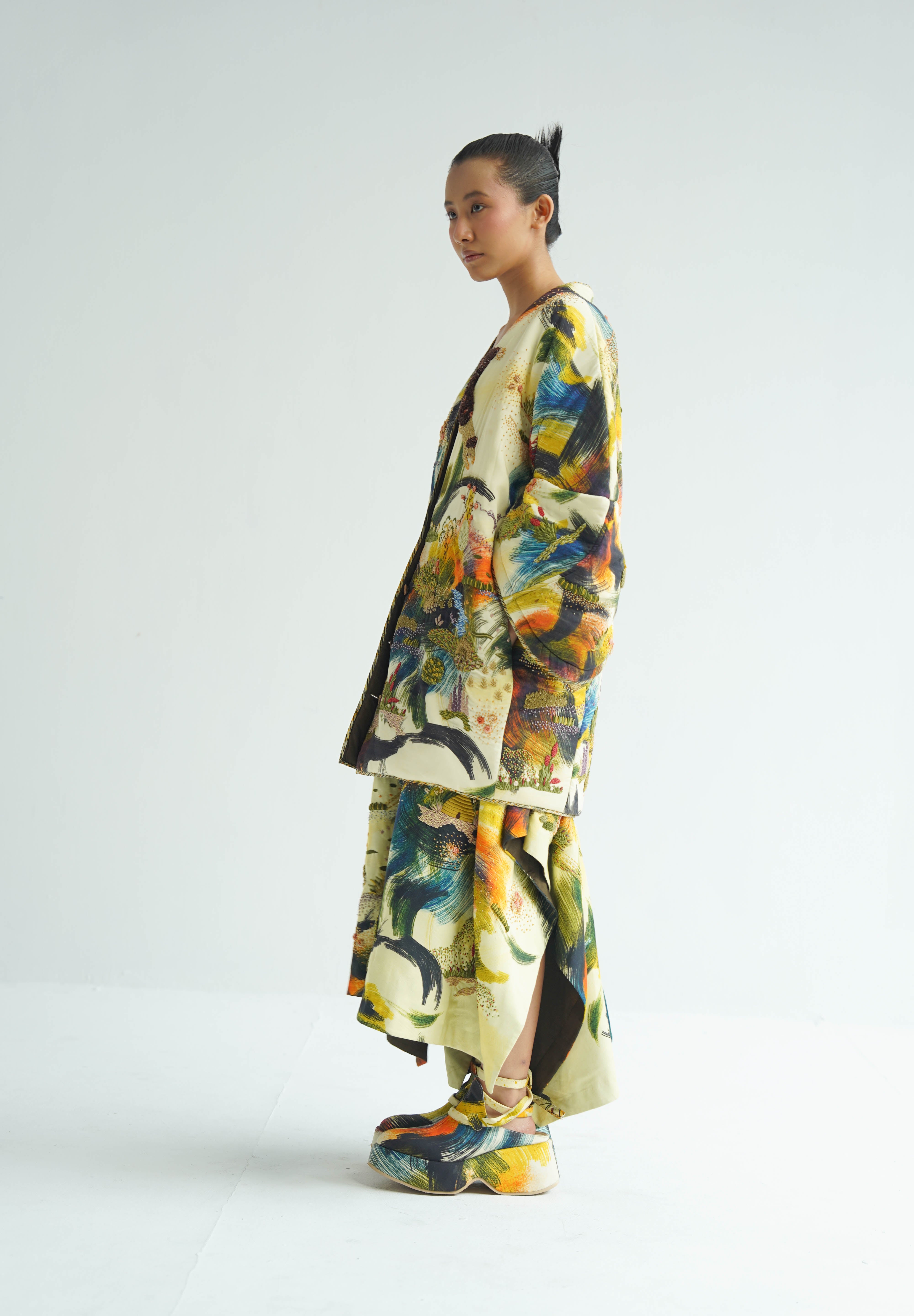 Introducing our oversized jacket dress, crafted from brush stroke printed fabric and fully embroidered for a luxurious touch. This statement piece features dramatic sleeves and convenient pockets on both sides. The design is completed with contrast piping details along the edges, adding a refined finish
