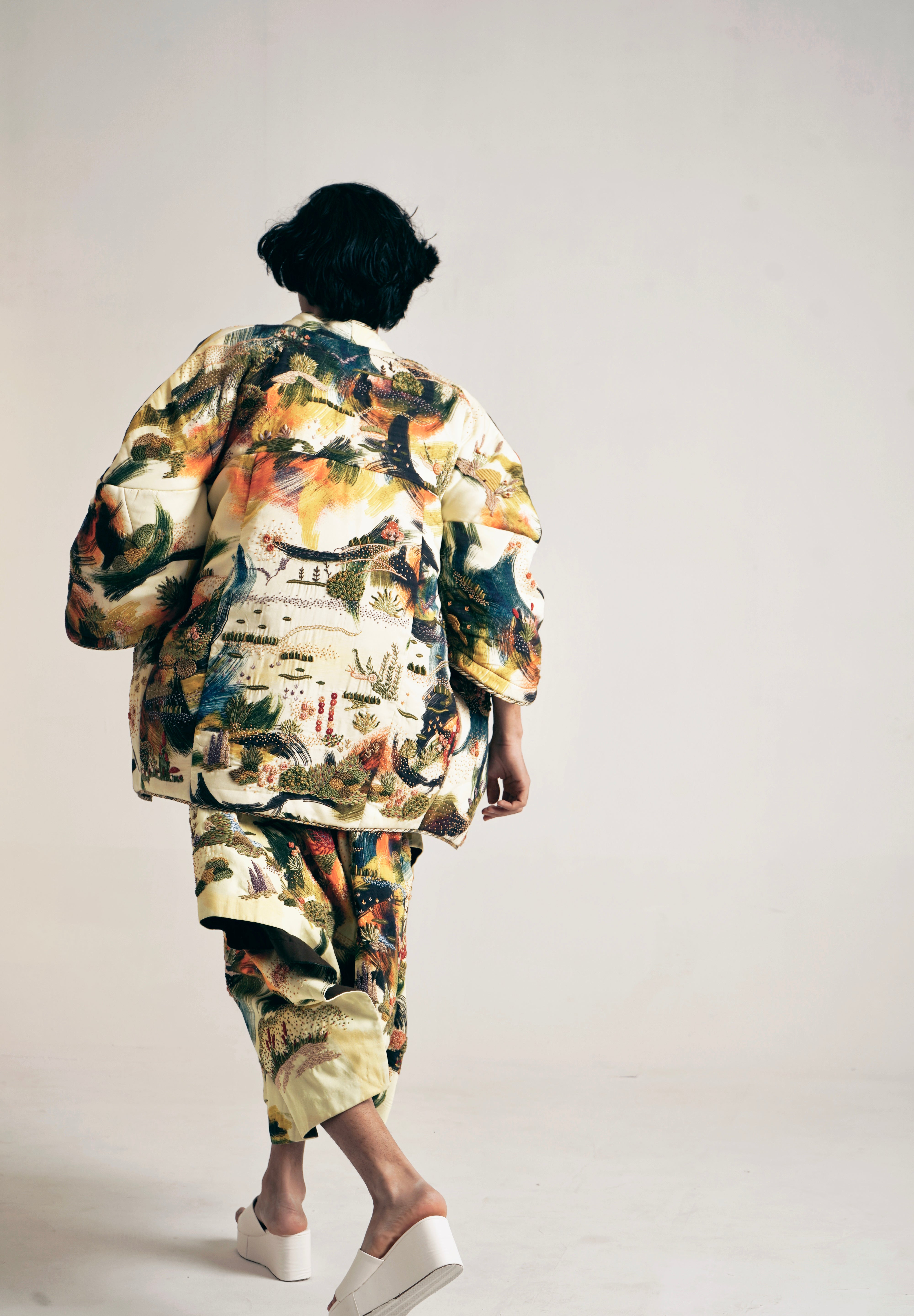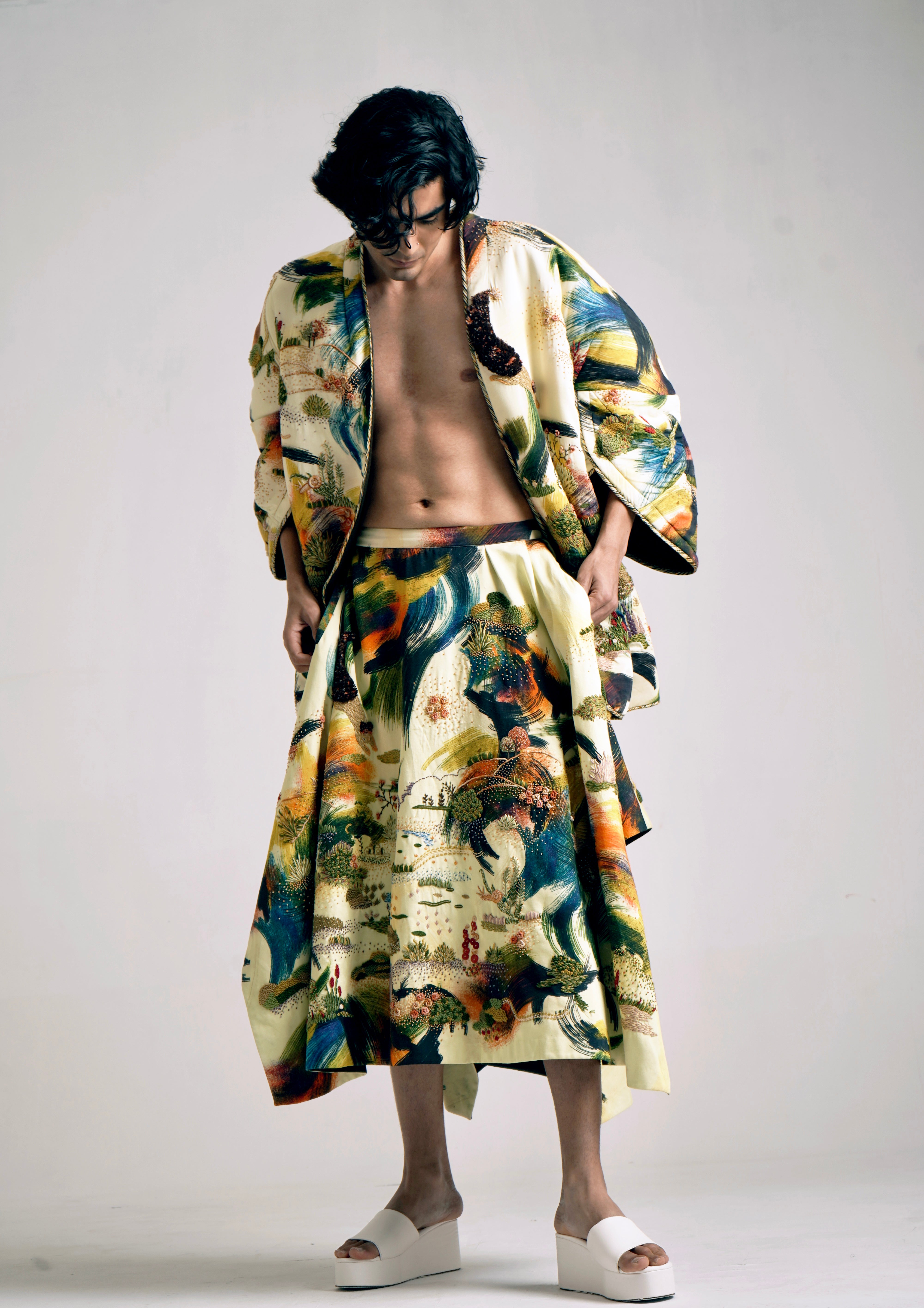 Crafted from brush stroke printed fabric, this fully embroidered oversized jacket features convenient pockets on both sides and bold statement sleeves. It is elegantly finished with contrast piping detail along the edges