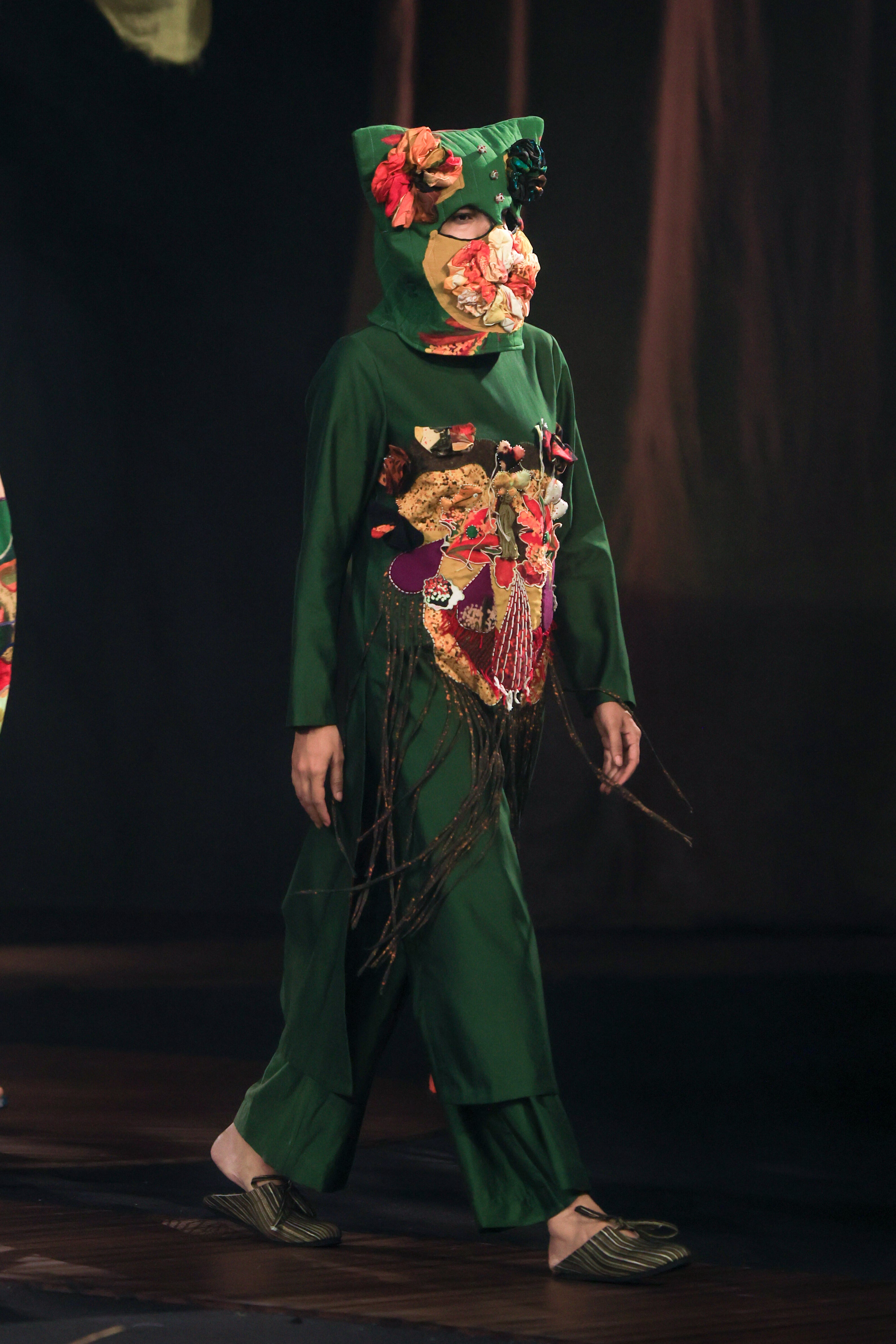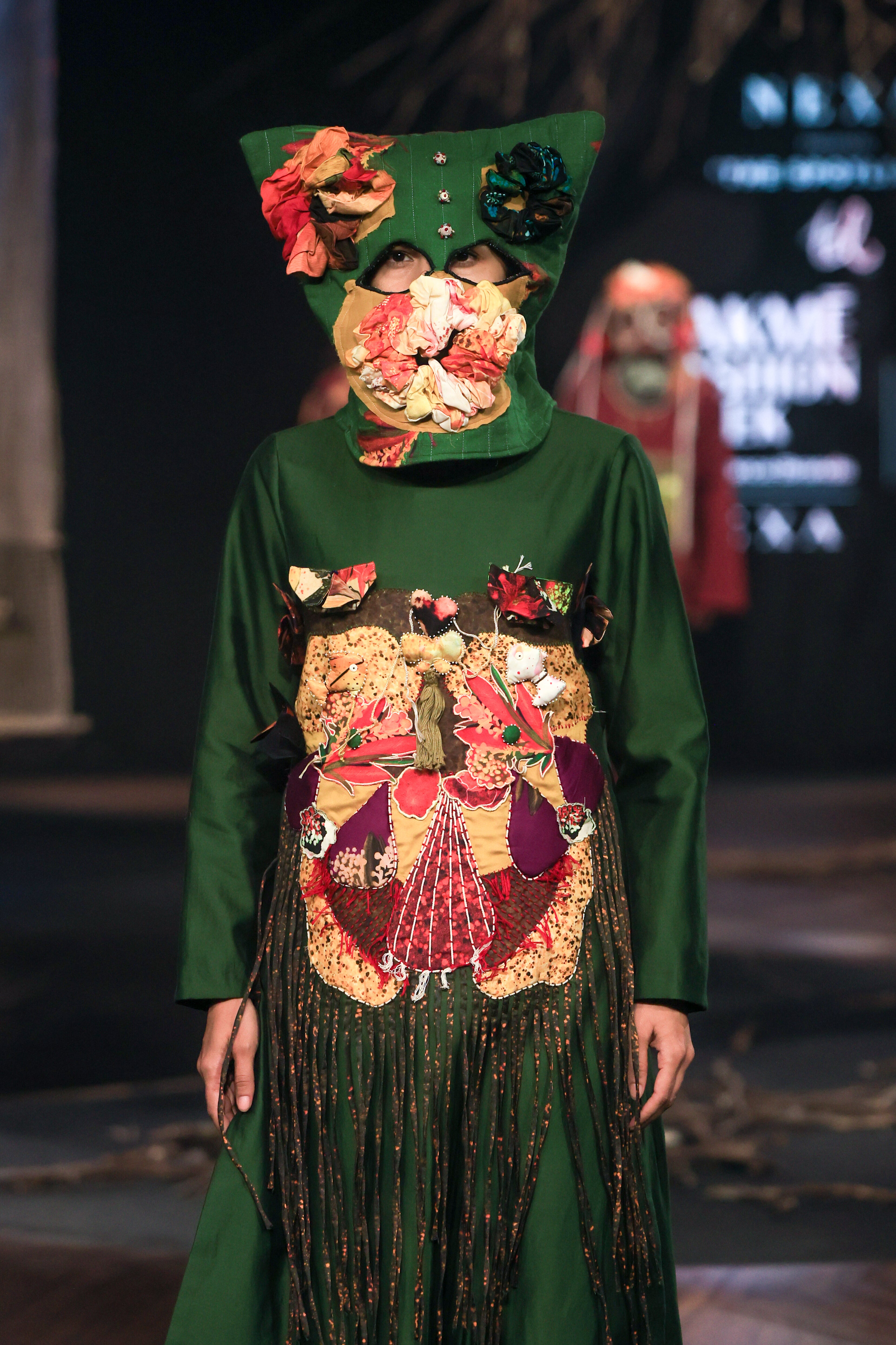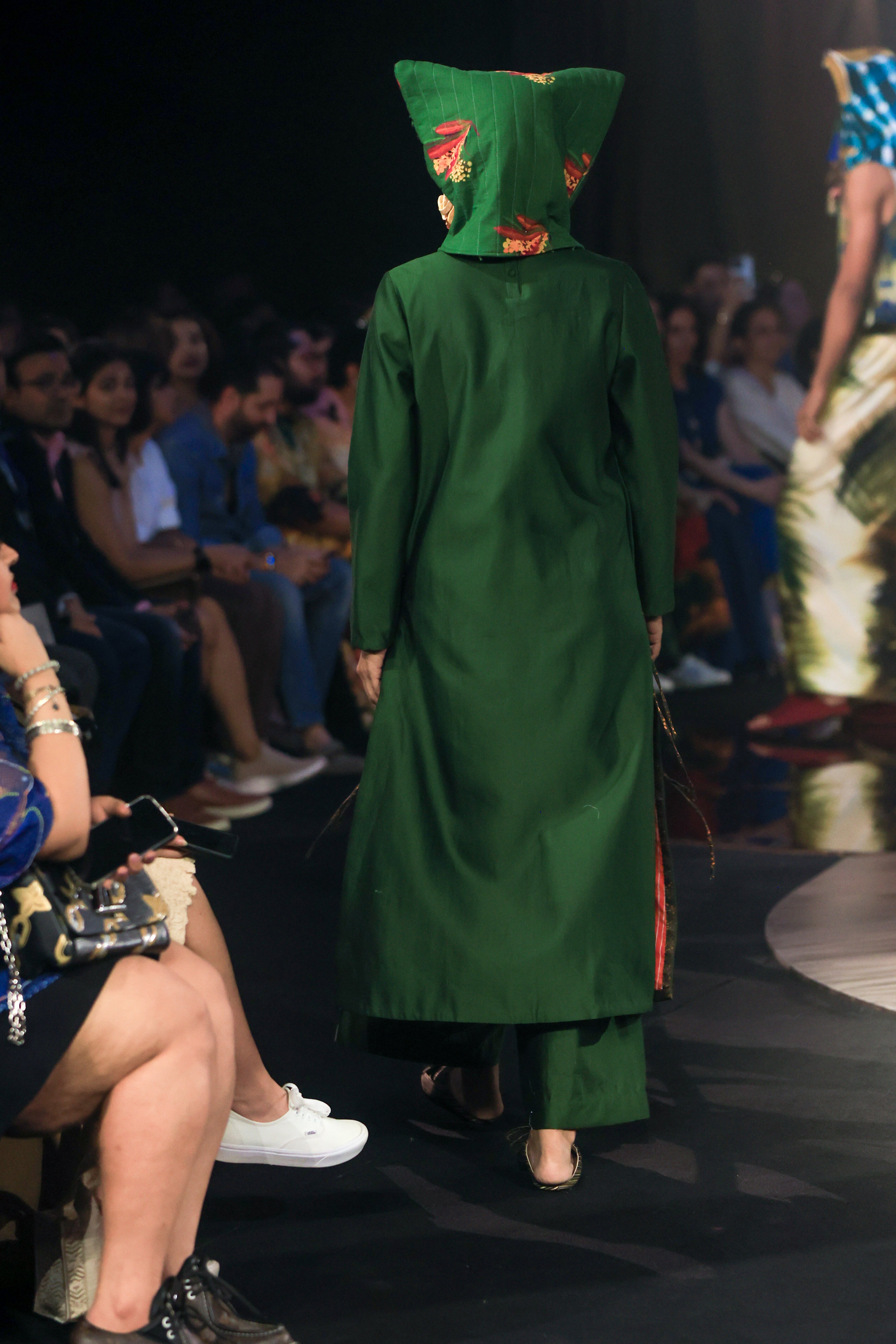 This Emerald echo kurta set made in chanderi featuring a patchwork in the centre creating a very captivating mask. It is paired with relaxed straight trousers