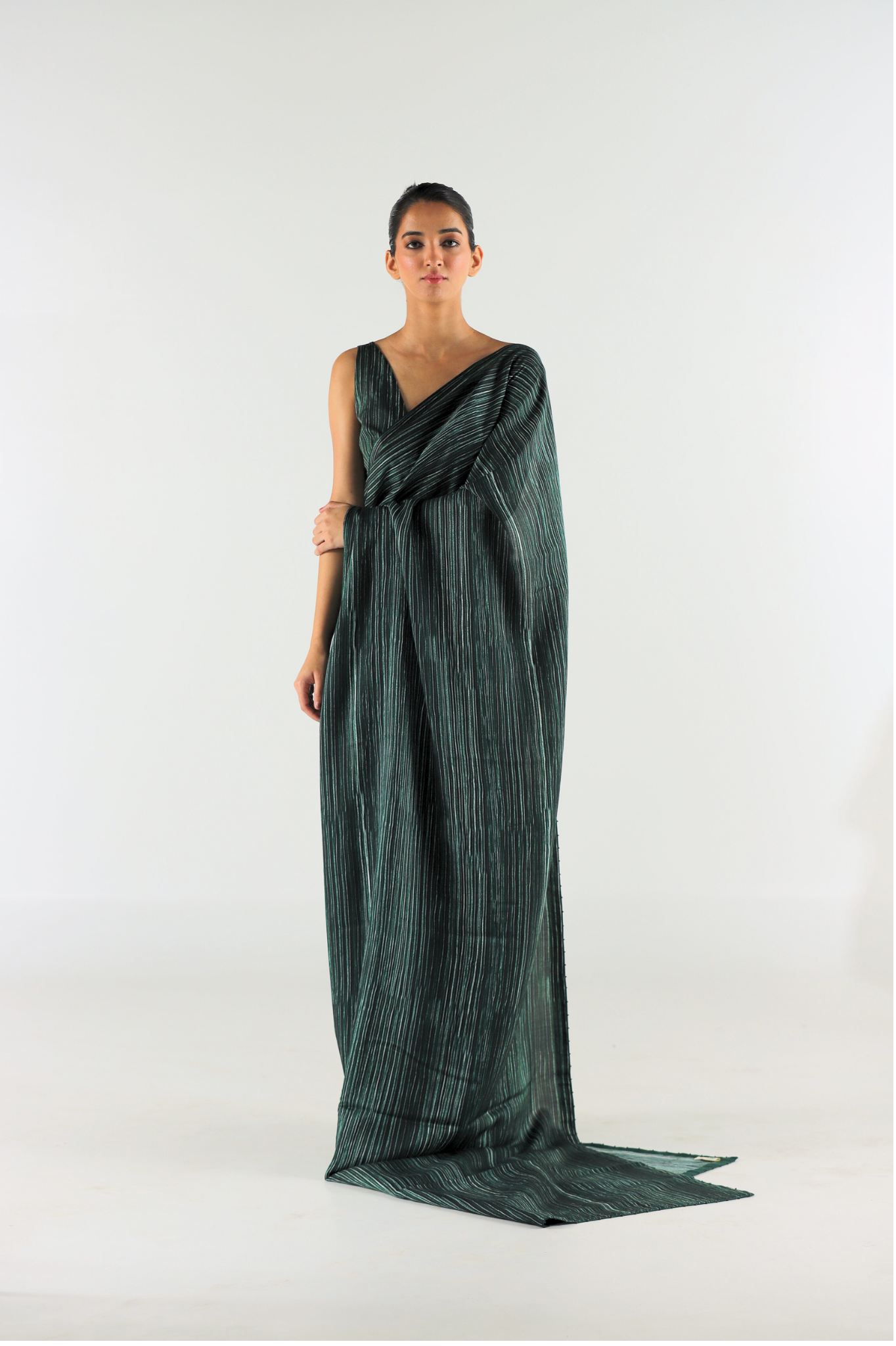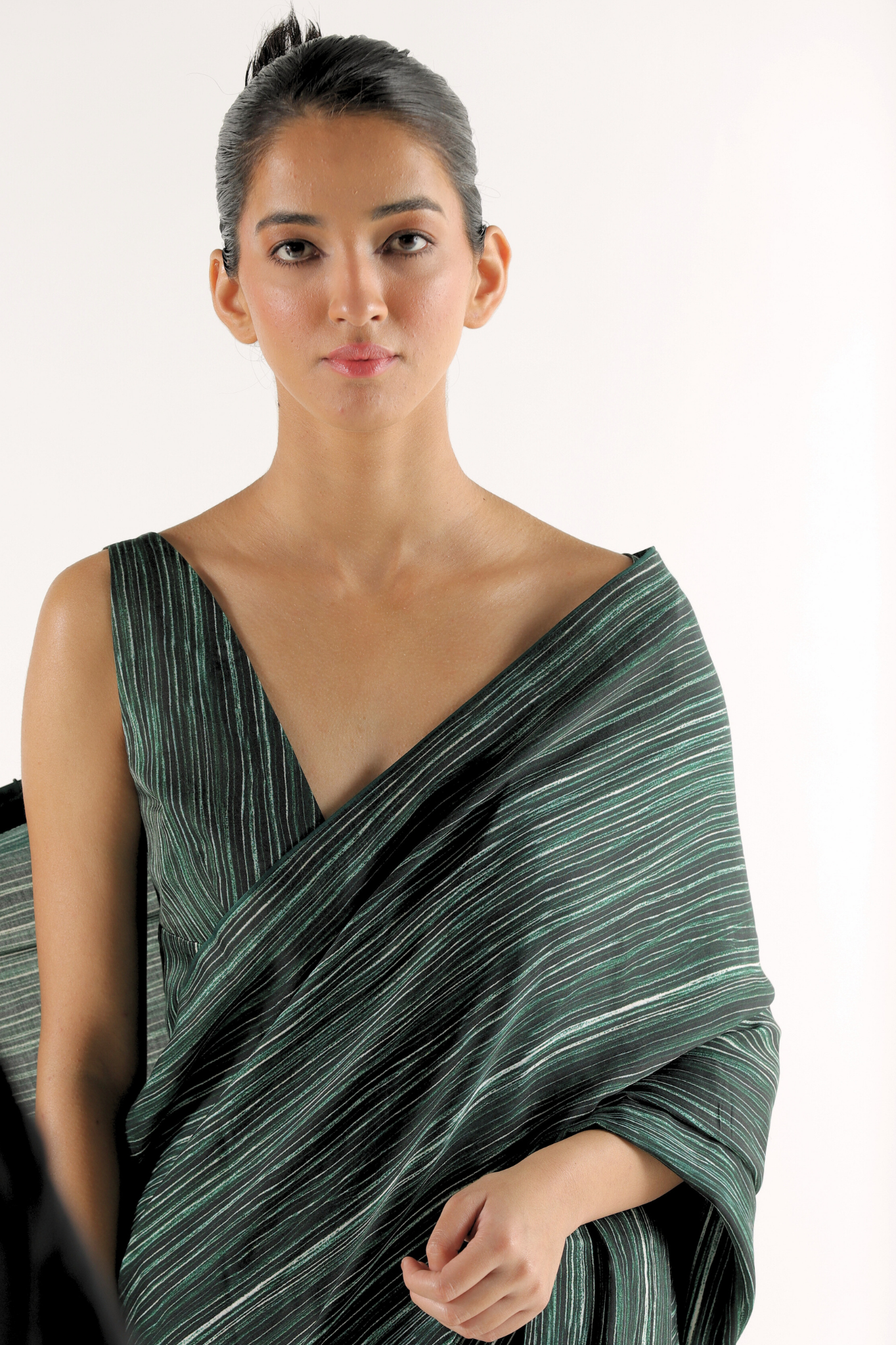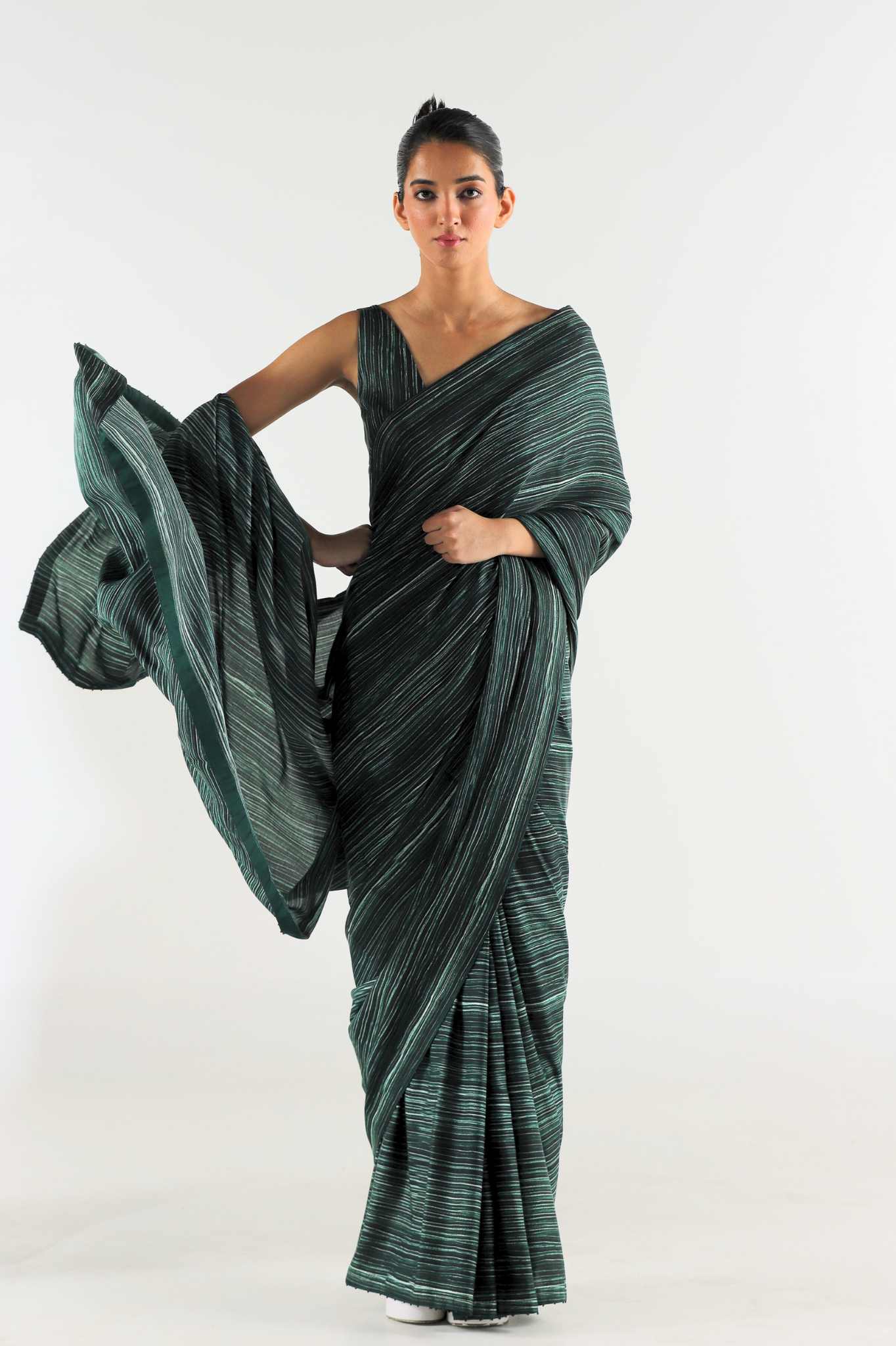 Our Emerald green stripe Saree, crafted from pure cotton silk satin. This elegant saree beautifully captures the essence of hand-painted artistry through its digitally printed stripes in captivating shades of green. Accompanied by a matching digitally printed lined blouse, the ensemble is meticulously finished with delicate beads along the edges, adding a touch of sophistication to your style.