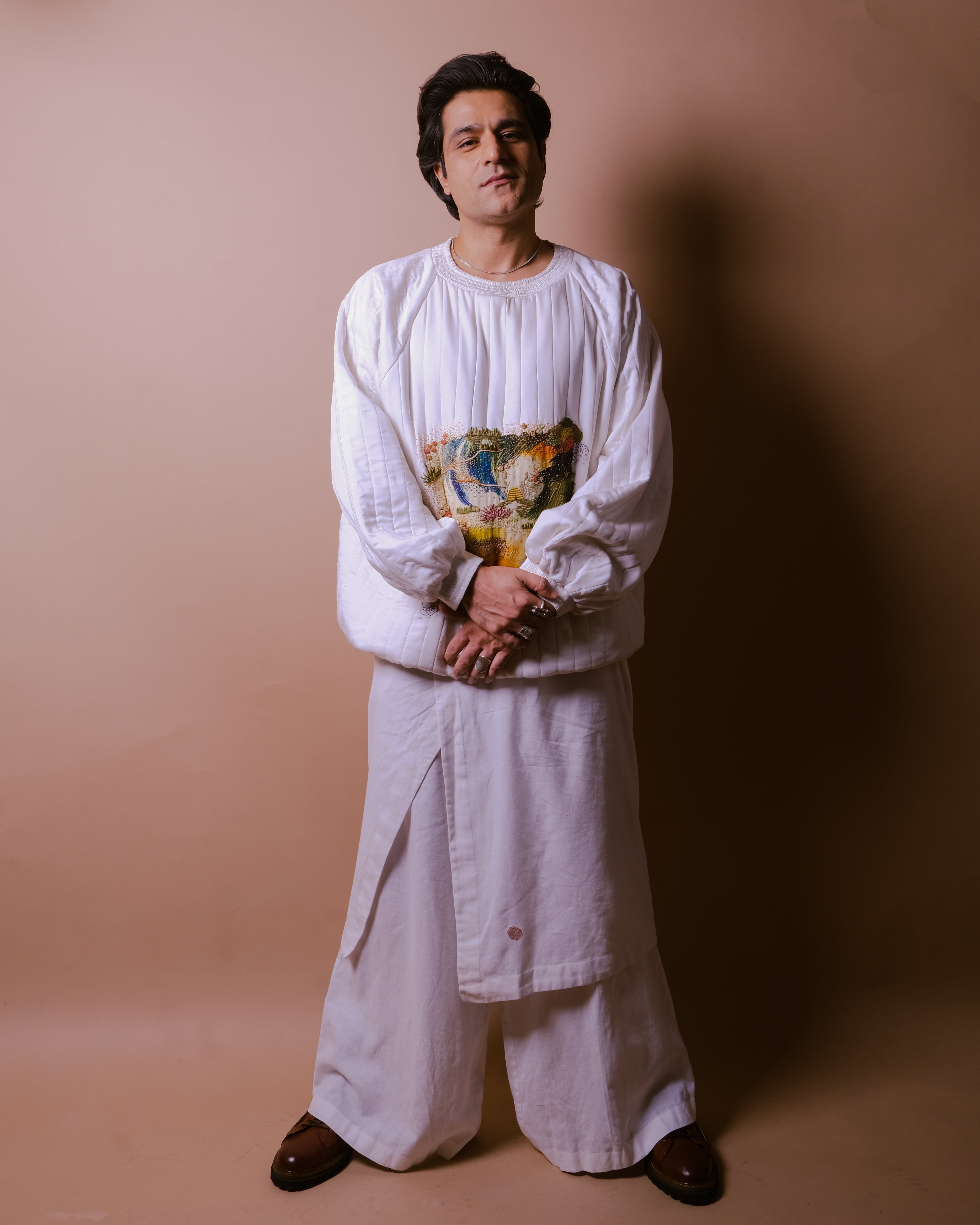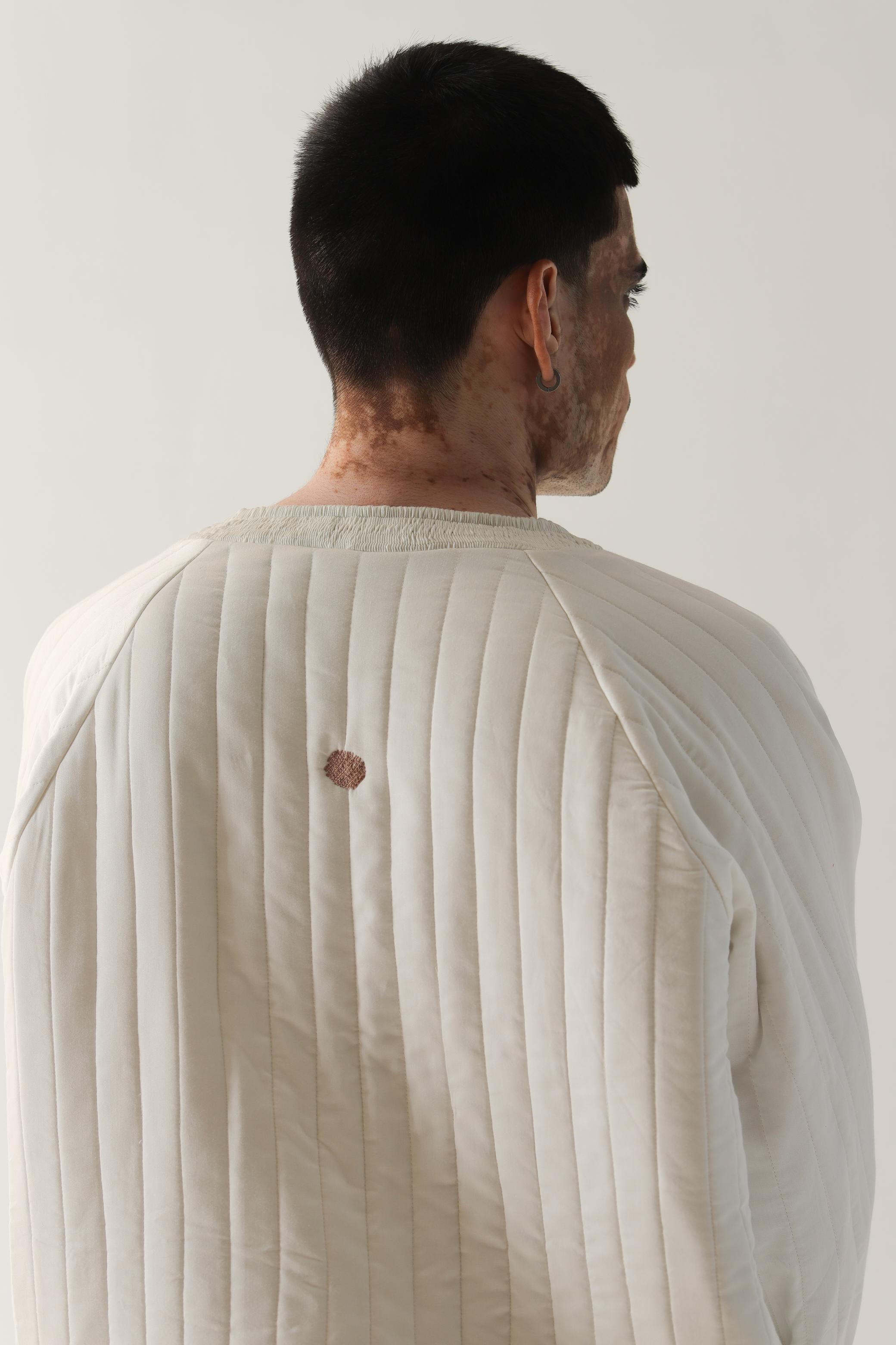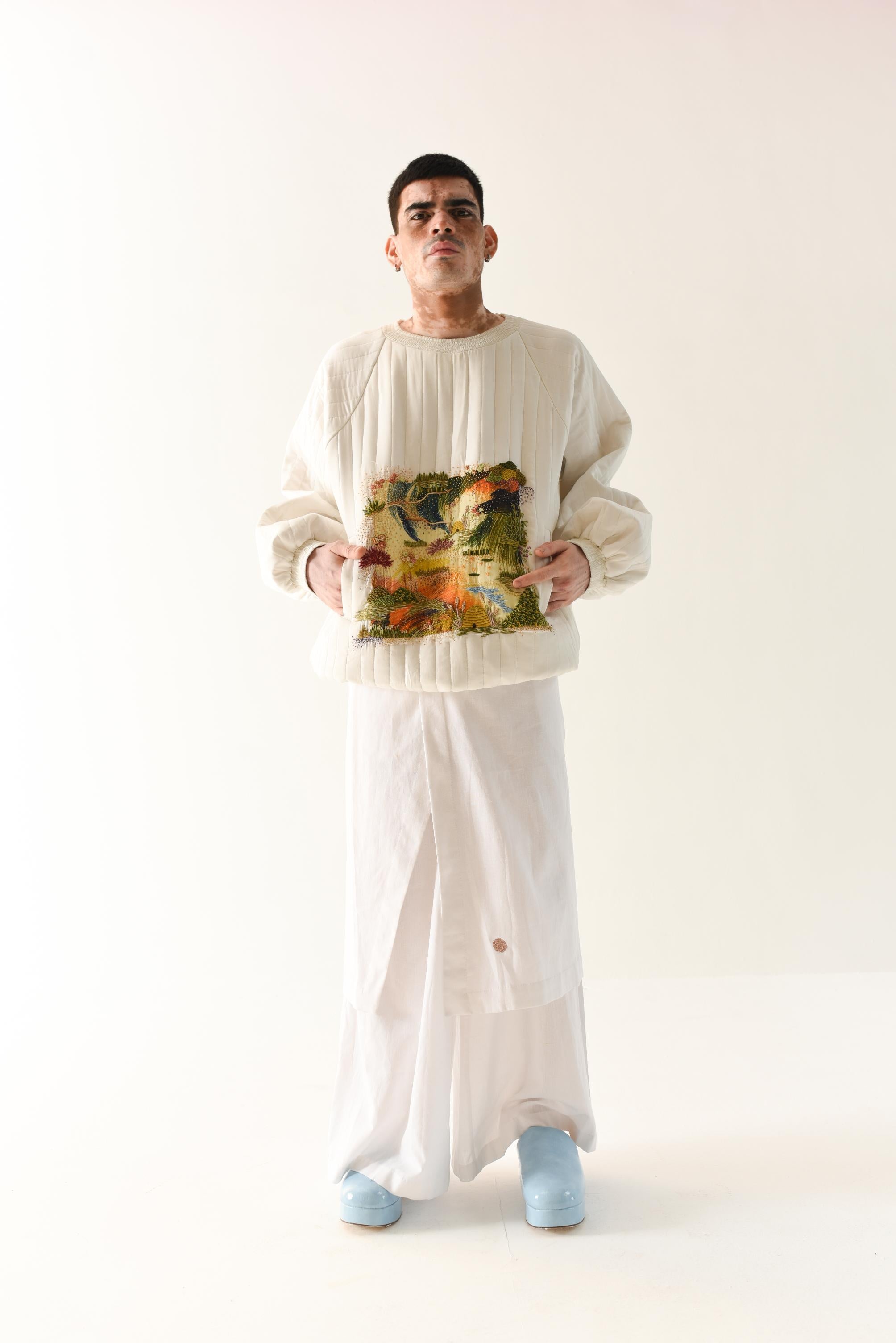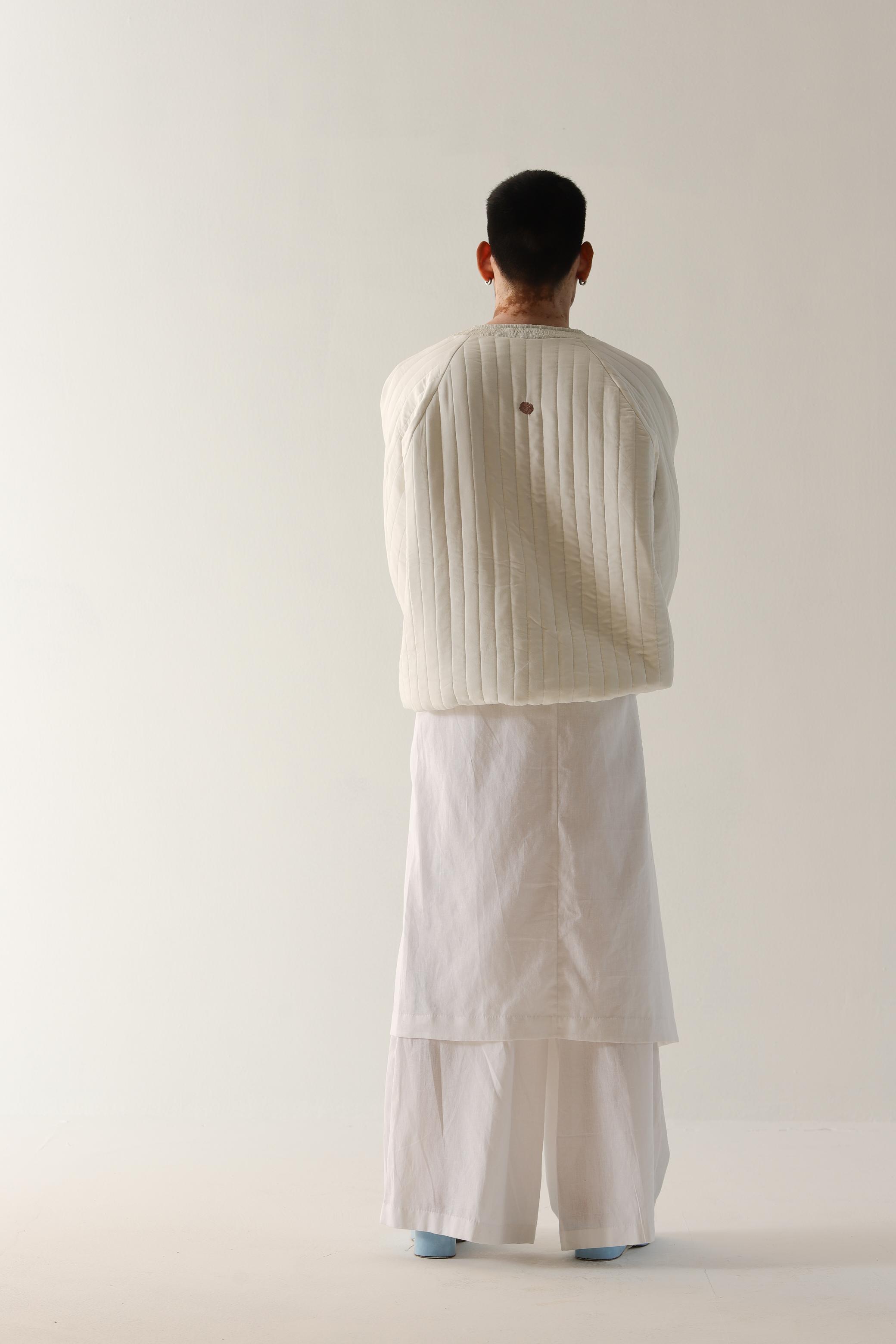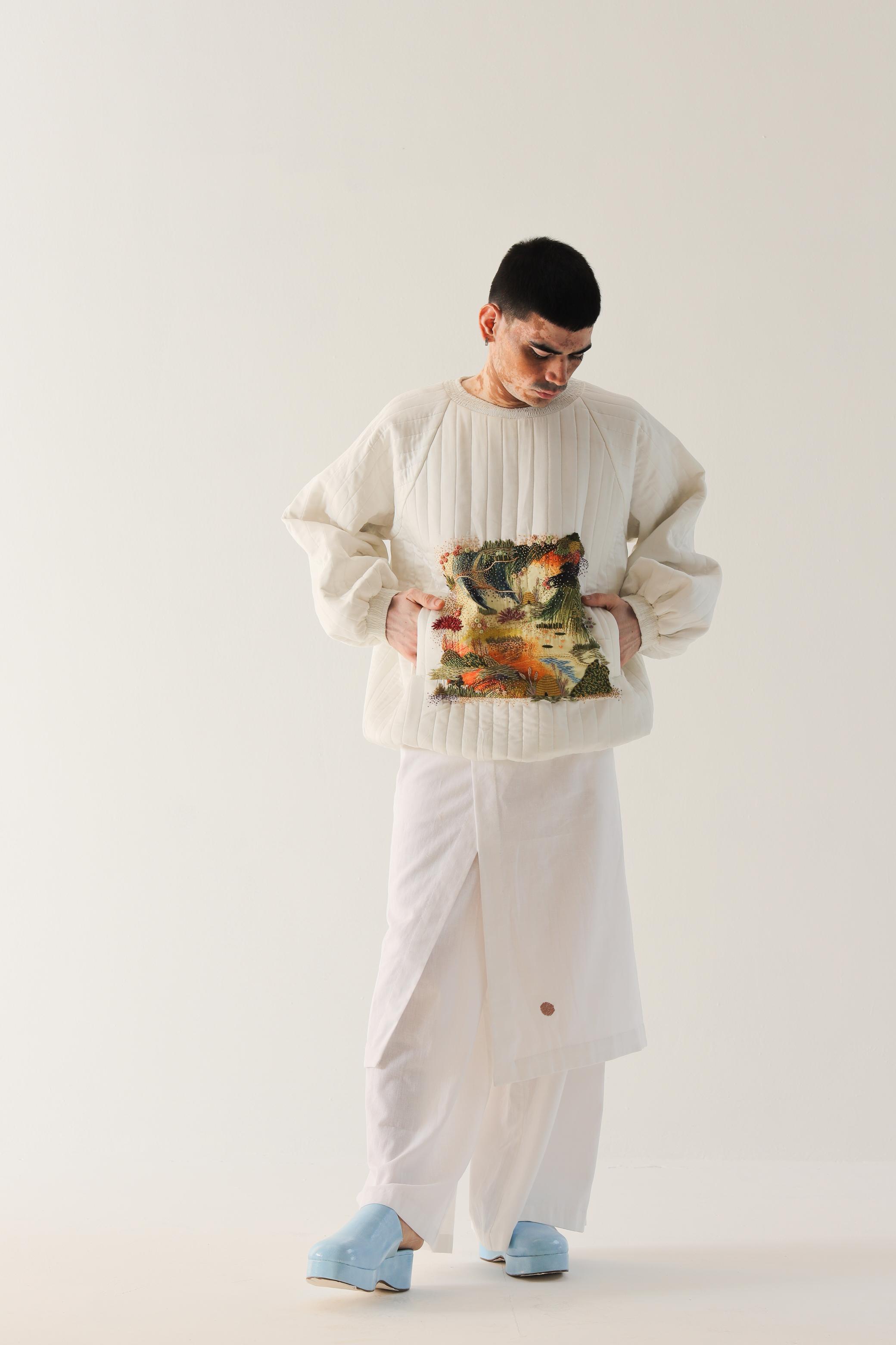 The epitome of warmth and elegance with our Ivory White Embroidered Cardie. Crafted in luxuriously soft cotton modal and quilted allover, this cardigan is not just a layer; it's a cocoon of comfort. The oversized silhouette adds an extra layer of coziness, making it your go-to piece for chilly days.The centerpiece of this cardie is a hand-embroidered patch at the center, a masterpiece adorned with intricate French knots, bullion flowers, and captivating textures. Each stitch tells a story of craftsmanship, adding a touch of artistry to your ensemble.