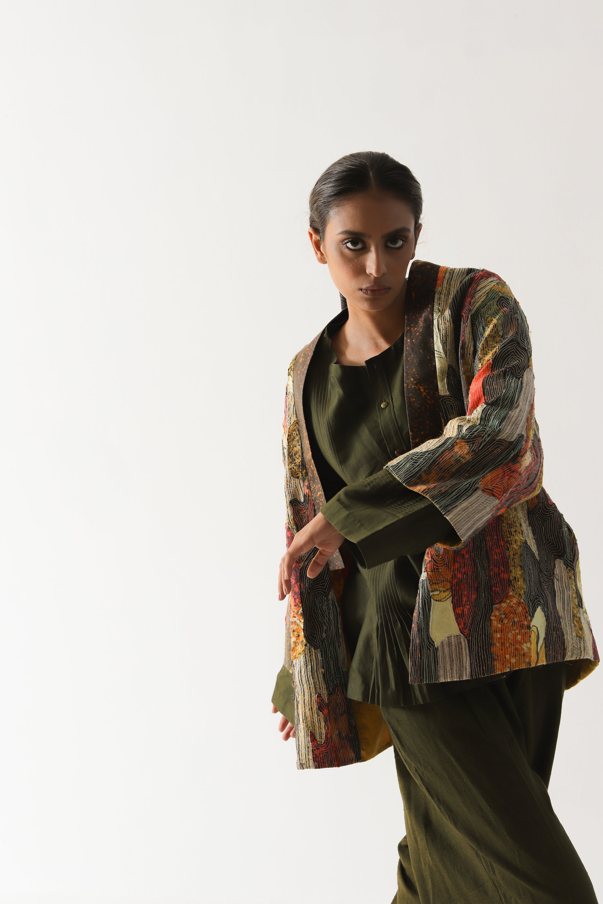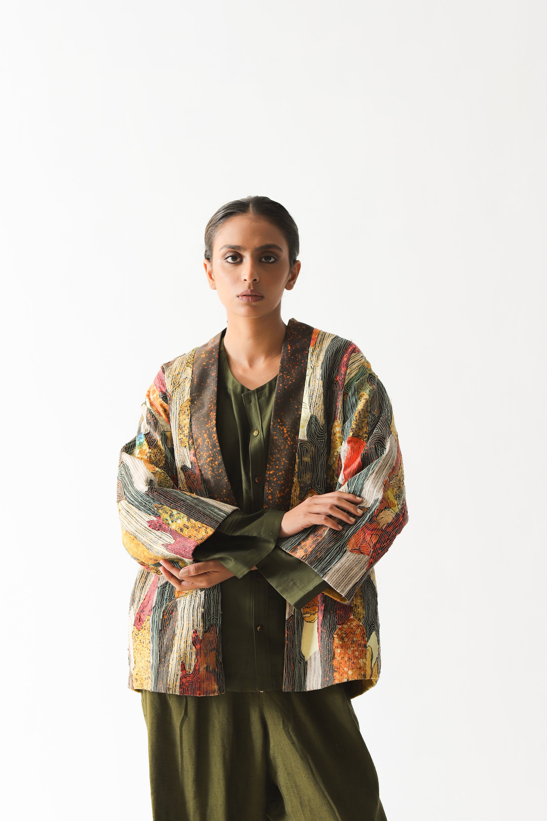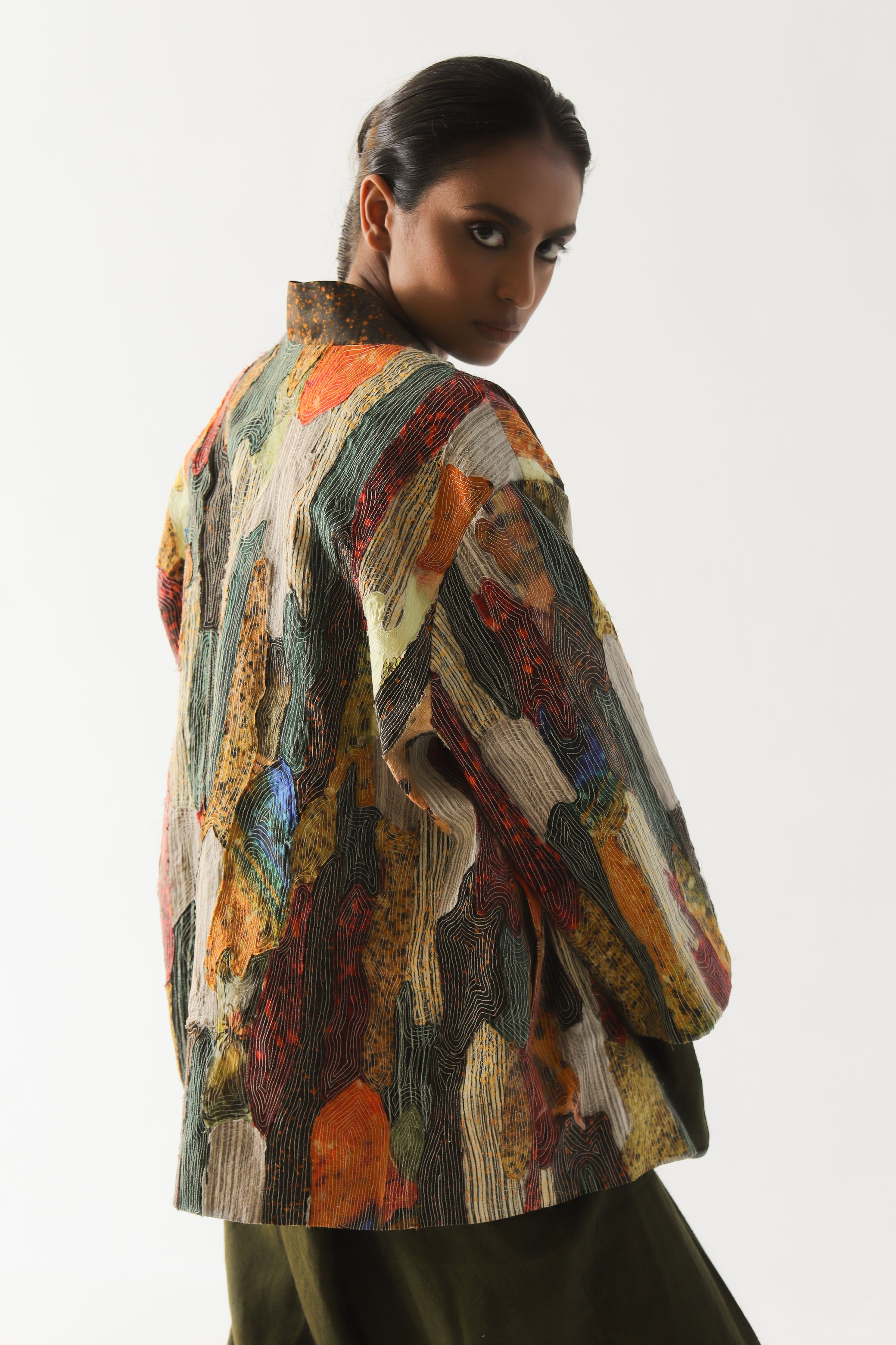 This patchwork oversized jacket is made with the leftover fabric peices joined in an abstract shape creating a texture. it is finished with contrast detail on the collar.