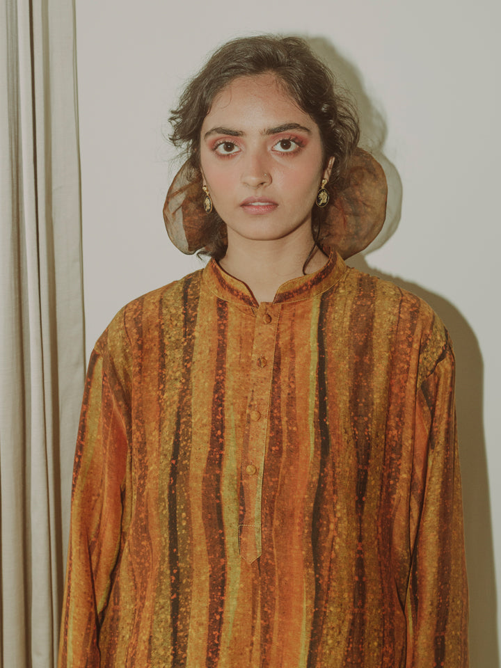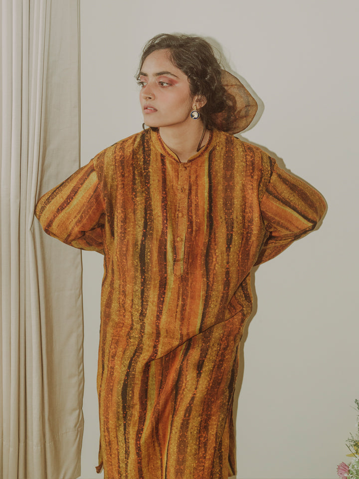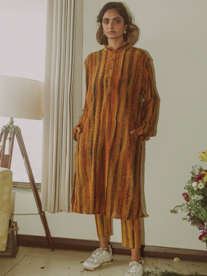 Feral stripe boyfriend kurta pant set made in pure cotton silk coveys the impression of hand painted, digitally printed feral stripes with pockets on either side, giving it a very easy comfortable and at the same time androgynous mood.
