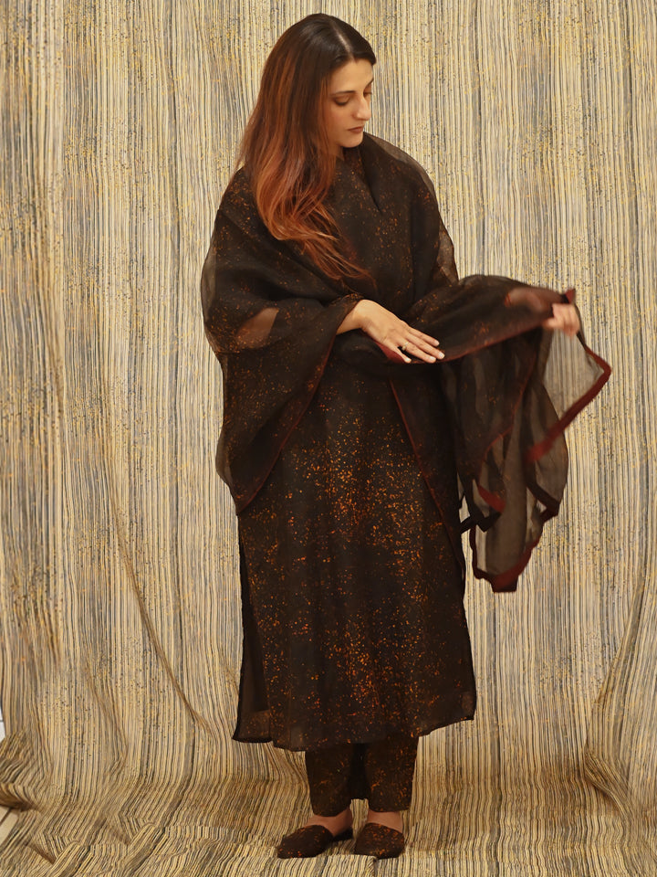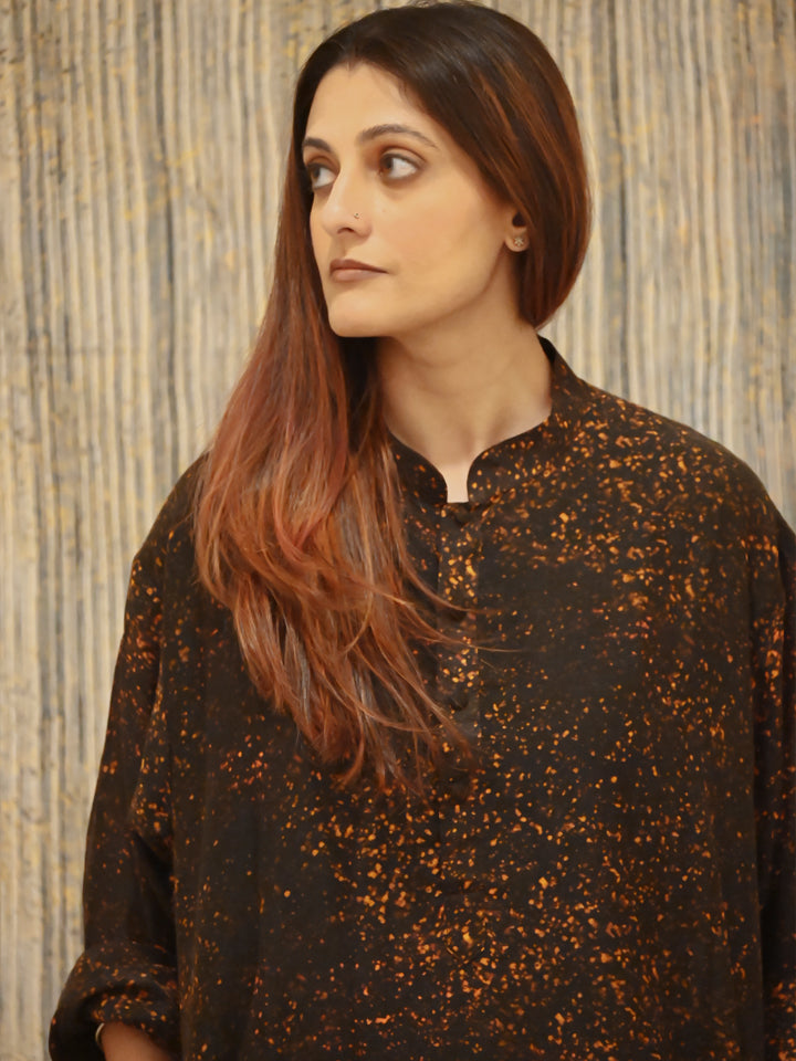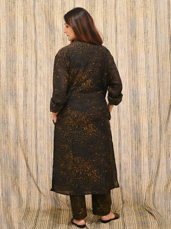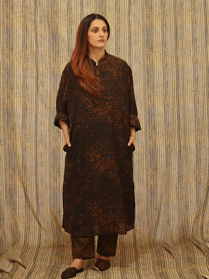 Freckle boyfriend kurta pant set made in pure cotton silk coveys the impression of hand painted, digitally printed freckles with pockets on either side, giving it a very easy comfortable and at the same time androgynous mood.