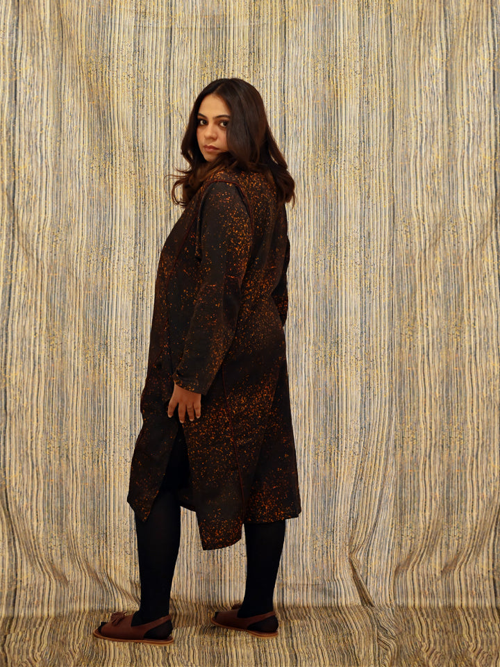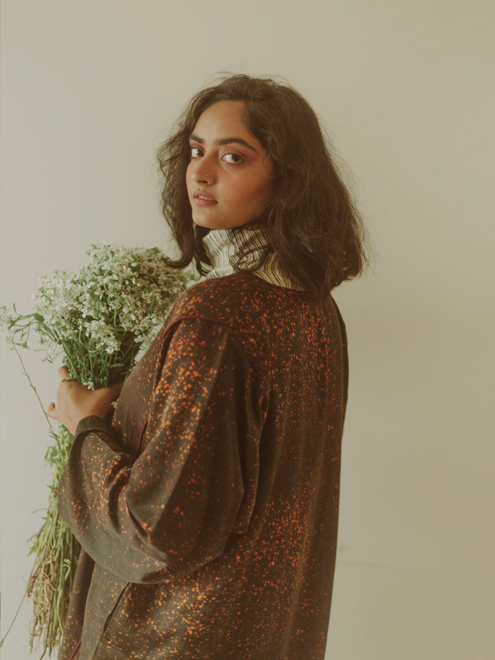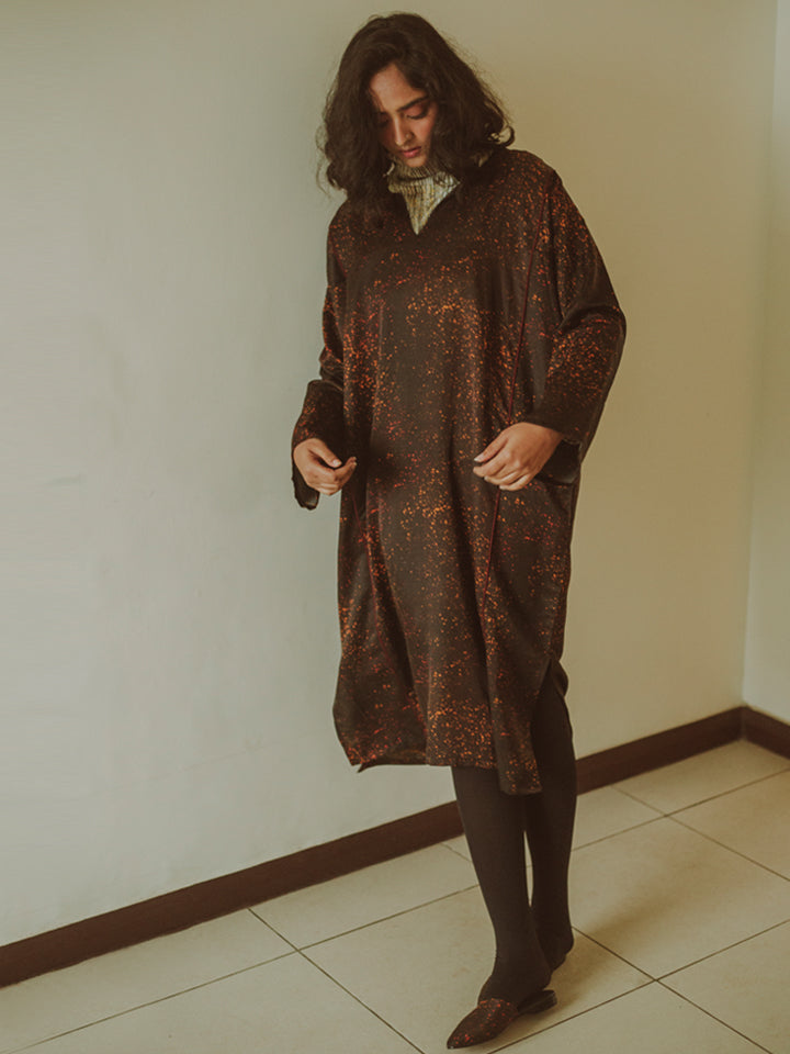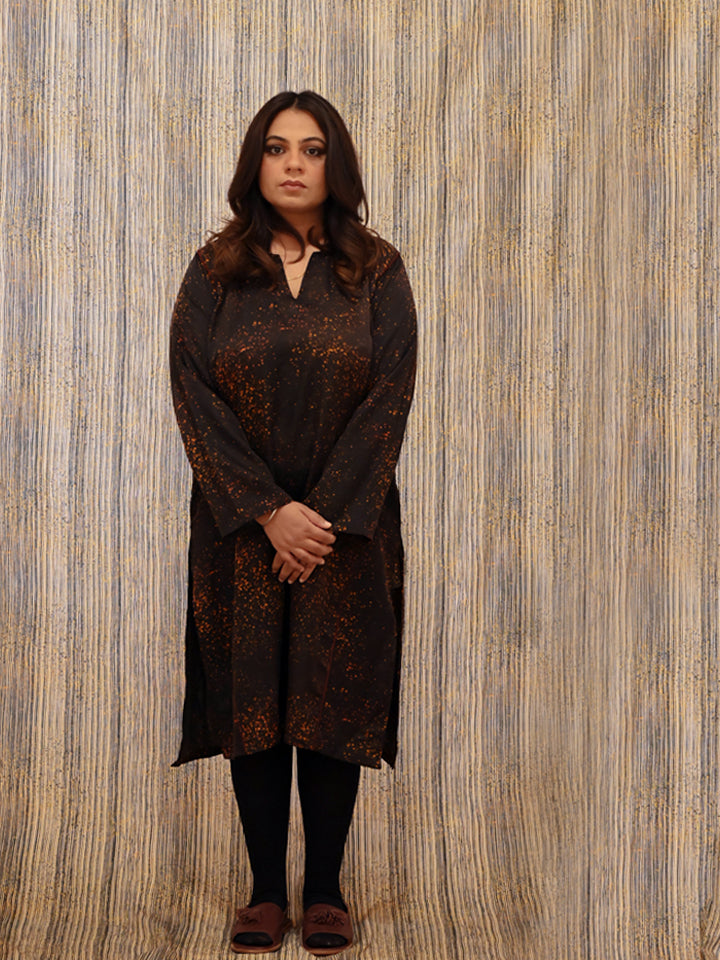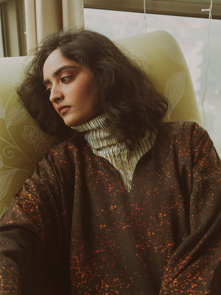 Freckle Pheran kurta, loose and easy fit made in pure cotton silk satin conveys the impression of hand painted, digitally freckles .It is piped throughout the kurta as a meticulous detail.