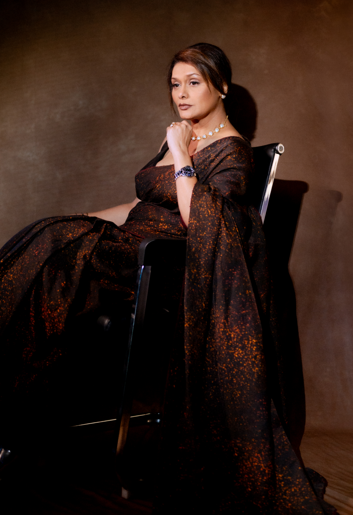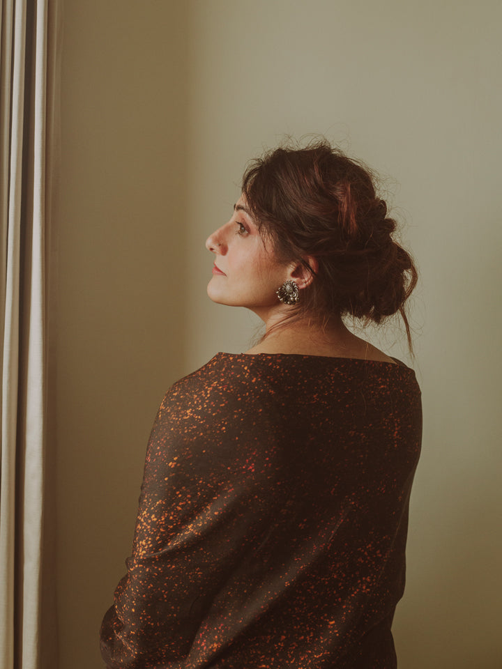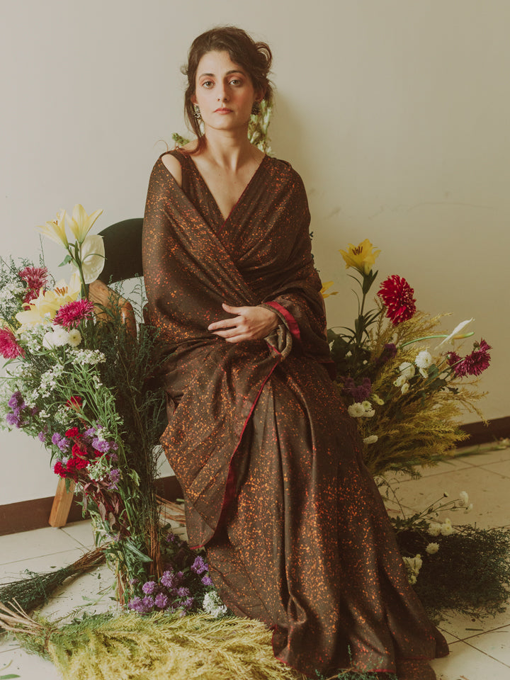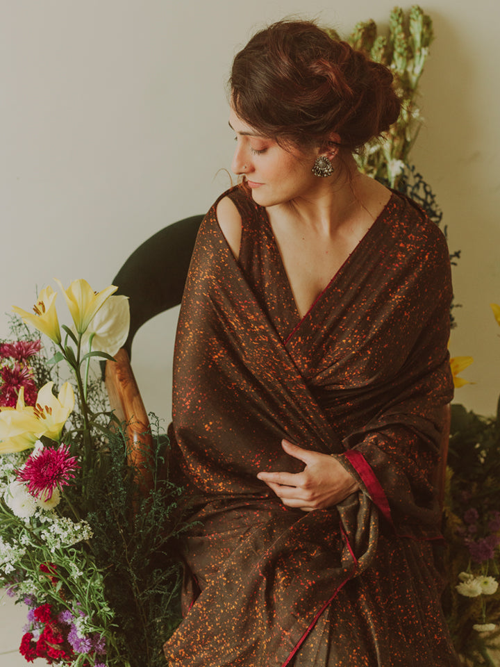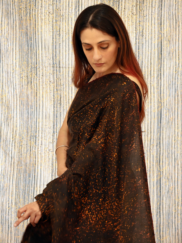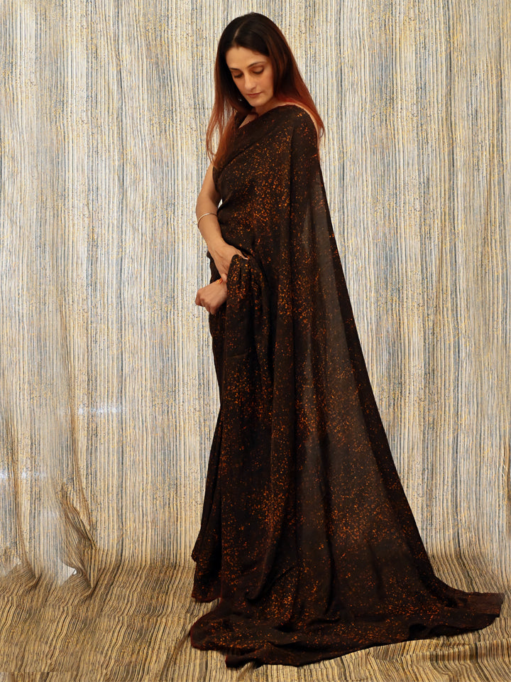 Freckle saree, made in pure cotton silk satin conveys the impression of hand painted, digitally printed freckles. Comes with a digitally printed blouse. The saree is finished with beads on the edge of the same.