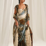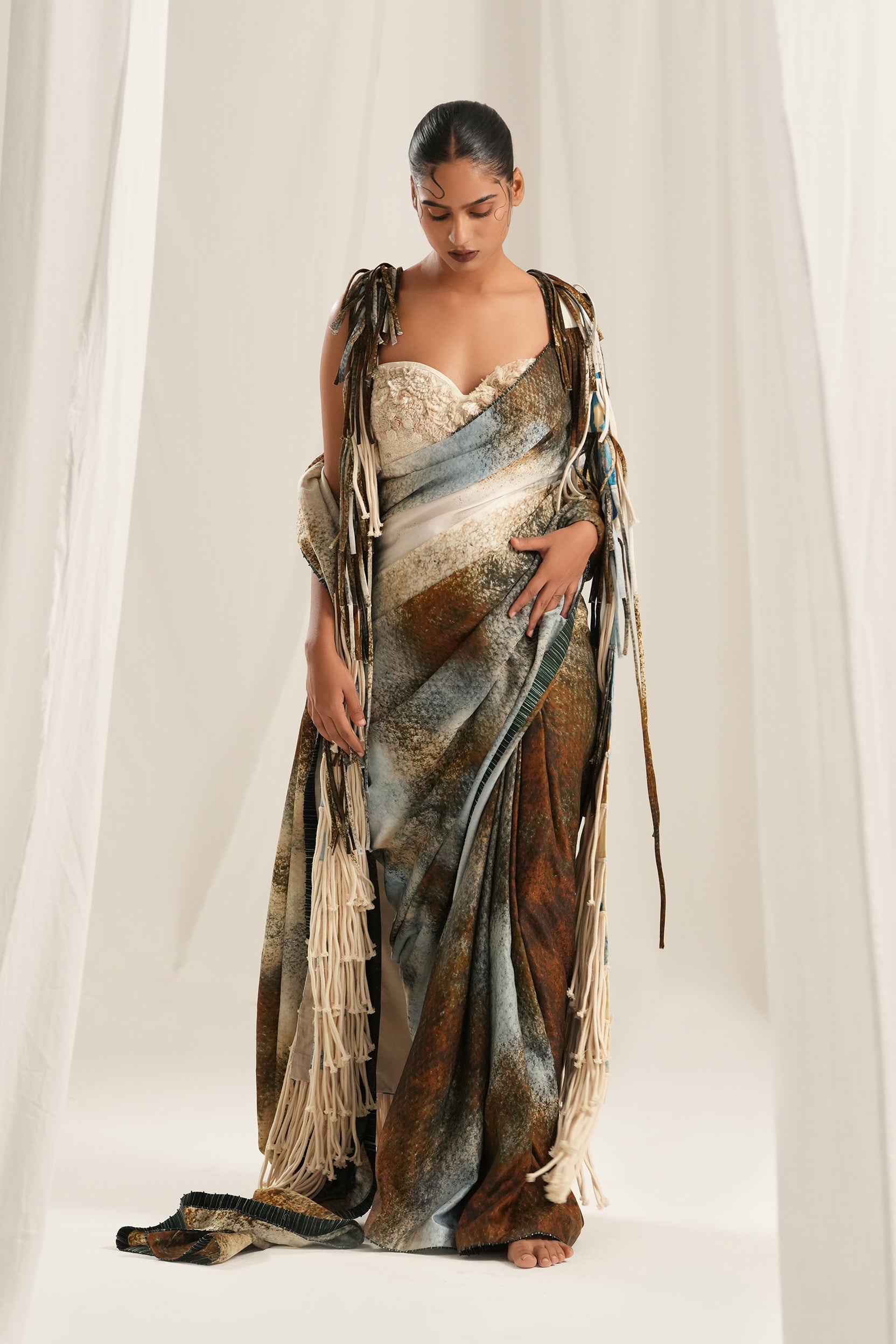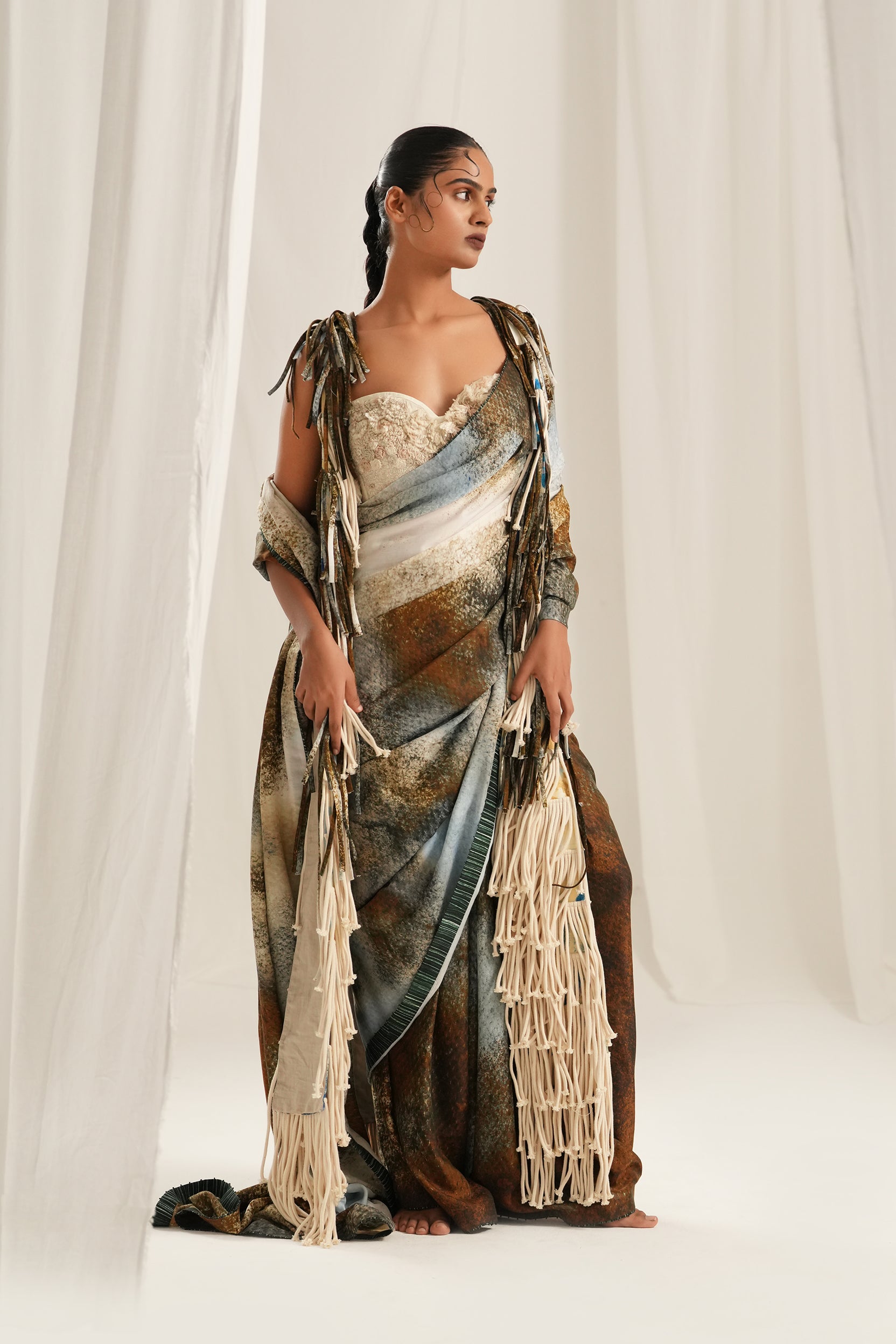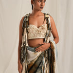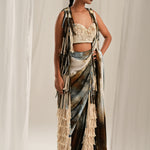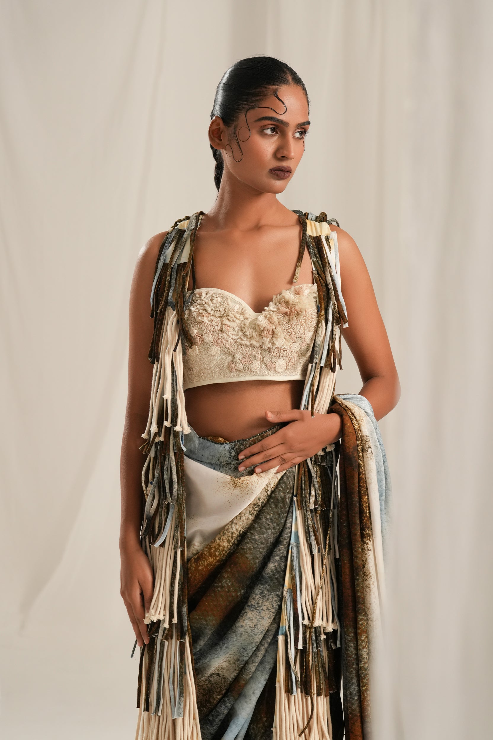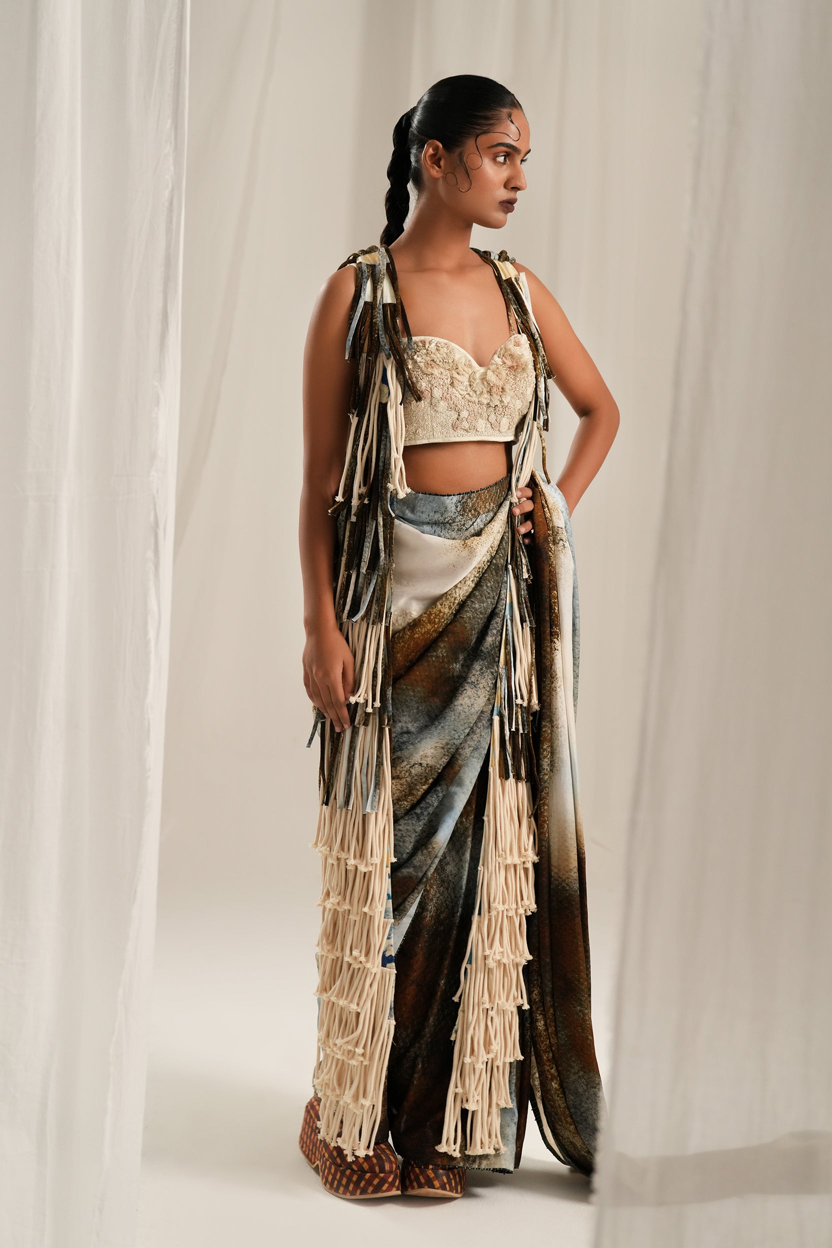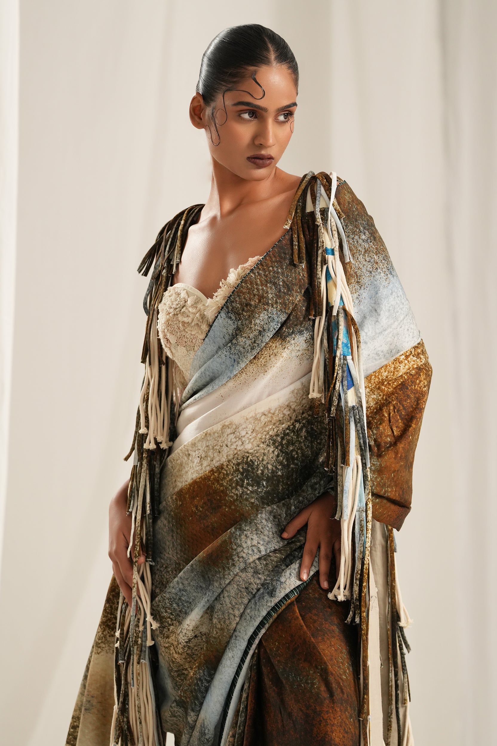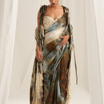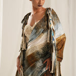Long Jacket made of fabric strips in shades of blues, browns and off whites with side tie up details.
