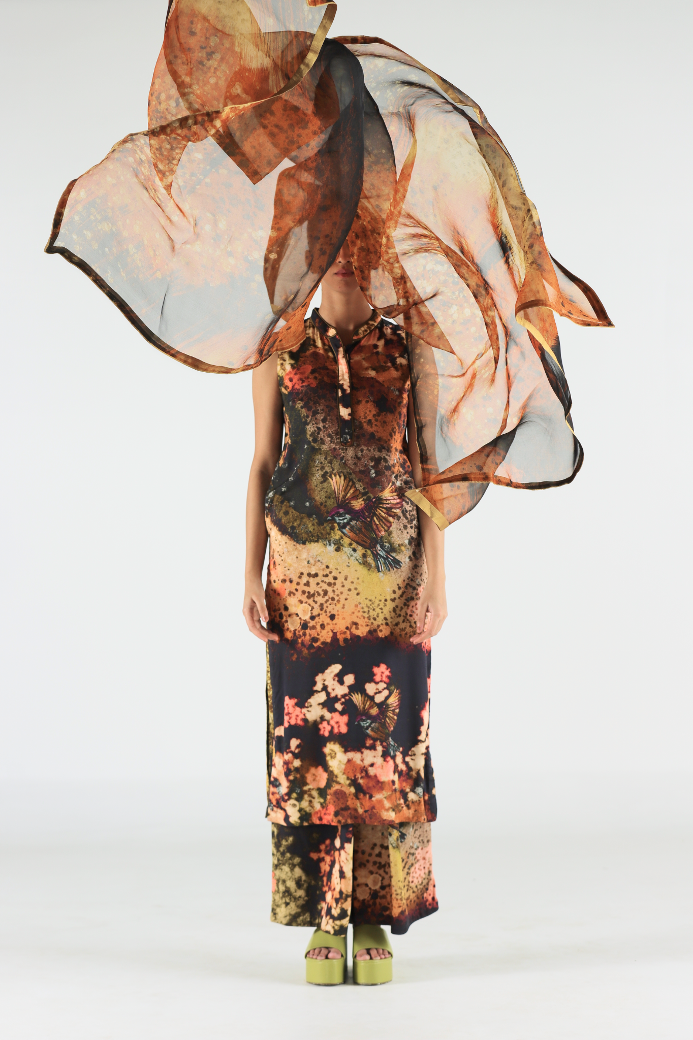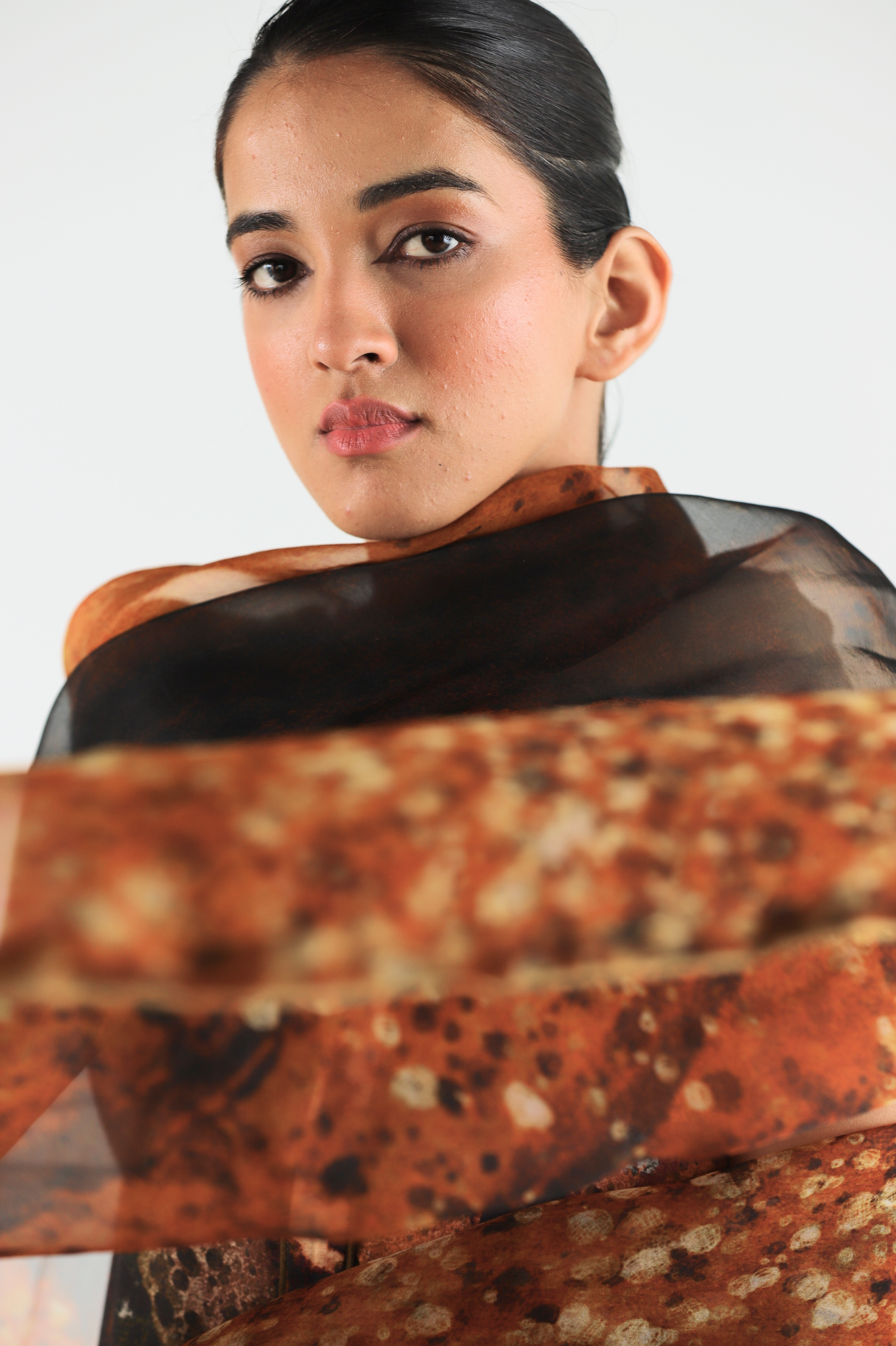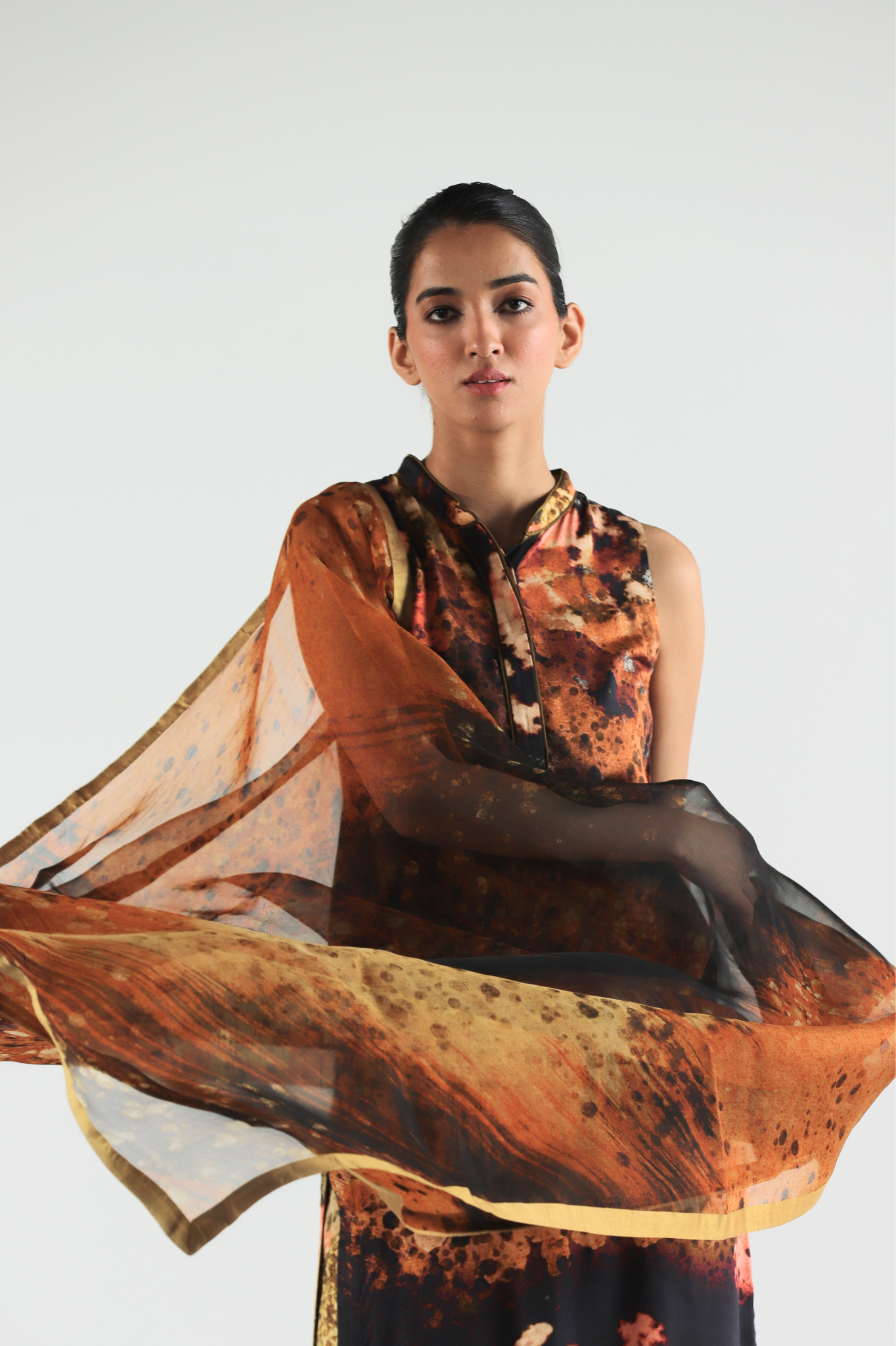 The Gold streak Dupatta hand-painted, digitally printed strokes in silk organza with a clean edge detail.