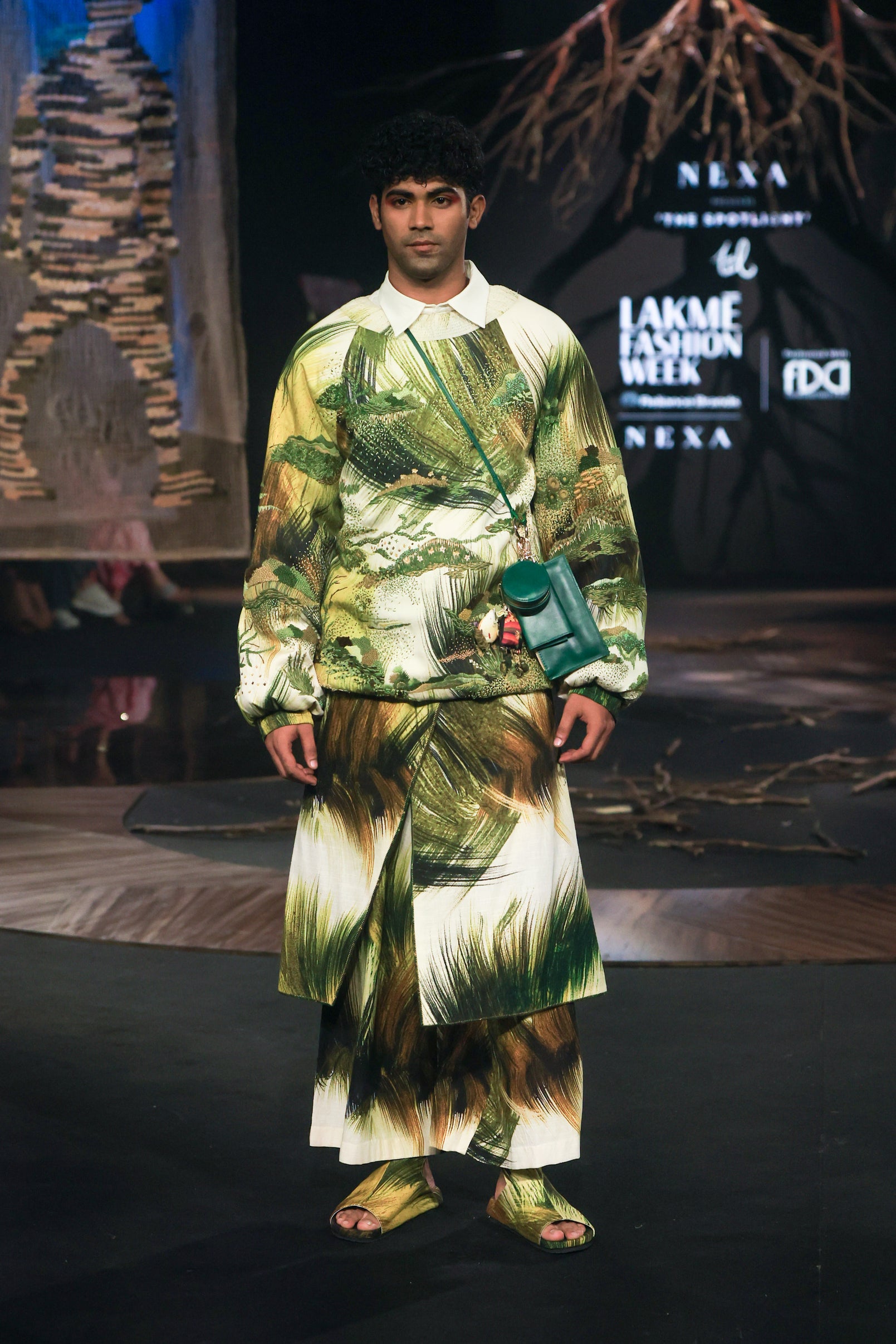 -FABRIC: COTTON MODAL -COLOR: GREEN - NO OF COMPONENTS:1 -TECHNIQUE ON FABRIC:HAND PAINTED DIGITALLY PRINTED AND HAND EMBROIDERED