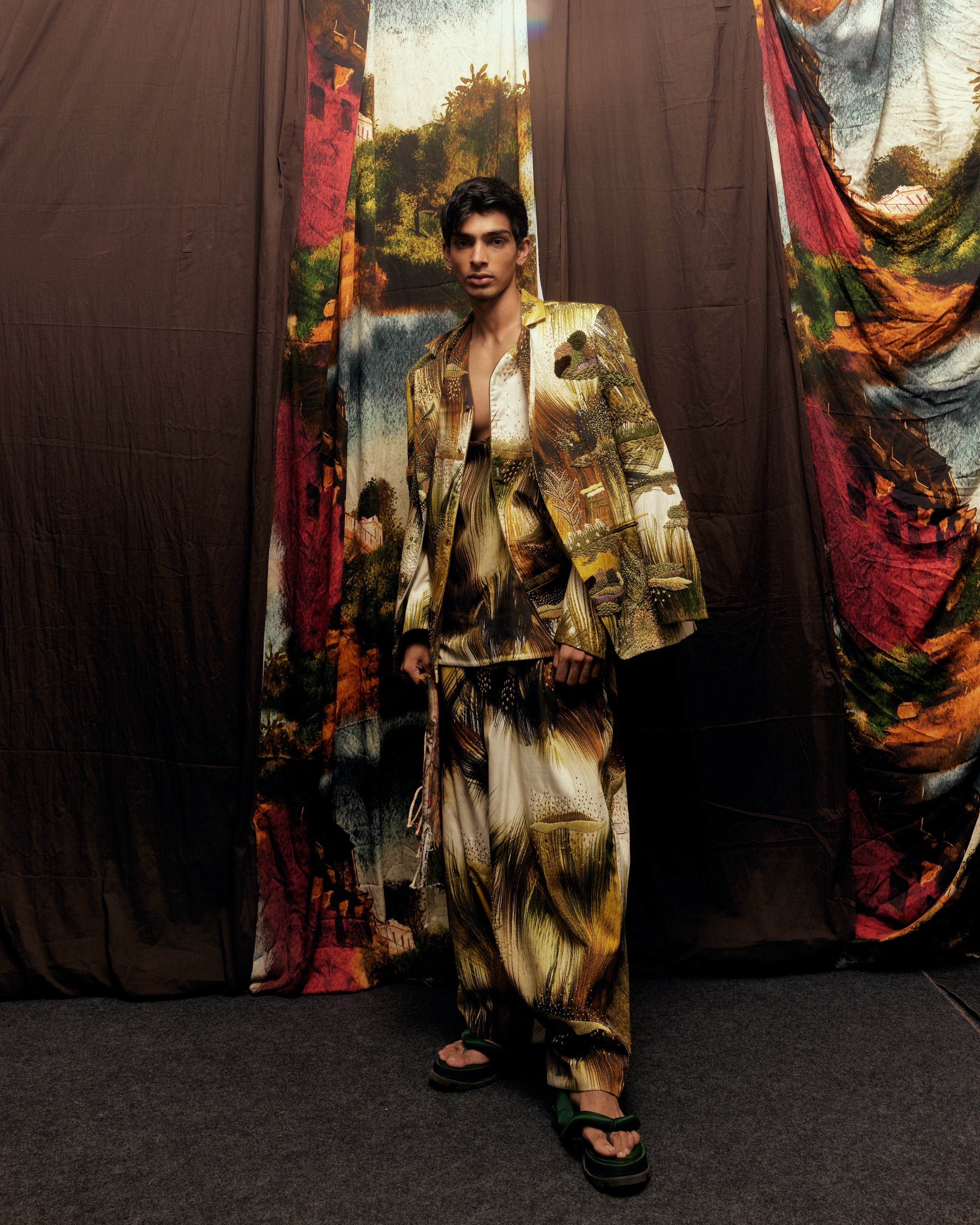 Our grass emb. mens Co-ord, made in soft cotton. The co-ord set showcases a mesmerizing hand-painted, digitally printed grass texture, transforming fashion into art.