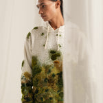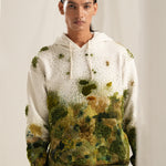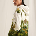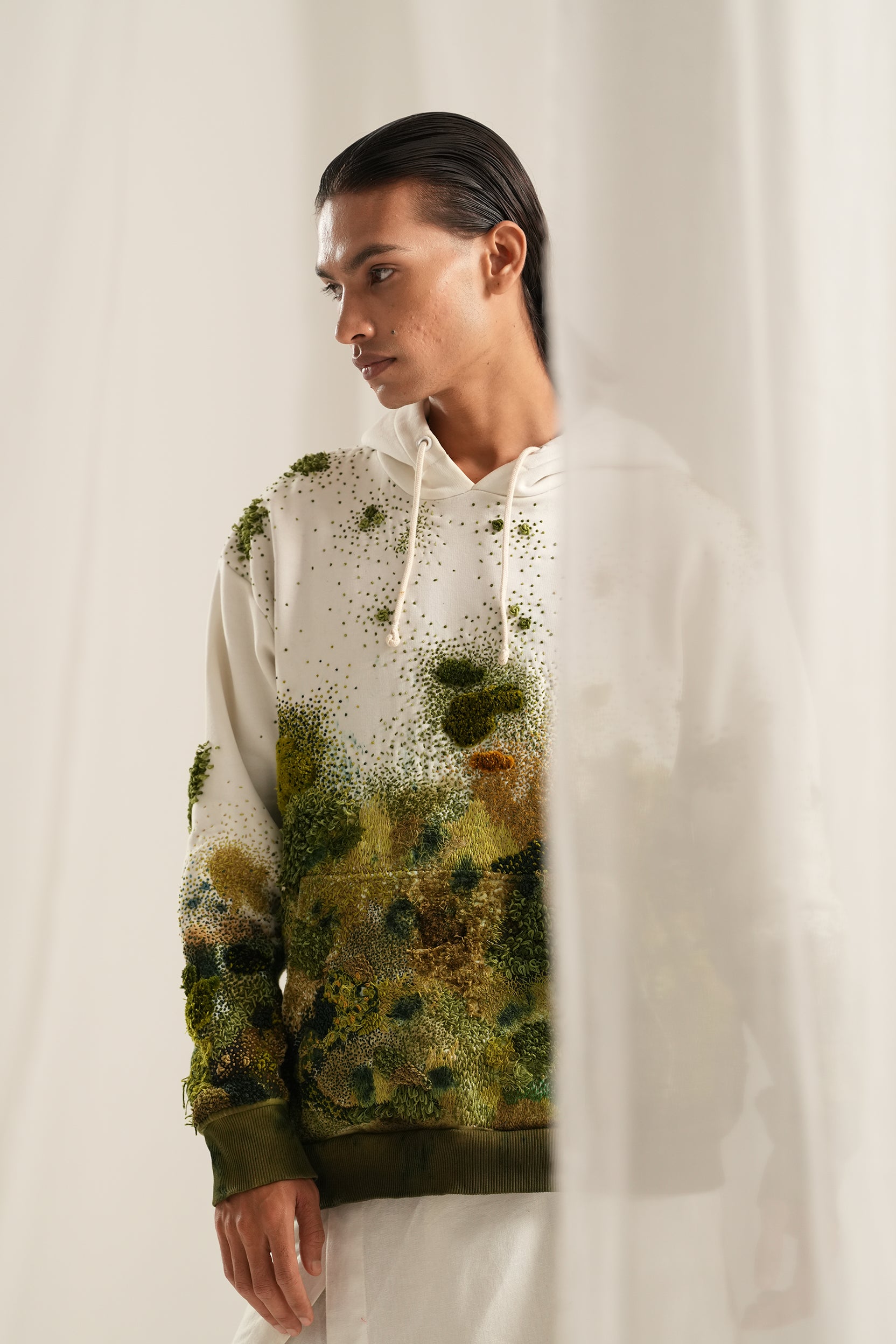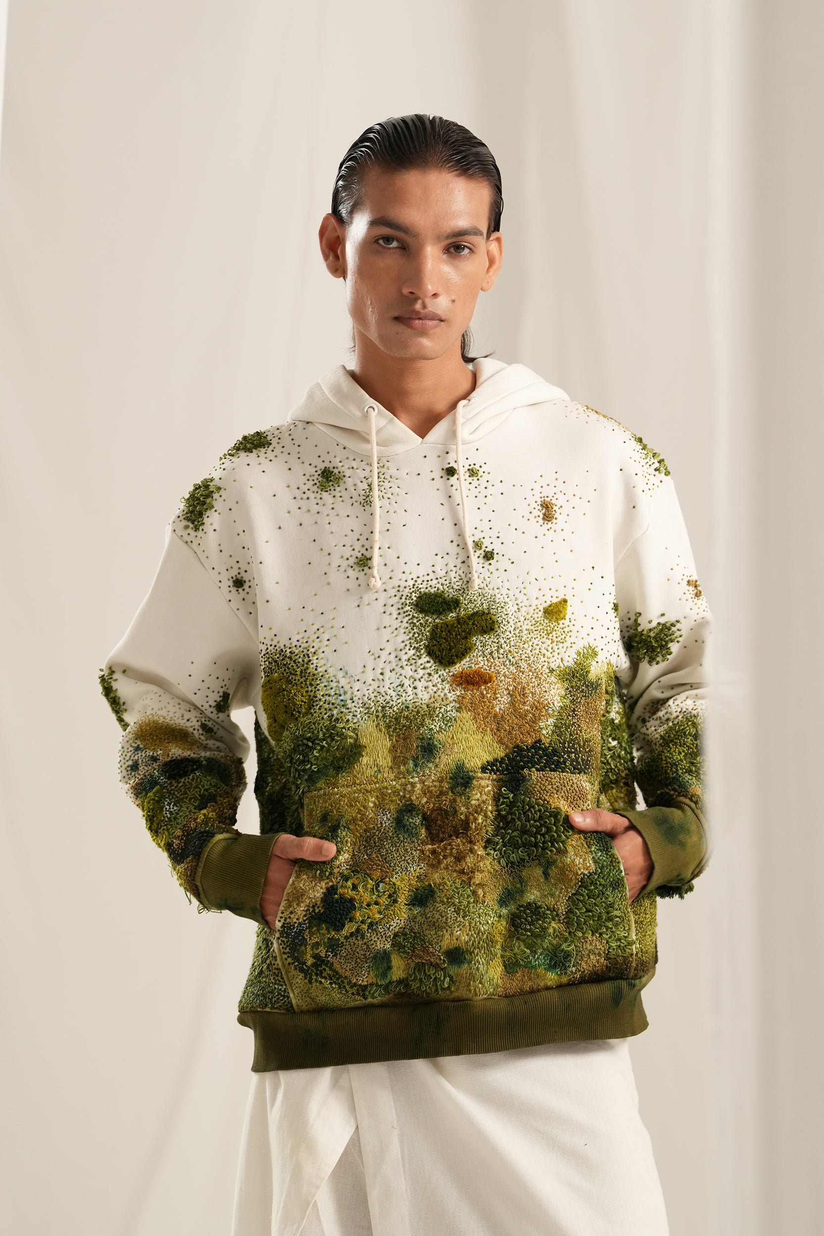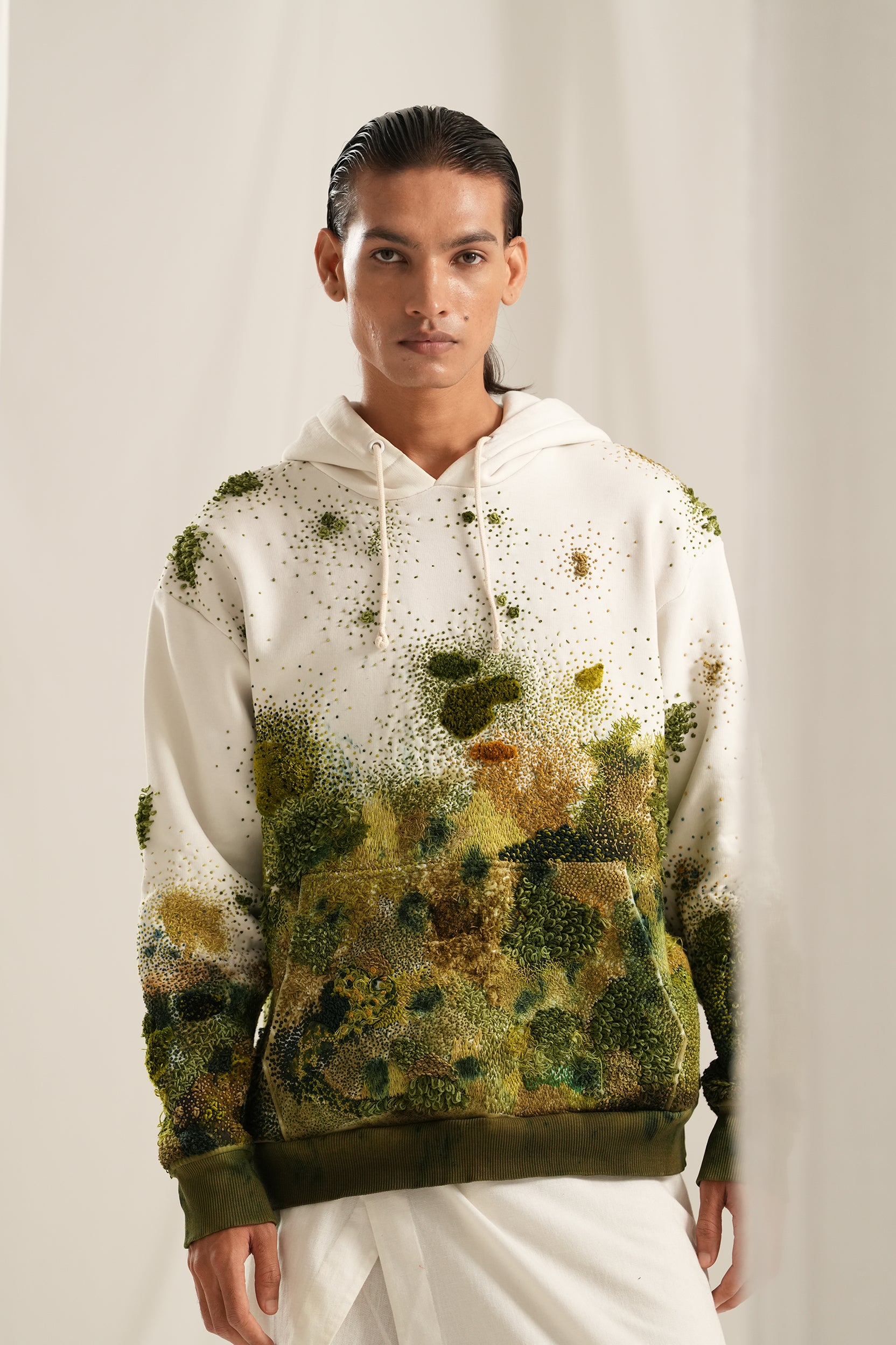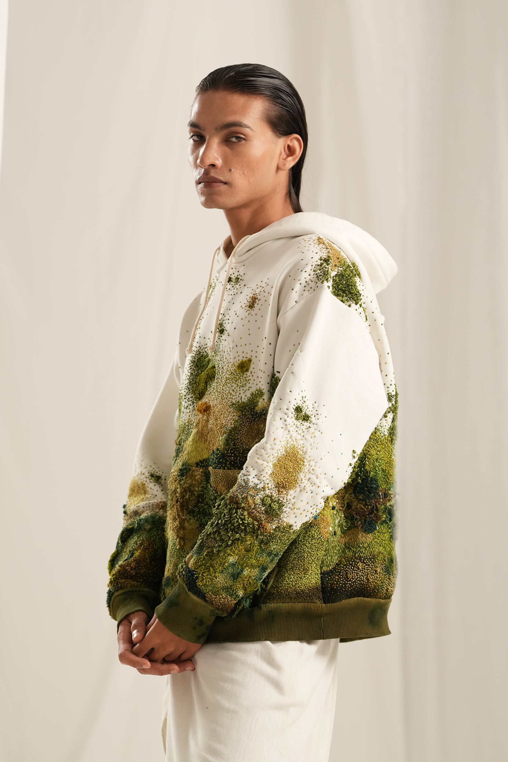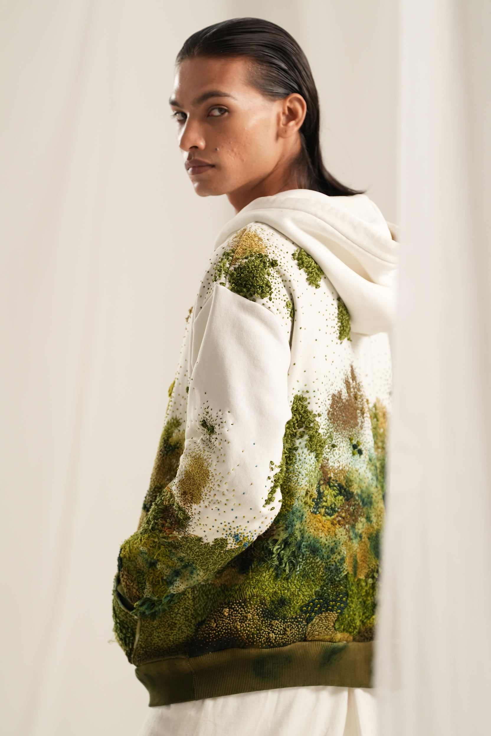 Hand embroidered and textured hoodie on a white cotton base with pockets on front.
