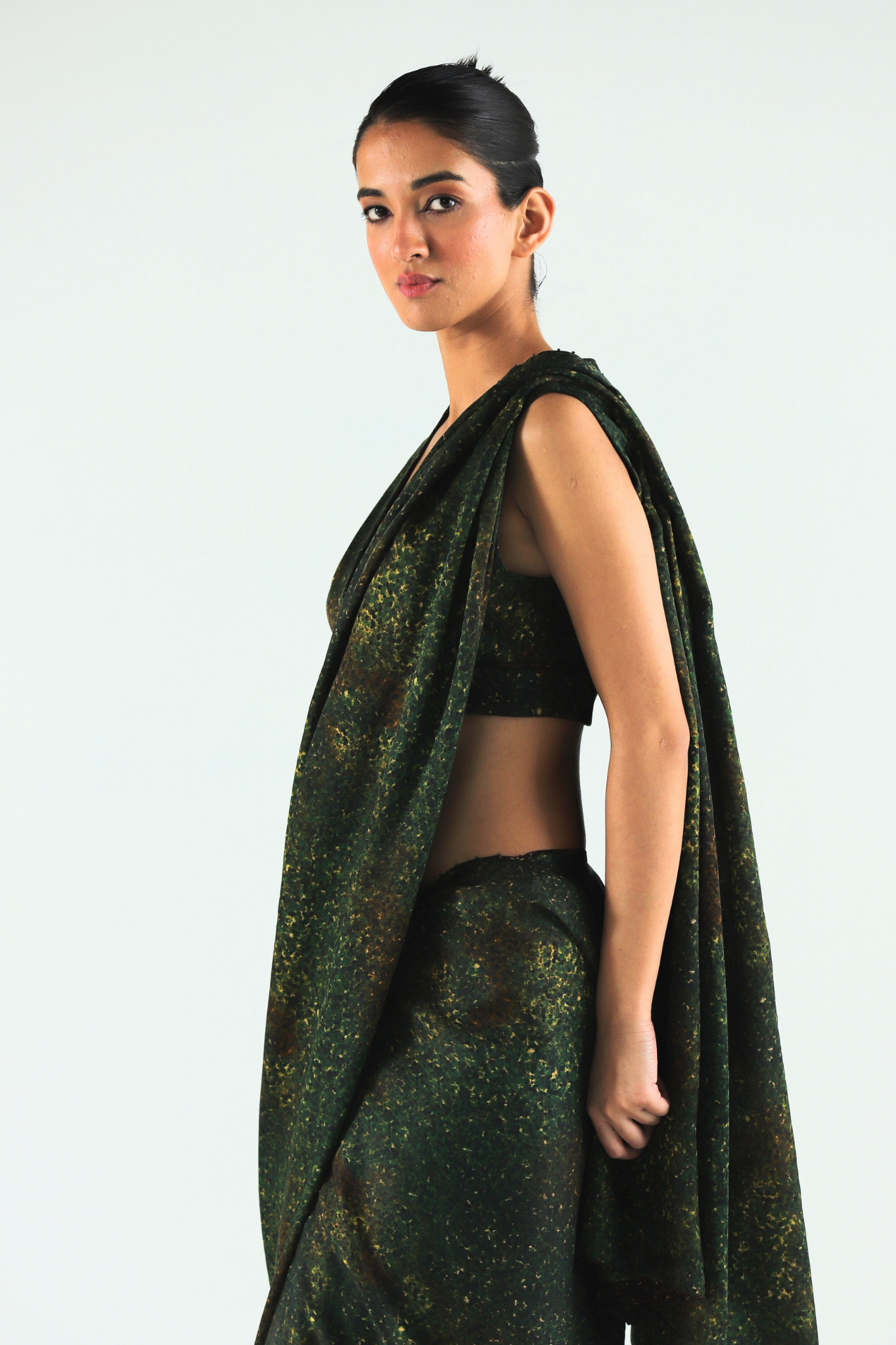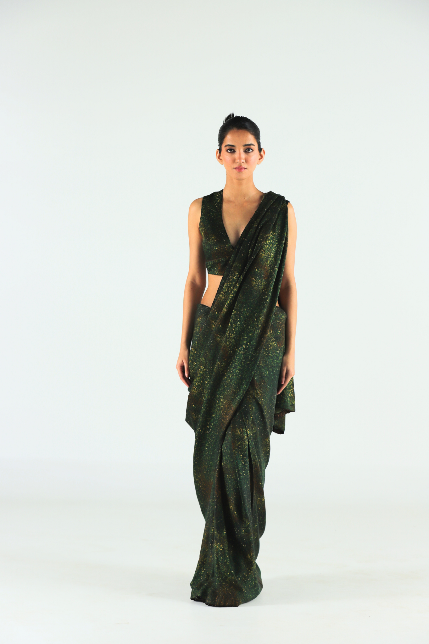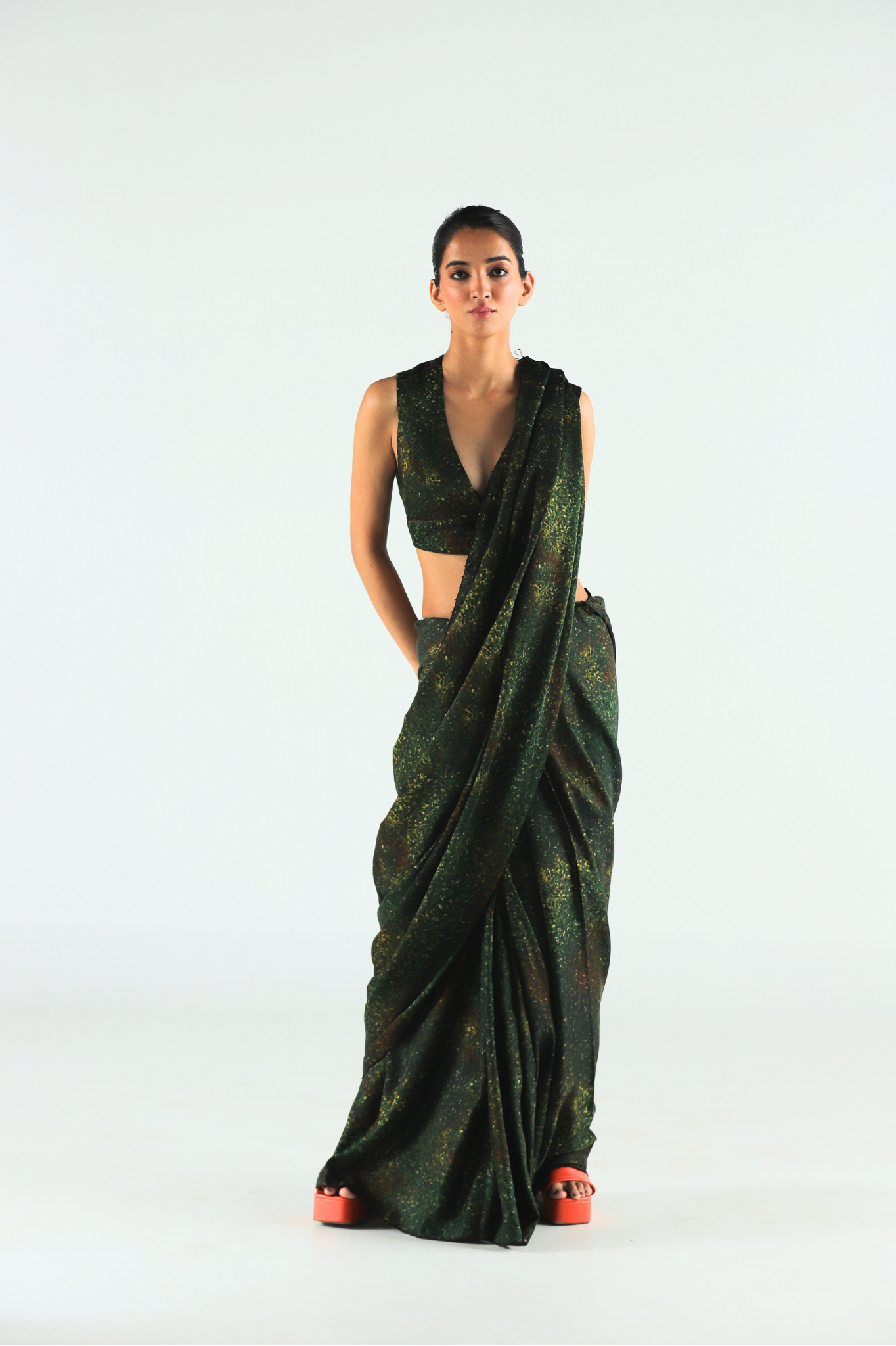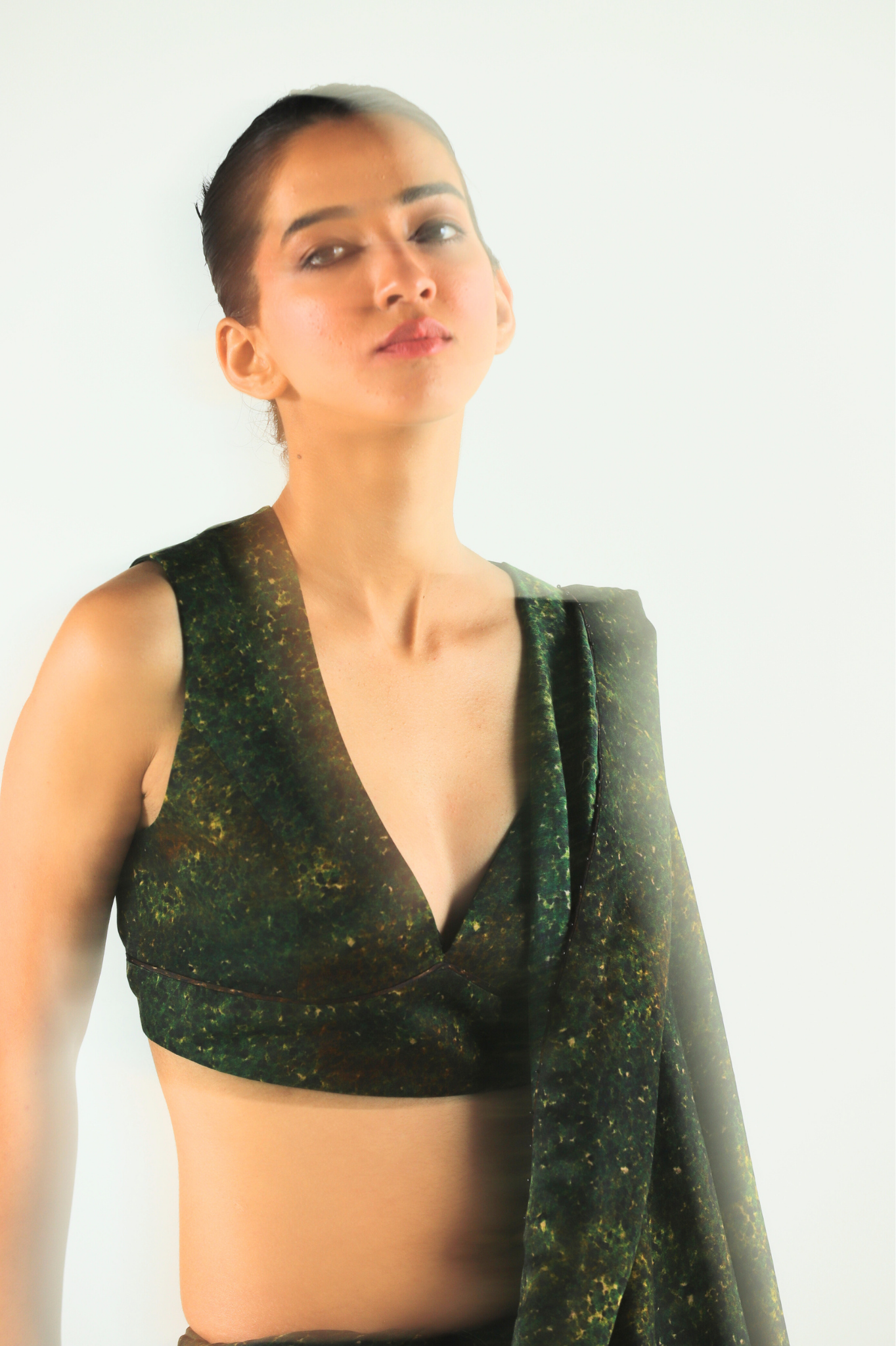 Our Green Freckle Saree, crafted from pure cotton silk satin. This elegant saree beautifully captures the essence of hand-painted artistry through its digitally printed freckles. Accompanied by a matching digitally printed lined blouse, the ensemble is meticulously finished with delicate beads along the edges, adding a touch of sophistication to your style.