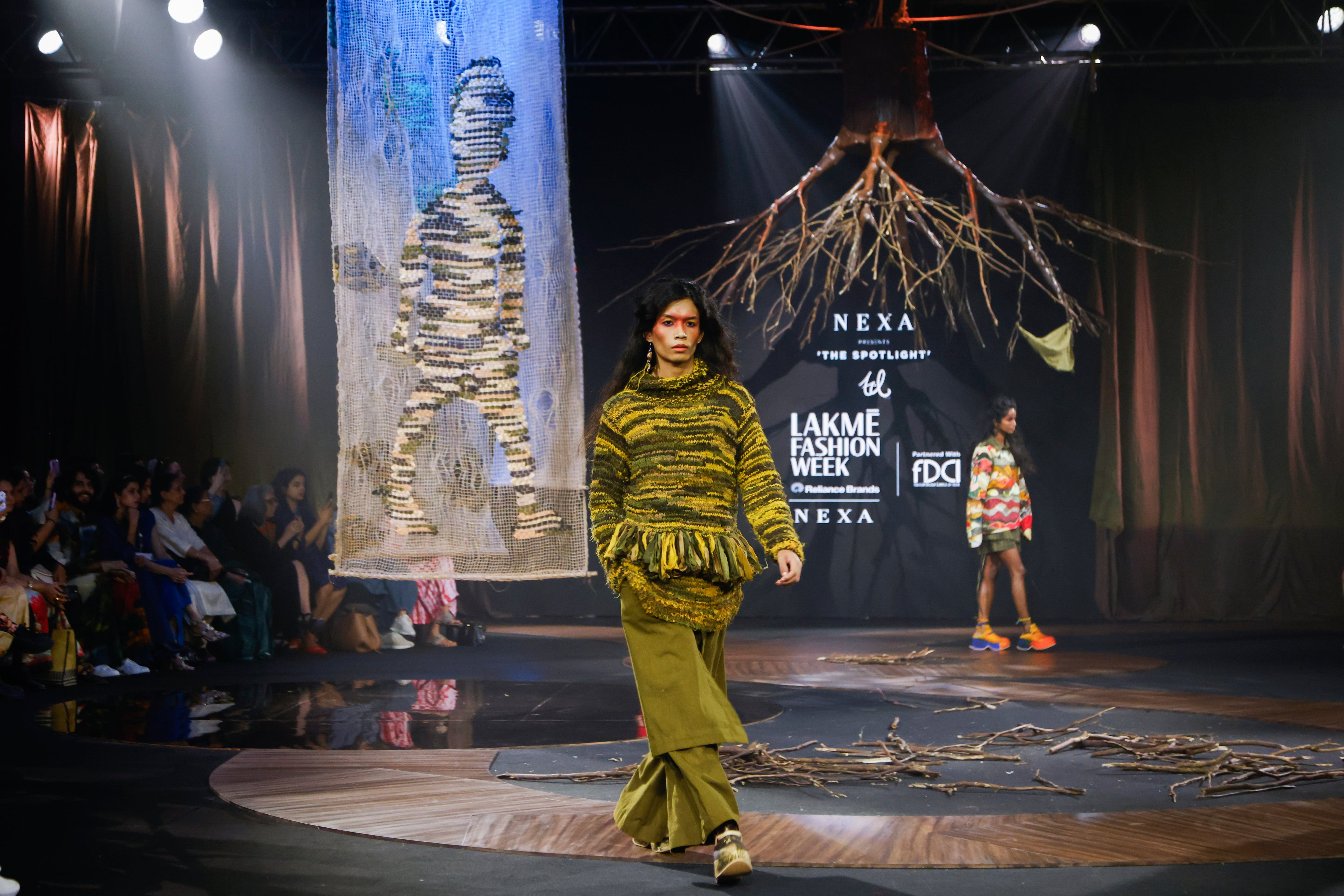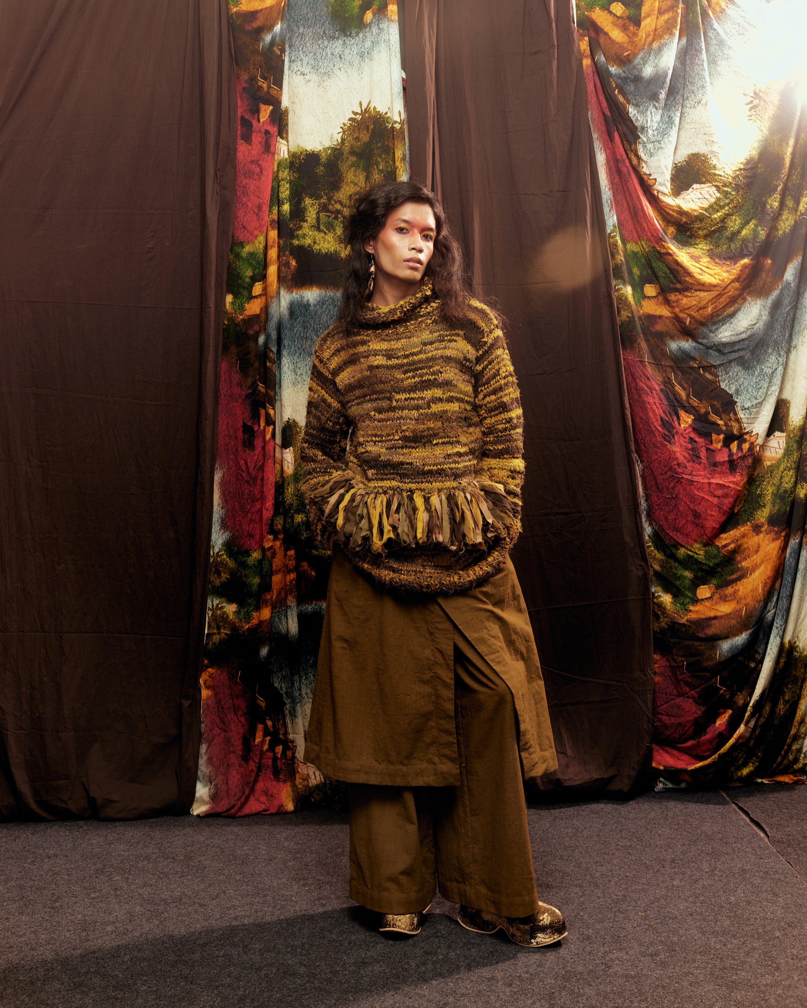 This Green katran pullover made from leftover fabric strips. it is fully upcycled in shades of mustard and olive with a fringe detail.