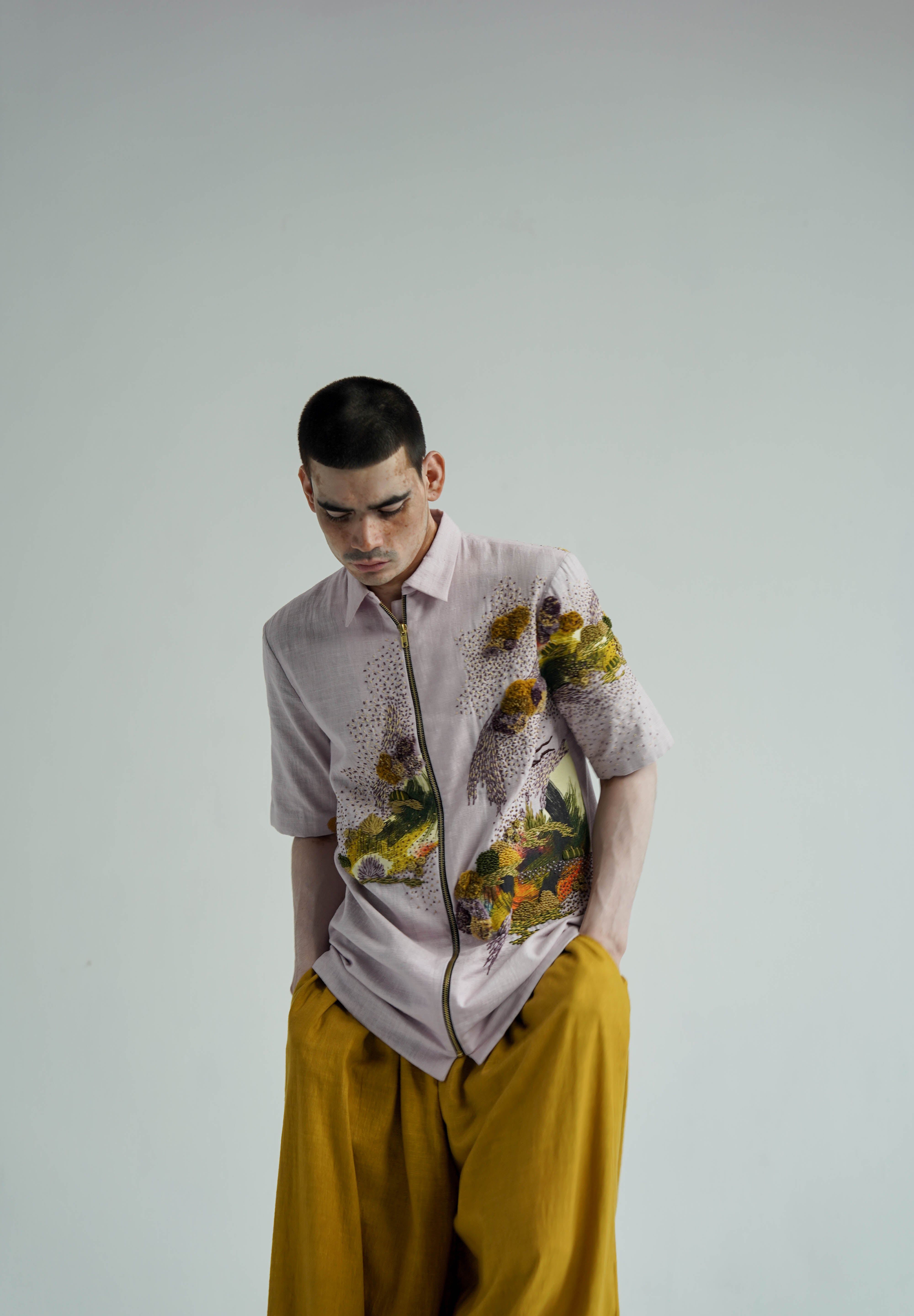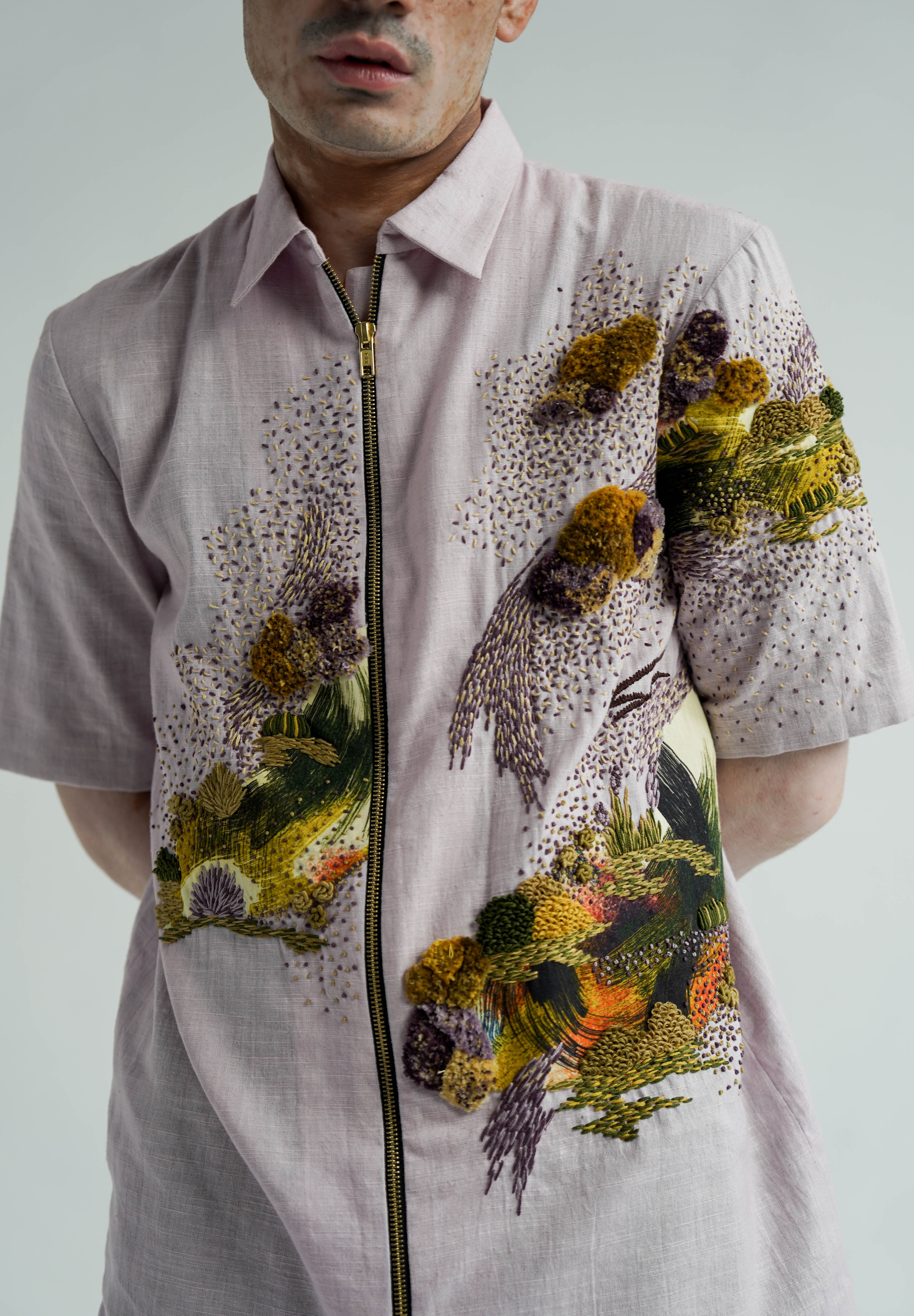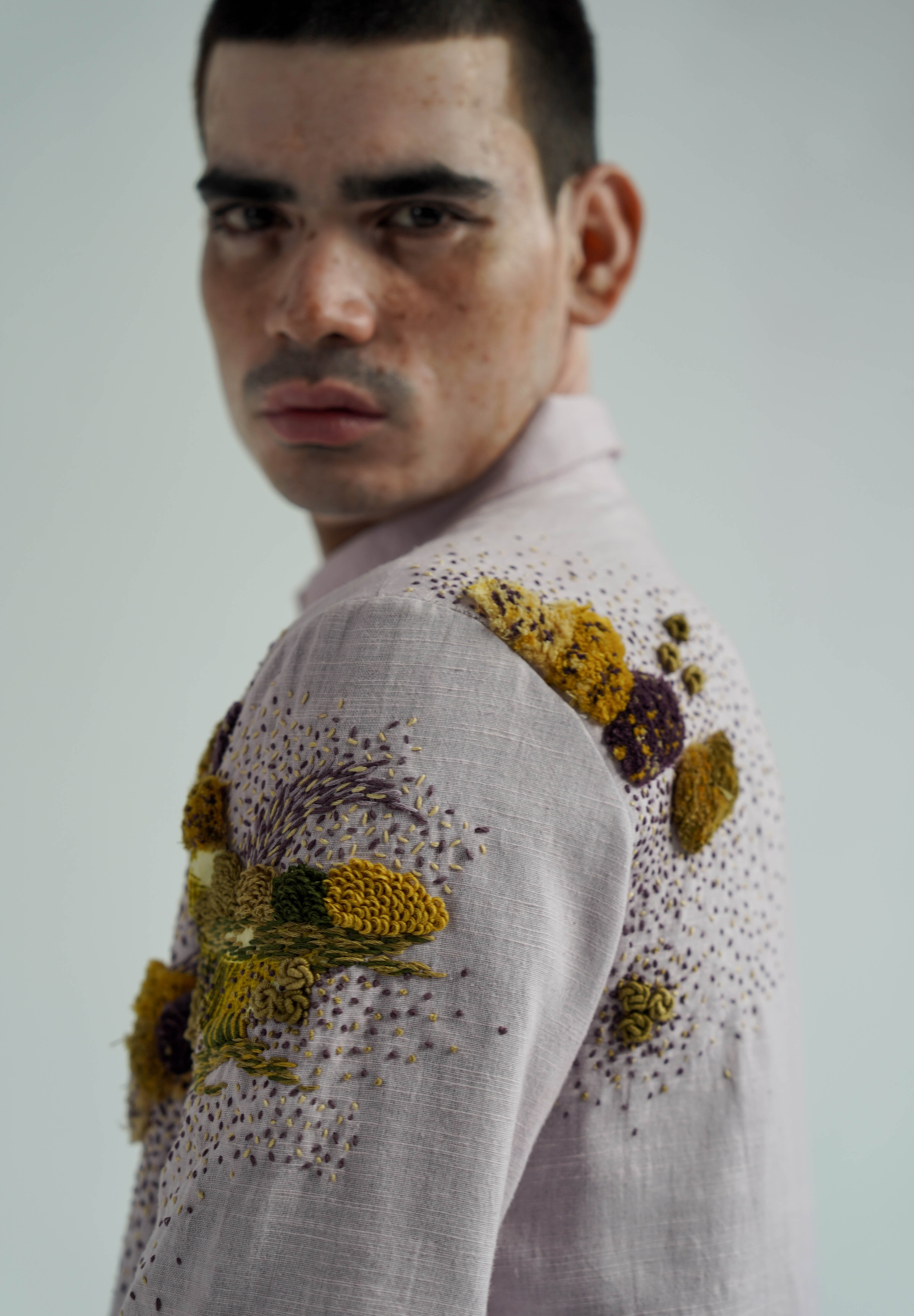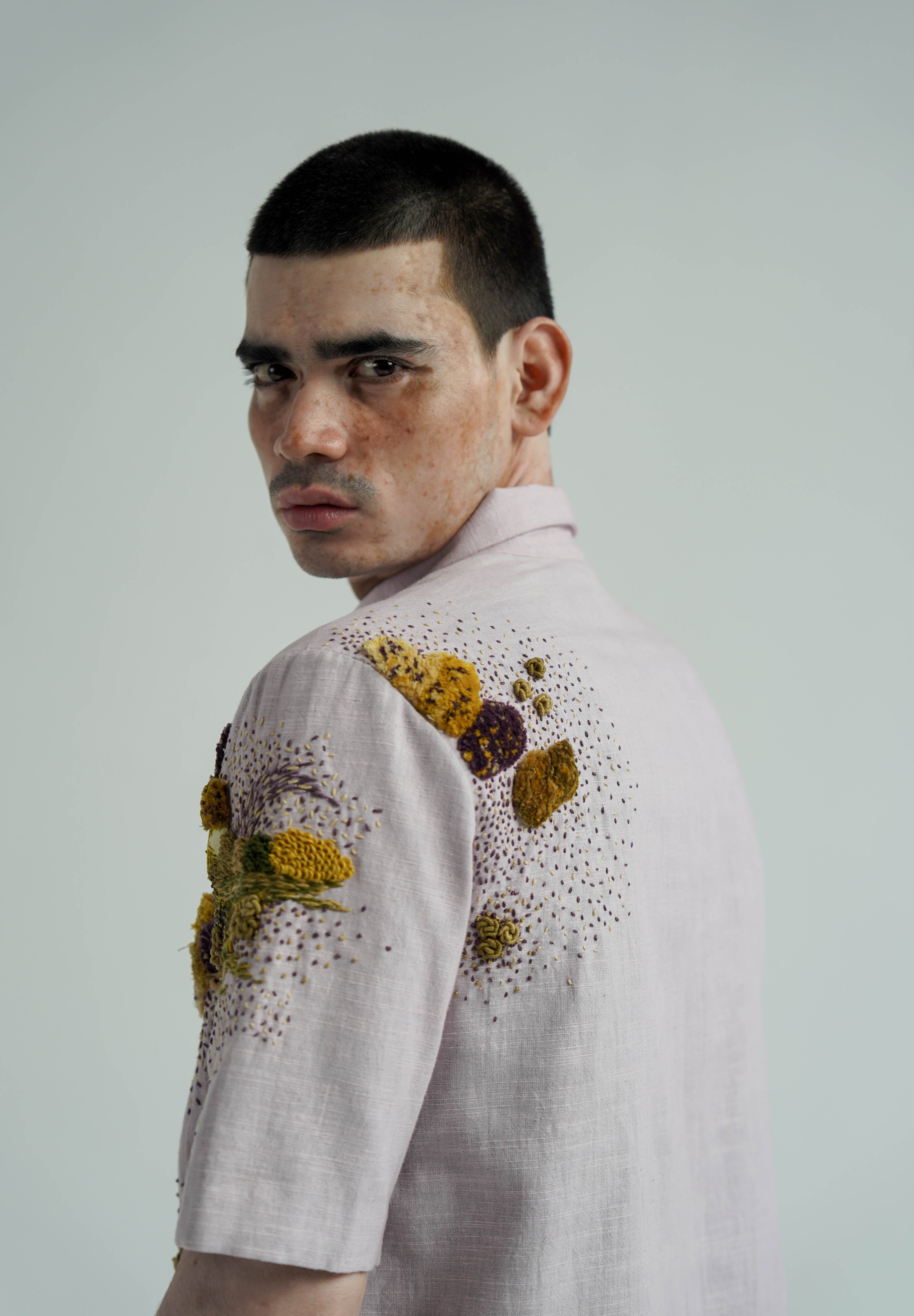 Discover the Hana Shirt, meticulously crafted from premium cotton and fully lined for added comfort. Featuring a stunning hand-dyed lilac hue and adorned with exquisite hand-embroidered textures, this shirt offers a relaxed fit that is perfect for all genders.