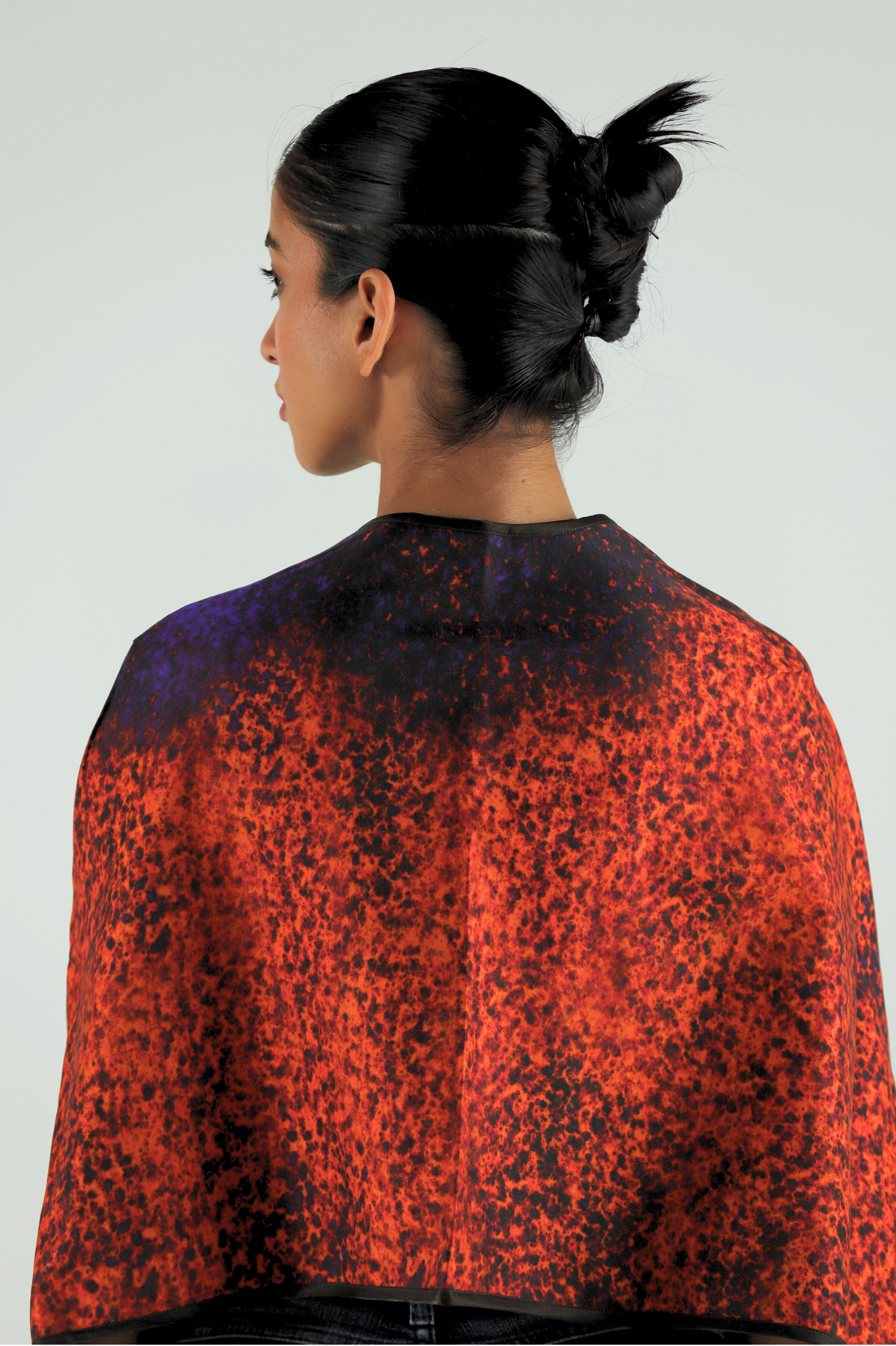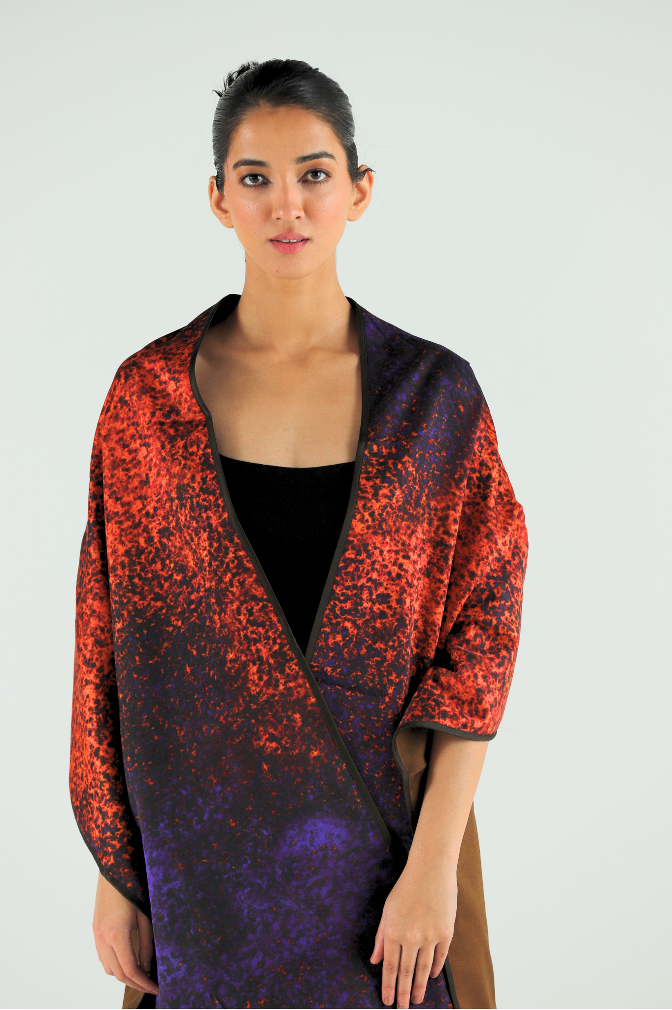 The Red freckle reversible cape shawl made in cotton silk satin conveys an impression of hand-painted, digitally printed freckles with a clean edge contrast binding detail The Red freckle reversible cape shawl made in cotton silk satin conveys an impression of hand-painted, digitally printed freckles with a clean edge contrast binding detail.