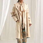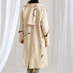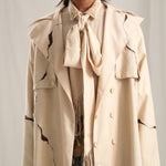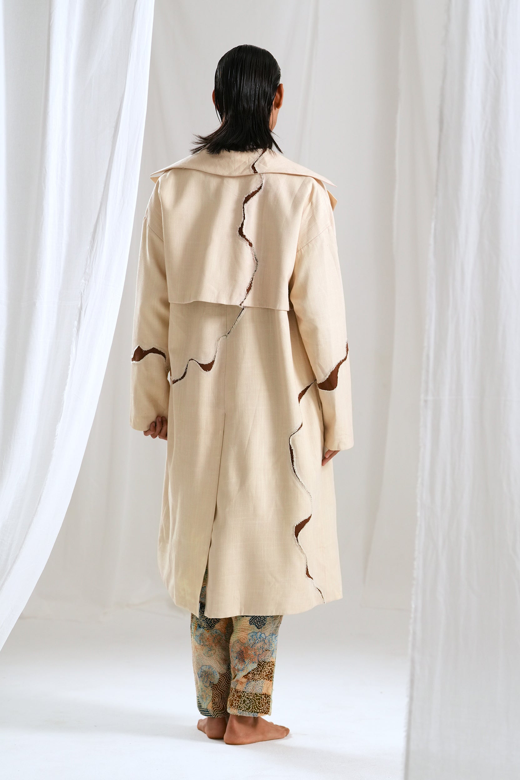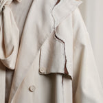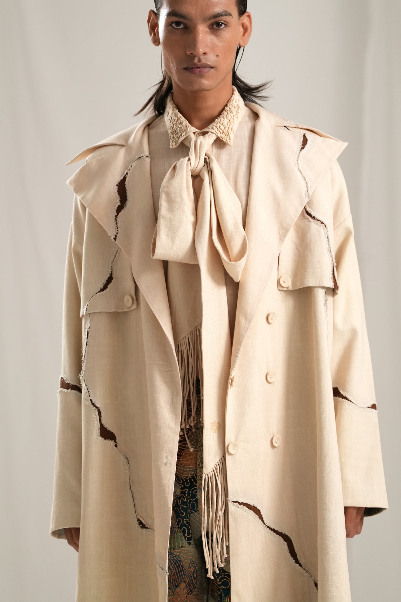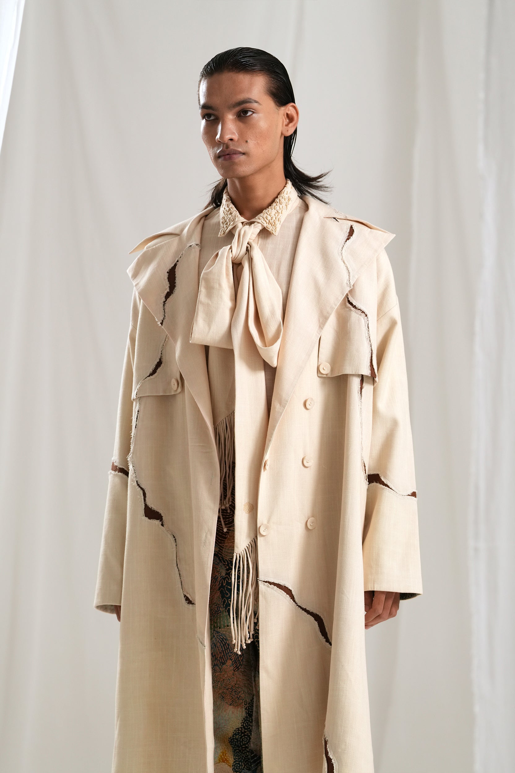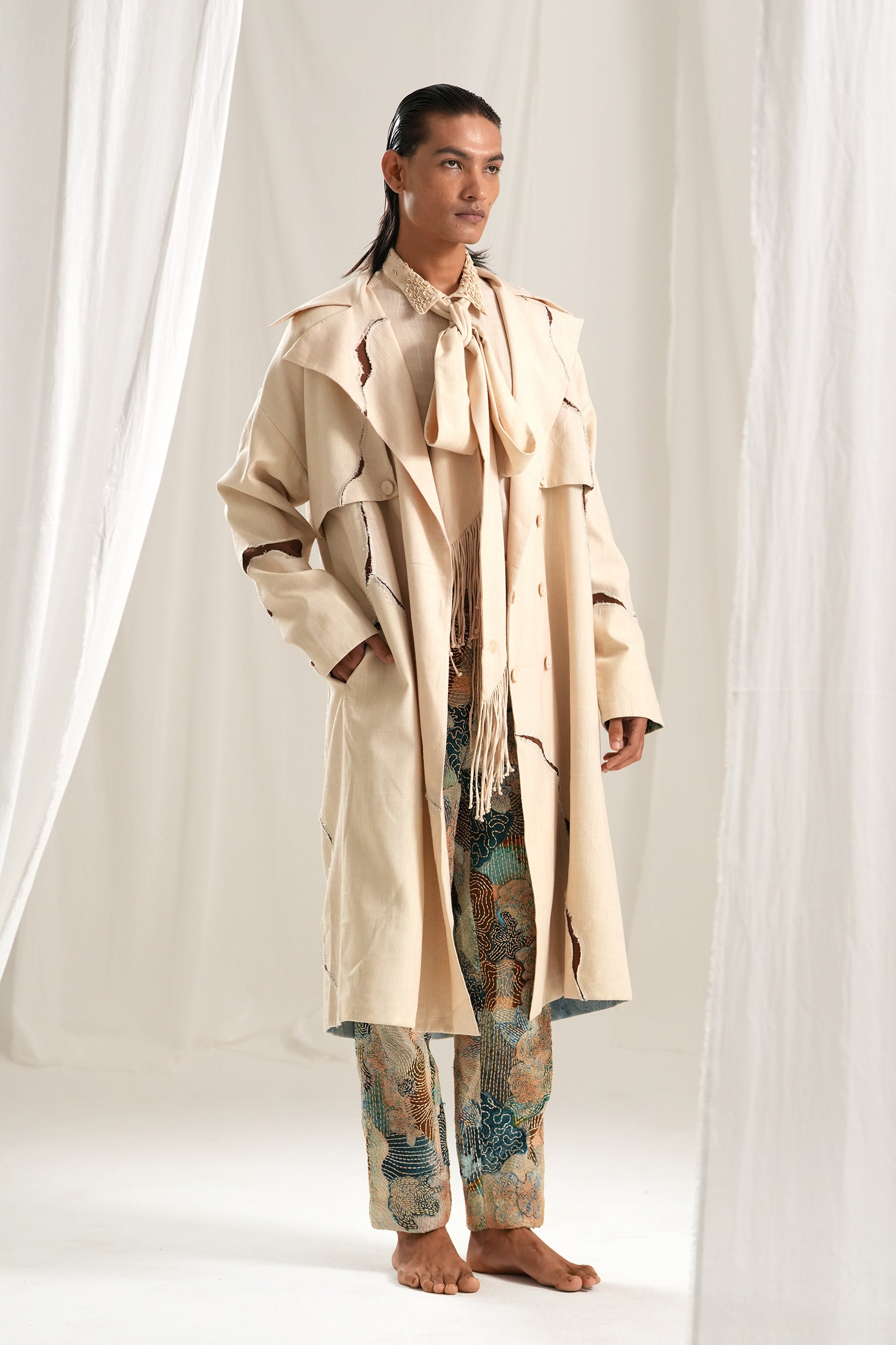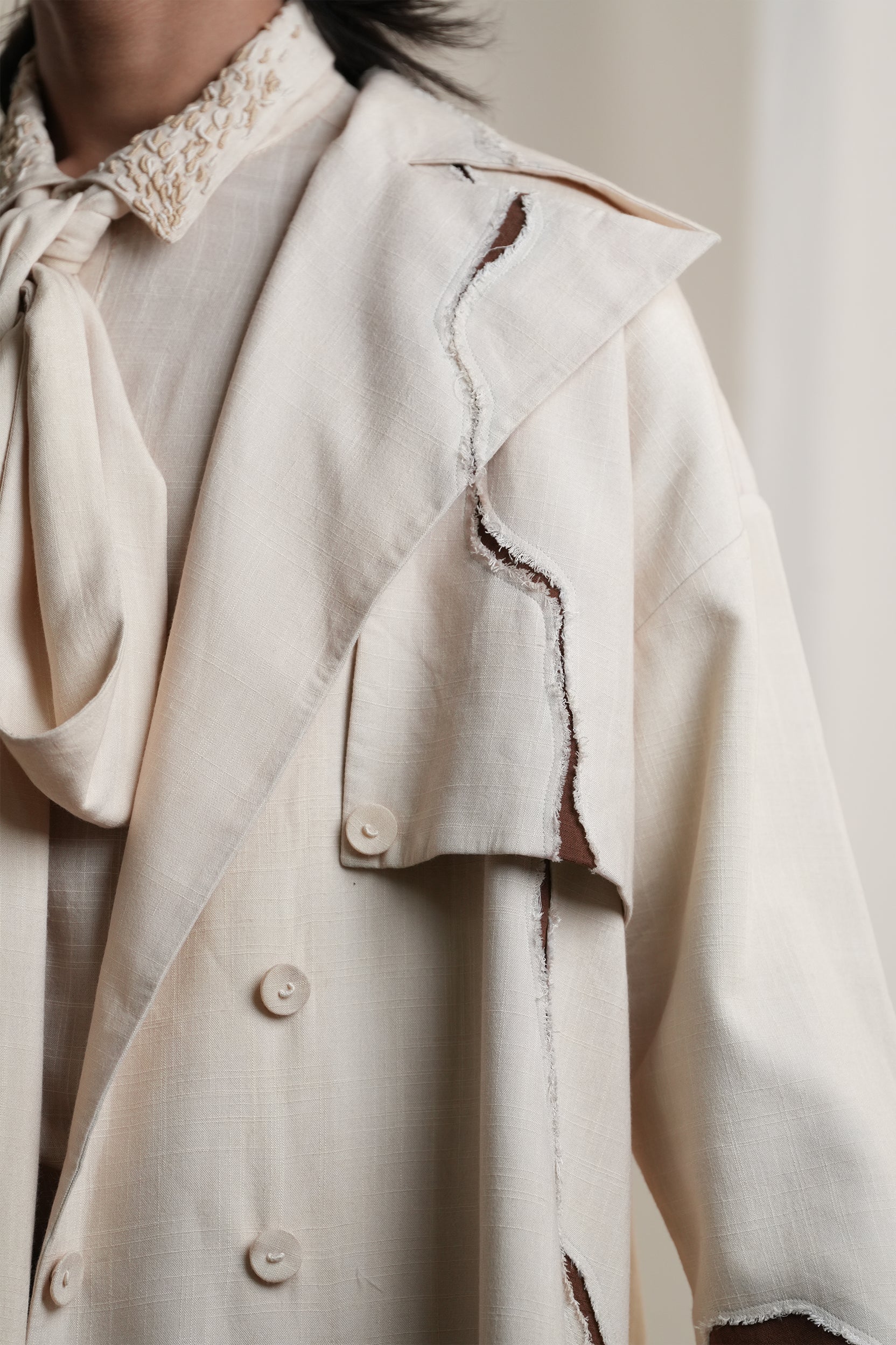 Our Crack Trench, crafted from soft, lightweight cotton fabric. This unique piece features a hand-created crack texture, frayed edges, and stylish shoulder panels, complemented by a wide, broad collar that makes it a true statement piece.