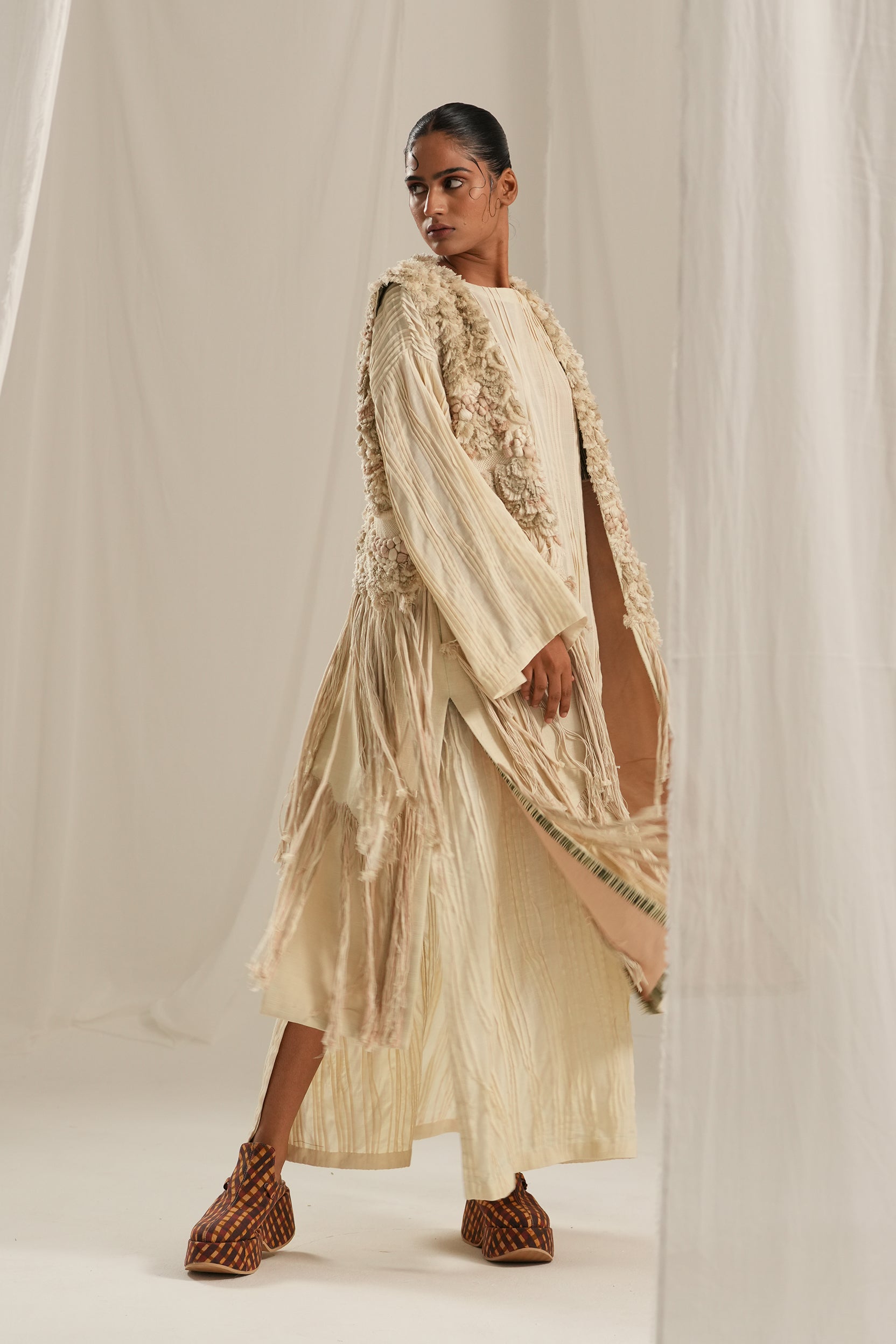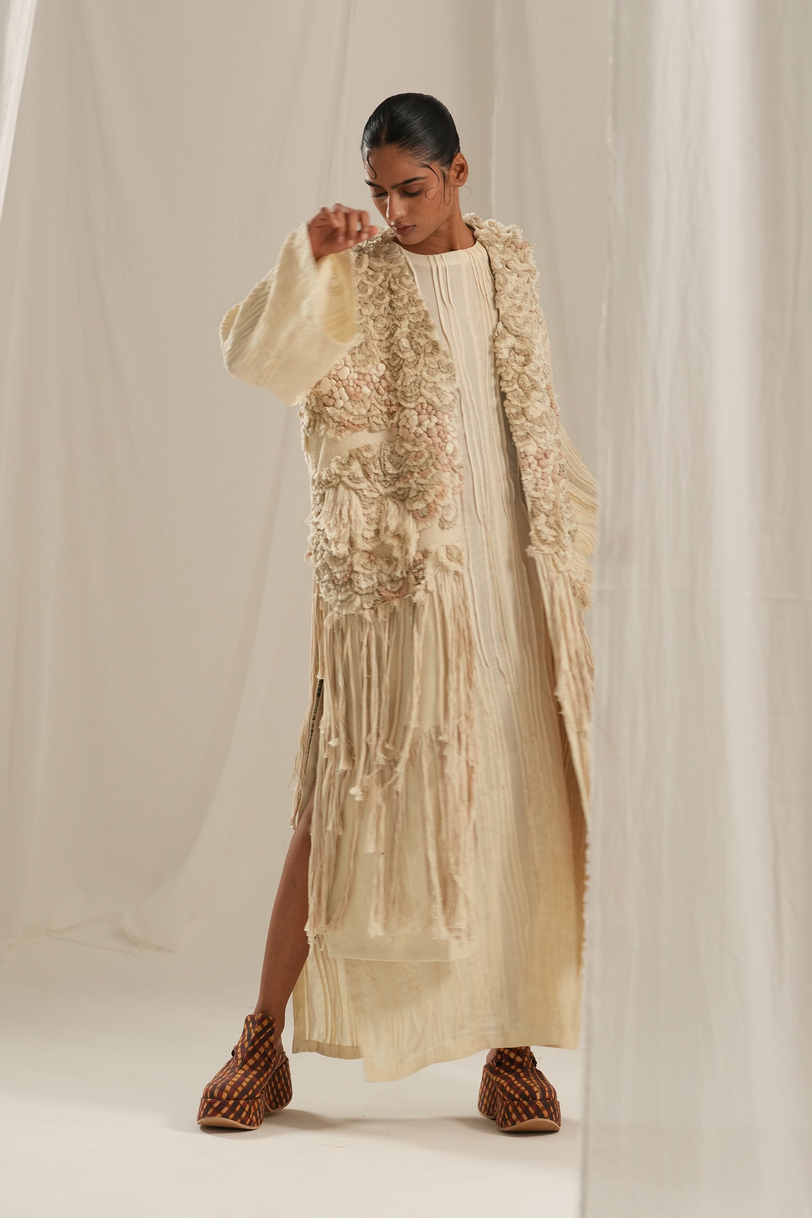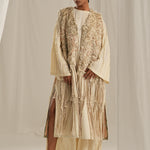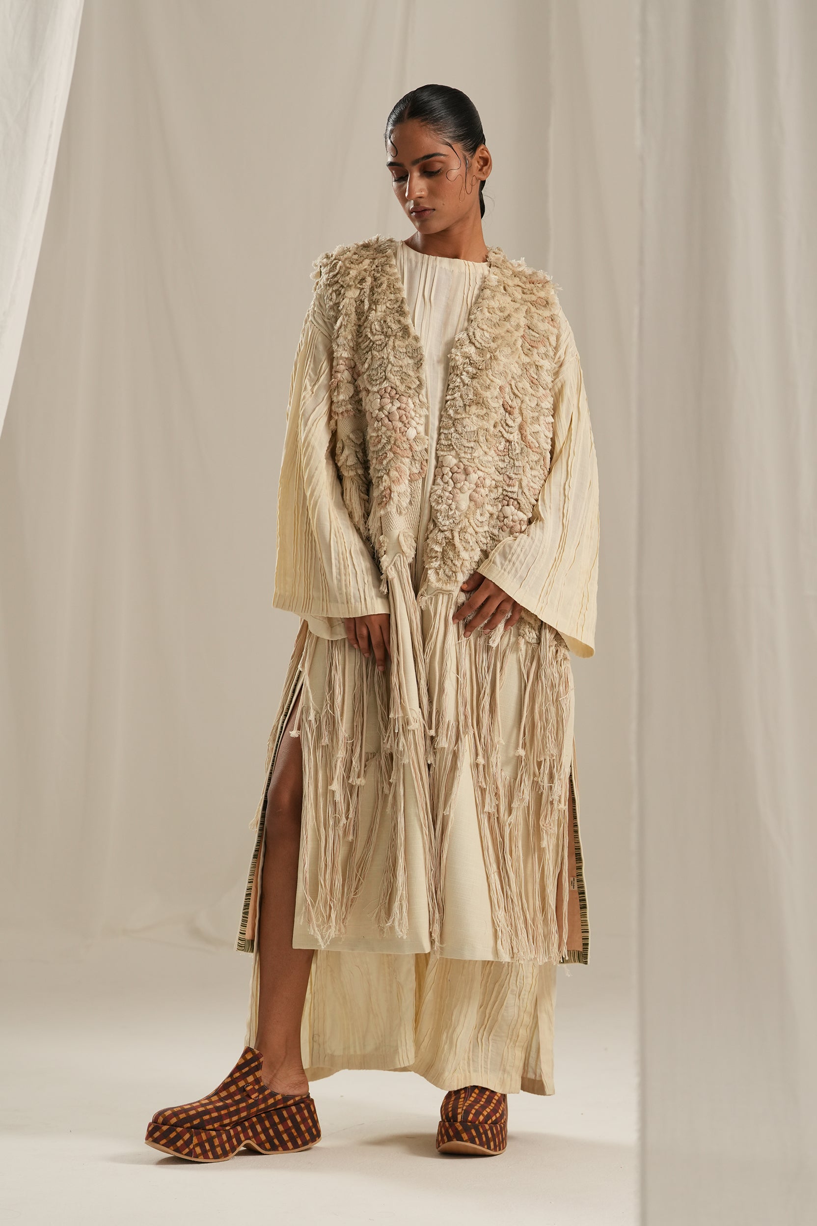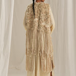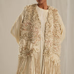 This stunning long overlay featuring exquisite hand embroidery that mimics the luxurious texture of fur. The playful fringe detailing and stylish back slit add a modern twist, making it the perfect statement piece for any occasion.