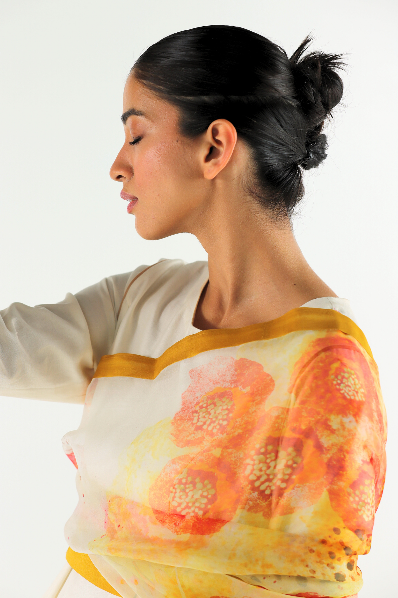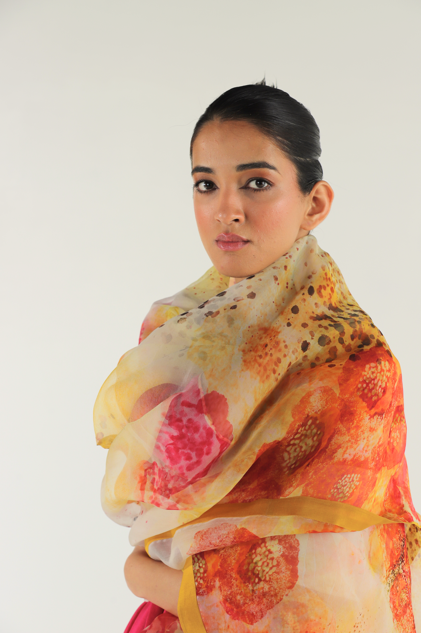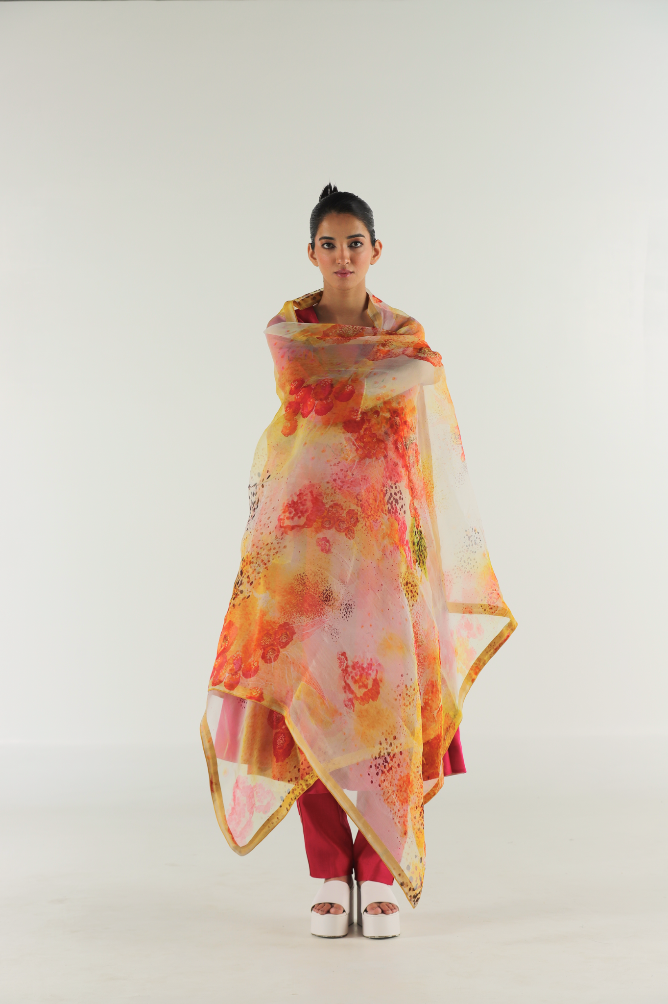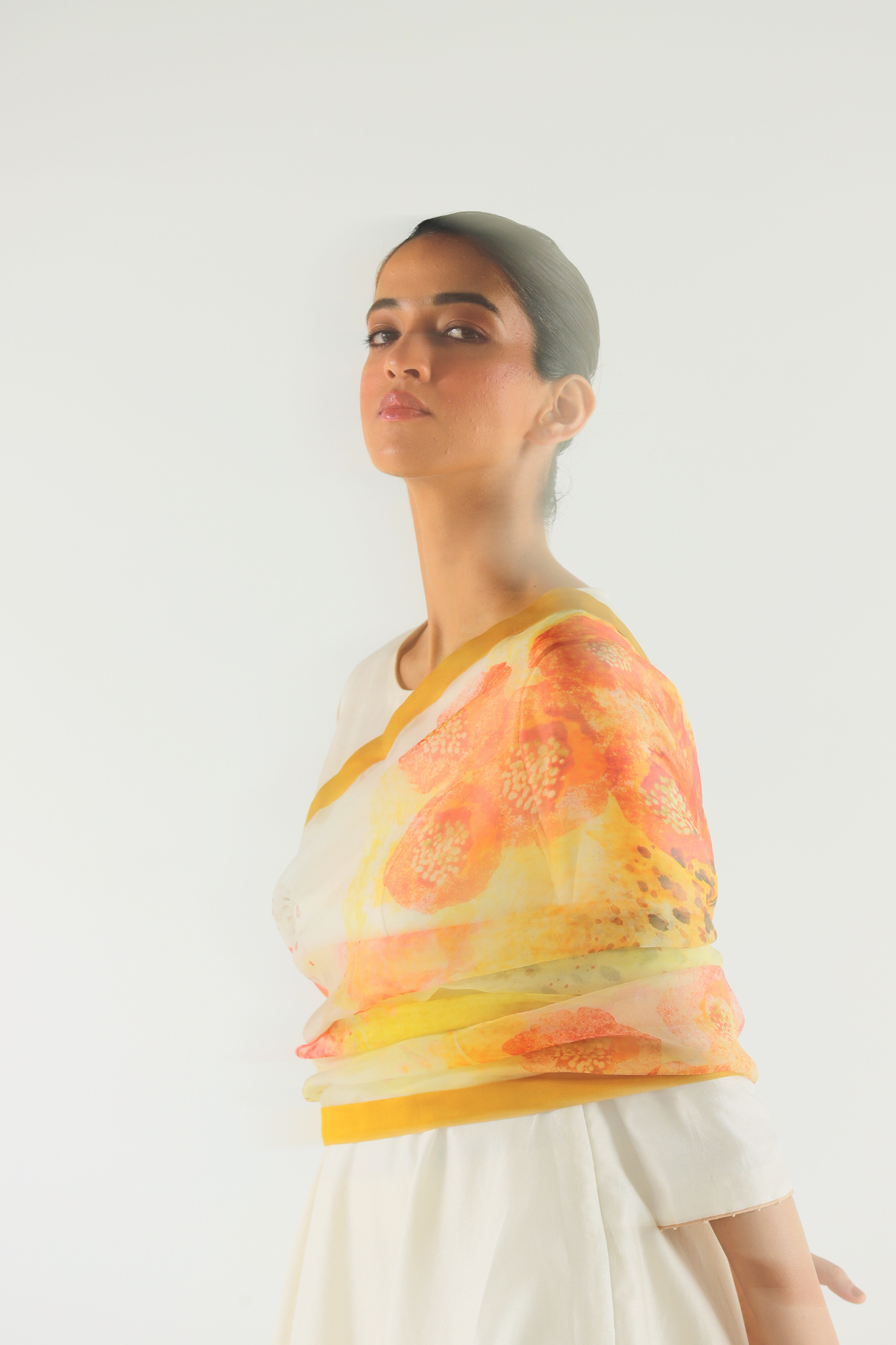 The Ivory Florid Dupatta hand-painted, digitally printed florals in silk organza with a clean edge detail.