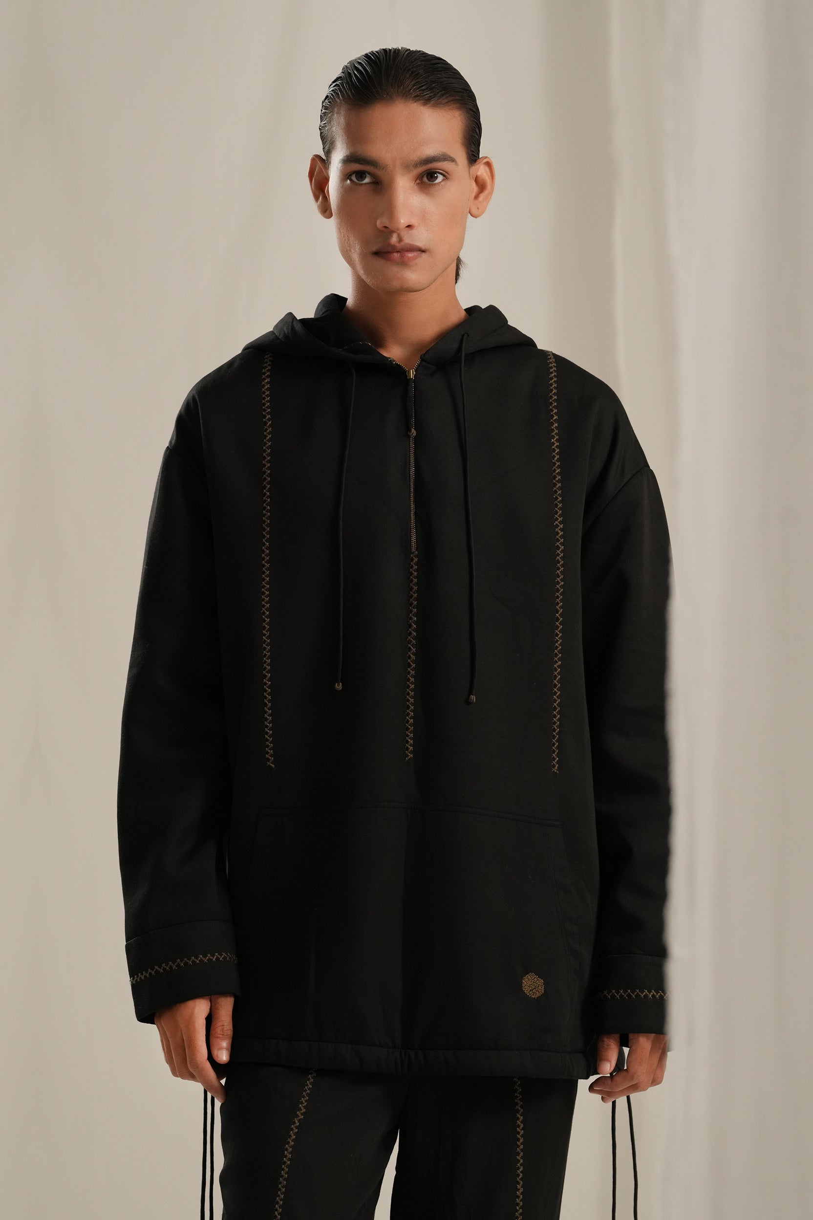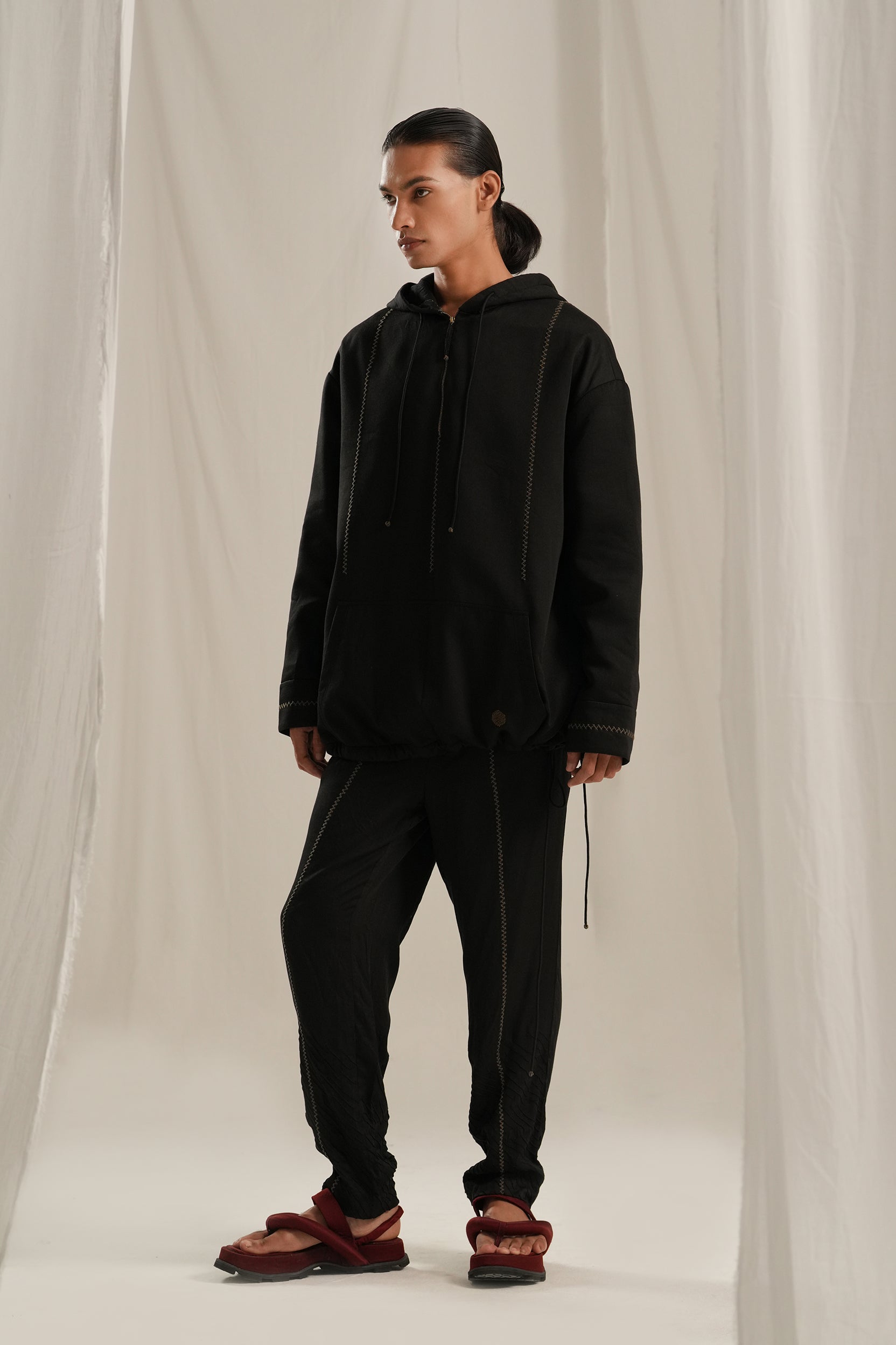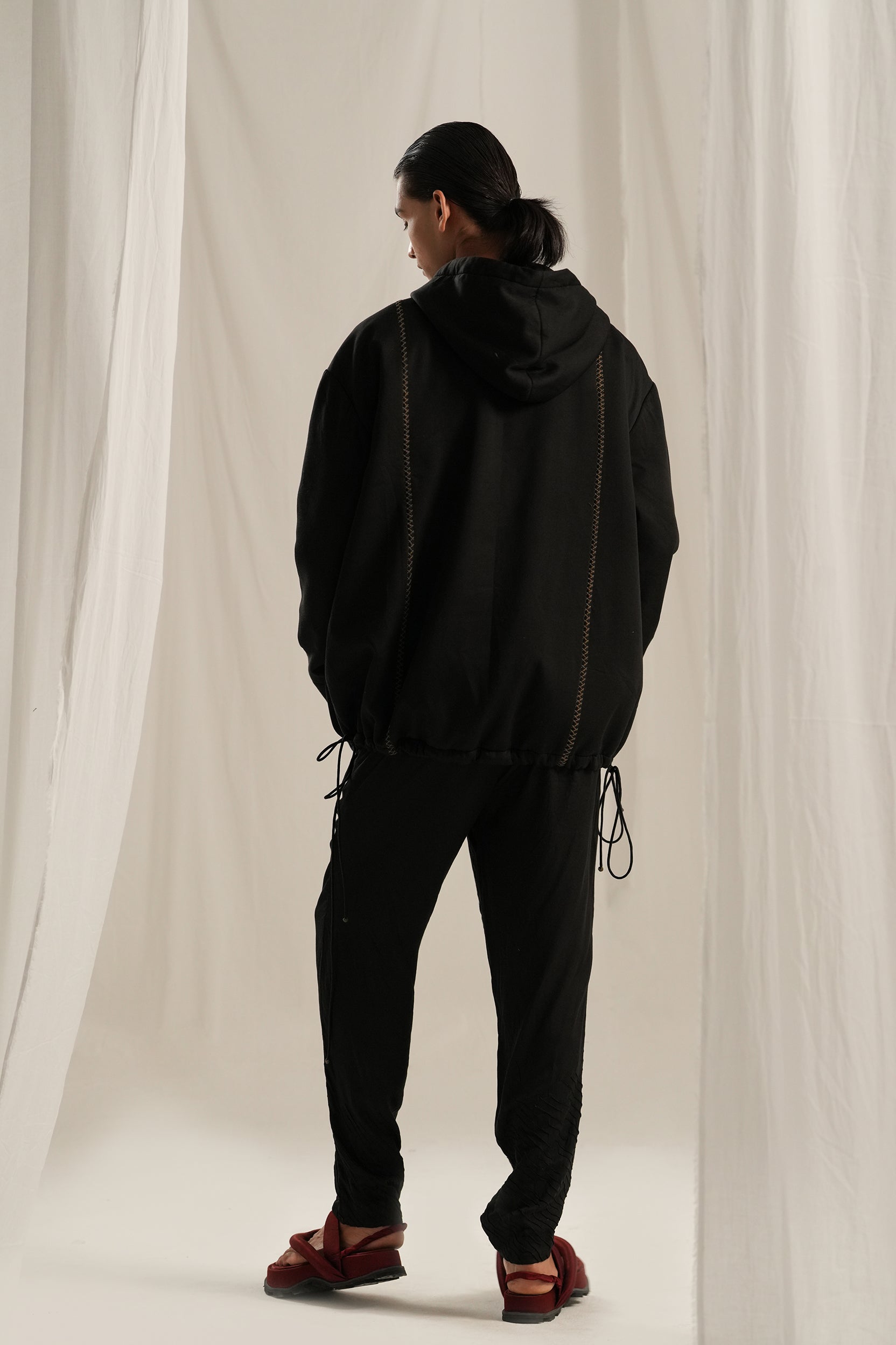 Hand dyed black hoodie with hand embroidery stitch detail. pocket at the front and drawstring attached at the bottom.