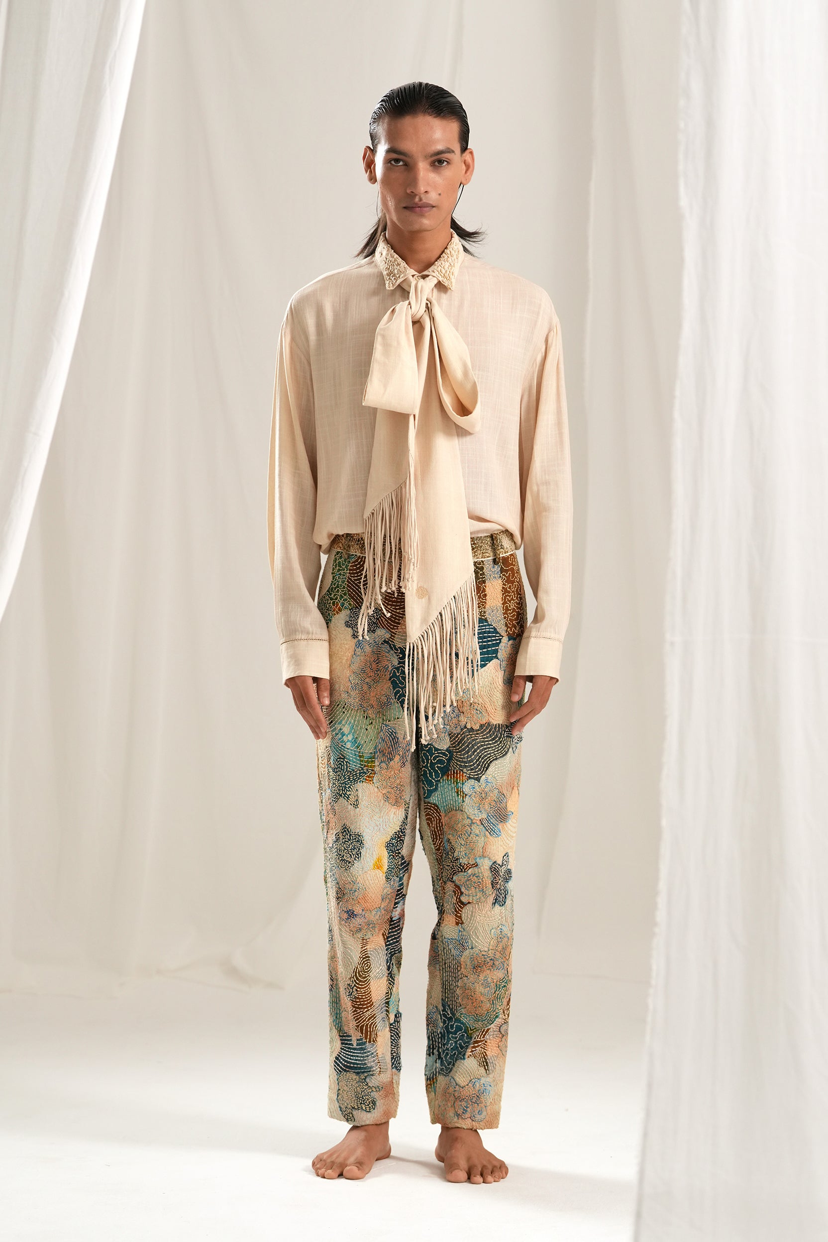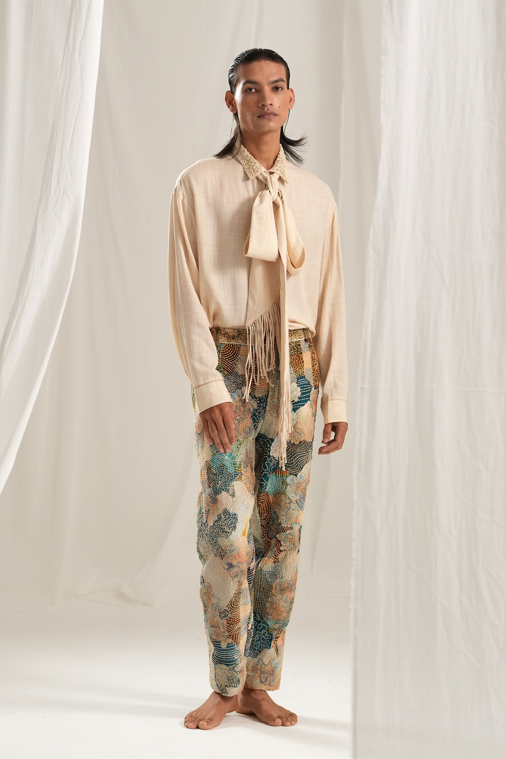 Our Kantha Embroidered Trousers, crafted from exquisite fabric patches in soothing shades of blue, ivory, and earthy browns. Each pair features full hand-embroidered Kantha stitches, showcasing fine craftsmanship and attention to detail. Lined with soft cotton for ultimate comfort, these classic trousers are perfect for any occasion, blending style and tradition effortlessly.