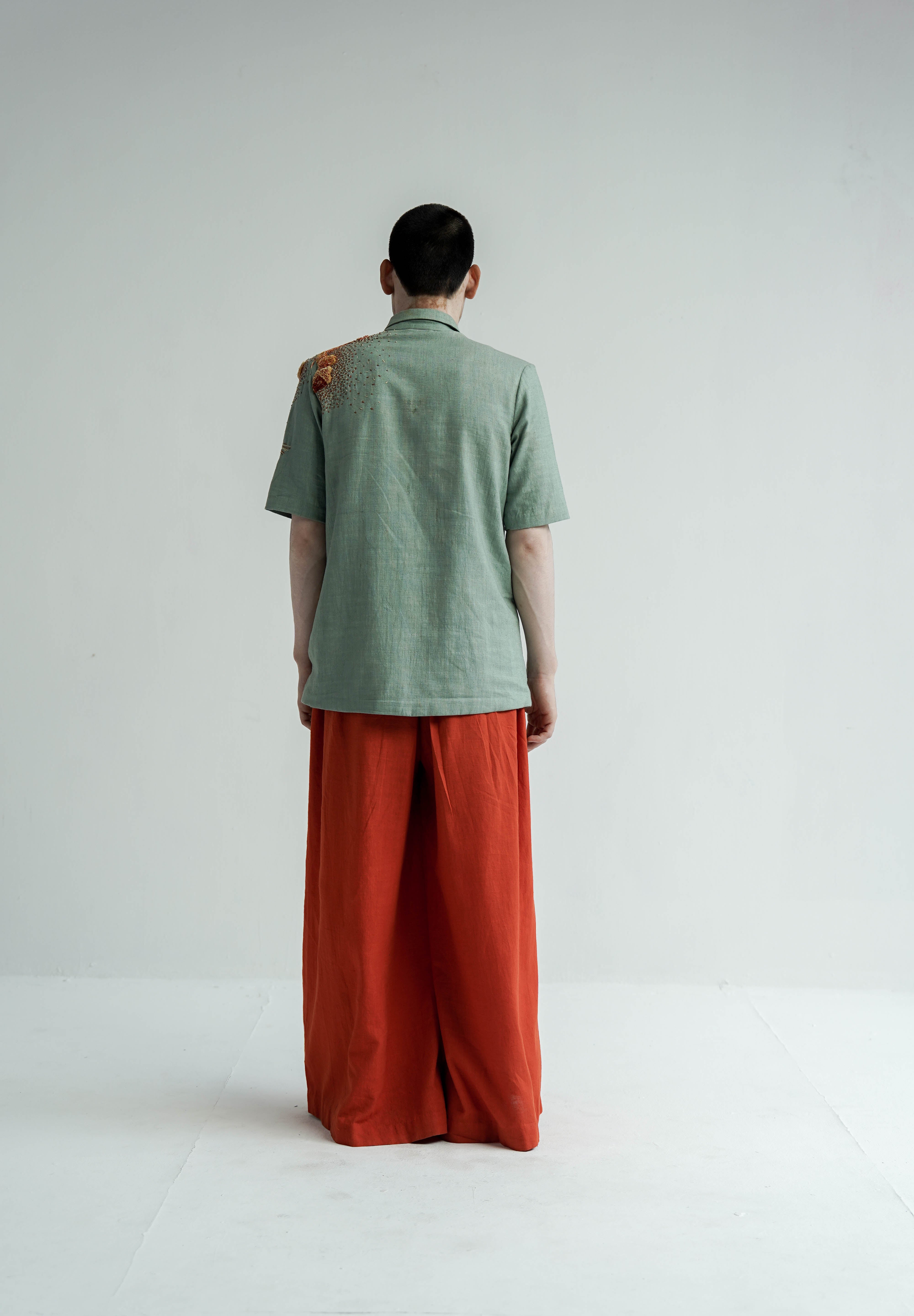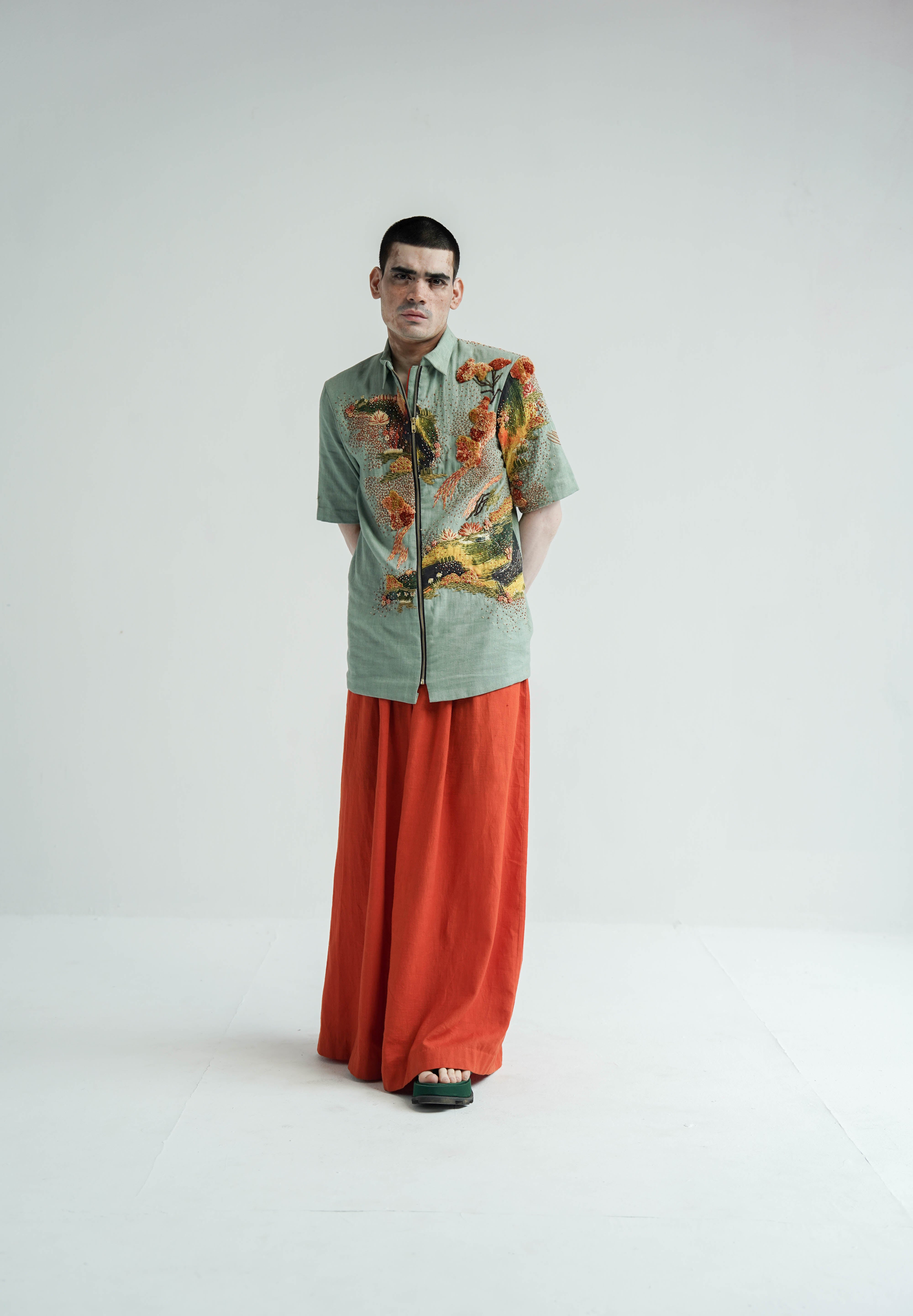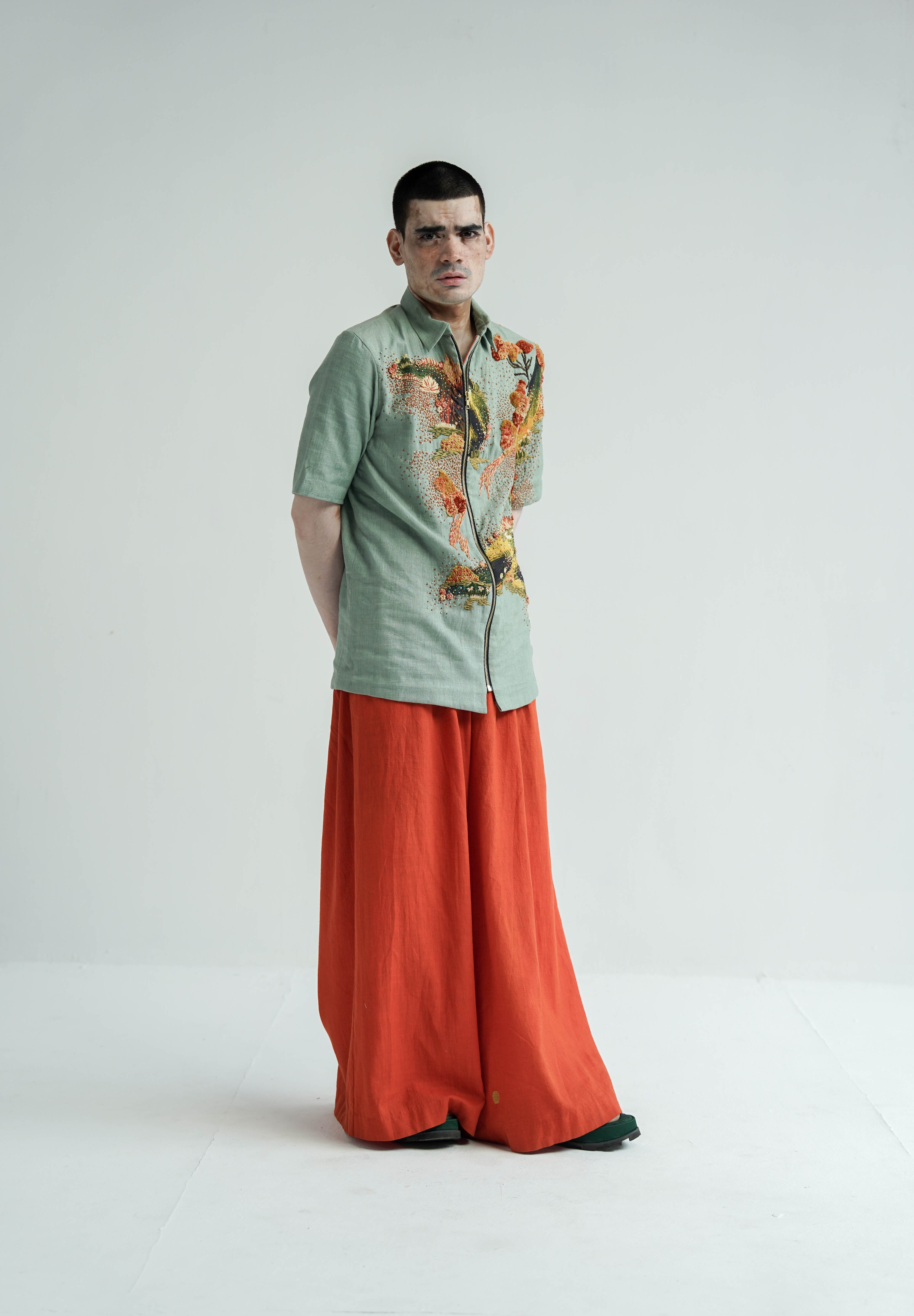 Introducing the Kobai Trouser, expertly crafted from high-quality cotton and featuring a vibrant hand-dyed orange hue. Designed with an elasticated waist for comfort, these trousers offer a relaxed fit suitable for all genders.