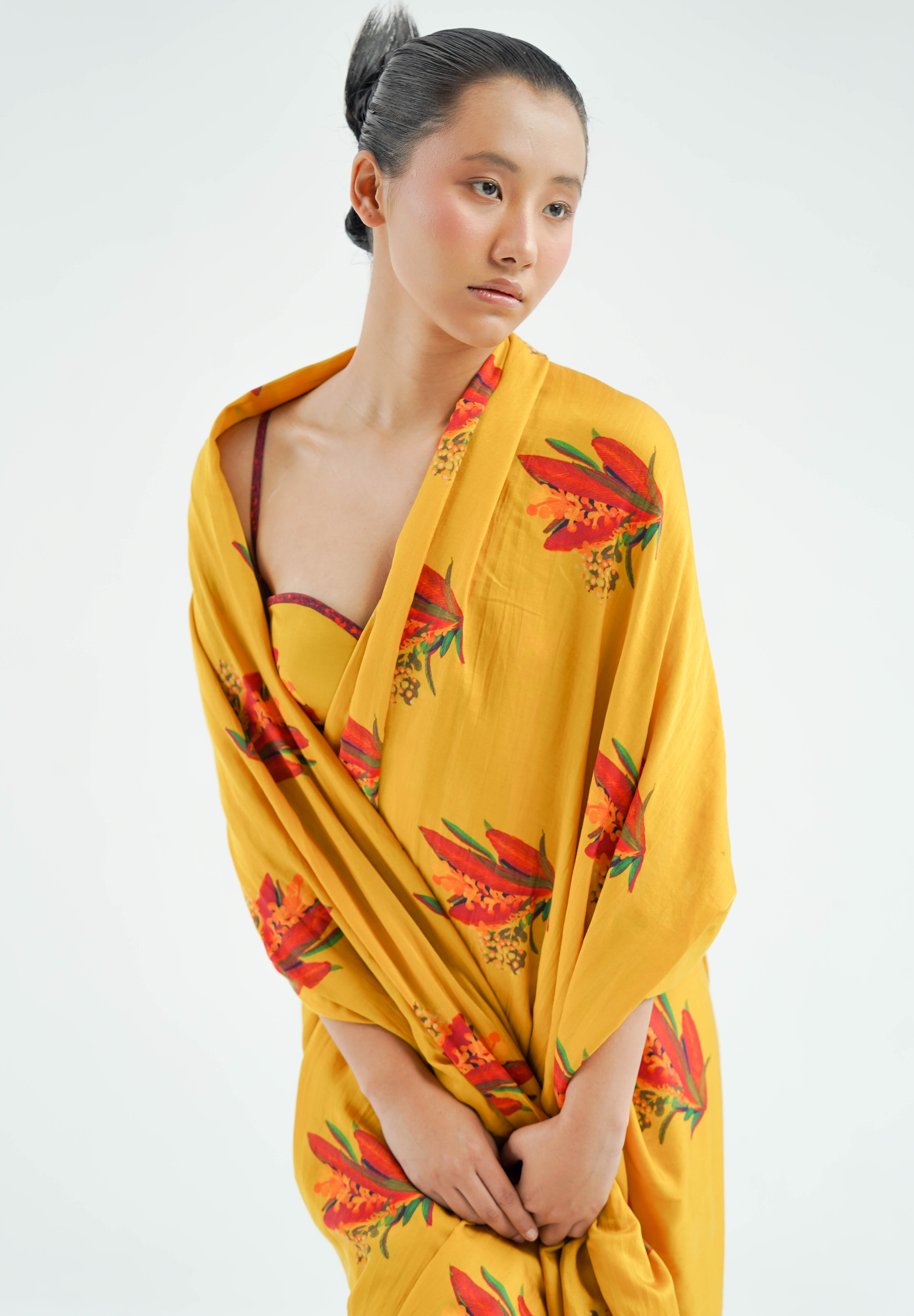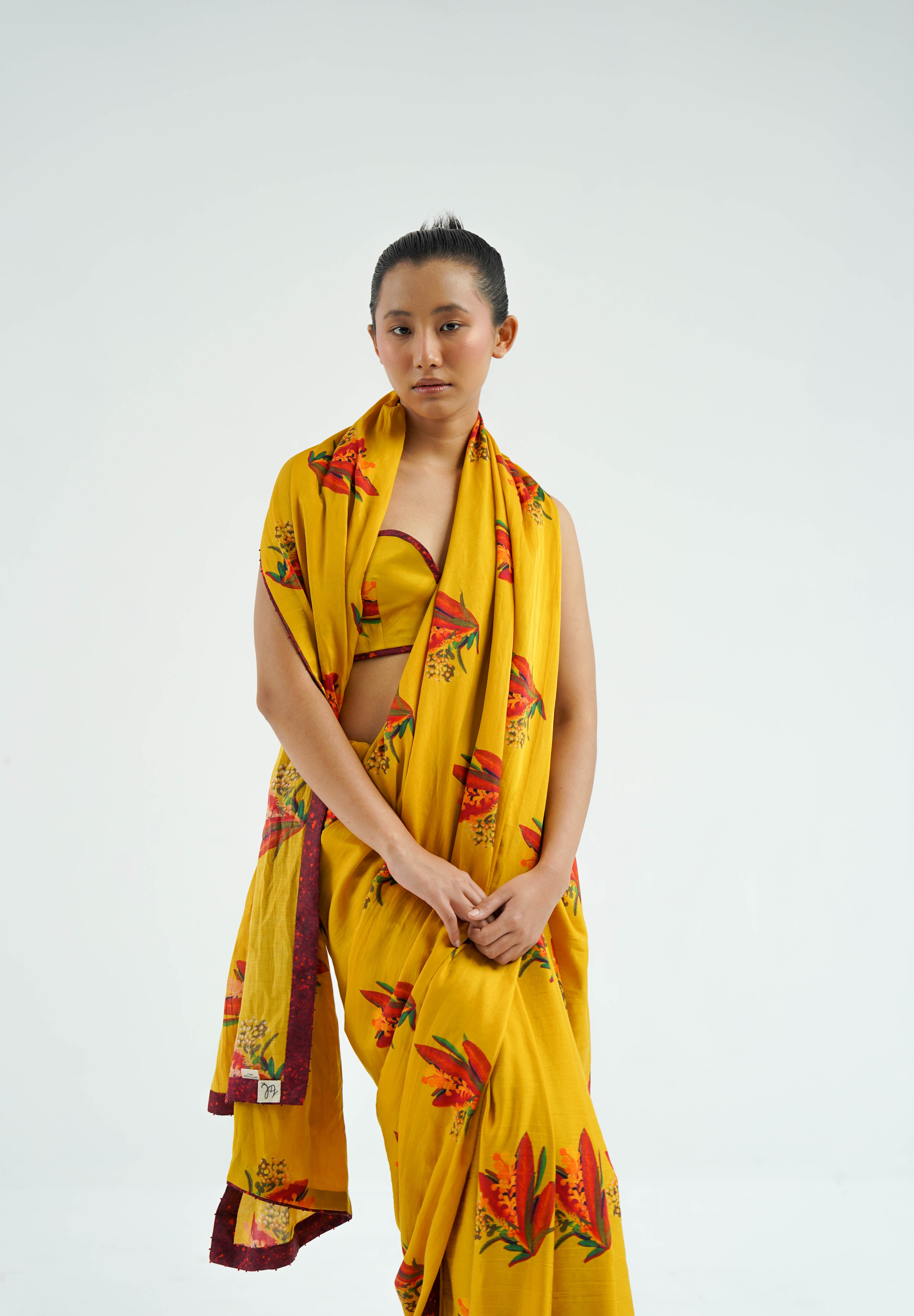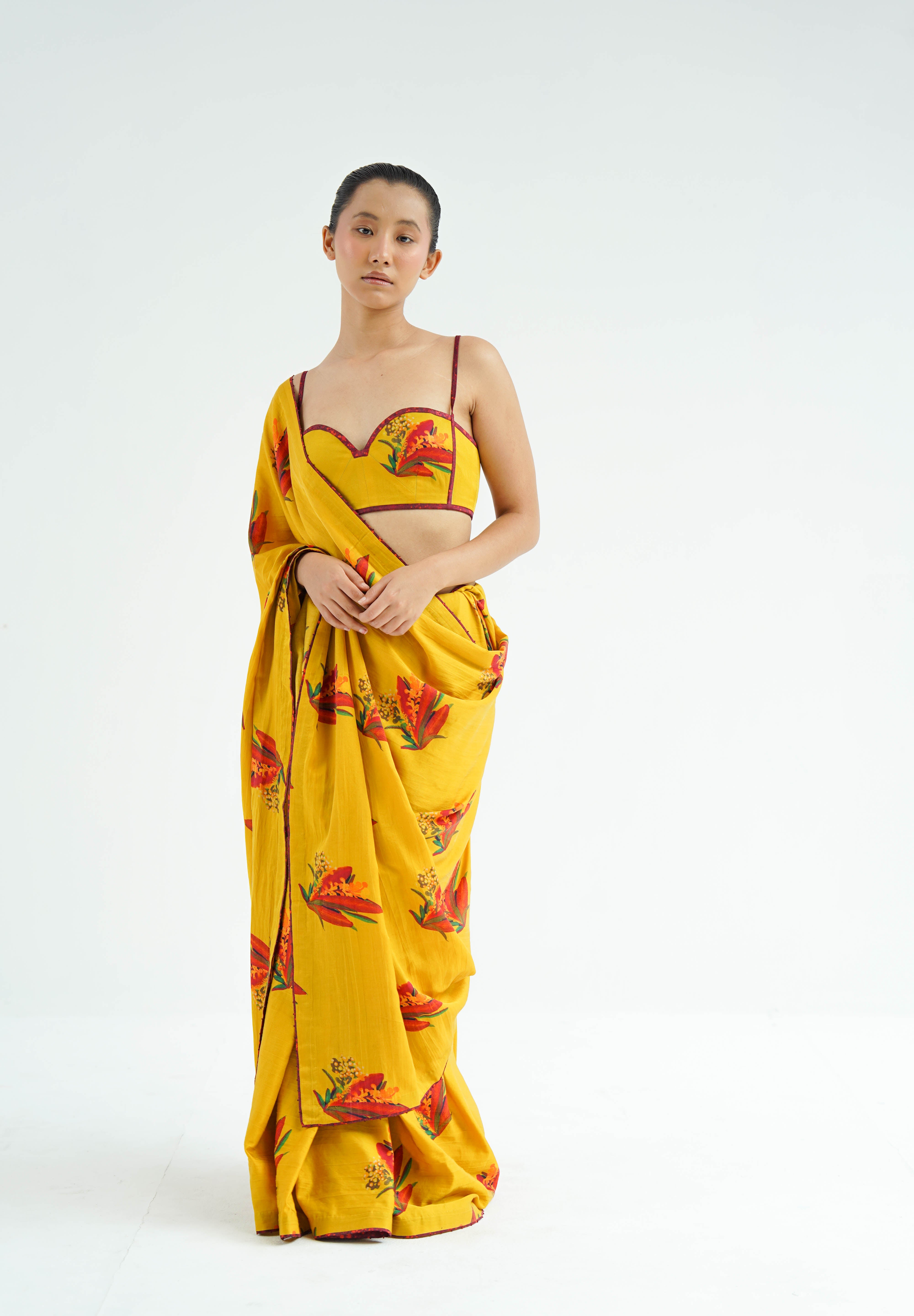 Introducing our Mustard Firefly saree, expertly crafted from silk. It features hand-painted, digitally printed mustard firefly motifs, beautifully accented with contrast piping details throughout. The ensemble includes a matching bralette blouse in the same print, perfectly finished with piping for a coordinated and stylish look.