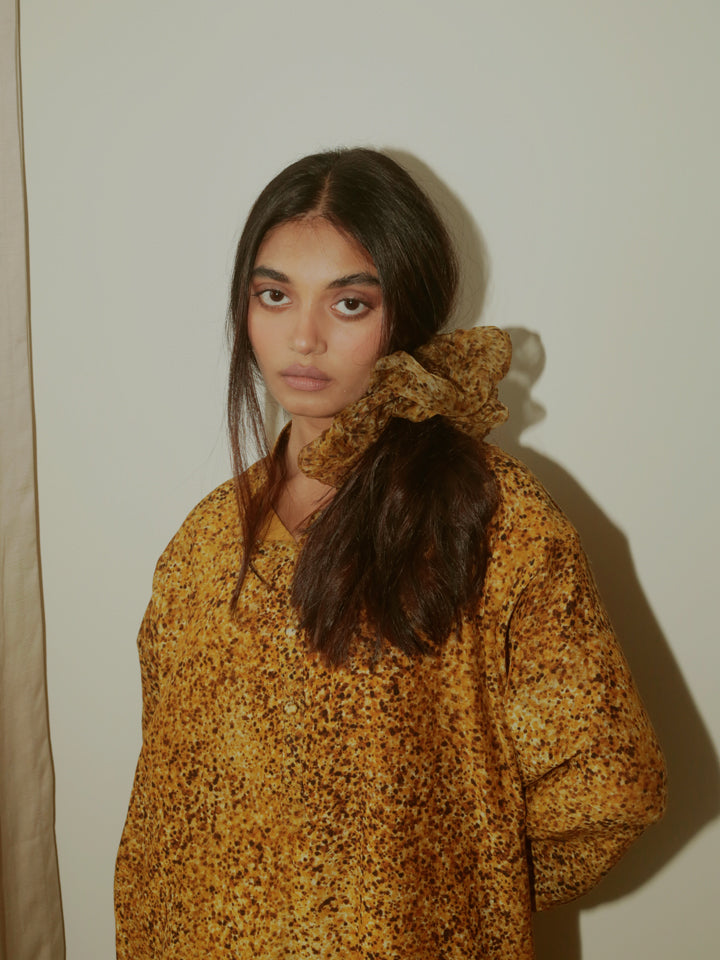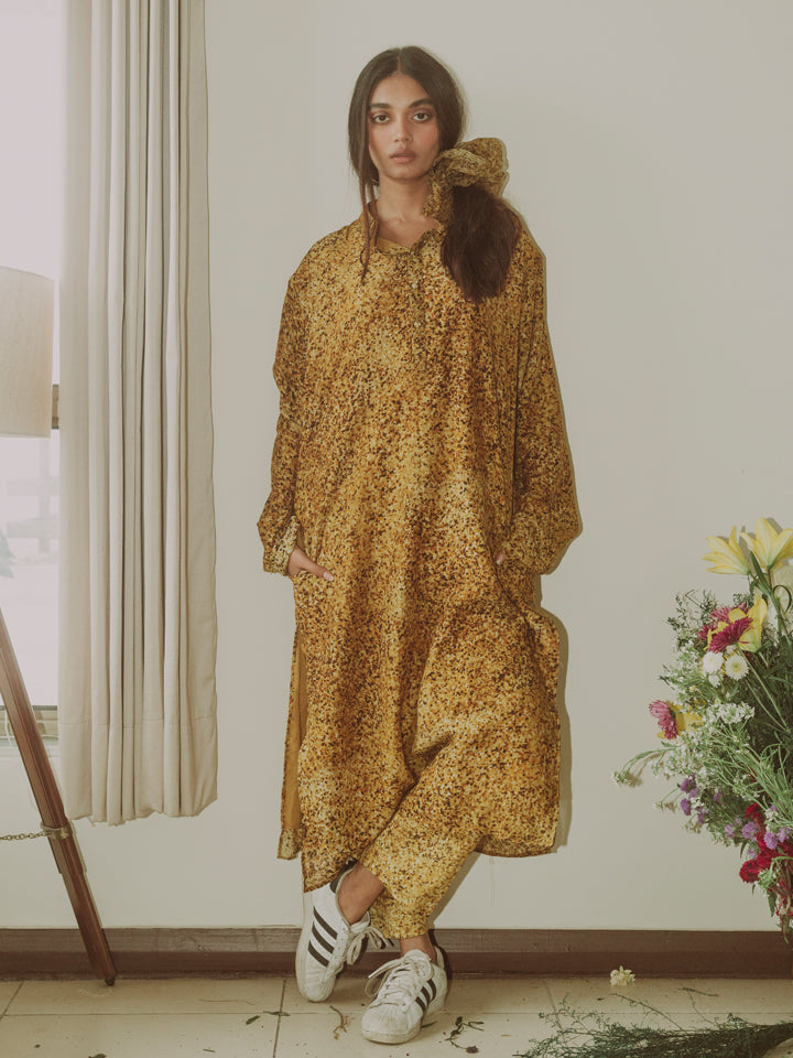 Mustard freckle boyfriend kurta pant set made in pure cotton silk coveys the impression of hand painted, digitally printed freckles with pockets on either side, giving it a very easy comfortable and at the same time androgynous mood.