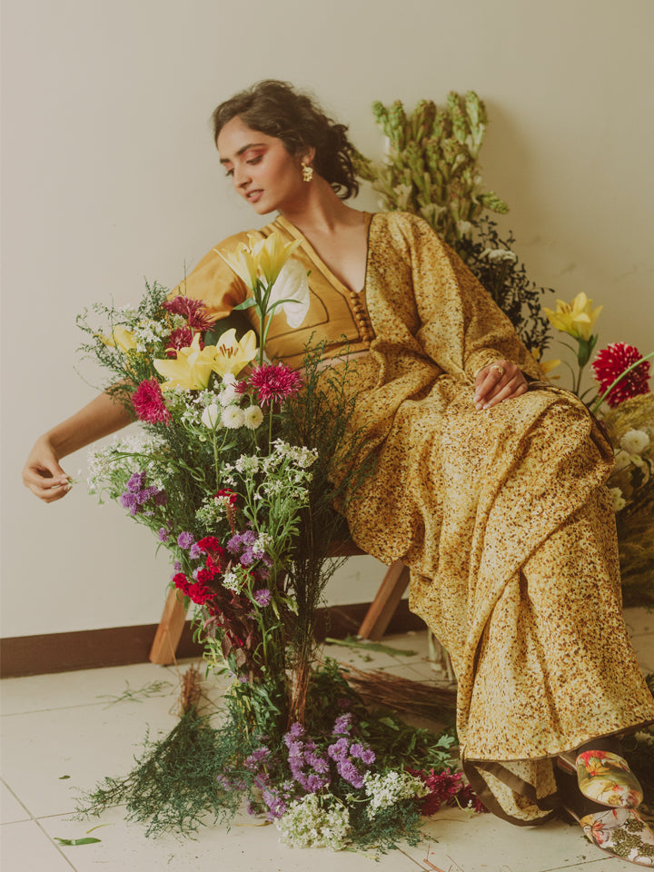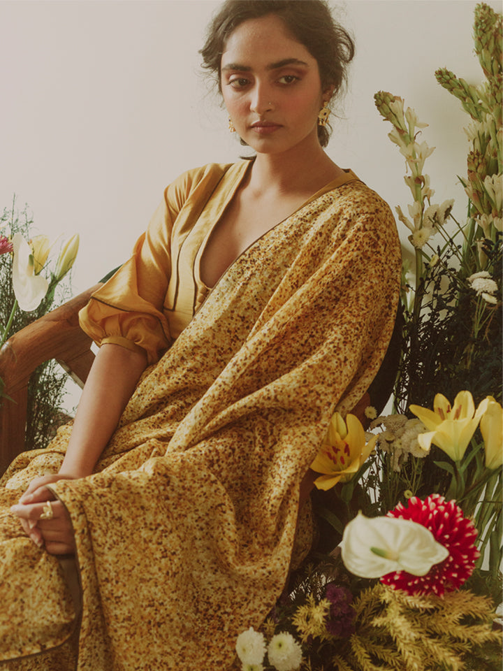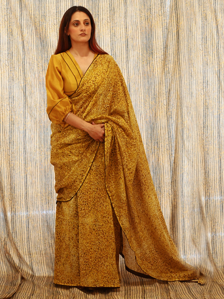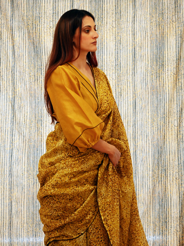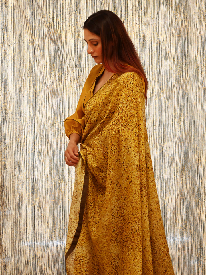 Mustard Freckle Saree, made in pure silk chanderi conveys the impression of hand painted, digitally printed freckles. Comes with a front open, puffed sleeve blouse with a contrast piping detail.