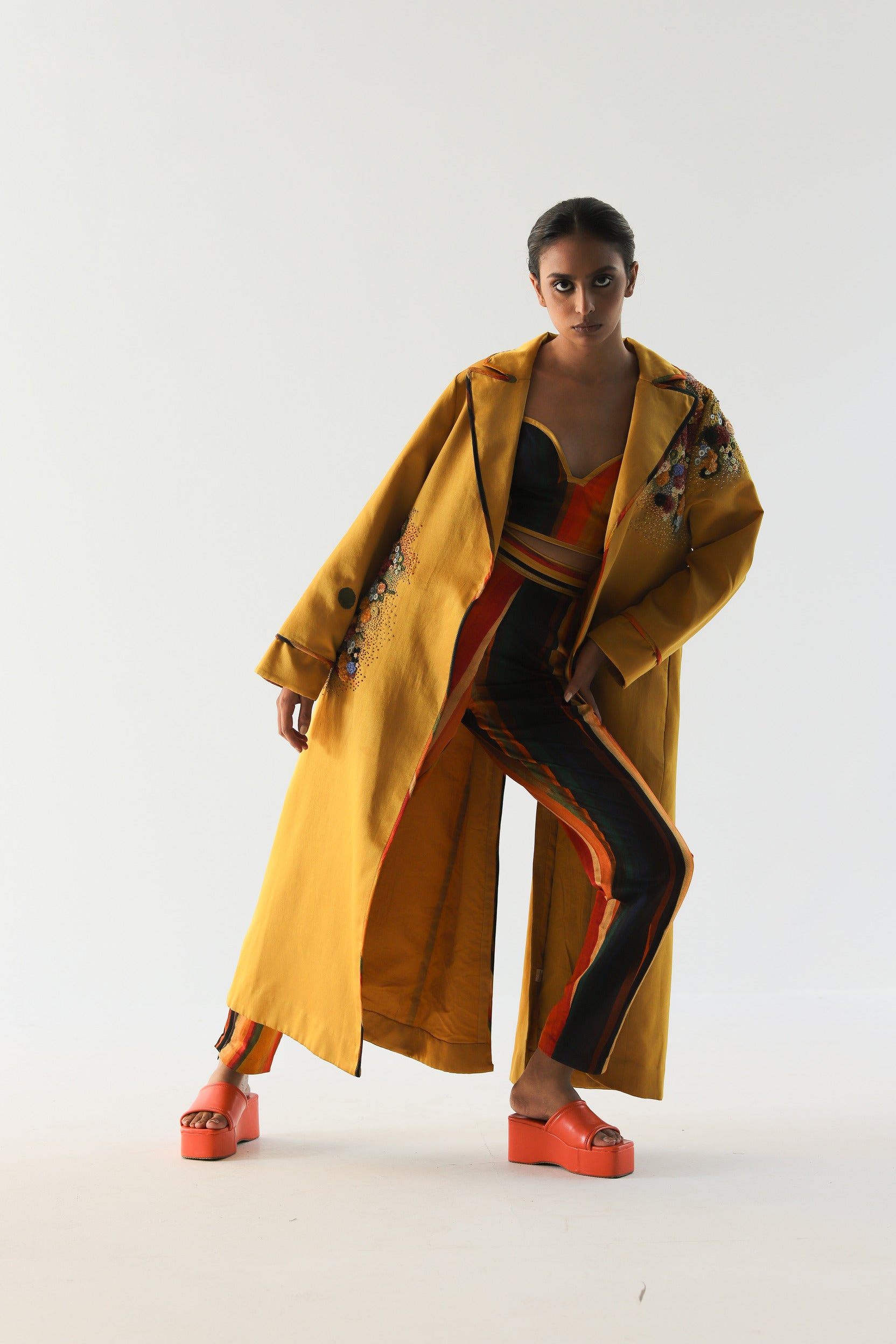 Mustard Impasto Trench is made in pure cotton silk satin. Its standout feature is the exquisite hand embroidery that creates a captivating 3d texture adding a unique and artistic dimension to the design. impeccably finished with contrast piping detail this trench coat exudes sophistication and style. additionally it offers buttons at the back combining practicality and aesthetic appeal.