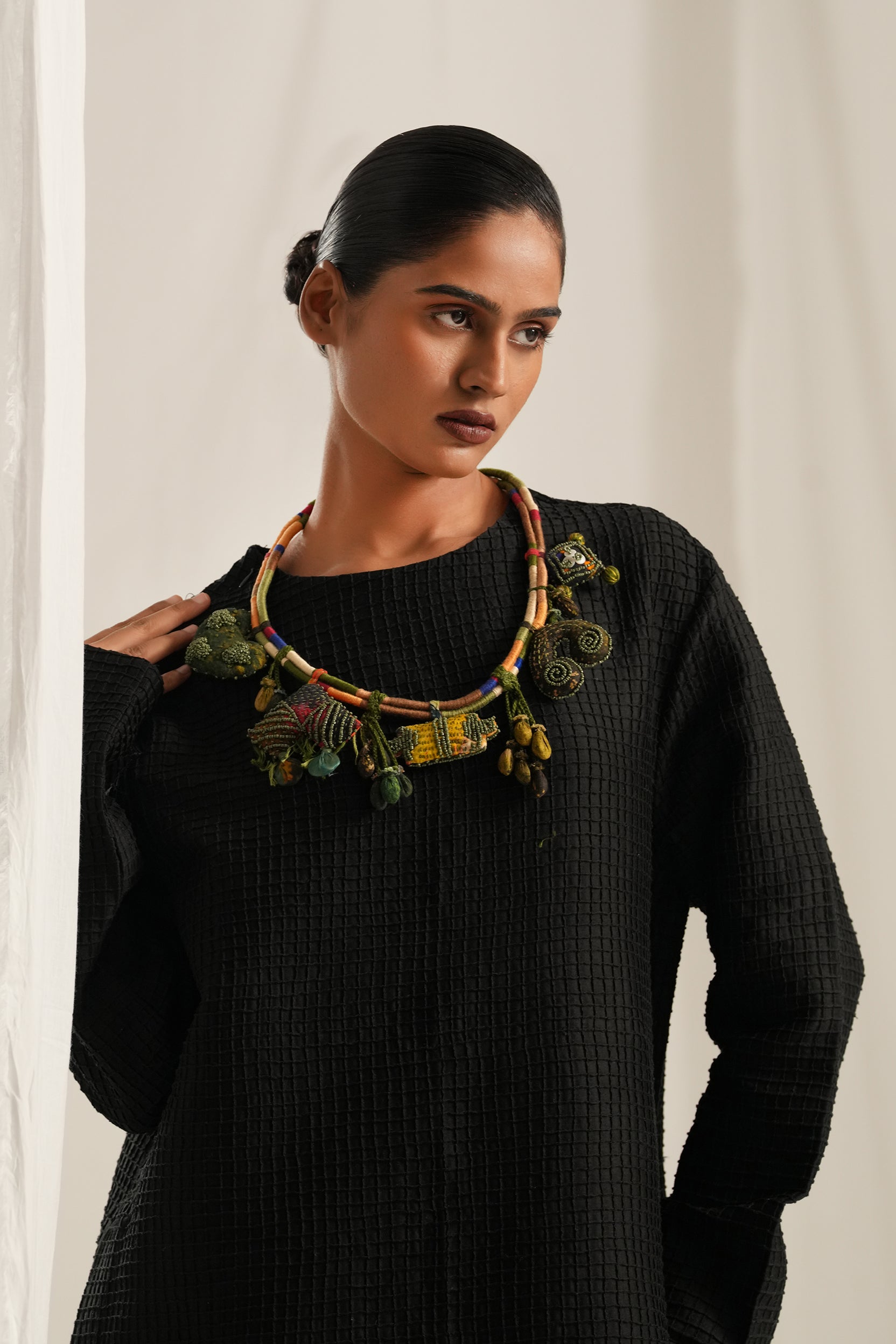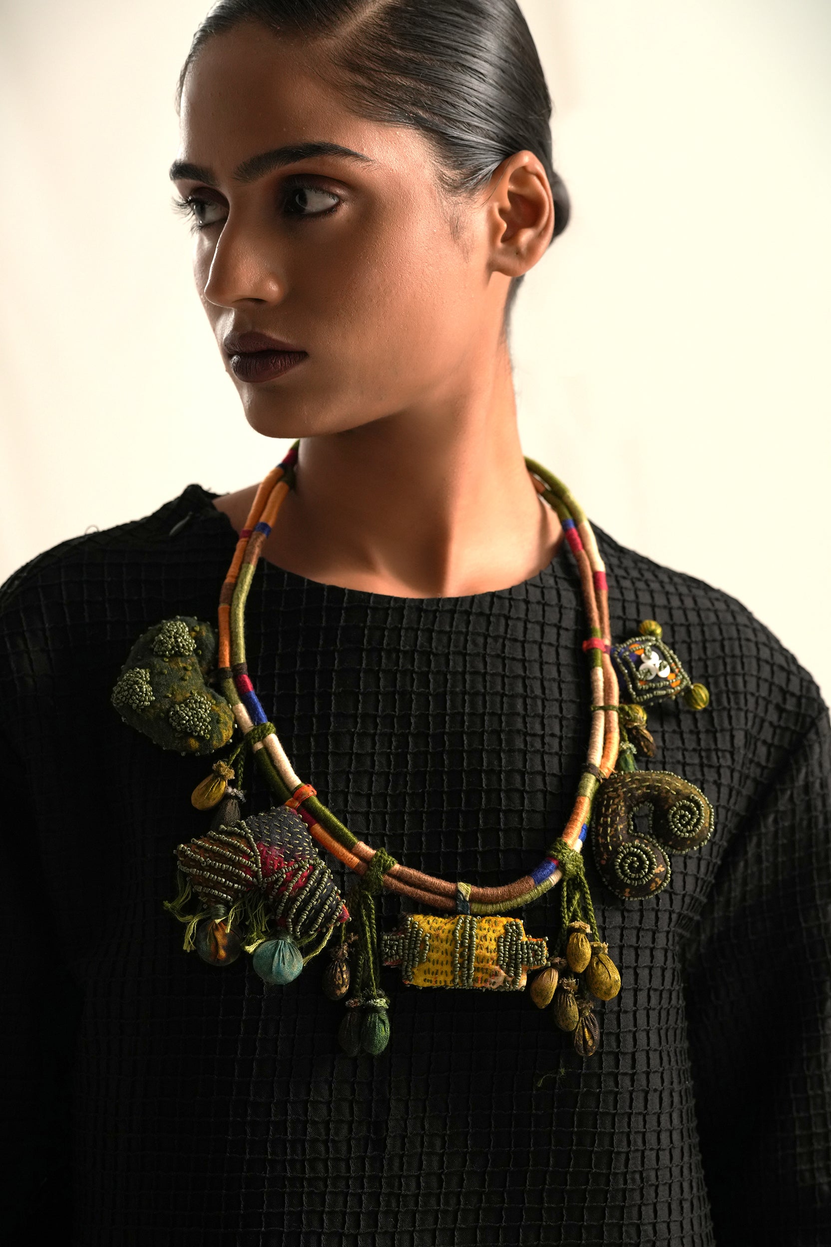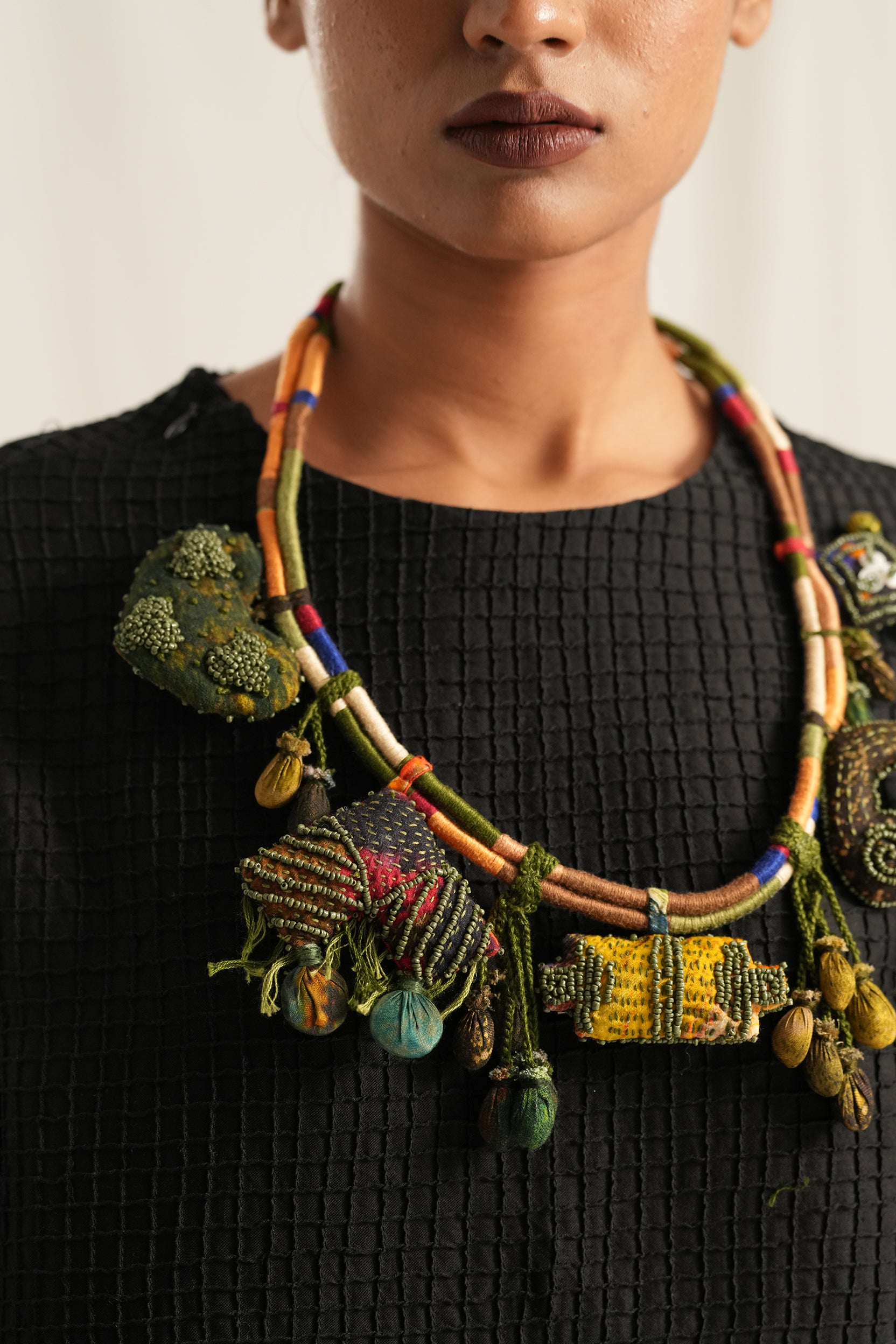 Hand embroidered and textured charms neckpeice made out of fabric scraps.